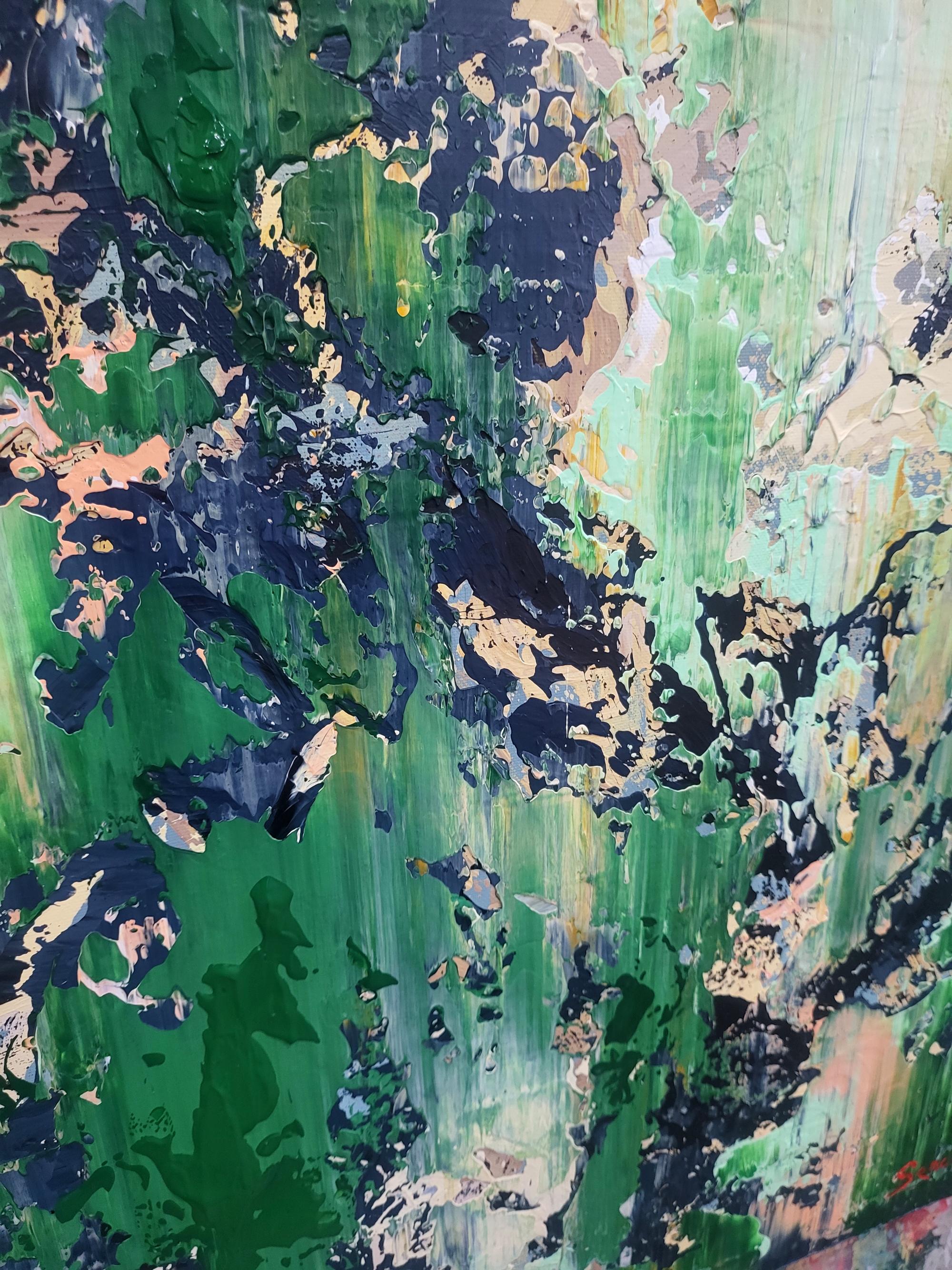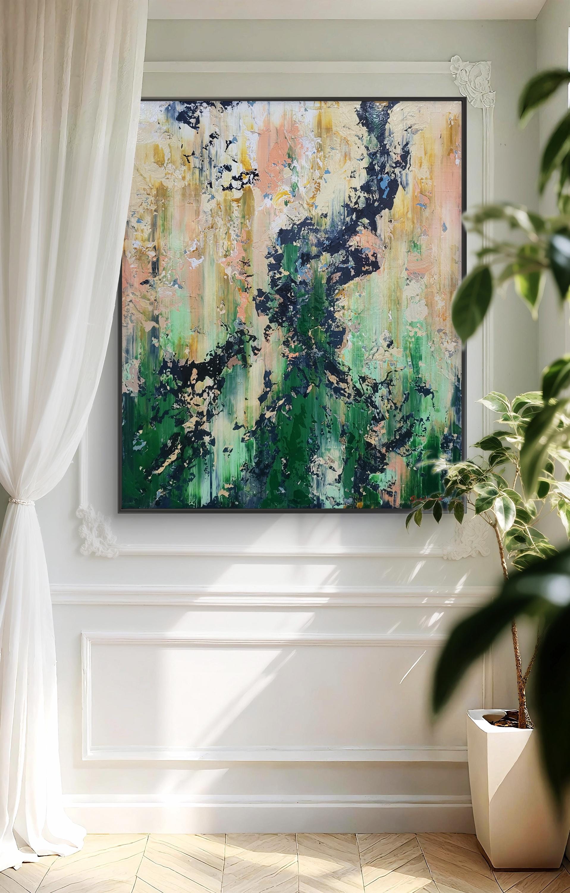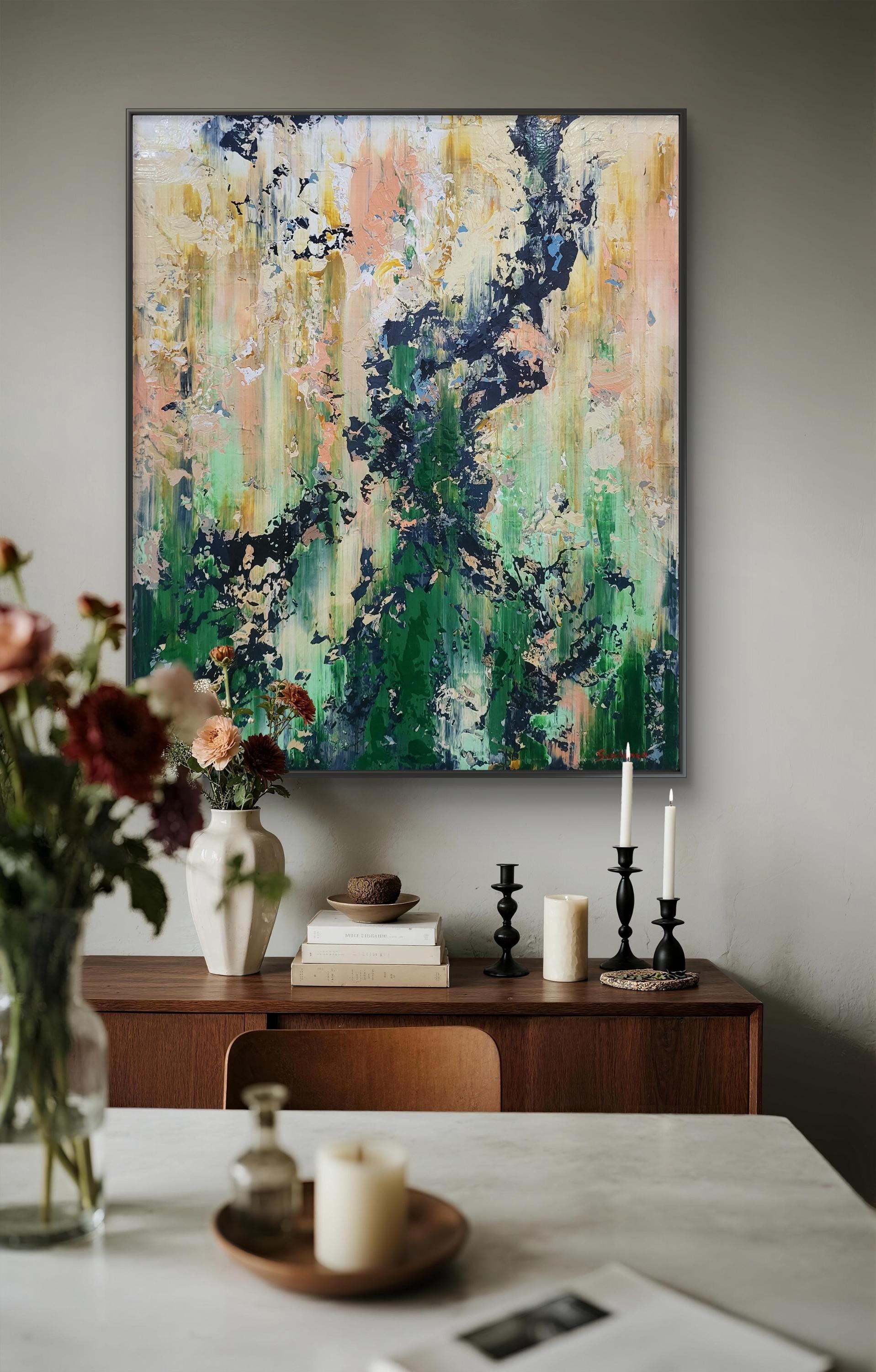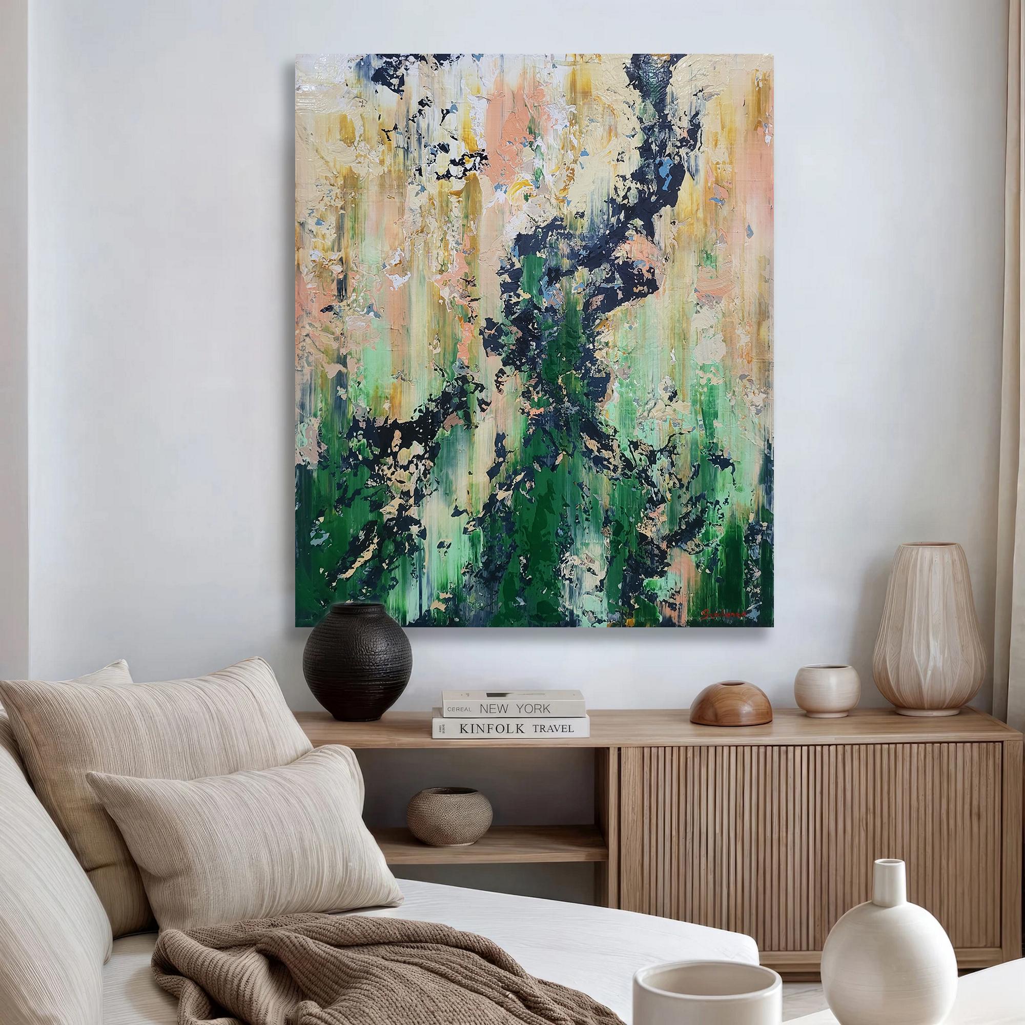 This captivating abstract artwork employs a striking palette of earthy greens, soft pinks, and bold black accents, creating a dynamic interplay between chaos and harmony. The vertical brush strokes suggest a sense of upward movement, evoking the growth and vitality of nature. The dark, jagged elements contrast sharply with the softer hues, providing a sense of depth and texture. This contrast is enhanced by the artist's use of impasto technique, which adds a tactile quality to the piece. The layered composition invites viewers to explore the multifaceted interactions between colors, revealing new details upon closer inspection. The painting's textural richness and vivid contrasts capture the eye, offering a fresh perspective with each glance. This artwork stands out for its ability to evoke emotion and imagination, seamlessly merging the organic and the abstract in a visually arresting manner.
