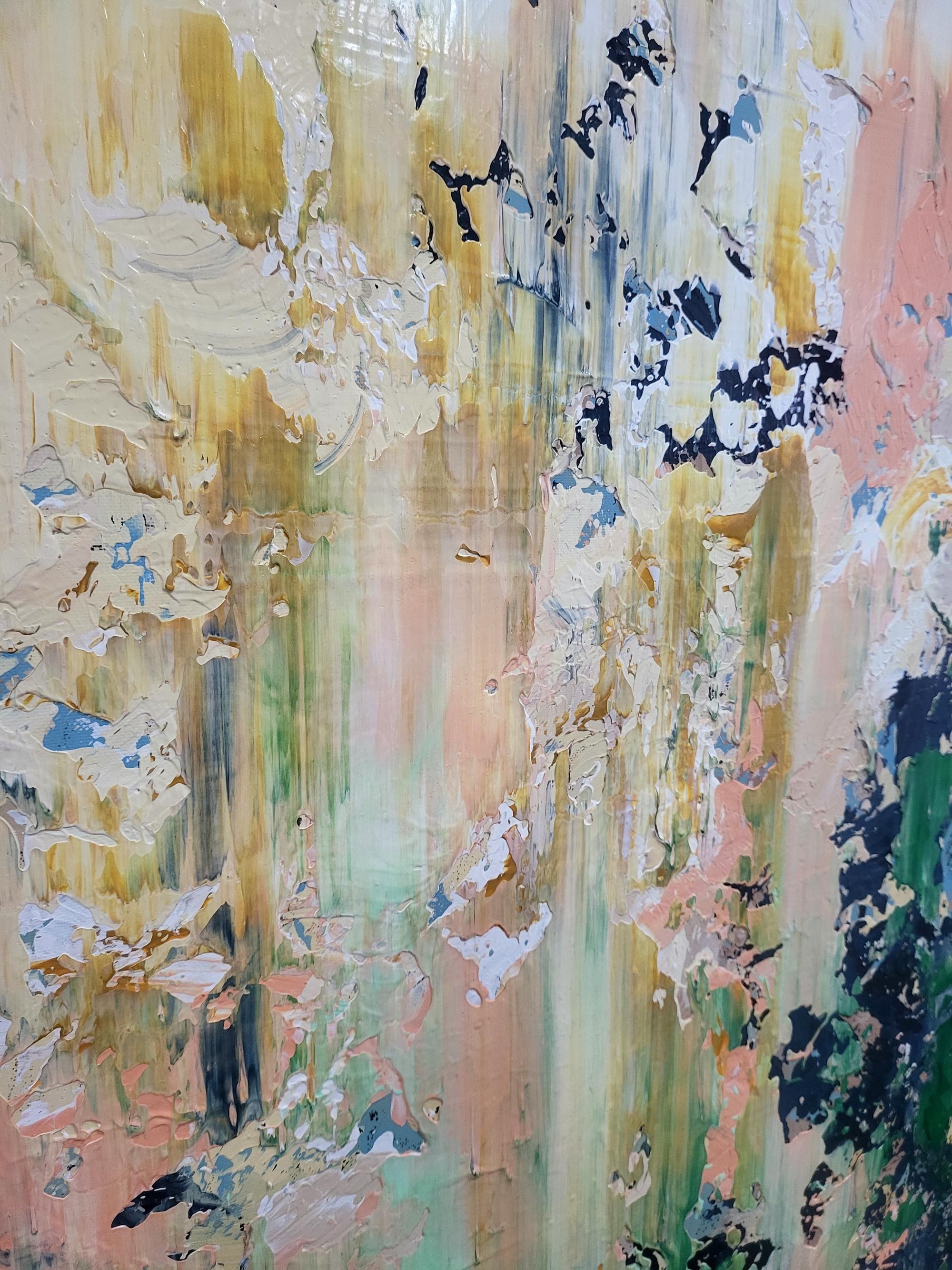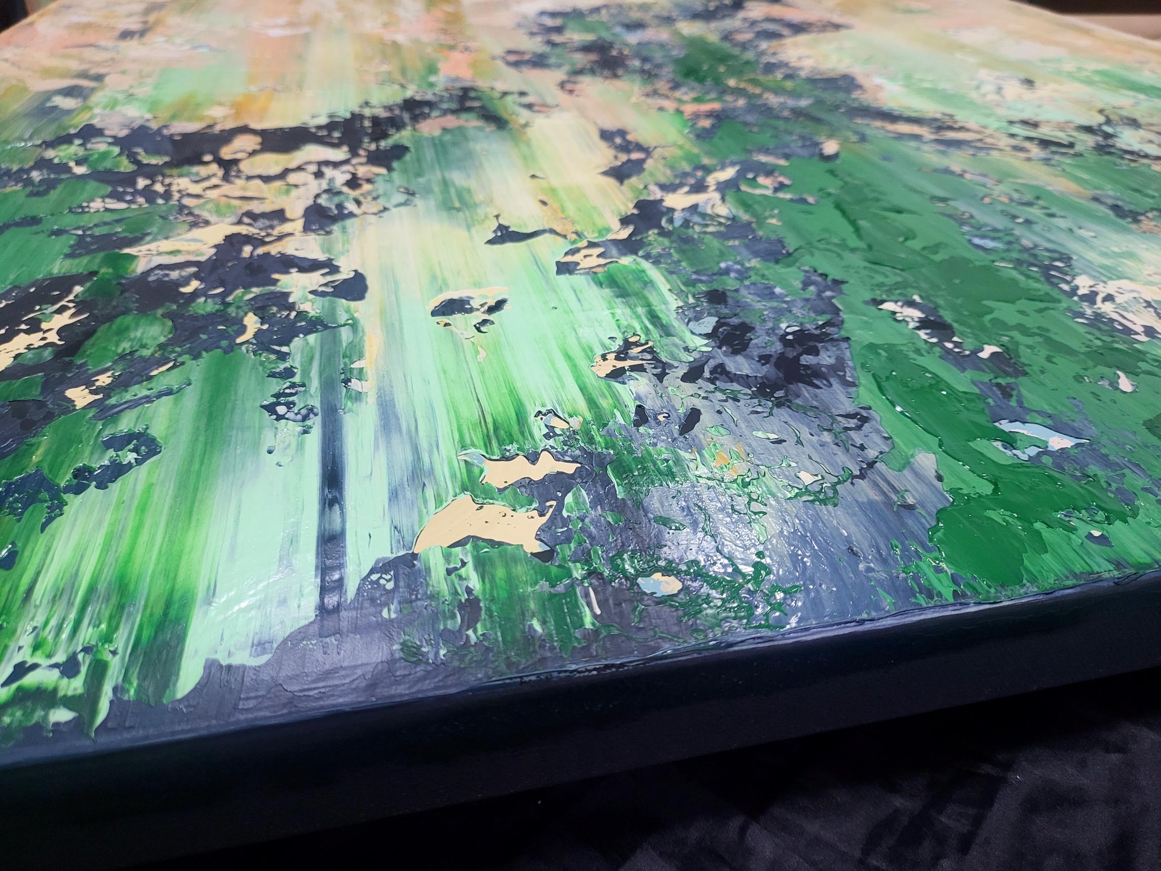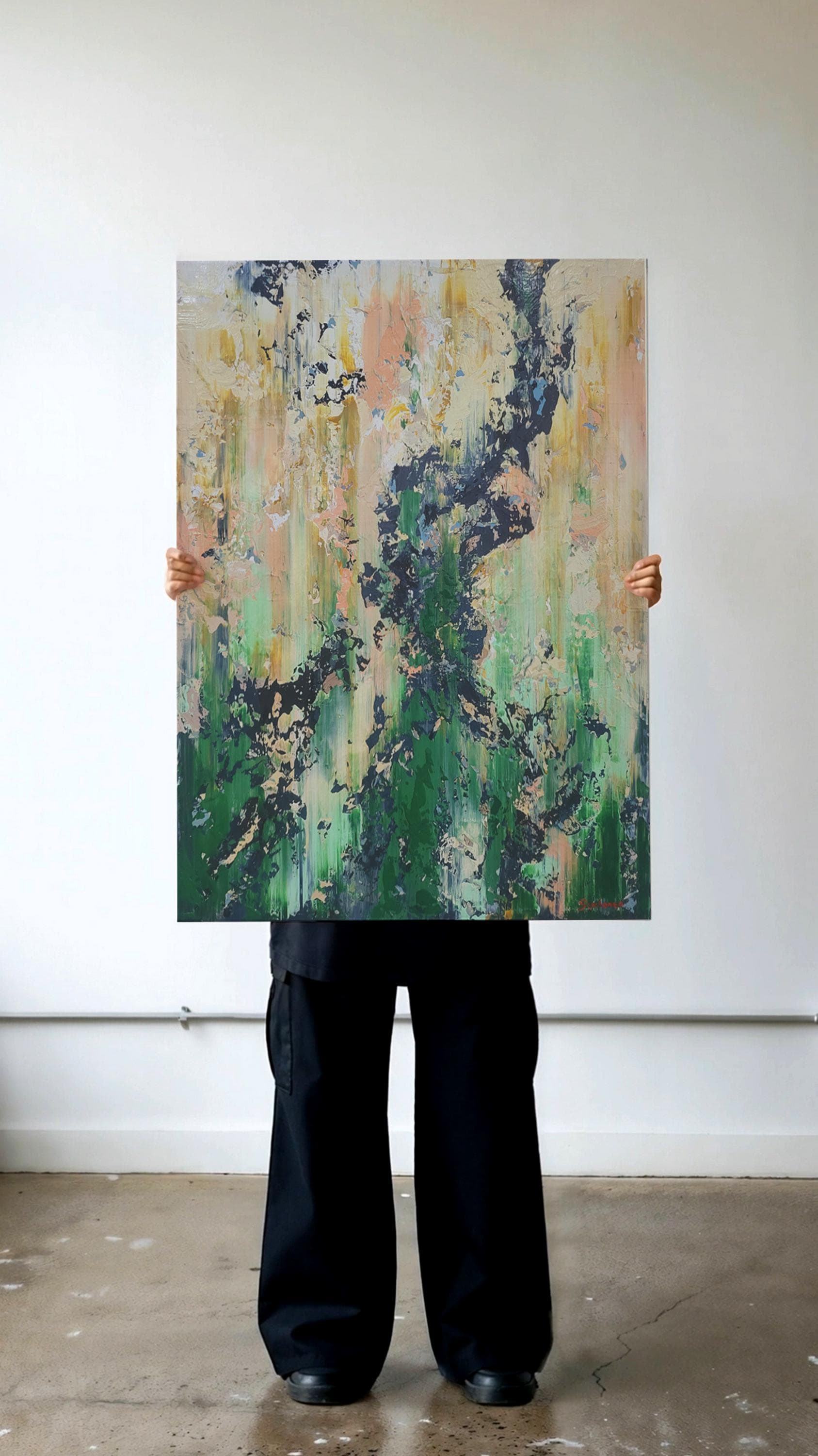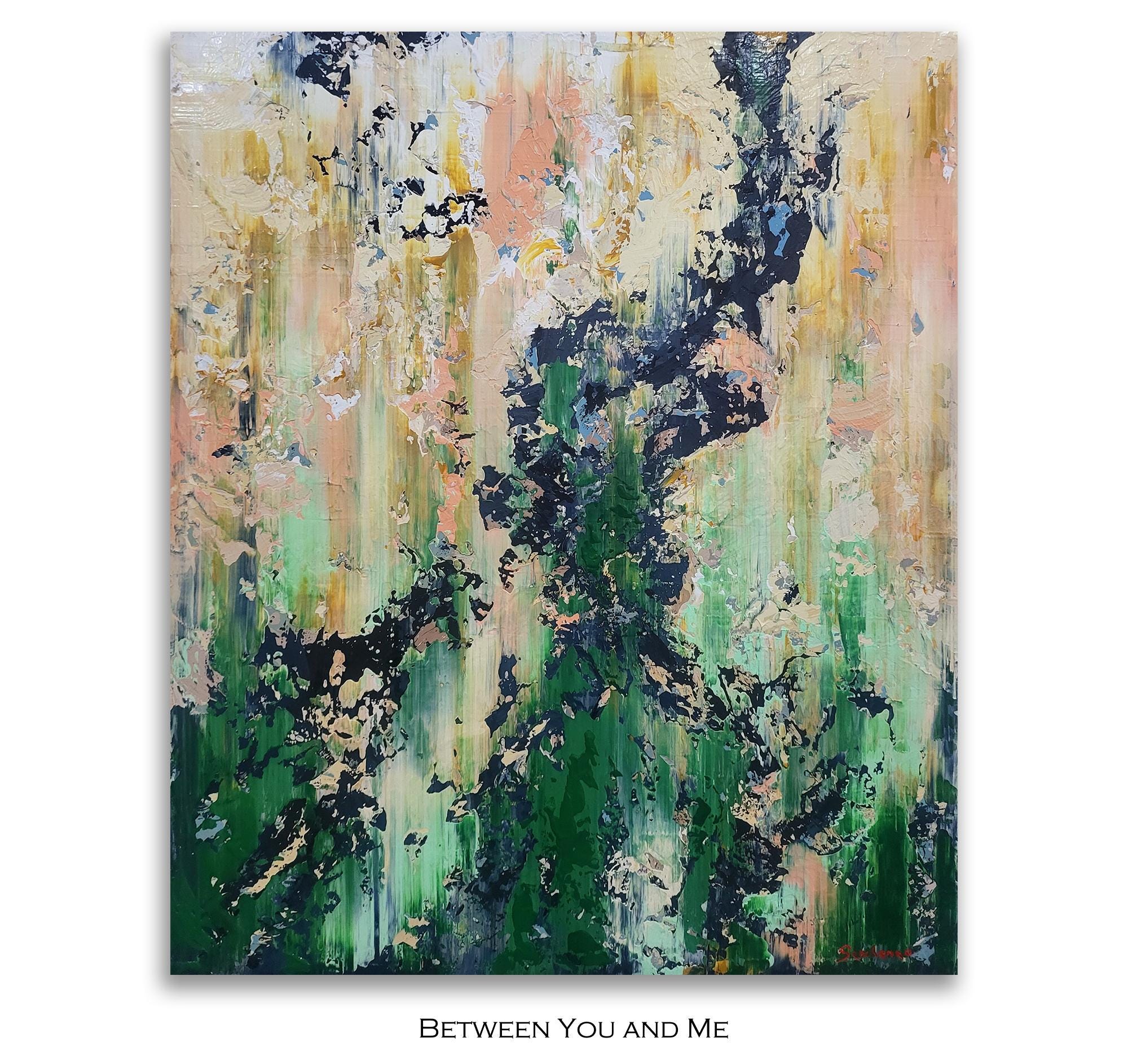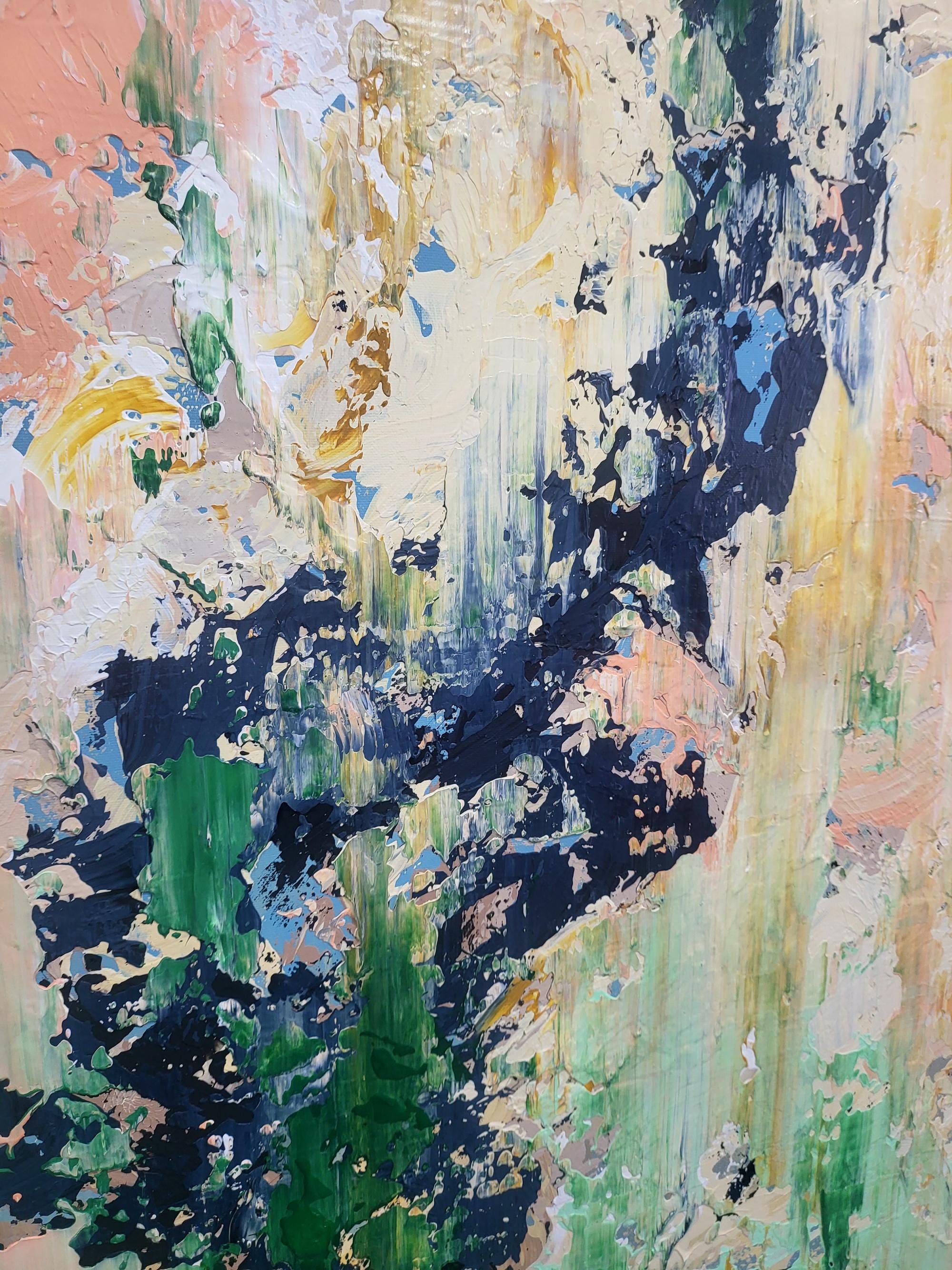 This captivating abstract artwork employs a striking palette of earthy greens, soft pinks, and bold black accents, creating a dynamic interplay between chaos and harmony. The vertical brush strokes suggest a sense of upward movement, evoking the growth and vitality of nature. The dark, jagged elements contrast sharply with the softer hues, providing a sense of depth and texture. This contrast is enhanced by the artist's use of impasto technique, which adds a tactile quality to the piece. The layered composition invites viewers to explore the multifaceted interactions between colors, revealing new details upon closer inspection. The painting's textural richness and vivid contrasts capture the eye, offering a fresh perspective with each glance. This artwork stands out for its ability to evoke emotion and imagination, seamlessly merging the organic and the abstract in a visually arresting manner.