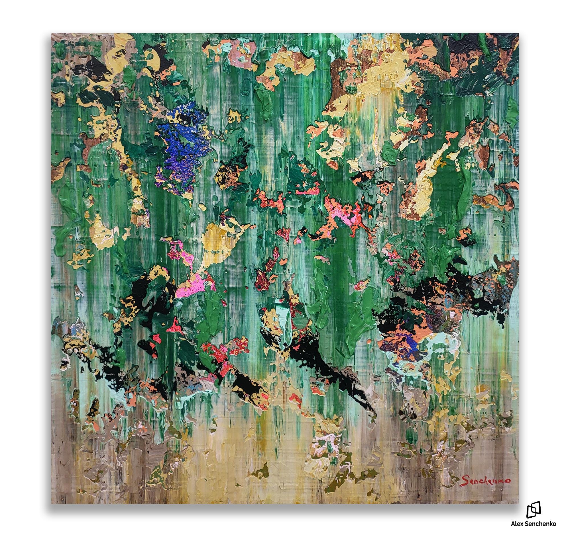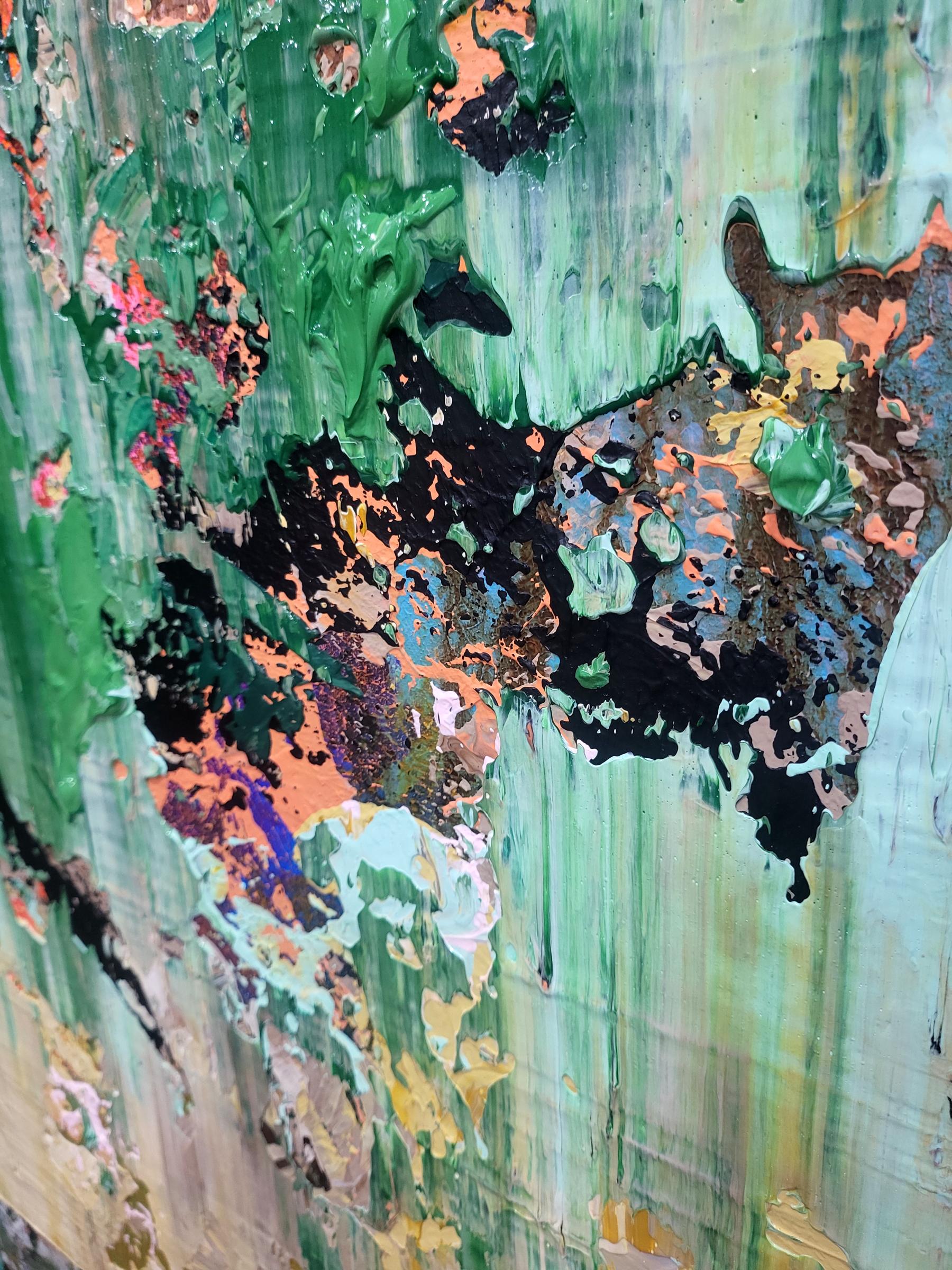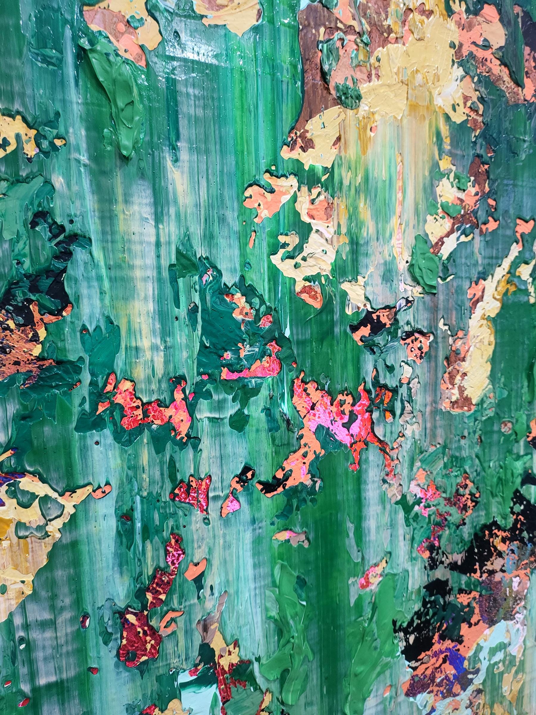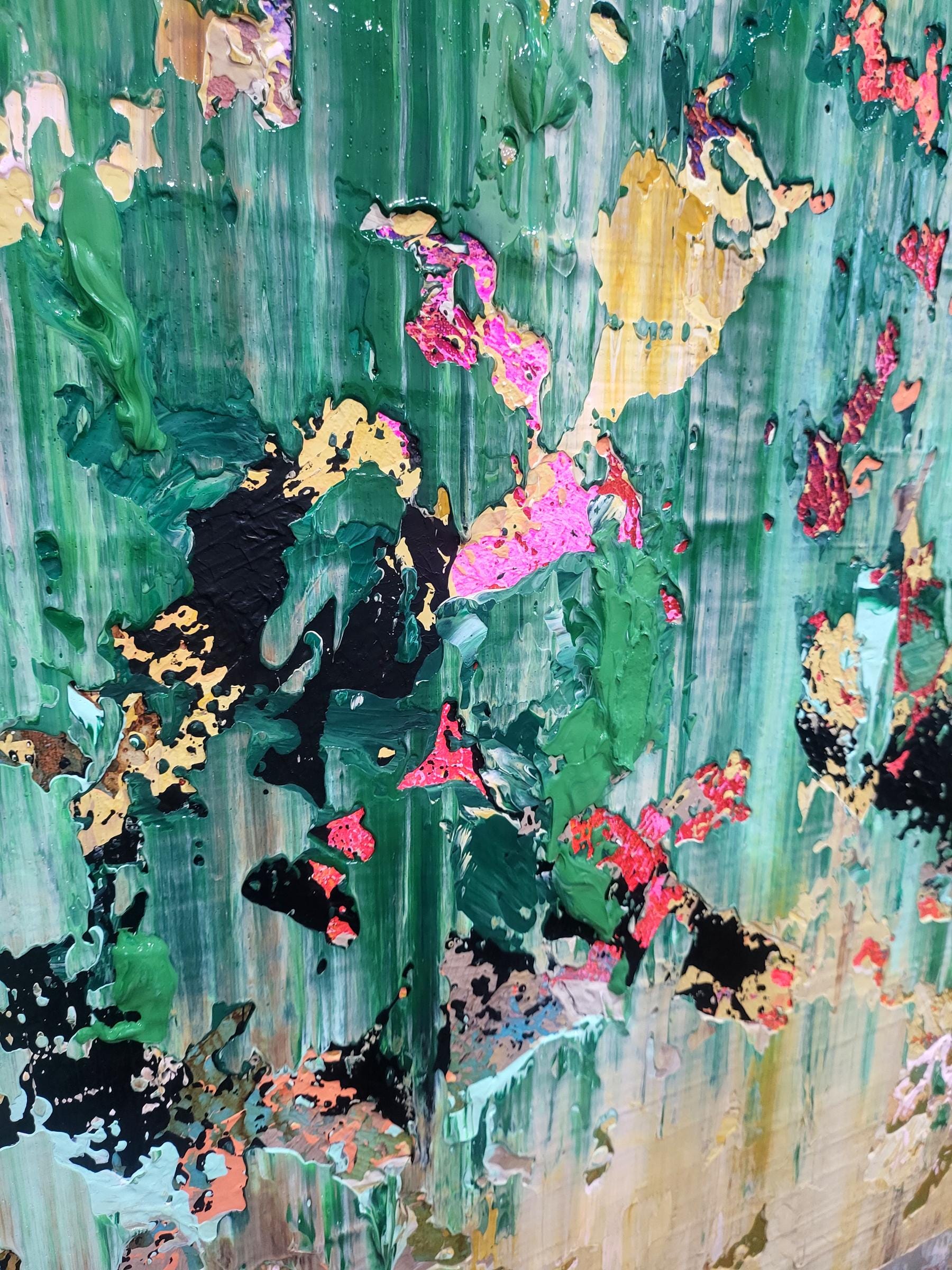This artwork presents a captivating interplay of vibrant colors and dynamic textures, creating a stunning visual experience. Bold strokes of green dominate the canvas, suggesting the vitality and chaotic beauty of nature. Scattered throughout are patches of gold, pink, and blue, each seeming to erupt from beneath the surface, adding depth and intrigue. The layering technique gives a sense of movement and energy, evoking the feeling of an abstract landscape in perpetual transformation. The rough, splattered texture contrasts with subtle gradients, showcasing the artist's skill in balancing chaos with harmony. This piece draws viewers into a world of imaginative interpretation, inviting them to explore its abstract depths. Each glance offers new insights, making it a compelling focal point in any collection.