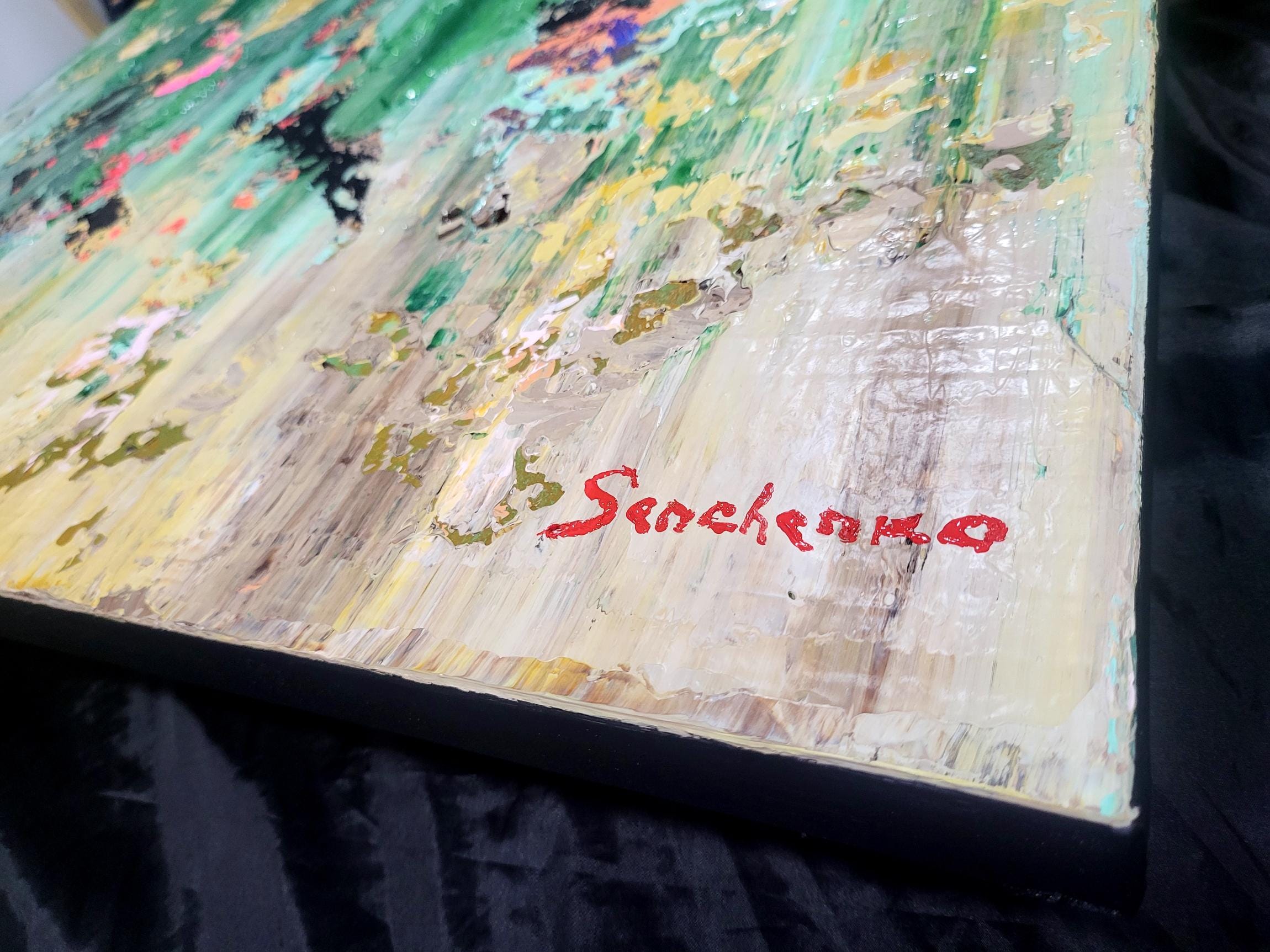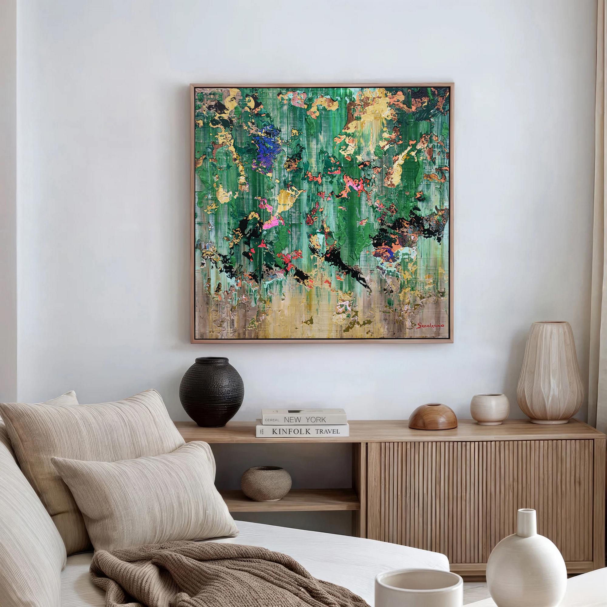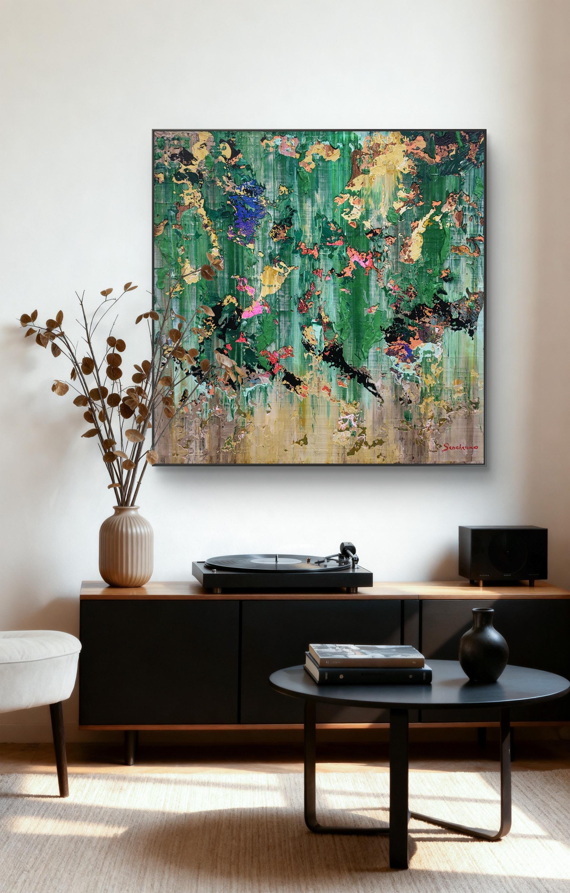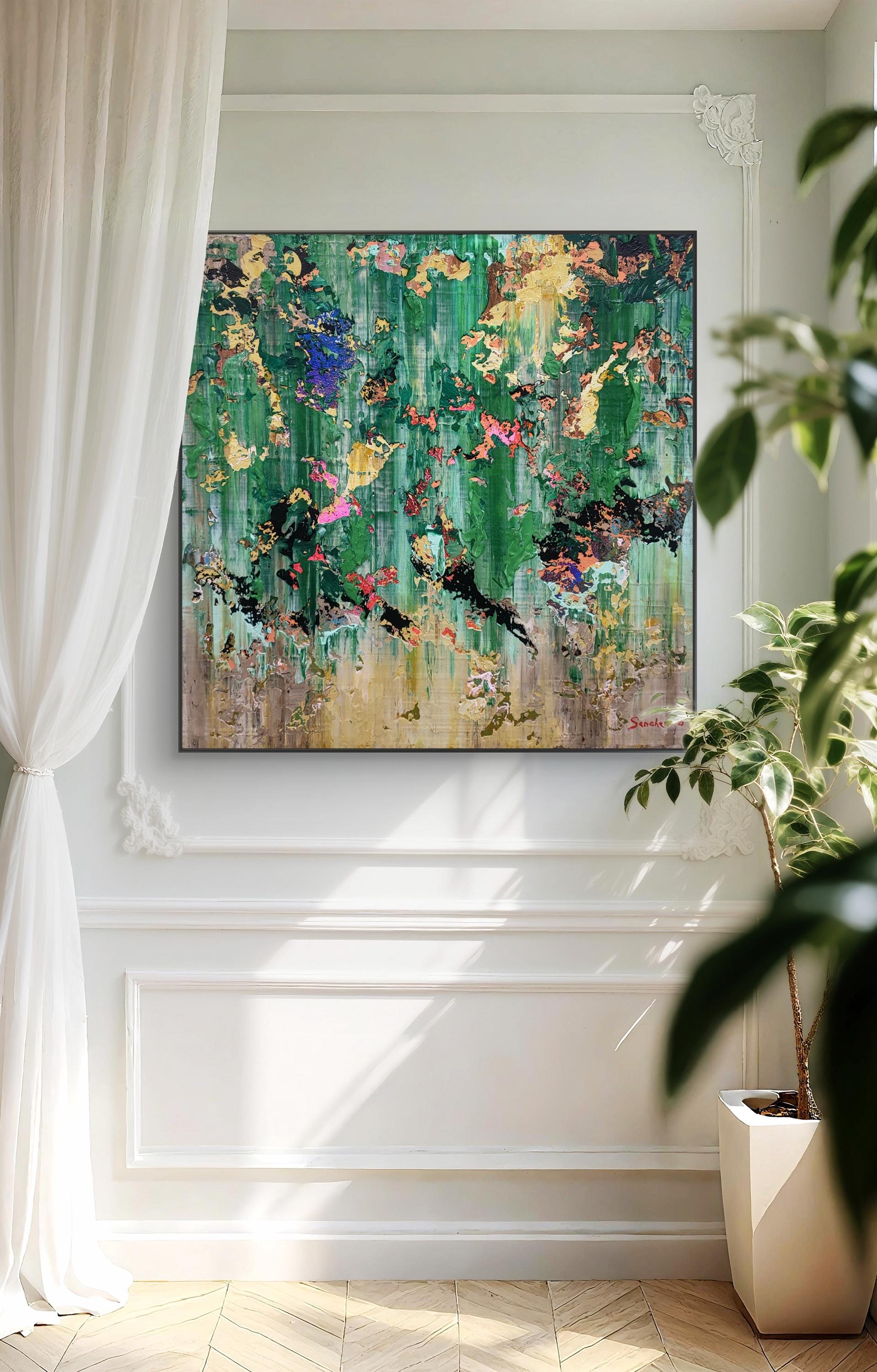 This artwork presents a captivating interplay of vibrant colors and dynamic textures, creating a stunning visual experience. Bold strokes of green dominate the canvas, suggesting the vitality and chaotic beauty of nature. Scattered throughout are patches of gold, pink, and blue, each seeming to erupt from beneath the surface, adding depth and intrigue. The layering technique gives a sense of movement and energy, evoking the feeling of an abstract landscape in perpetual transformation. The rough, splattered texture contrasts with subtle gradients, showcasing the artist's skill in balancing chaos with harmony. This piece draws viewers into a world of imaginative interpretation, inviting them to explore its abstract depths. Each glance offers new insights, making it a compelling focal point in any collection.