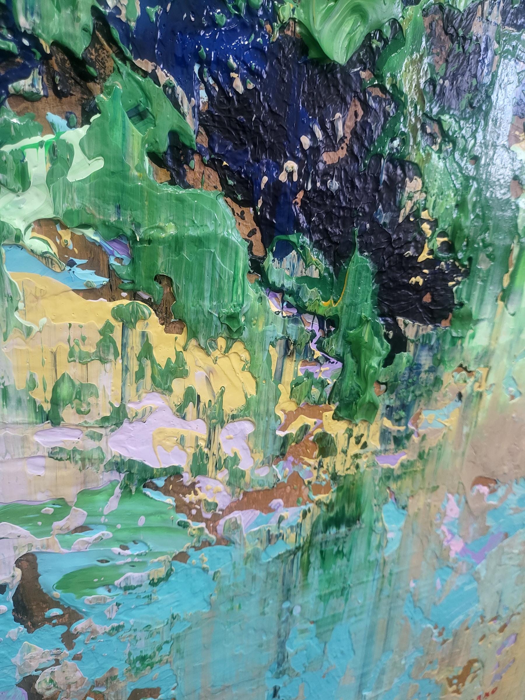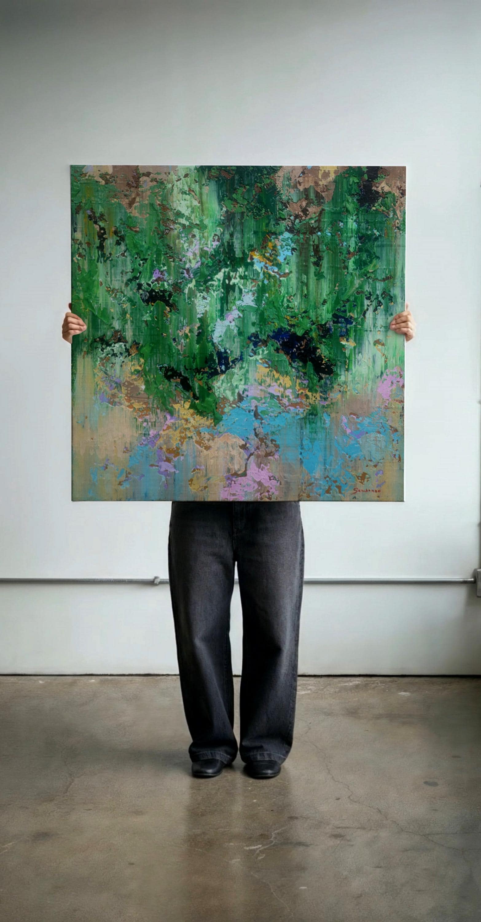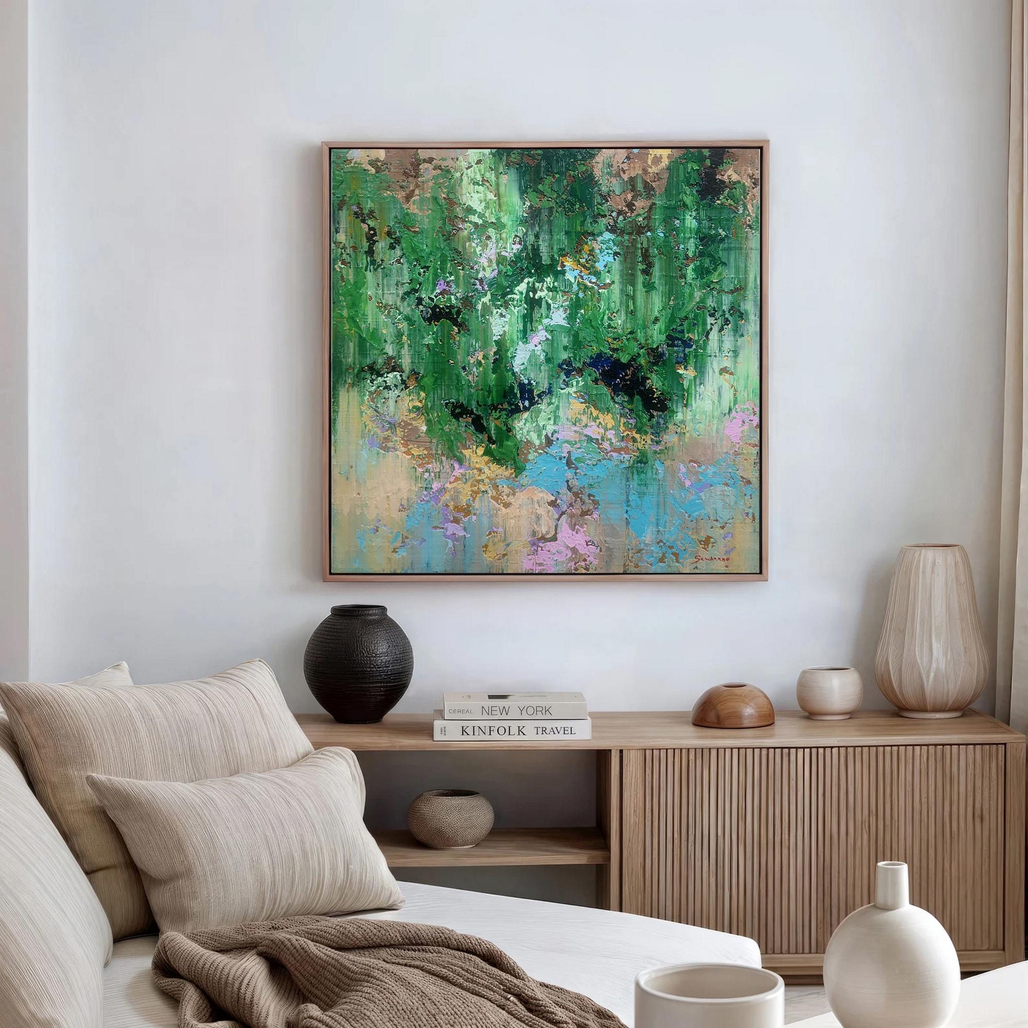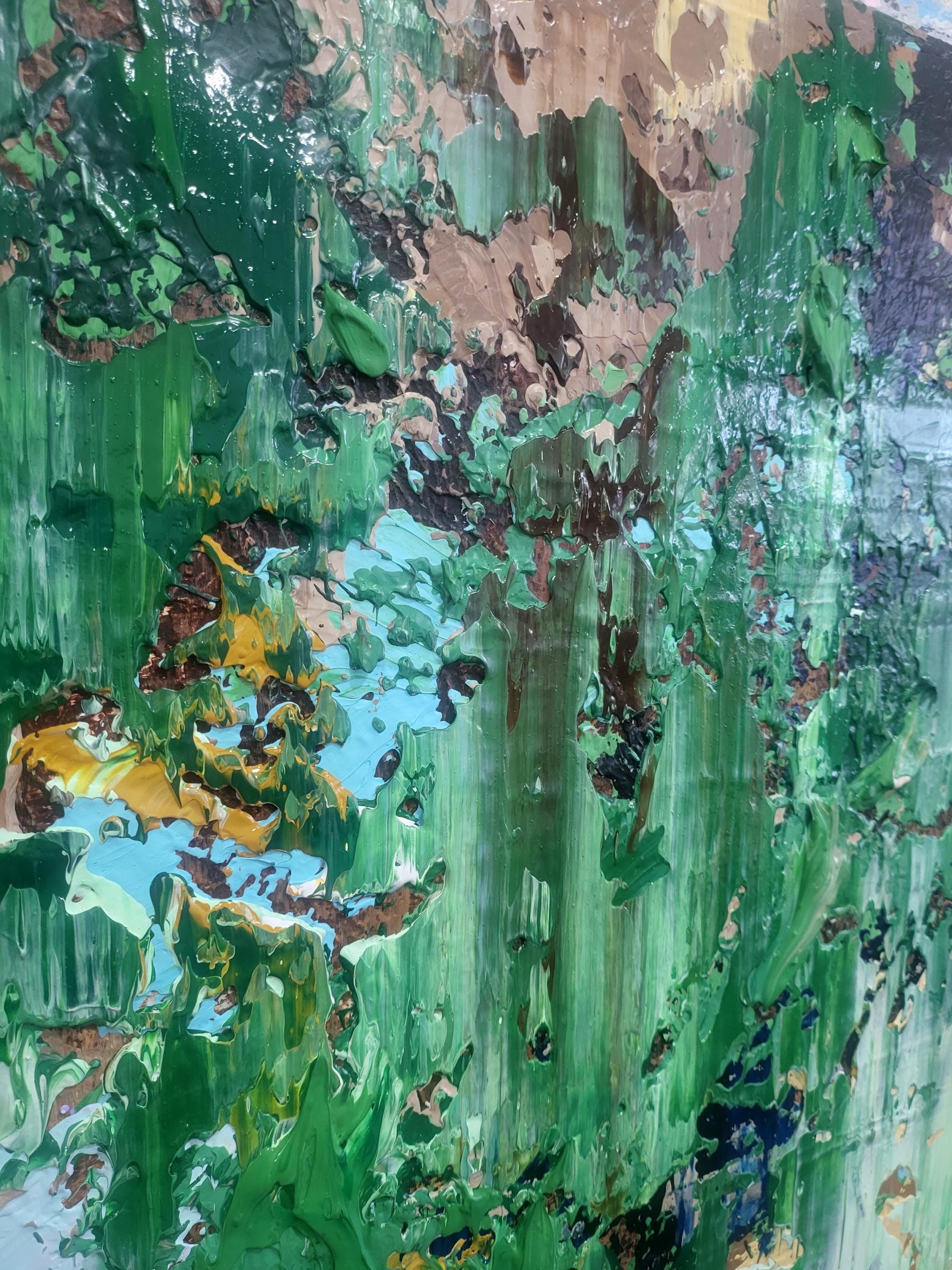 This artwork is a mesmerizing abstract composition dominated by lush greens and deep blues, evoking the essence of a verdant, cascading forest. The painter employs a dripping technique, with vibrant greens appearing to flow organically downward, merging seamlessly into earthy browns below. Splashes of light blue and delicate pink add contrast, suggesting fleeting moments of sky and flora amidst the dense vegetation. The dynamic texture and layered colors create a sense of movement and depth, inviting viewers to explore the complexity within. The artist’s bold use of color and fluid motion captures the untamed beauty of nature, offering an immersive experience that is both tranquil and invigorating. The piece stands out for its innovative approach, blending harmony with raw, unfiltered energy.