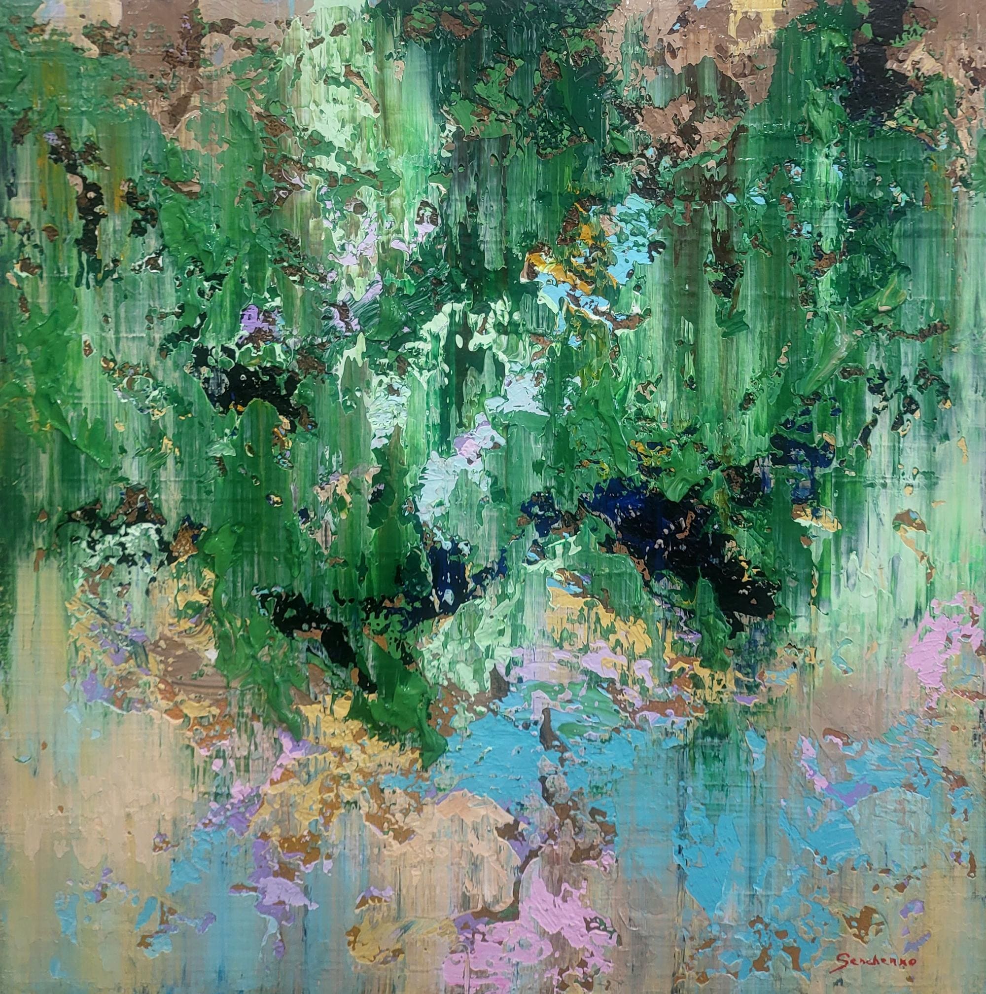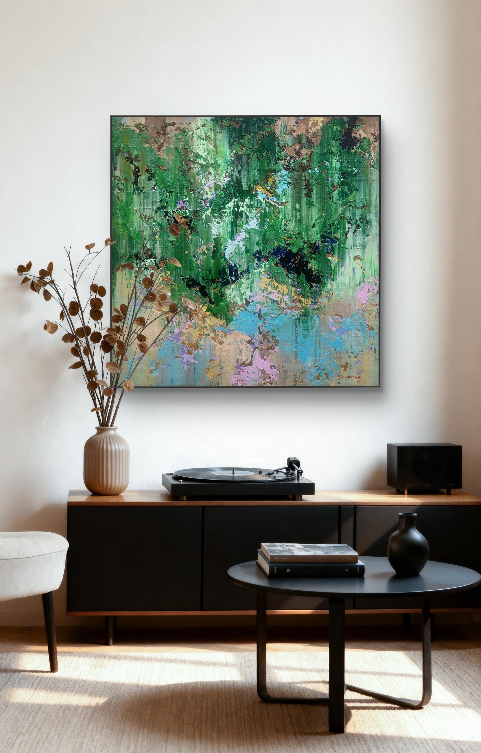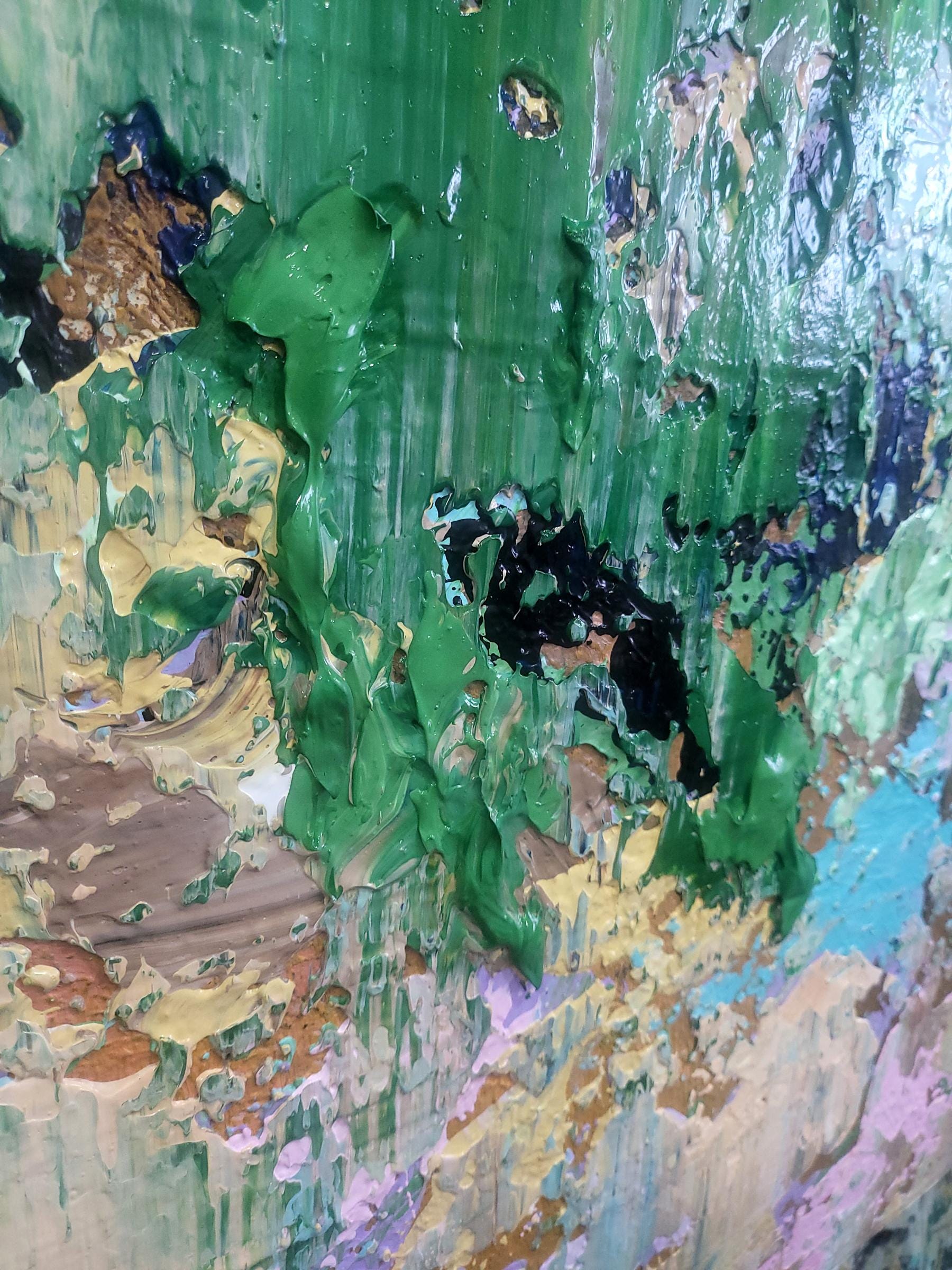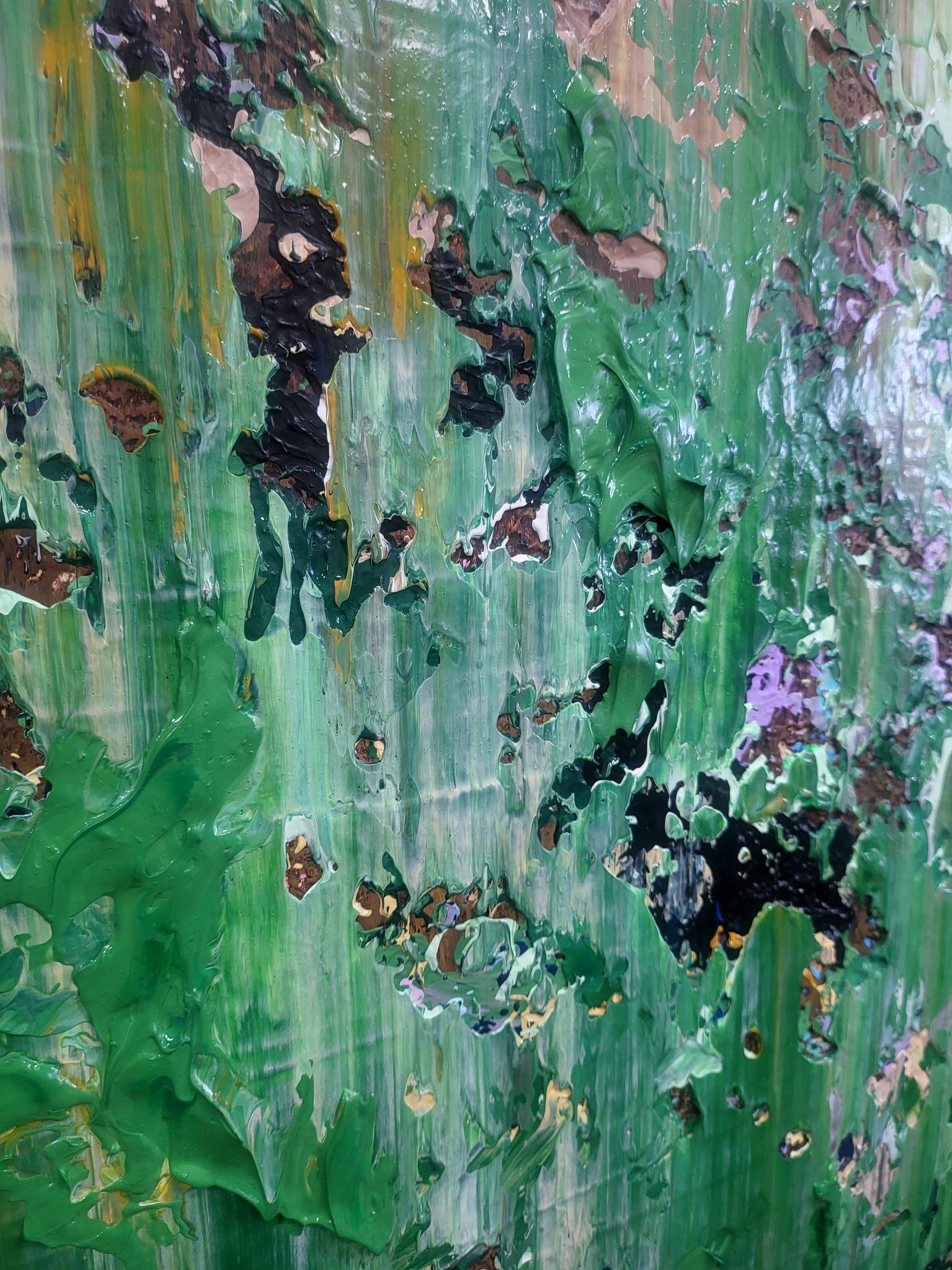This artwork is a mesmerizing abstract composition dominated by lush greens and deep blues, evoking the essence of a verdant, cascading forest. The painter employs a dripping technique, with vibrant greens appearing to flow organically downward, merging seamlessly into earthy browns below. Splashes of light blue and delicate pink add contrast, suggesting fleeting moments of sky and flora amidst the dense vegetation. The dynamic texture and layered colors create a sense of movement and depth, inviting viewers to explore the complexity within. The artist’s bold use of color and fluid motion captures the untamed beauty of nature, offering an immersive experience that is both tranquil and invigorating. The piece stands out for its innovative approach, blending harmony with raw, unfiltered energy.