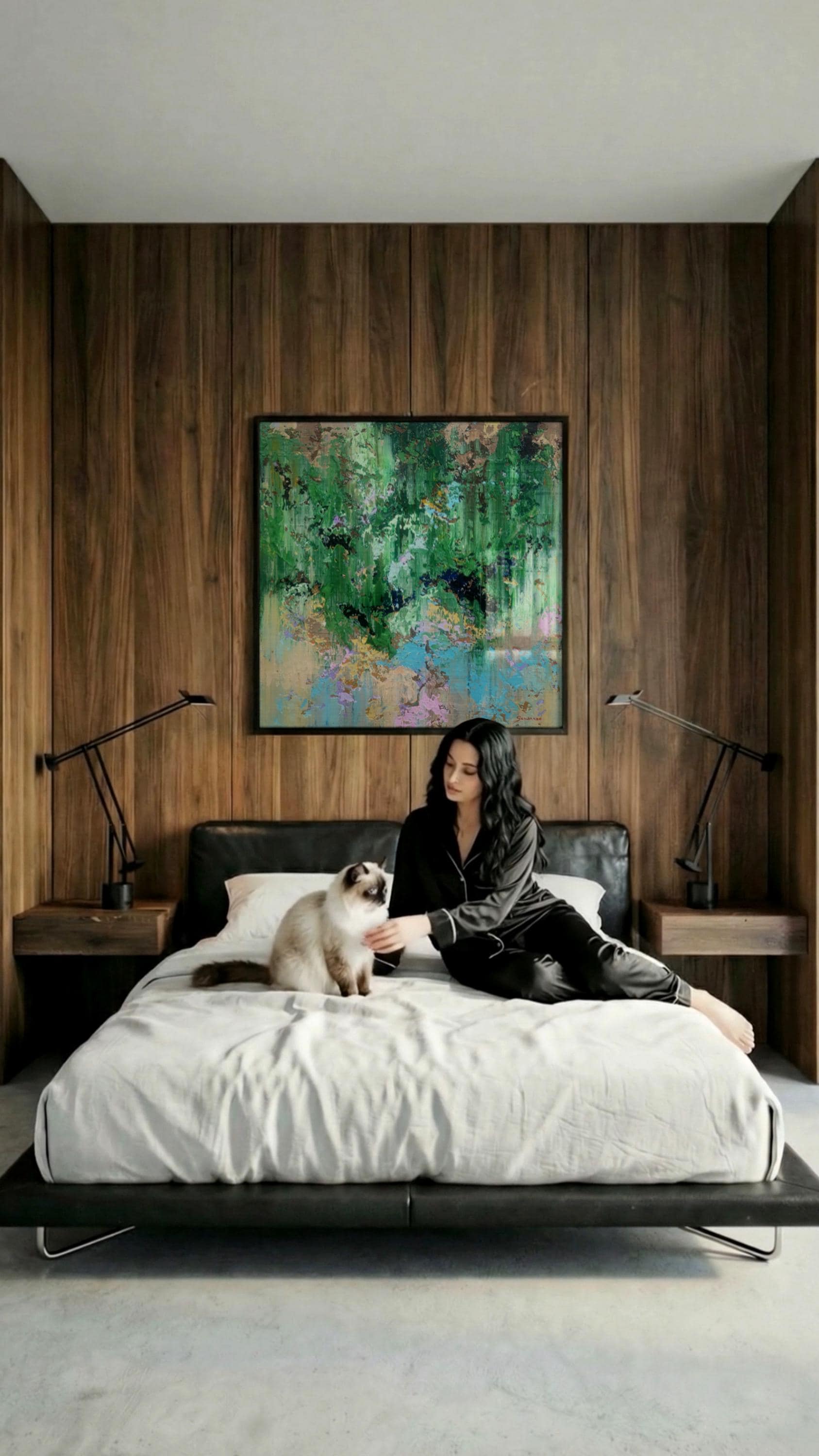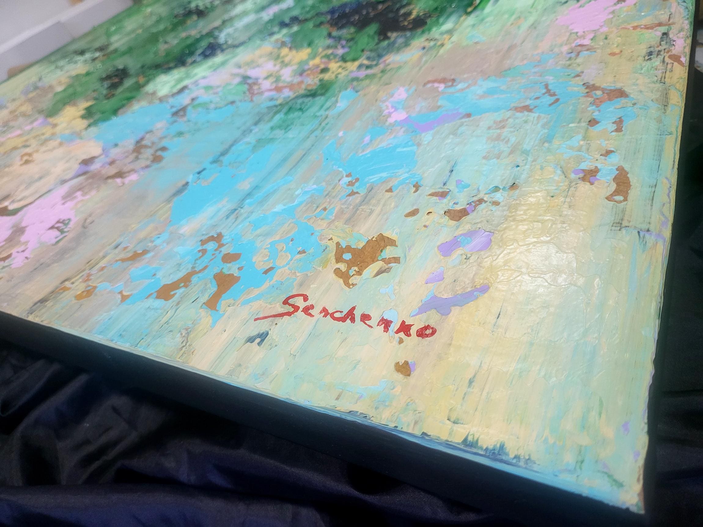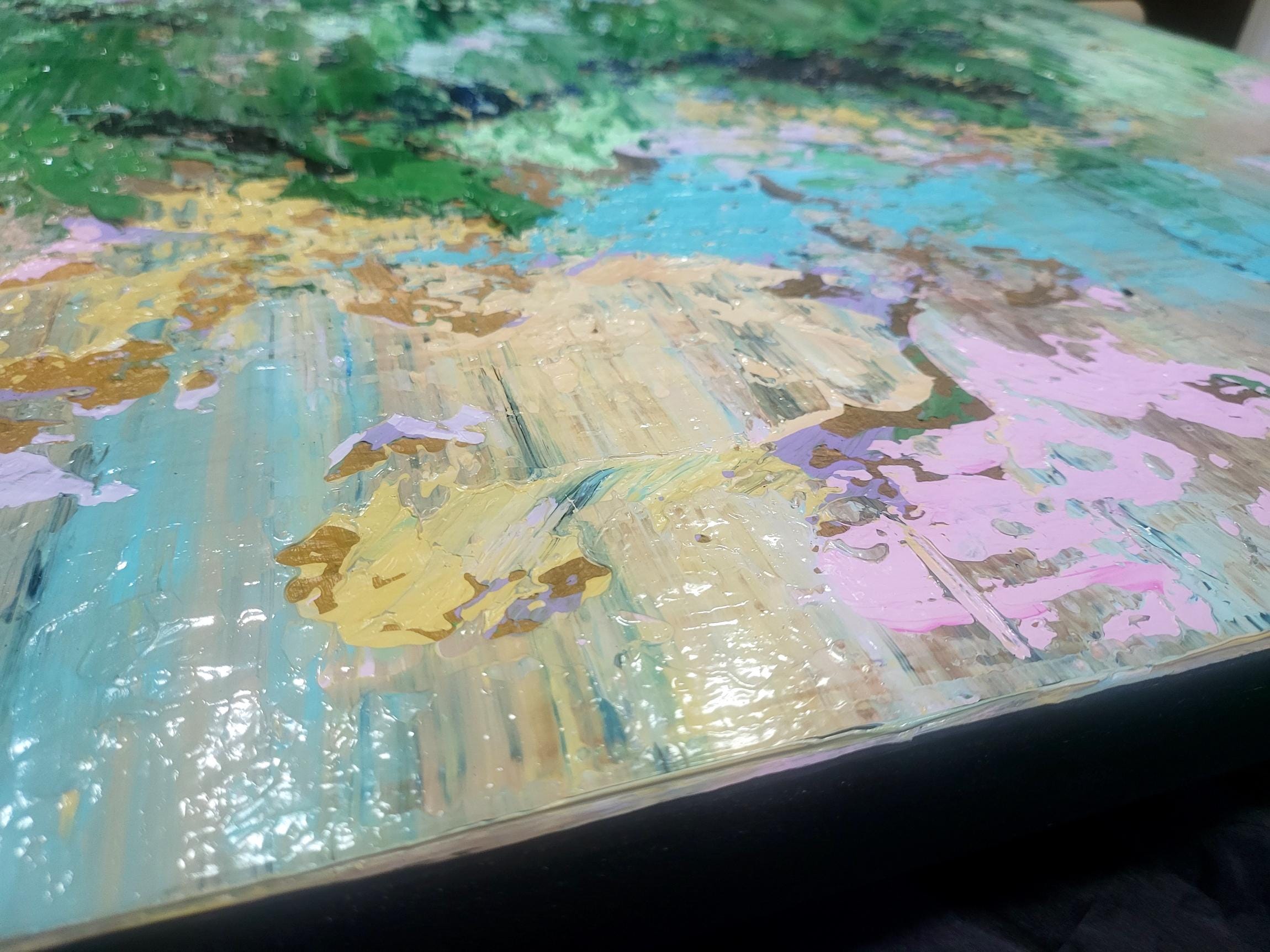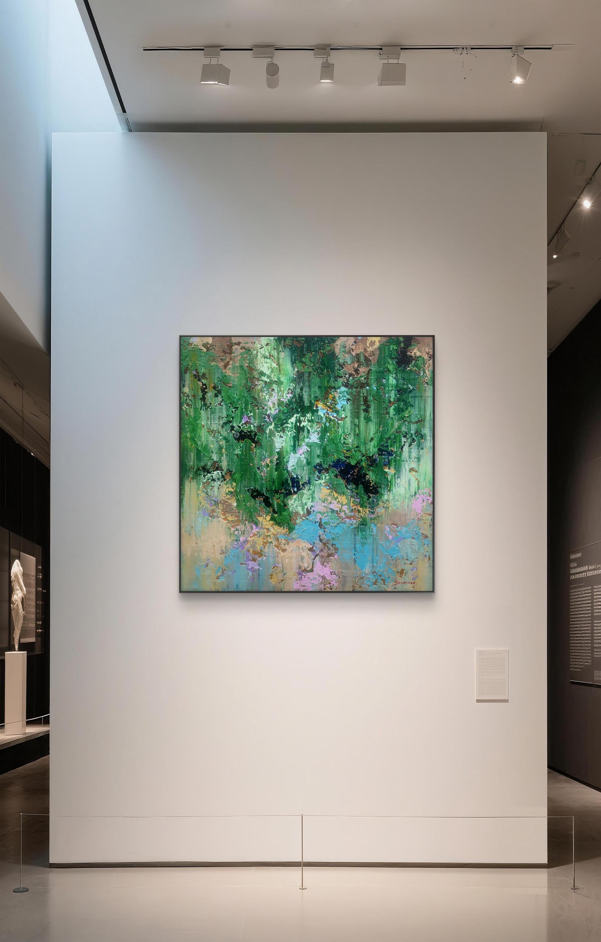 This artwork is a mesmerizing abstract composition dominated by lush greens and deep blues, evoking the essence of a verdant, cascading forest. The painter employs a dripping technique, with vibrant greens appearing to flow organically downward, merging seamlessly into earthy browns below. Splashes of light blue and delicate pink add contrast, suggesting fleeting moments of sky and flora amidst the dense vegetation. The dynamic texture and layered colors create a sense of movement and depth, inviting viewers to explore the complexity within. The artist’s bold use of color and fluid motion captures the untamed beauty of nature, offering an immersive experience that is both tranquil and invigorating. The piece stands out for its innovative approach, blending harmony with raw, unfiltered energy.