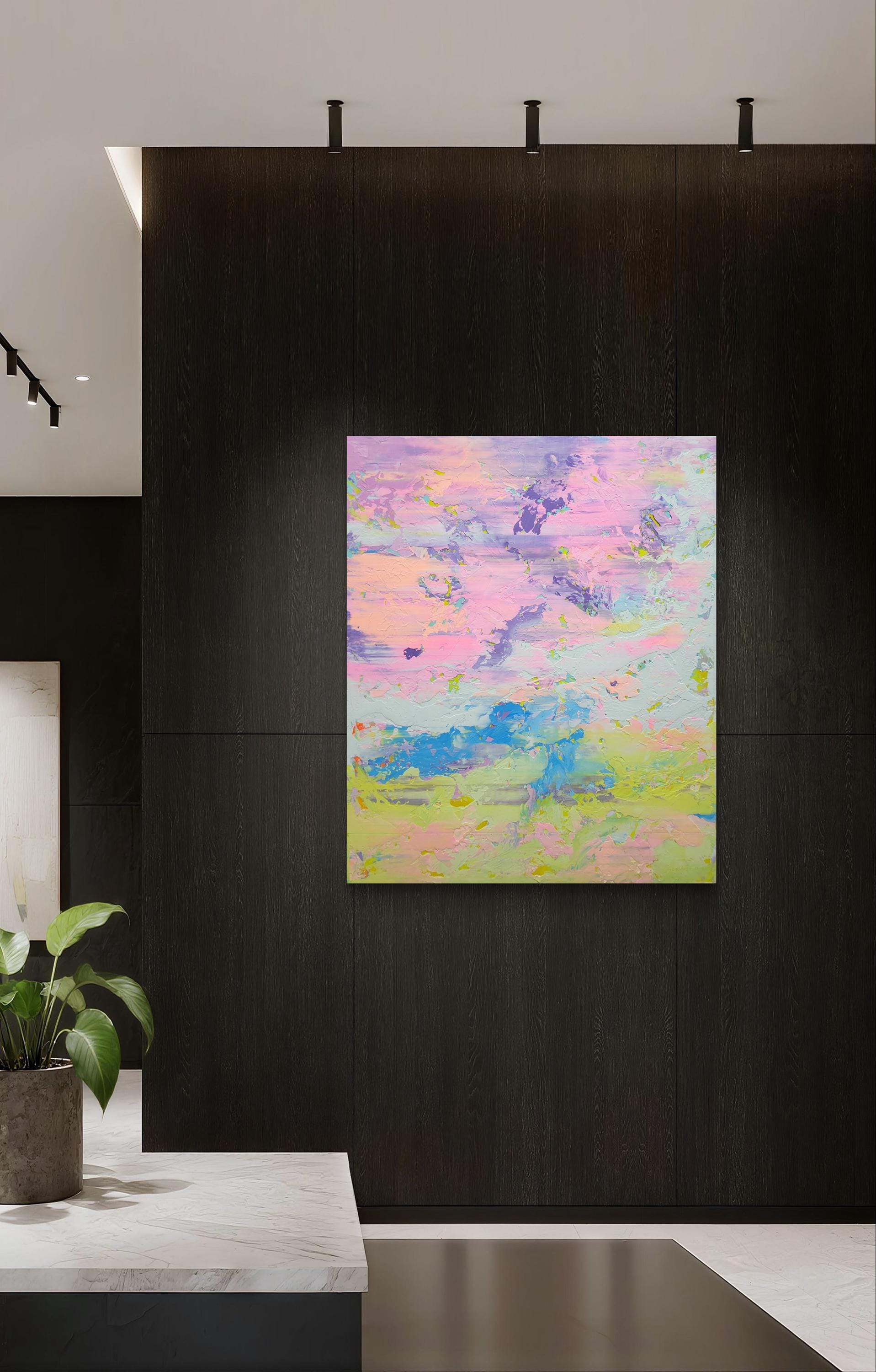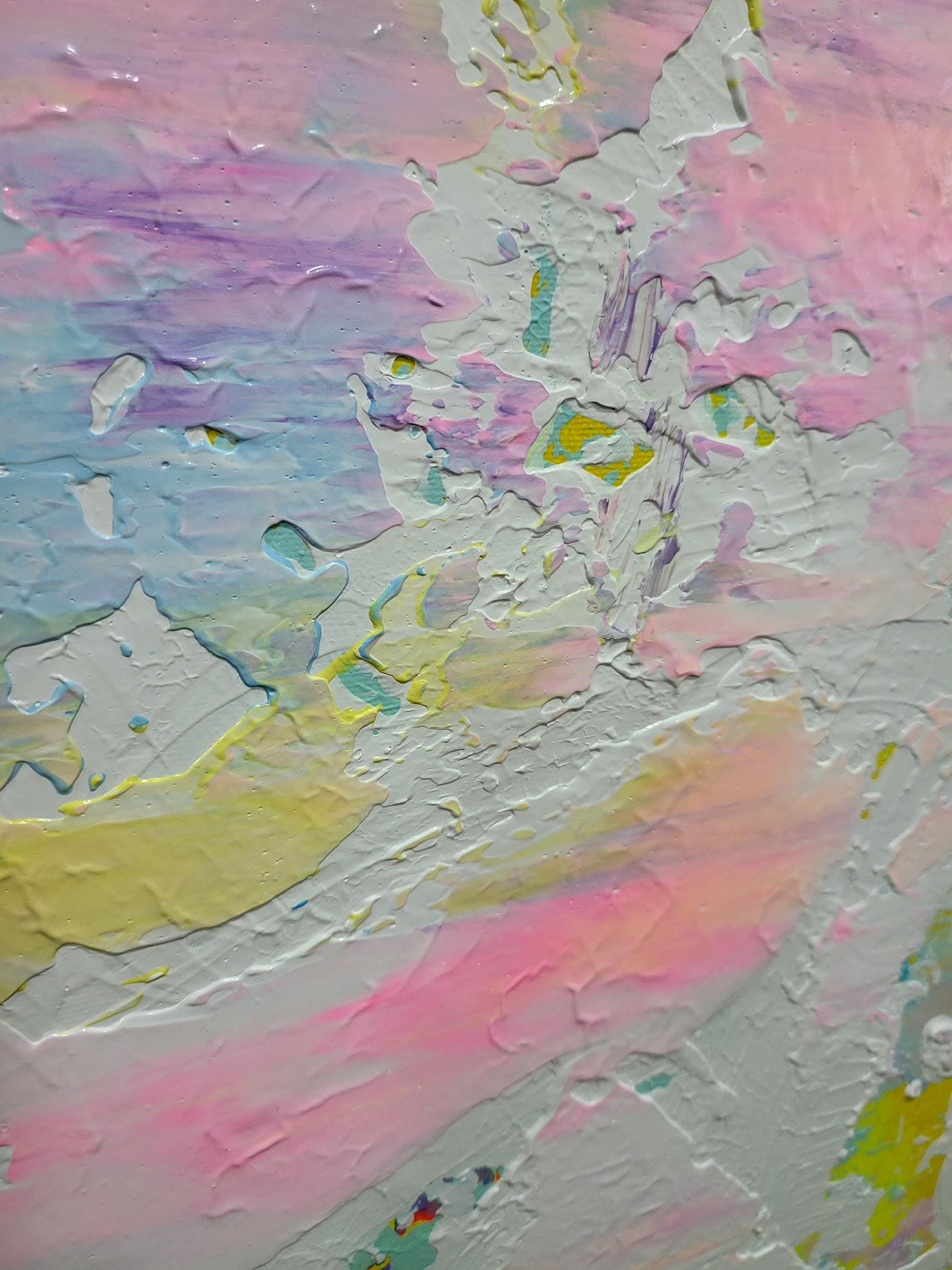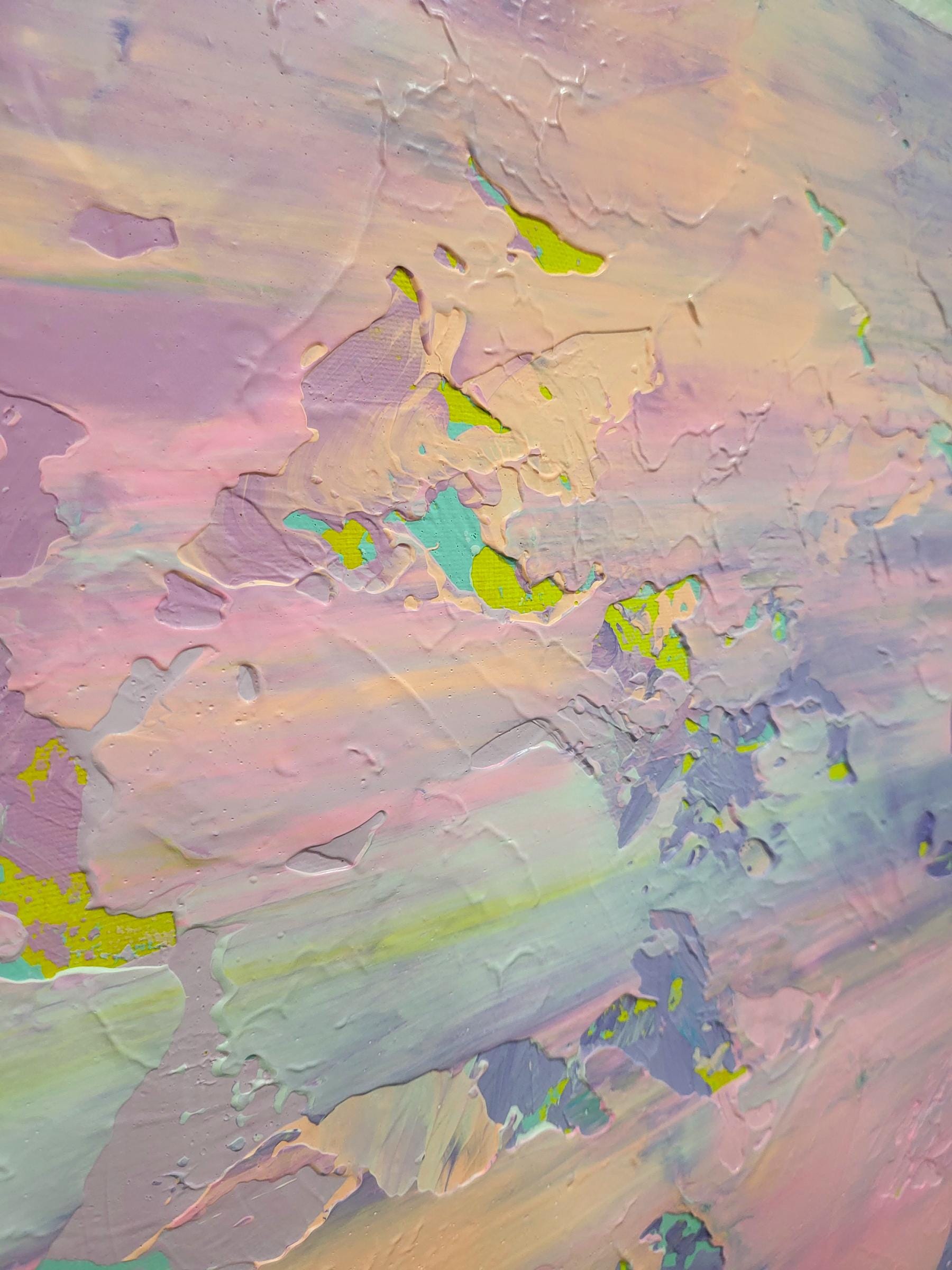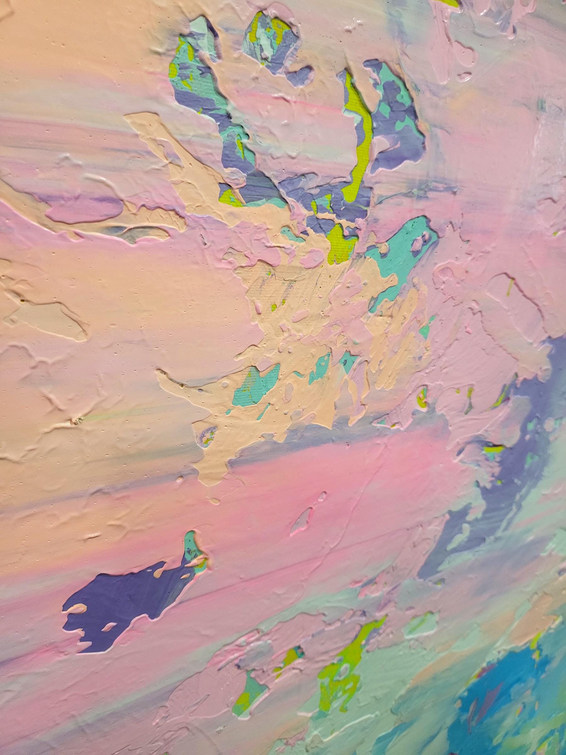 This artwork captures an ethereal landscape through a dynamic interplay of pastel hues. Predominantly featuring soft pinks, purples, and blues, the painting exudes a dream-like quality reminiscent of a serene sky at dawn. Bold brushstrokes and textured layers add depth and movement, suggesting a gentle breeze sweeping across the canvas. Flecks of yellow provide vibrant accents, infusing the piece with warmth and energy. The abstract composition challenges traditional perspectives, inviting viewers to delve into a world where imagination reigns. The harmonious blend of colors and textures creates a balanced yet invigorating visual experience, making this artwork a captivating exploration of light and atmosphere. Its unique synthesis of colors evokes feelings of tranquility and wonder, drawing the observer into an immersive and introspective journey.