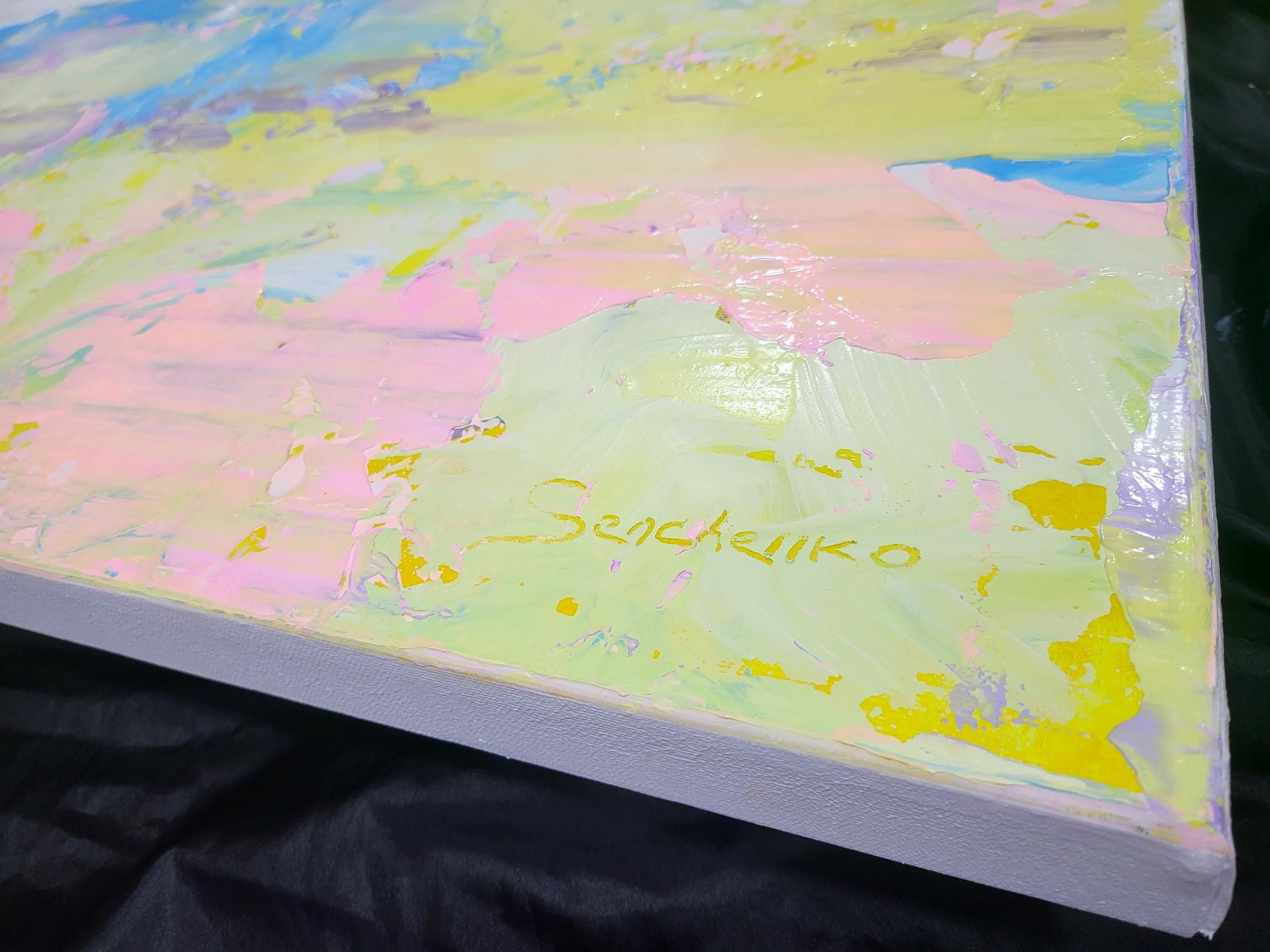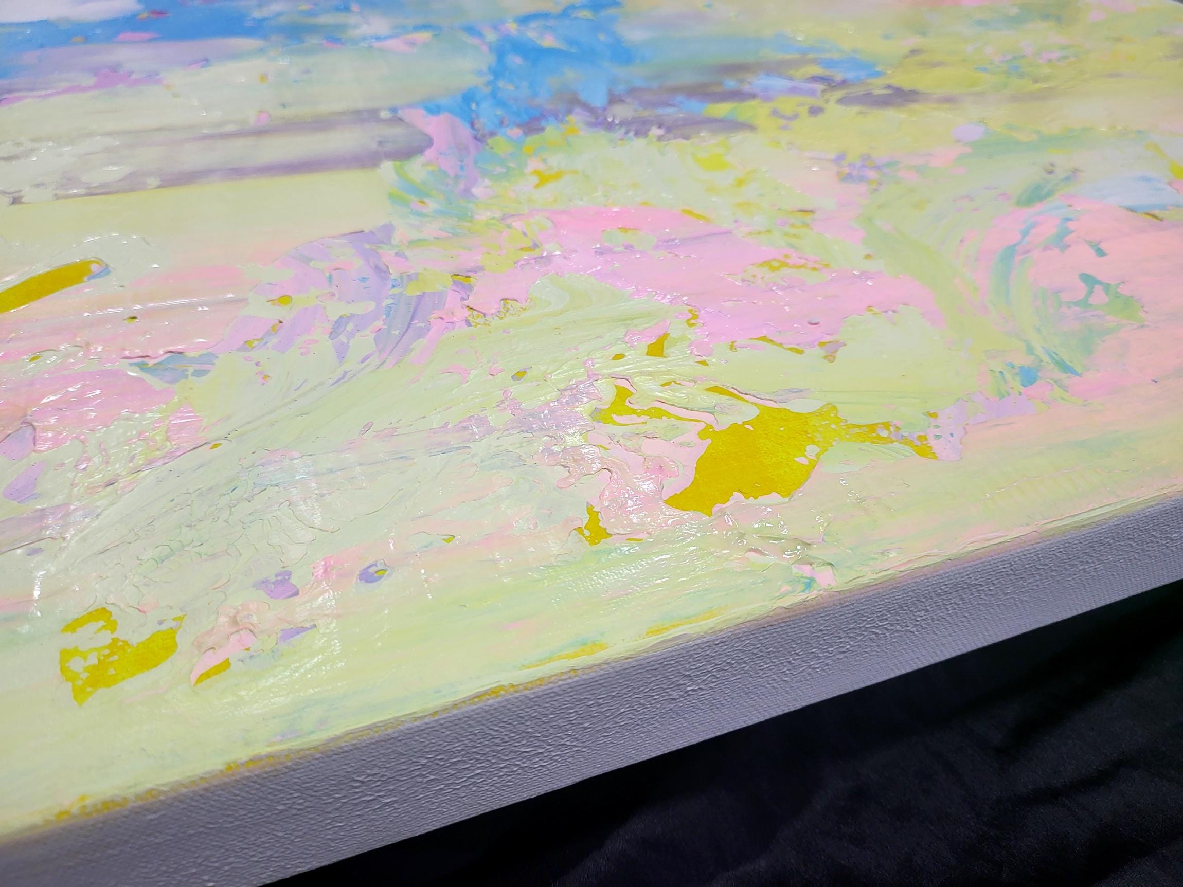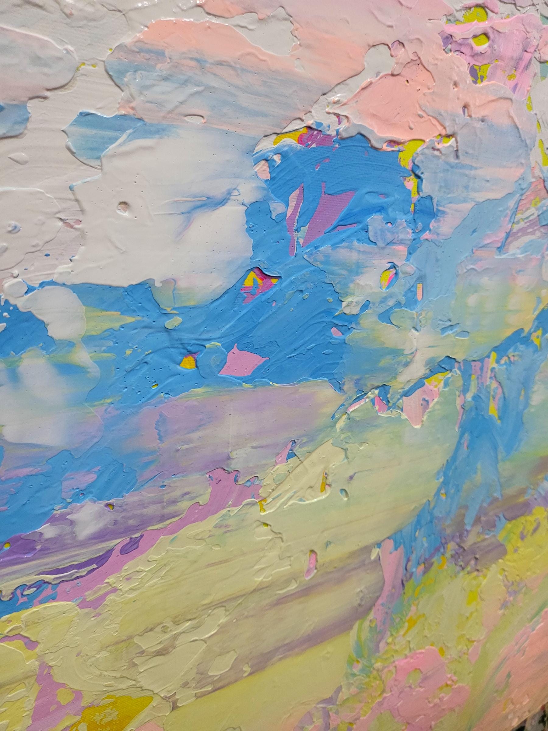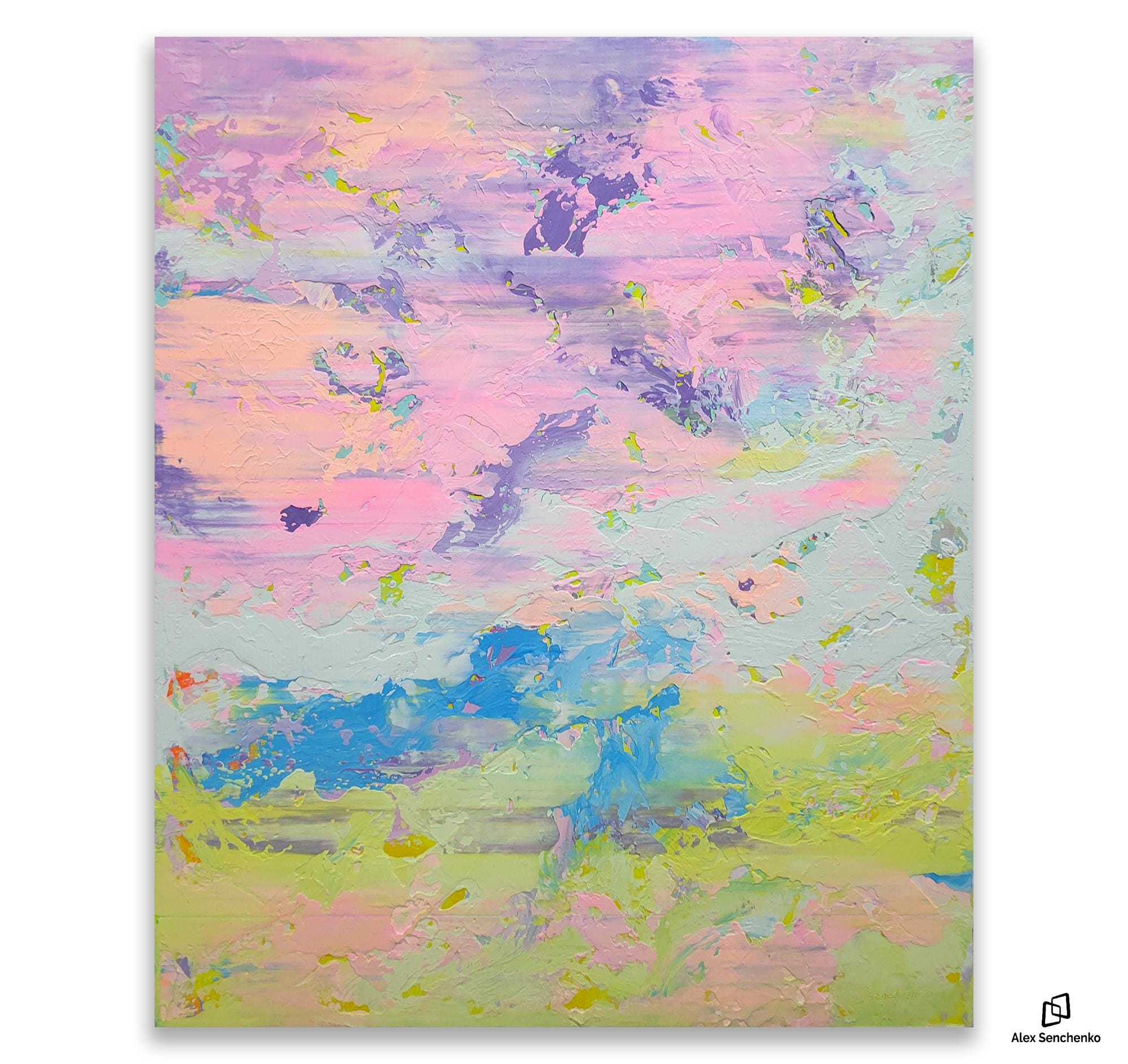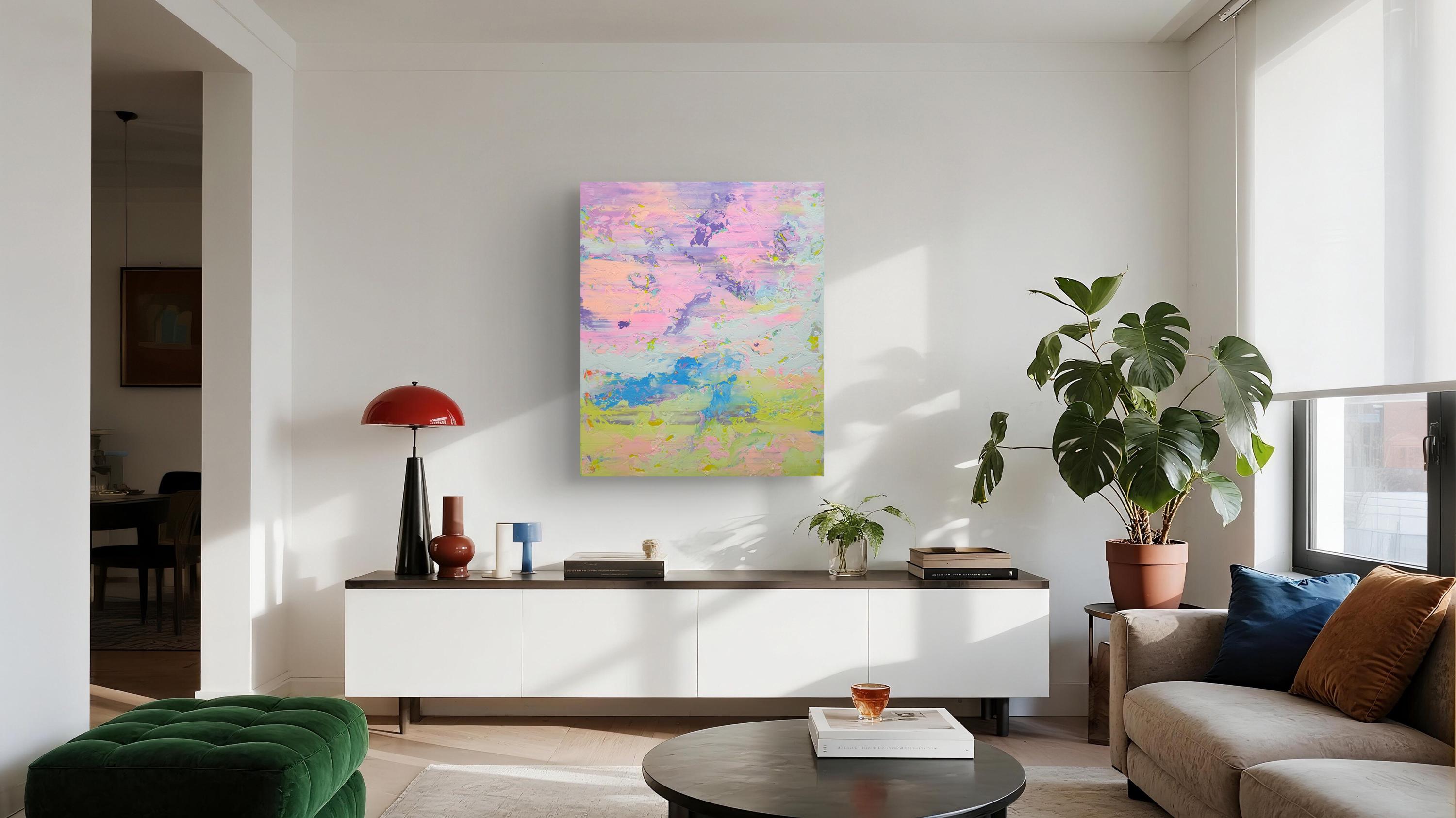 This artwork captures an ethereal landscape through a dynamic interplay of pastel hues. Predominantly featuring soft pinks, purples, and blues, the painting exudes a dream-like quality reminiscent of a serene sky at dawn. Bold brushstrokes and textured layers add depth and movement, suggesting a gentle breeze sweeping across the canvas. Flecks of yellow provide vibrant accents, infusing the piece with warmth and energy. The abstract composition challenges traditional perspectives, inviting viewers to delve into a world where imagination reigns. The harmonious blend of colors and textures creates a balanced yet invigorating visual experience, making this artwork a captivating exploration of light and atmosphere. Its unique synthesis of colors evokes feelings of tranquility and wonder, drawing the observer into an immersive and introspective journey.