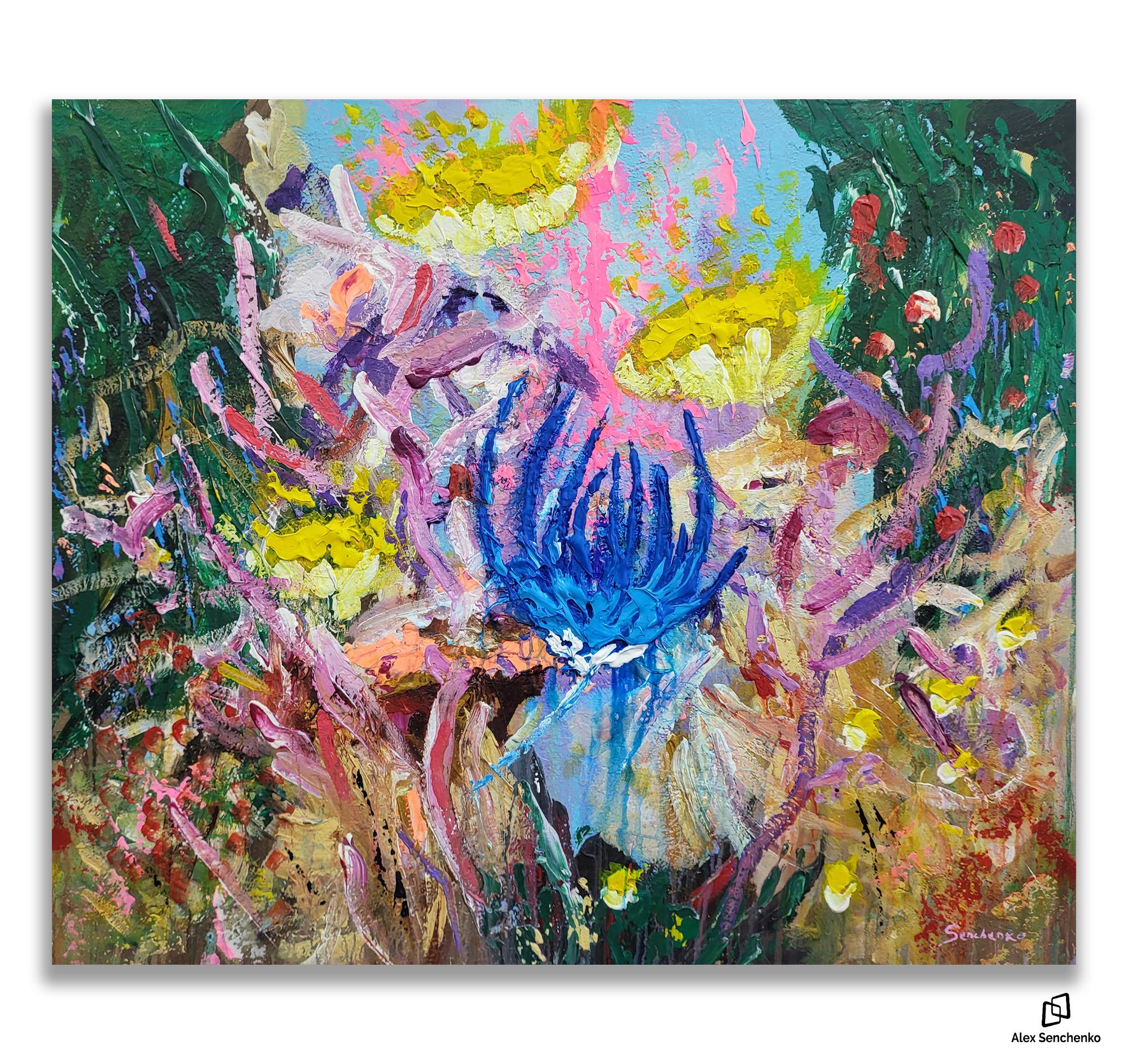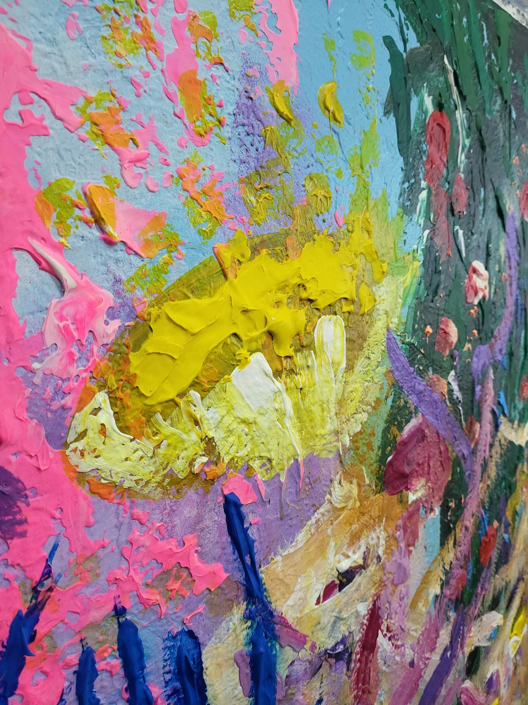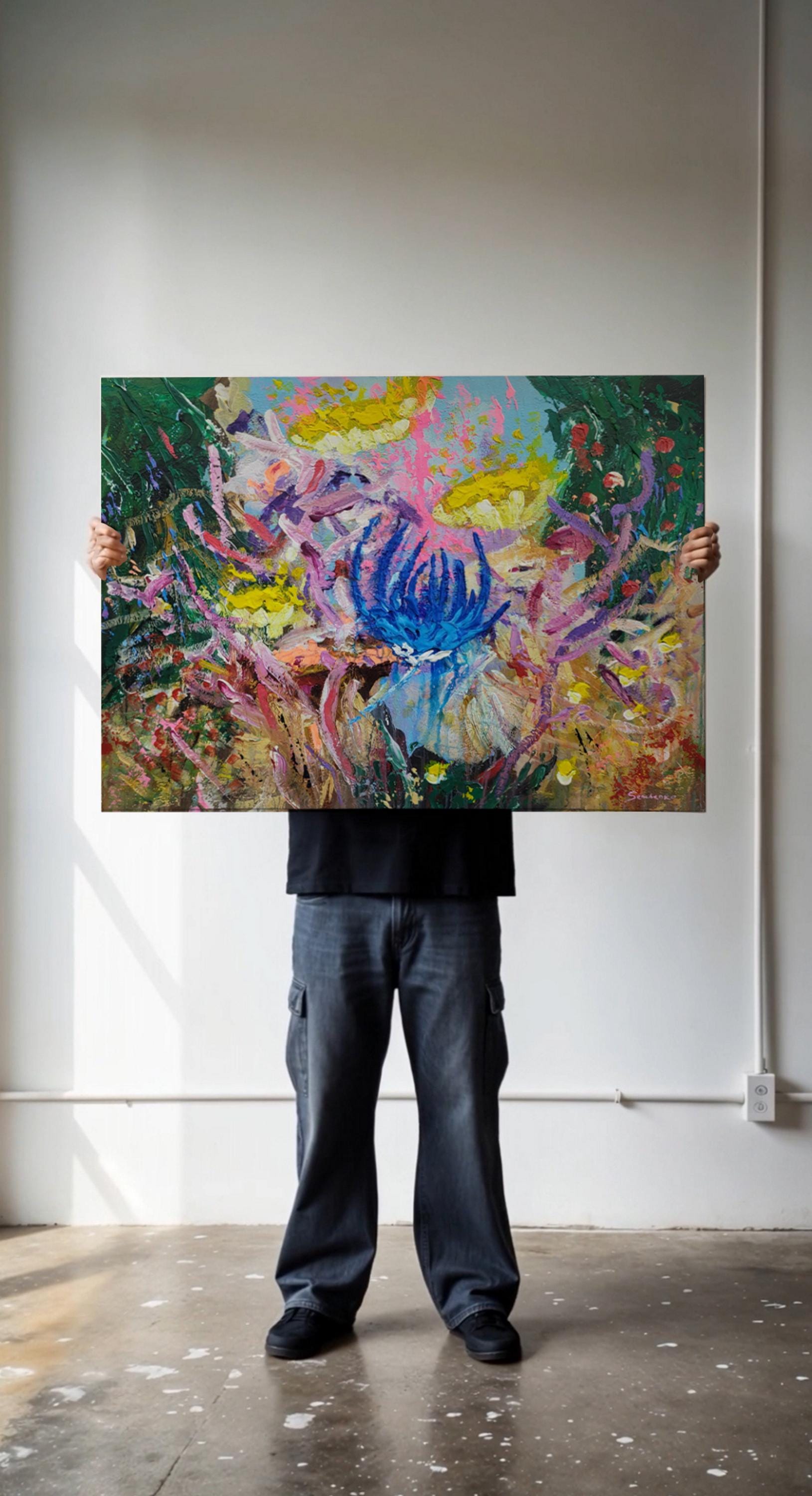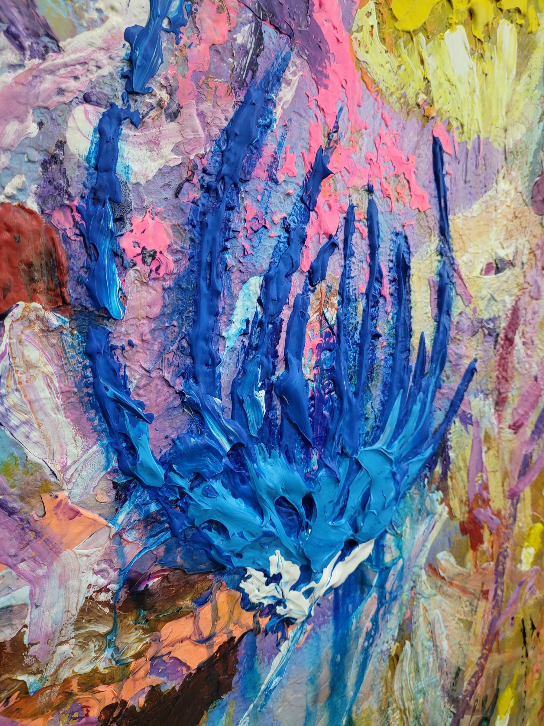 This vibrant artwork bursts with an explosion of colors, dominated by rich blues, pinks, and yellows. At its heart, a dynamic swirl of blue forms a captivating focal point, possibly resembling an ethereal figure or abstract form, surrounded by lively brushstrokes. The artist employs bold, expressive techniques, layering textures to create depth and movement. The surrounding hues, reminiscent of a thriving garden, incorporate splashes of green and hints of red, conveying a sense of lively chaos. The interplay of colors and forms evokes both natural and fantastical elements, inviting viewers to explore the myriad details contained within. This piece masterfully balances abstraction with suggestion, urging the observer to interpret its essence. Its dynamic composition and vivid palette make it a striking example of expressive contemporary art.