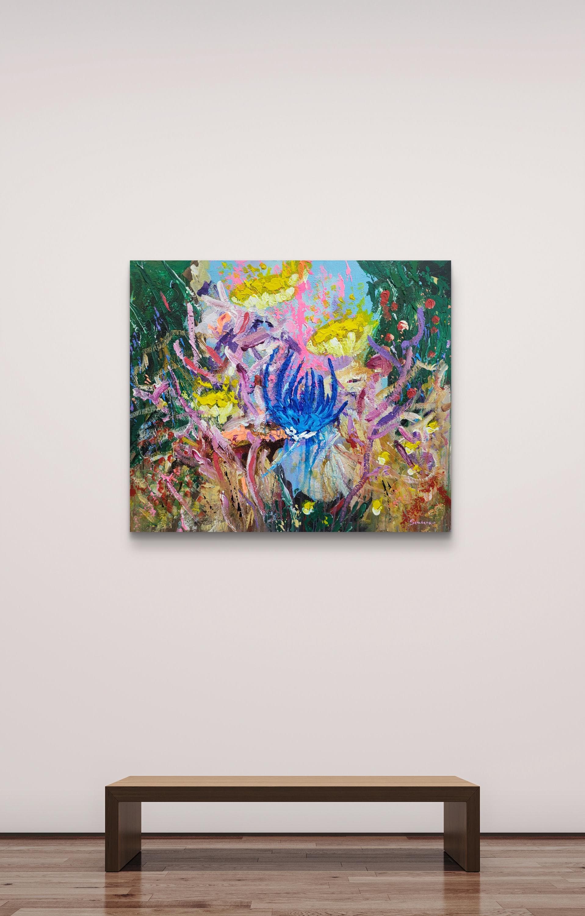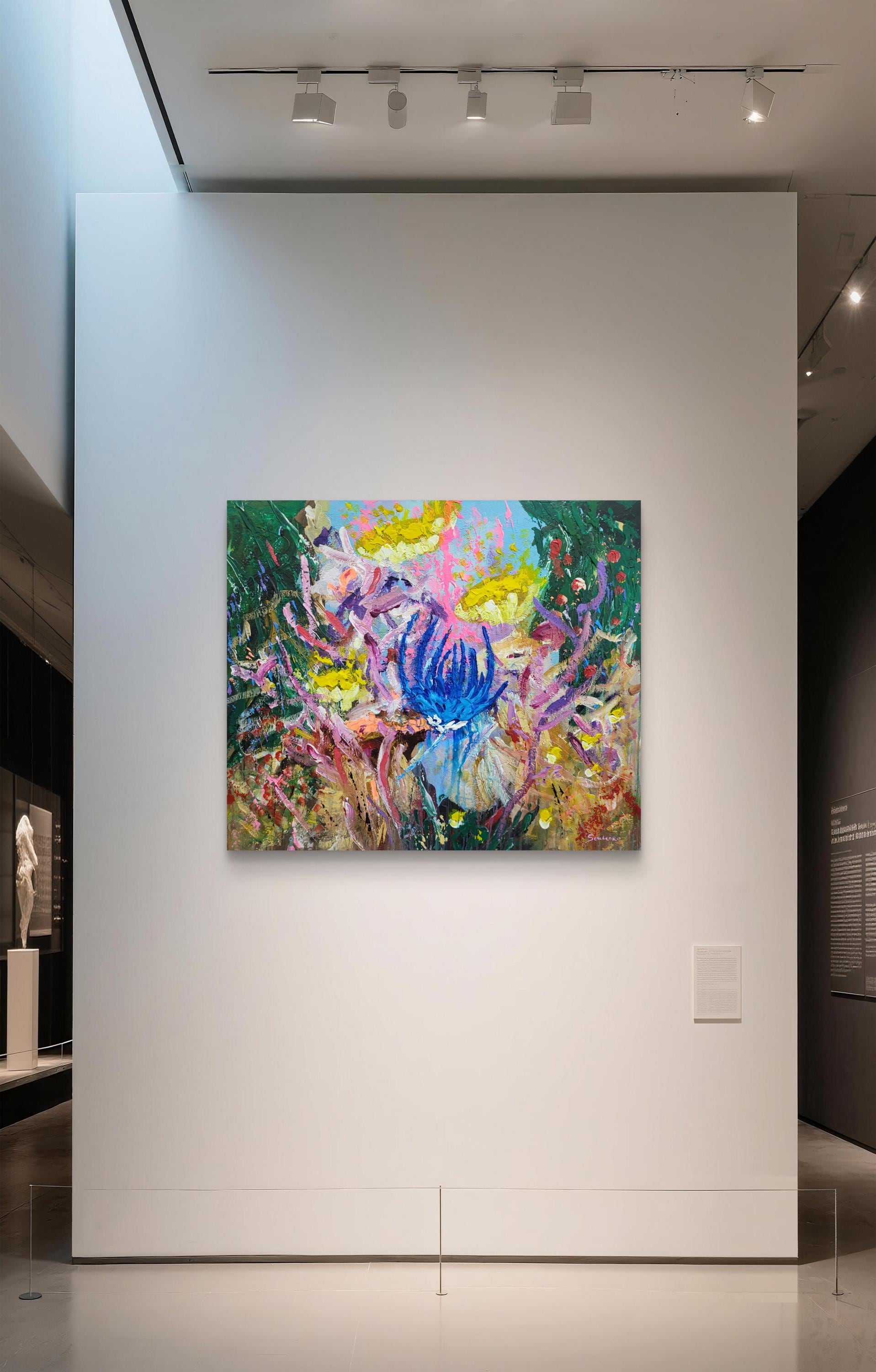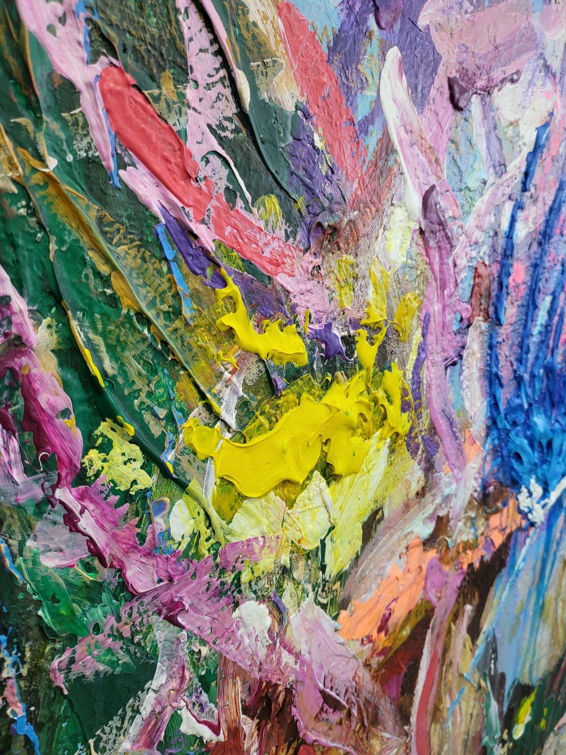 This vibrant artwork bursts with an explosion of colors, dominated by rich blues, pinks, and yellows. At its heart, a dynamic swirl of blue forms a captivating focal point, possibly resembling an ethereal figure or abstract form, surrounded by lively brushstrokes. The artist employs bold, expressive techniques, layering textures to create depth and movement. The surrounding hues, reminiscent of a thriving garden, incorporate splashes of green and hints of red, conveying a sense of lively chaos. The interplay of colors and forms evokes both natural and fantastical elements, inviting viewers to explore the myriad details contained within. This piece masterfully balances abstraction with suggestion, urging the observer to interpret its essence. Its dynamic composition and vivid palette make it a striking example of expressive contemporary art.