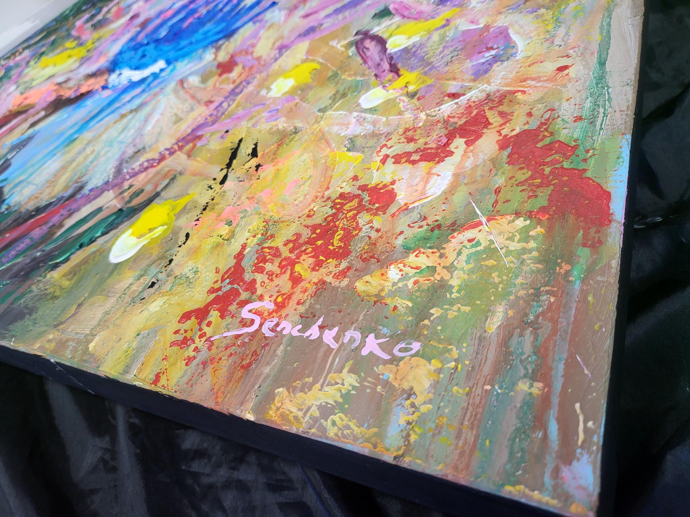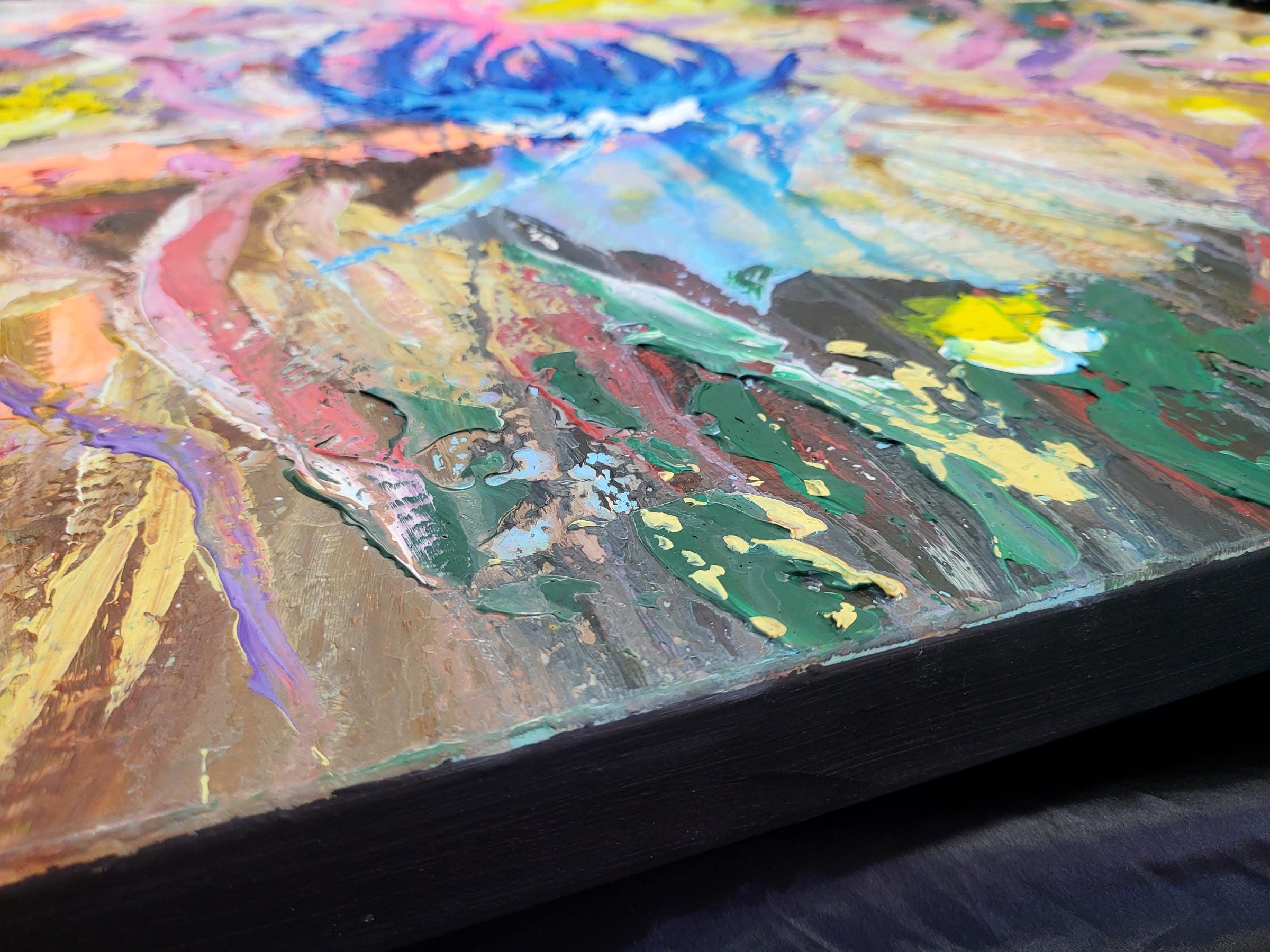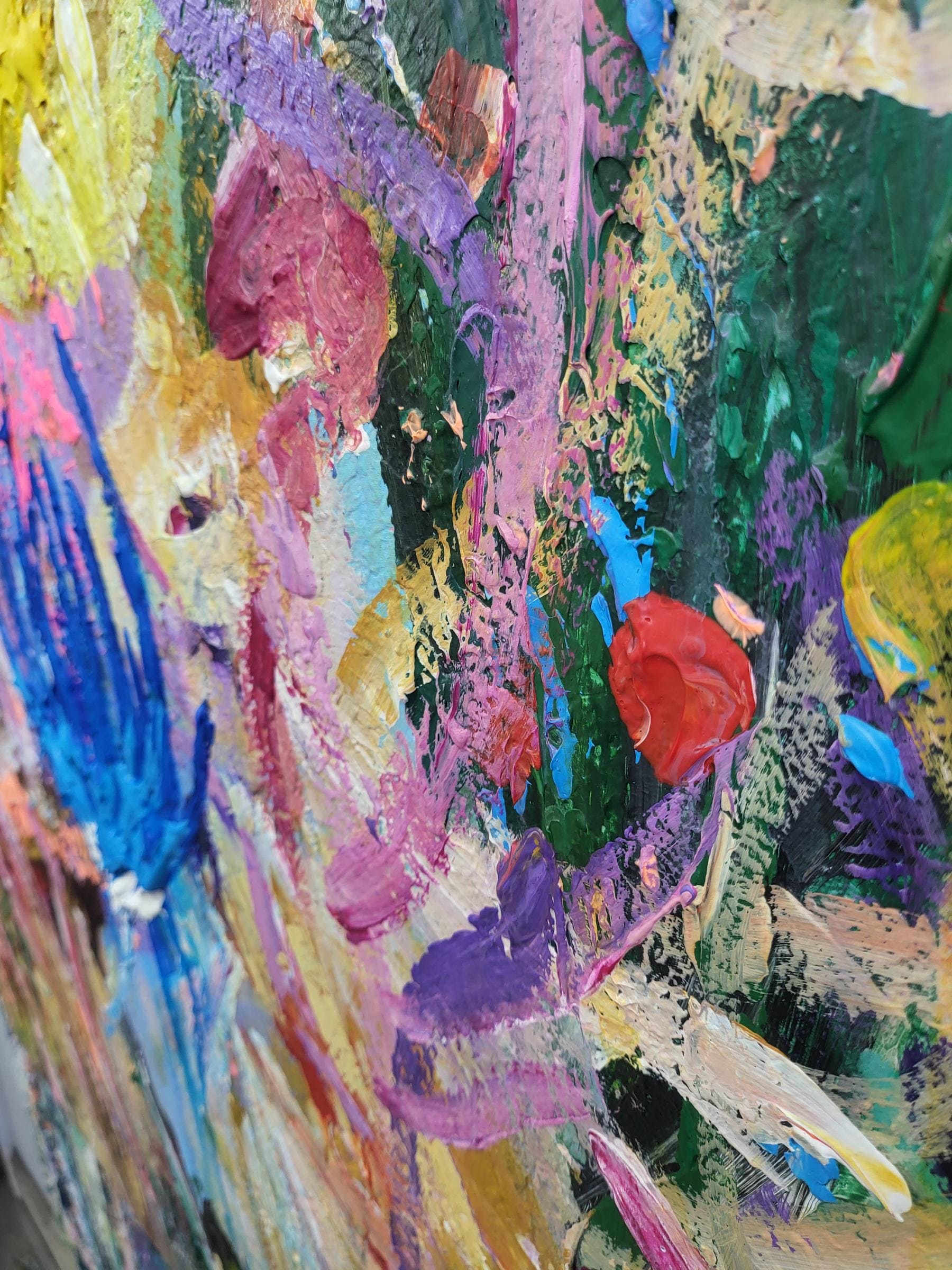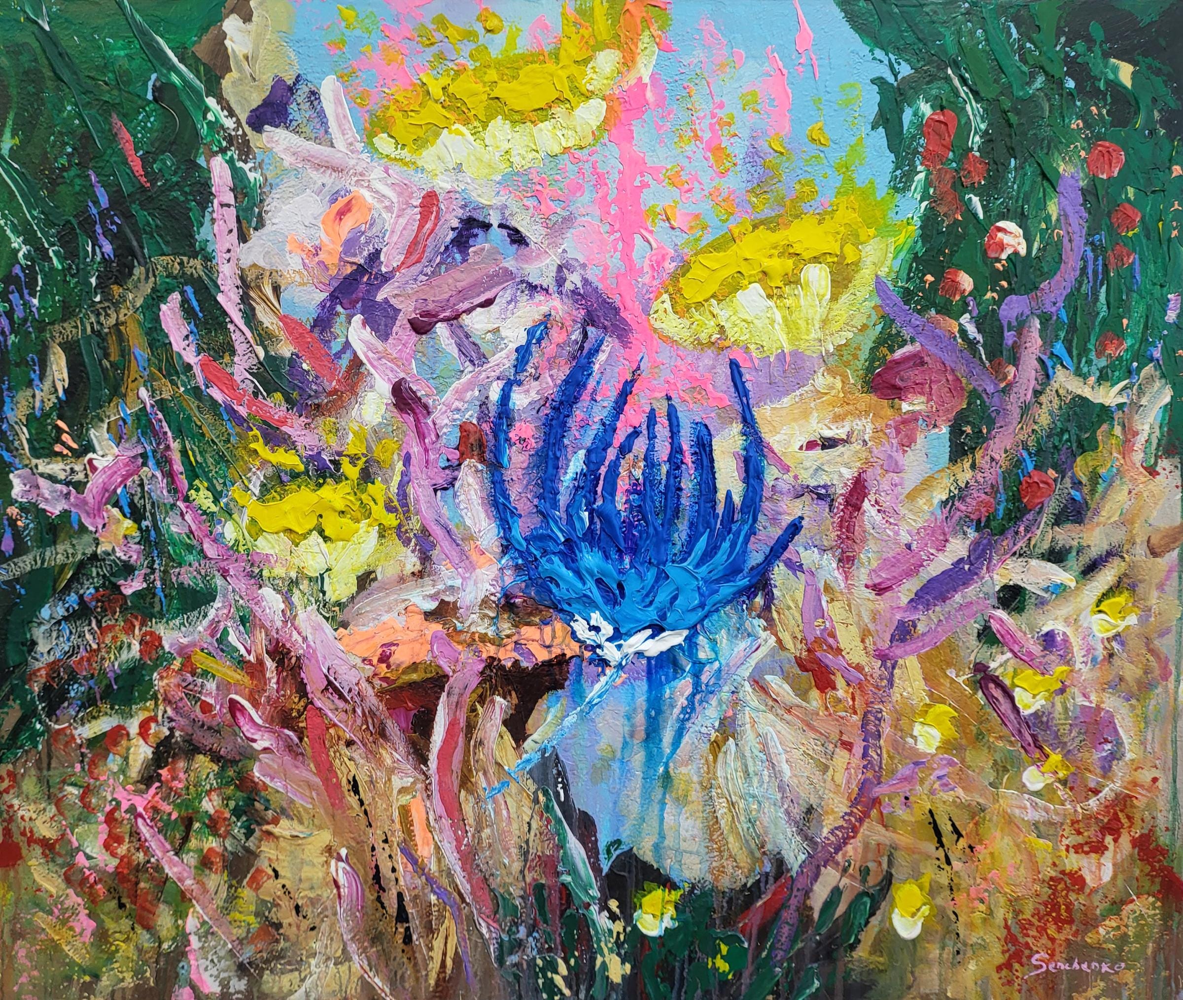 This vibrant artwork bursts with an explosion of colors, dominated by rich blues, pinks, and yellows. At its heart, a dynamic swirl of blue forms a captivating focal point, possibly resembling an ethereal figure or abstract form, surrounded by lively brushstrokes. The artist employs bold, expressive techniques, layering textures to create depth and movement. The surrounding hues, reminiscent of a thriving garden, incorporate splashes of green and hints of red, conveying a sense of lively chaos. The interplay of colors and forms evokes both natural and fantastical elements, inviting viewers to explore the myriad details contained within. This piece masterfully balances abstraction with suggestion, urging the observer to interpret its essence. Its dynamic composition and vivid palette make it a striking example of expressive contemporary art.