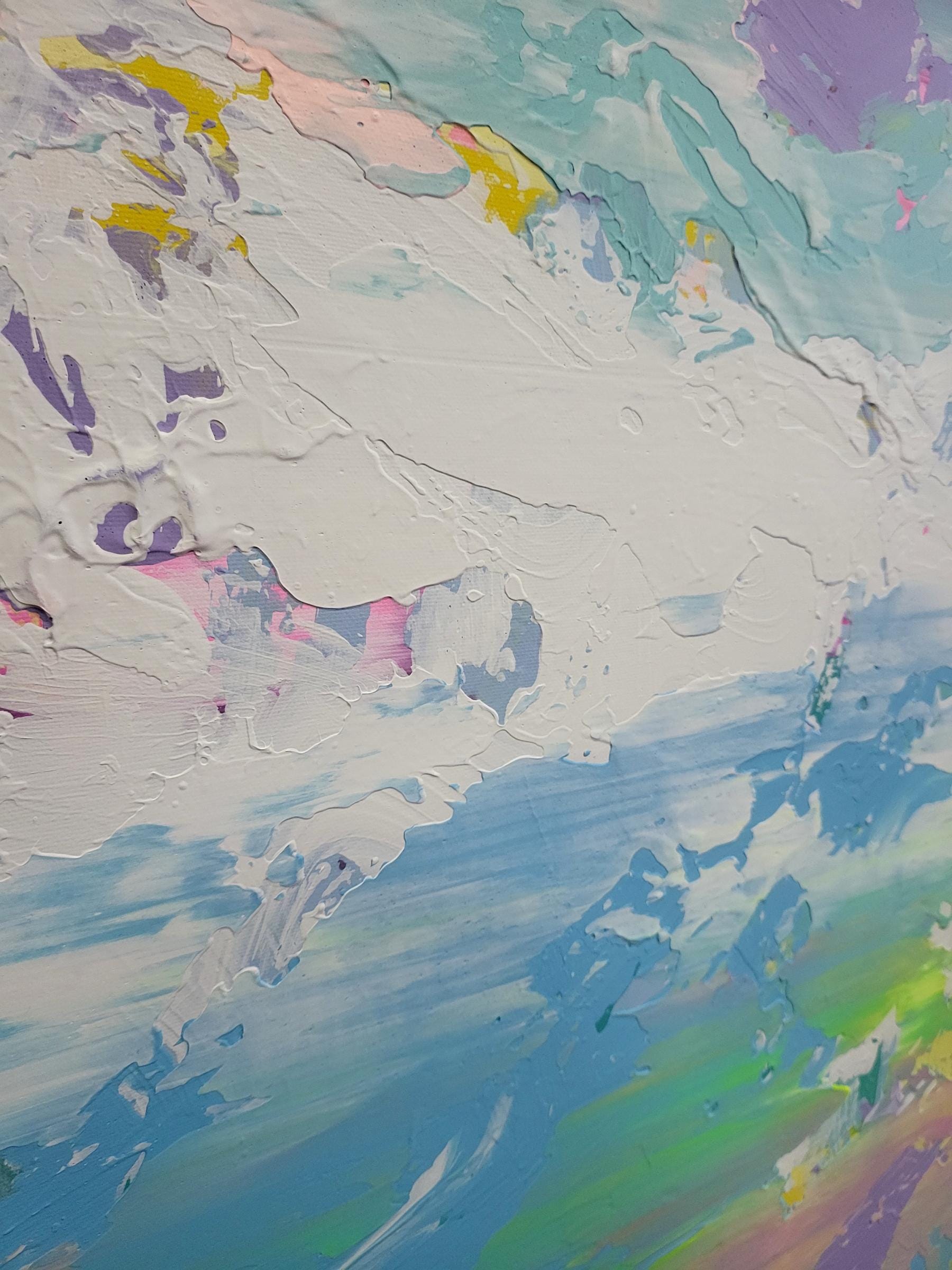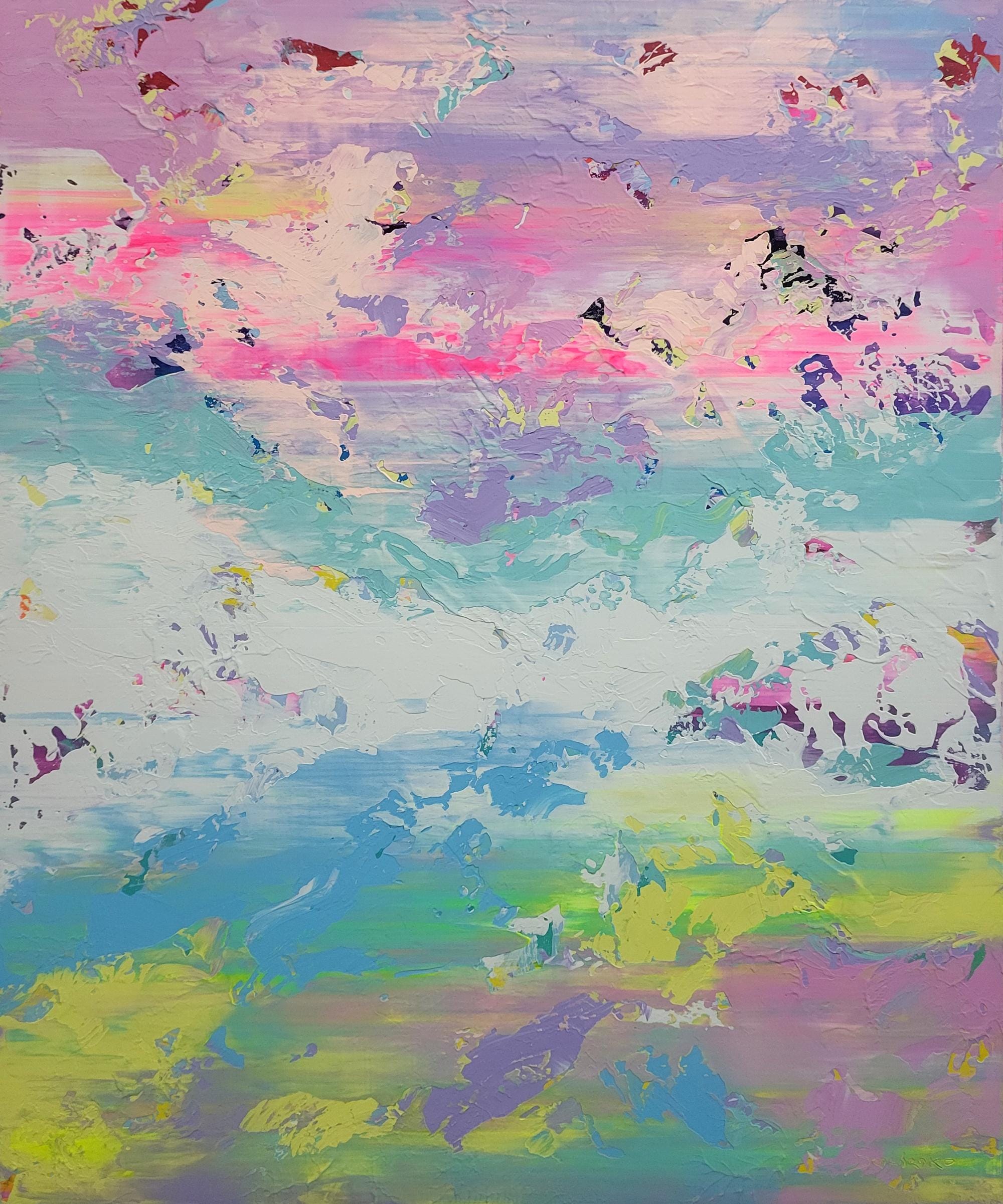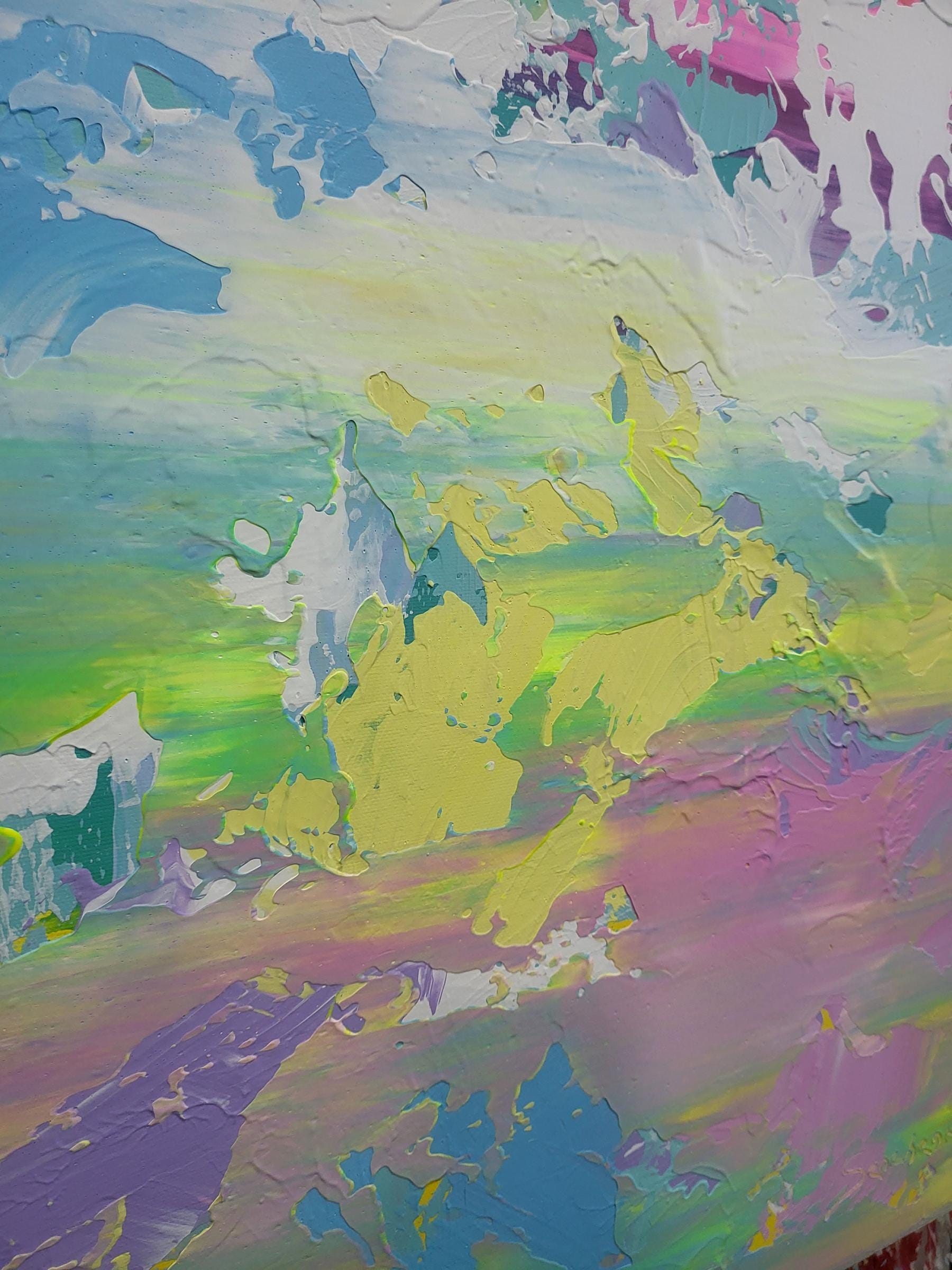 This artwork is a vibrant abstract painting that captivates with its dynamic blend of colors and textures. Broad, expressive brushstrokes sweep across the canvas, weaving together pastel hues of pink, blue, and green. These colors merge and contrast, evoking a sense of movement and fluidity, reminiscent of a dreamlike landscape or sky at dawn. The strategic splashes of darker shades ground the composition, adding depth and intrigue. The artist's technique of layering paint creates a sense of depth and dimension, inviting viewers to explore the nuanced interplay of light and color. This piece stands out for its bold use of color and texture, transforming the chaos of abstraction into a harmonious and uplifting experience. The painting's energy and balance make it a compelling centerpiece, inspiring introspection and wonder.