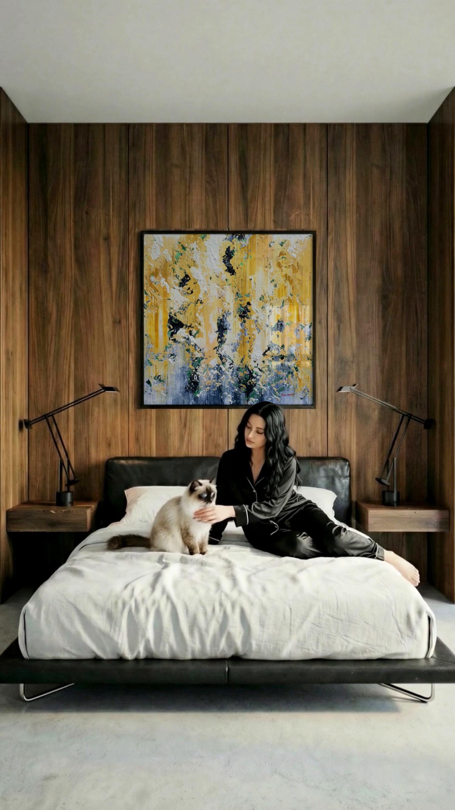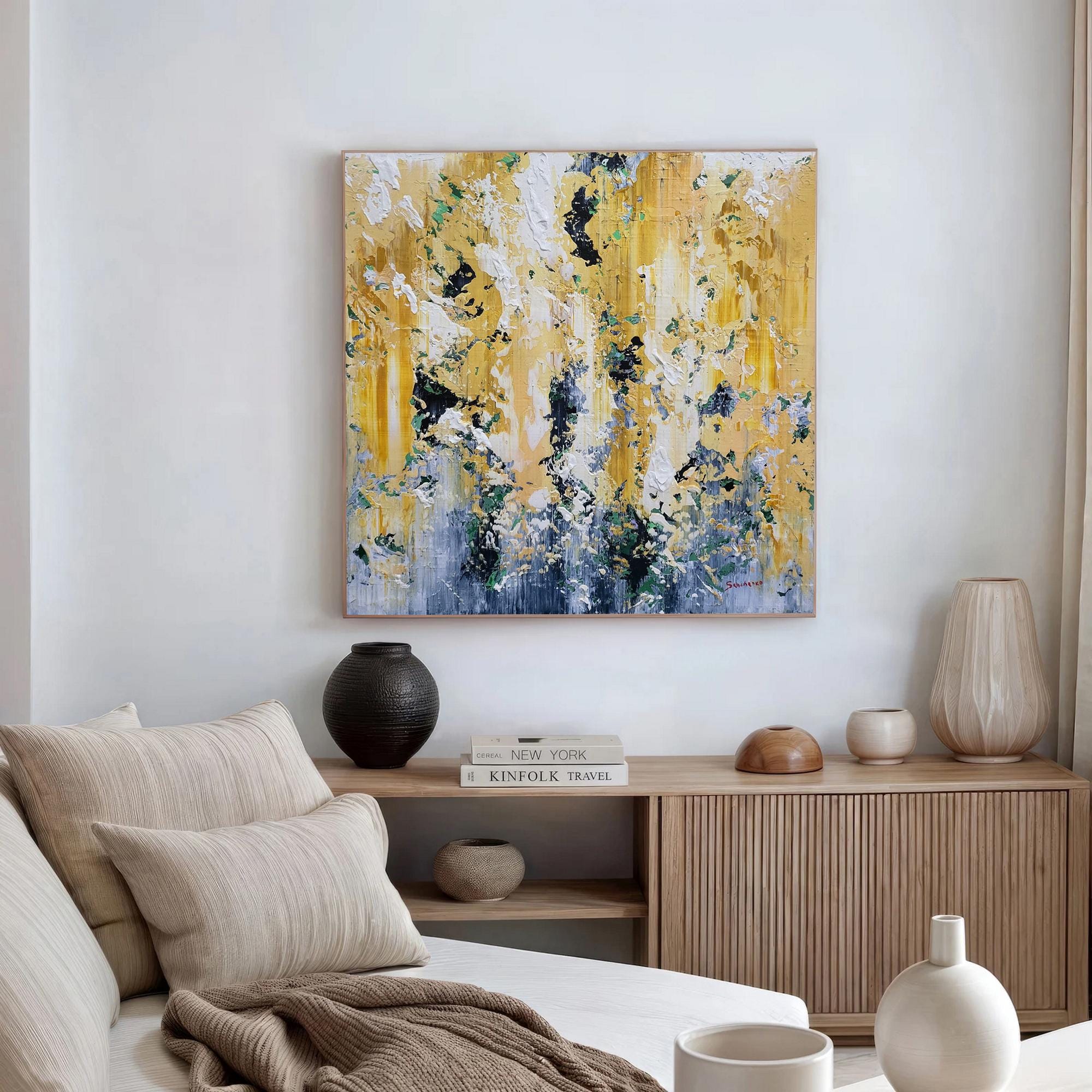 Due to its large scale (100x100 cm) and bright, sophisticated color palette, this painting is a versatile statement piece that complements various environments: