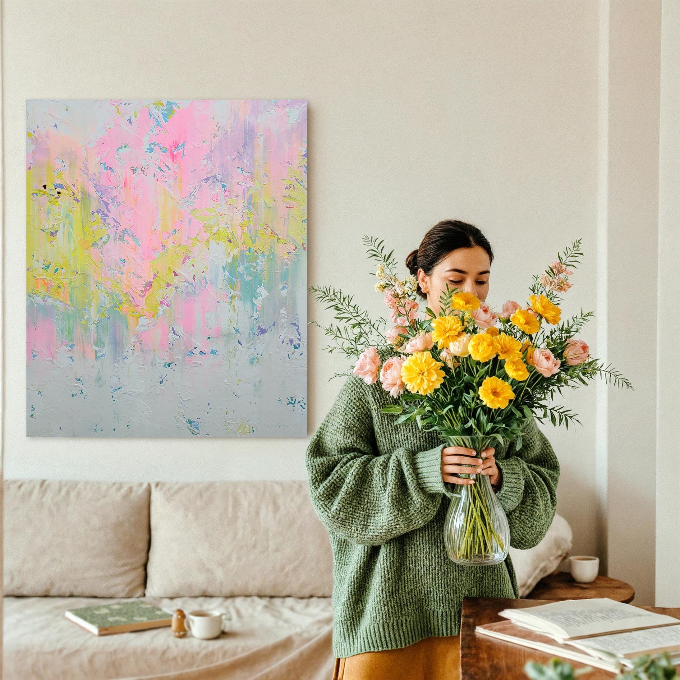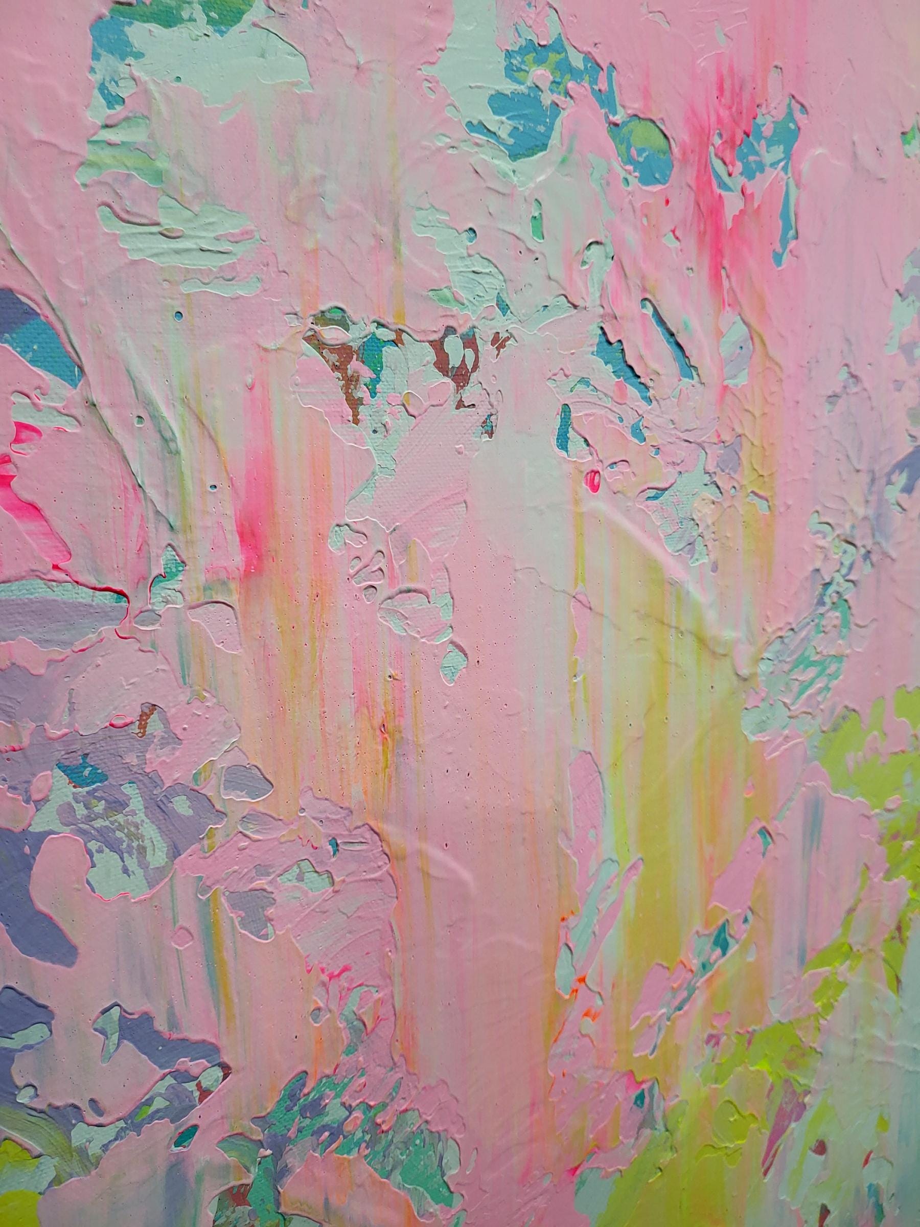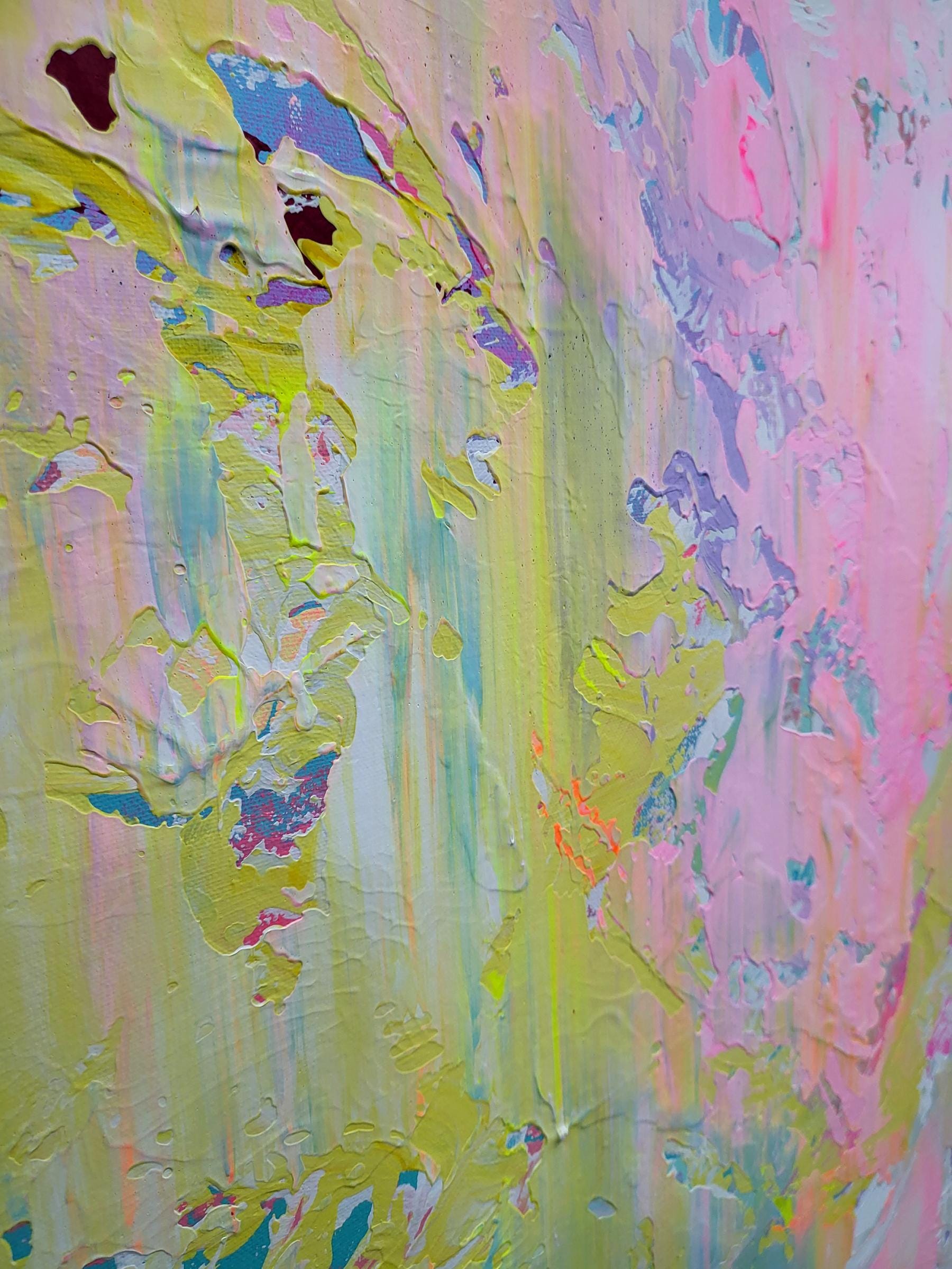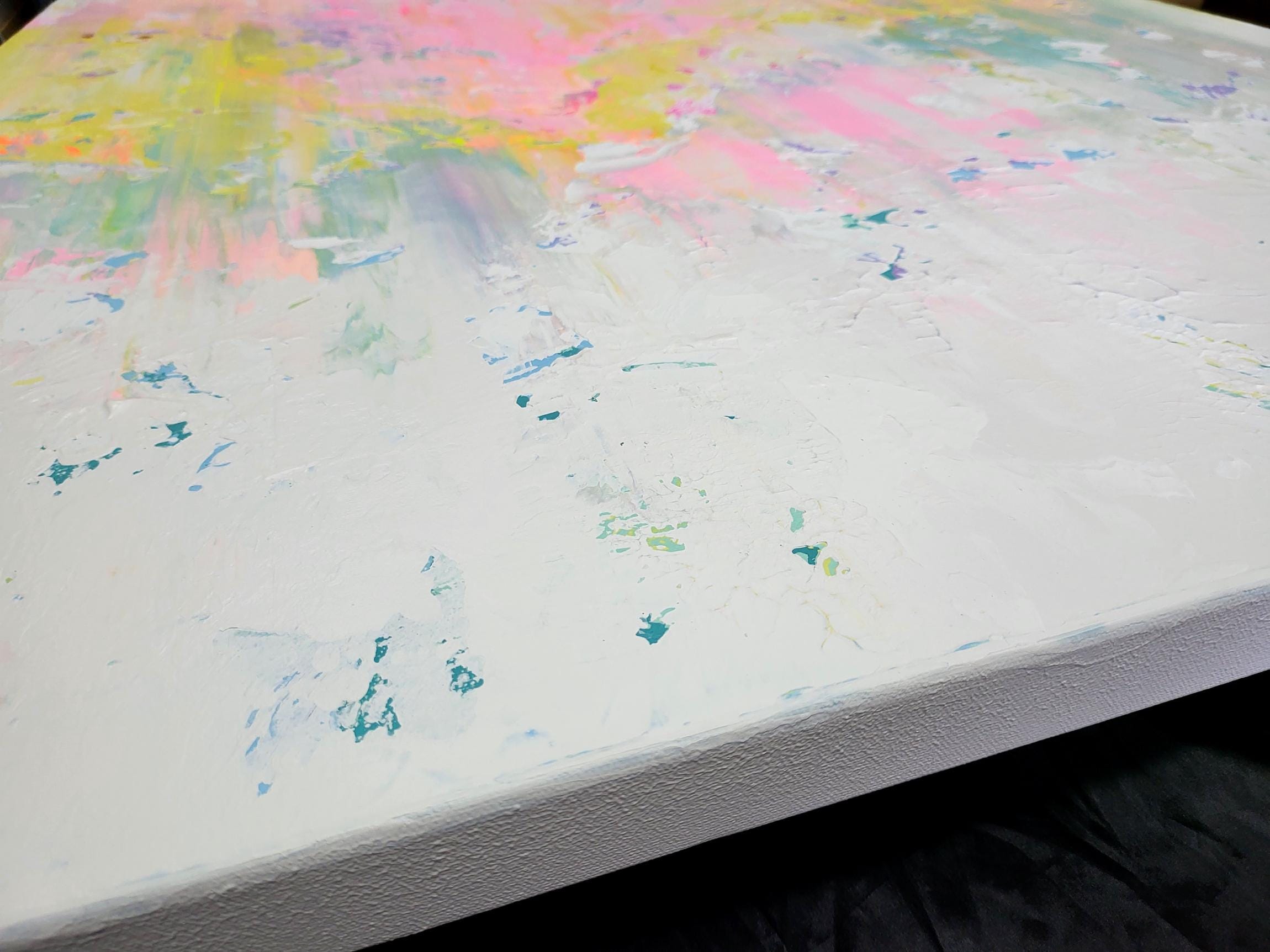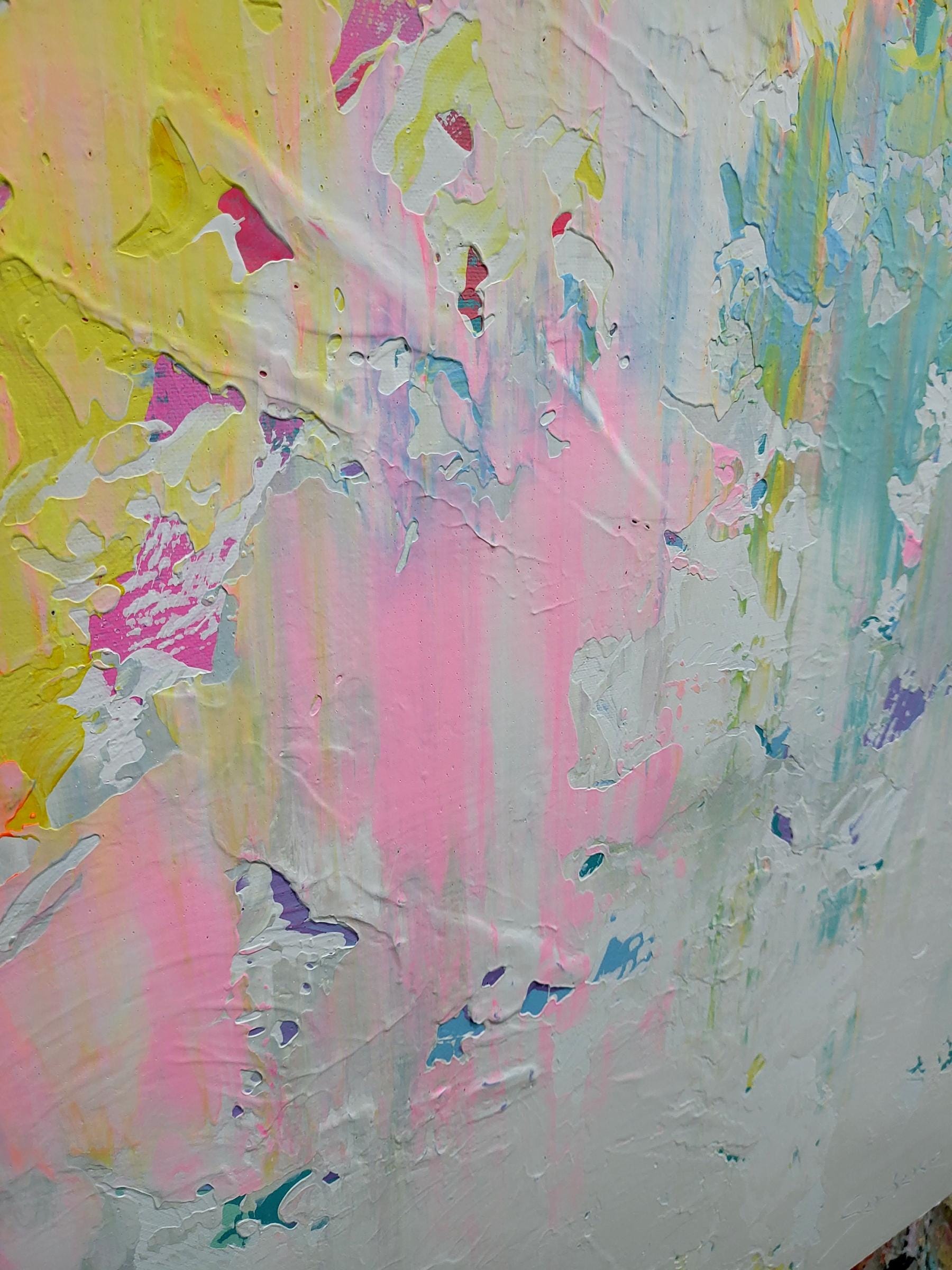 In this piece, I poured vibrant emotion into layers of soft pastels, letting acrylics dance freely across the canvas. The swirling pinks, yellows, and blues express an uplifting energy, like a gentle sunrise awakening the soul. Each brushstroke captures a moment of delicate chaos and hope, inviting your space to breathe freshness and serene optimism. It’s a celebration of light and movement, alive with heartfelt expression.