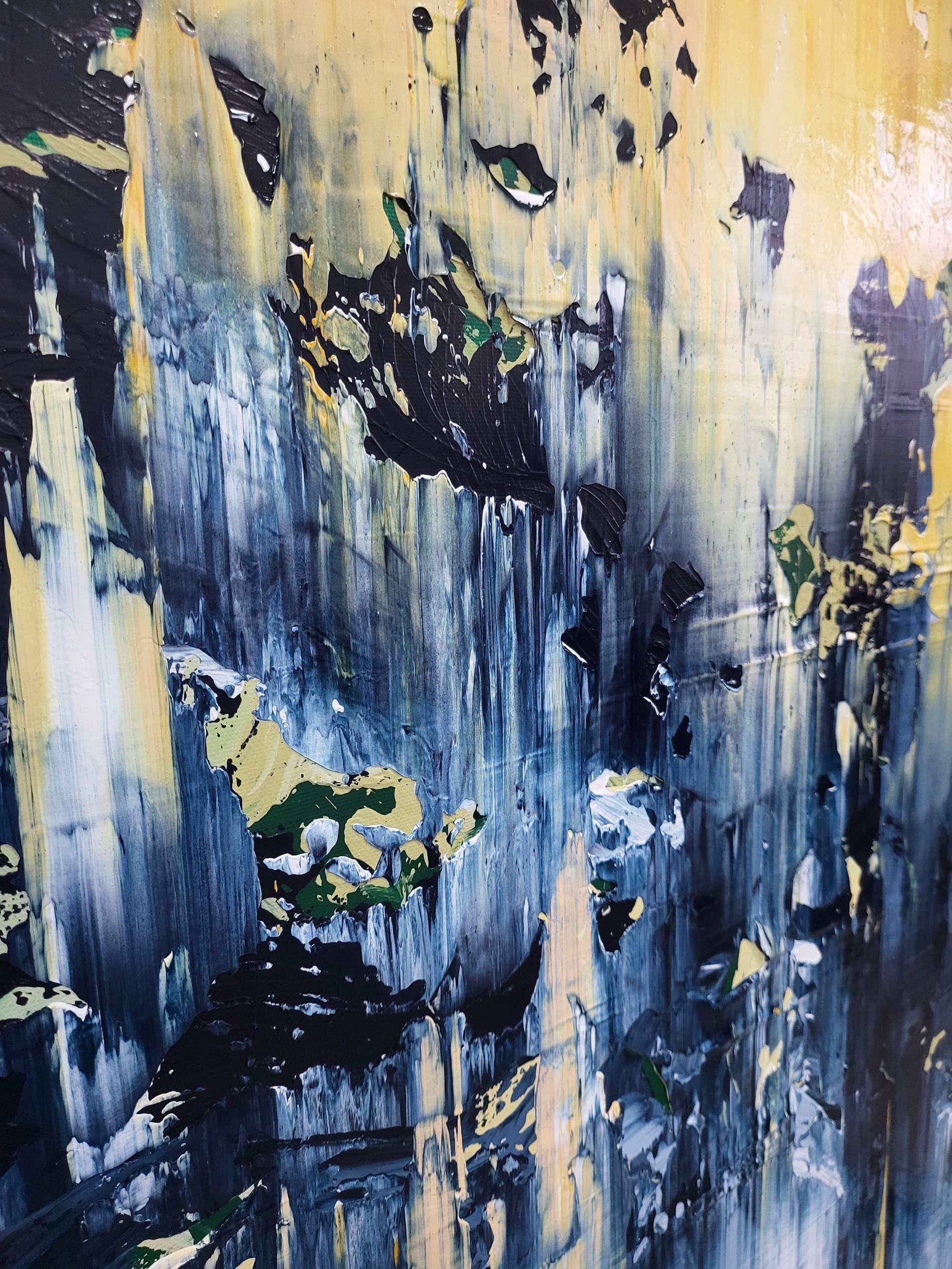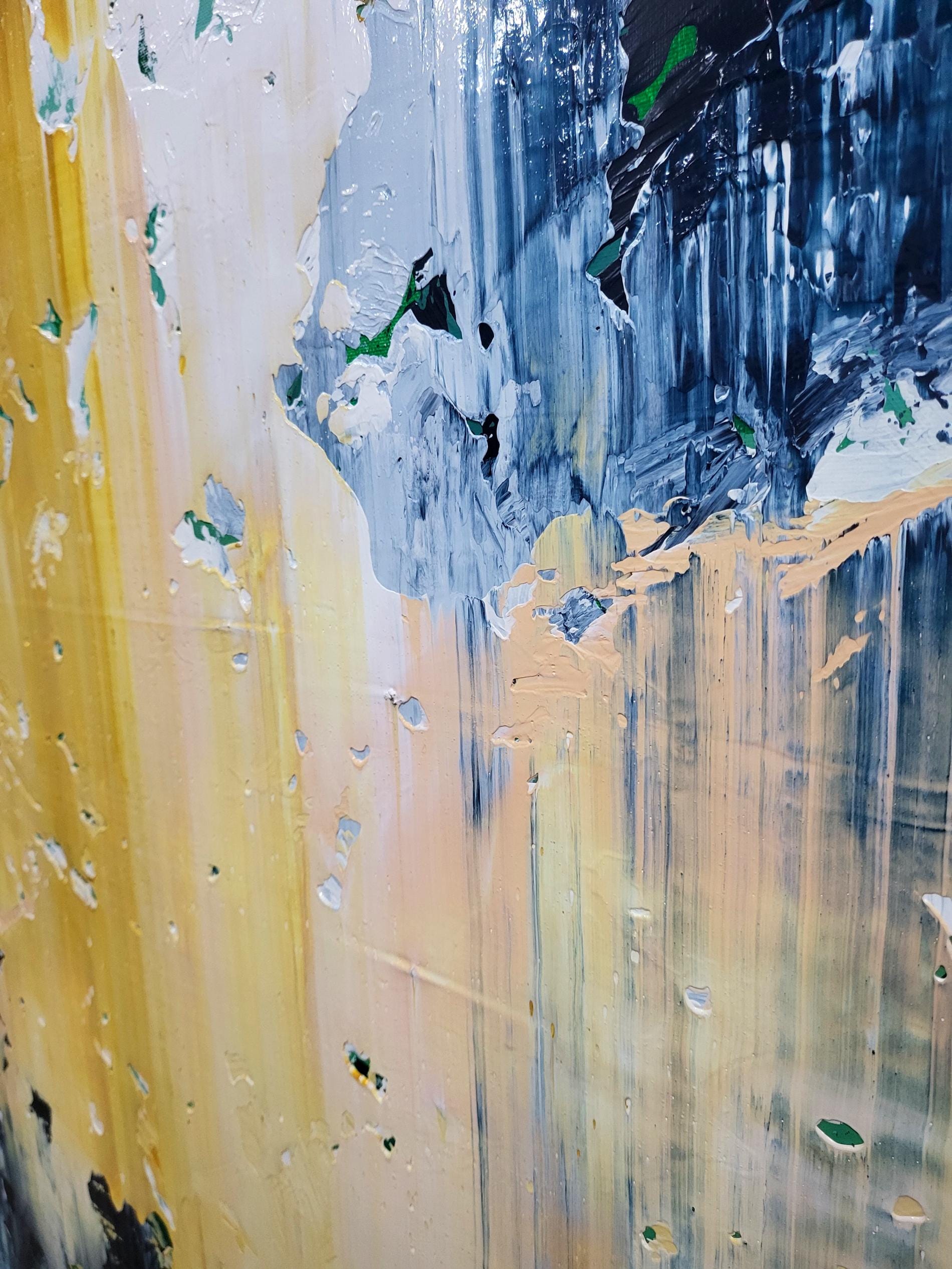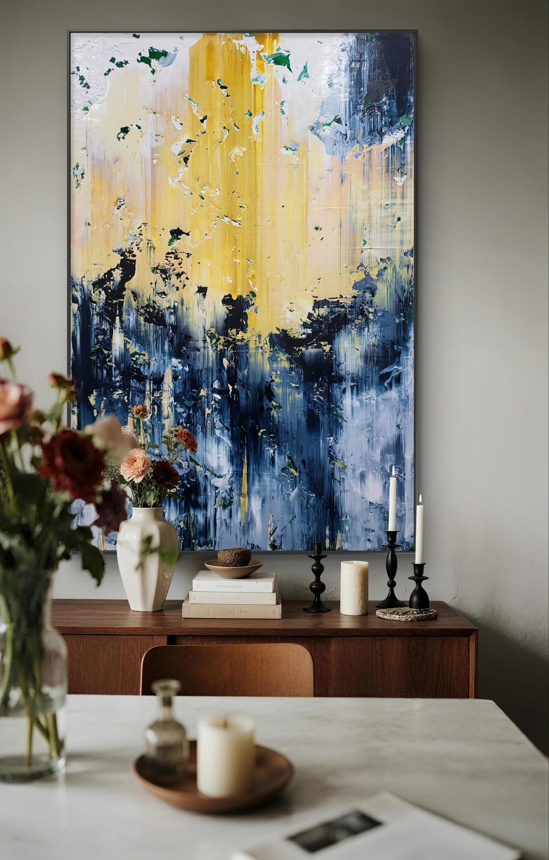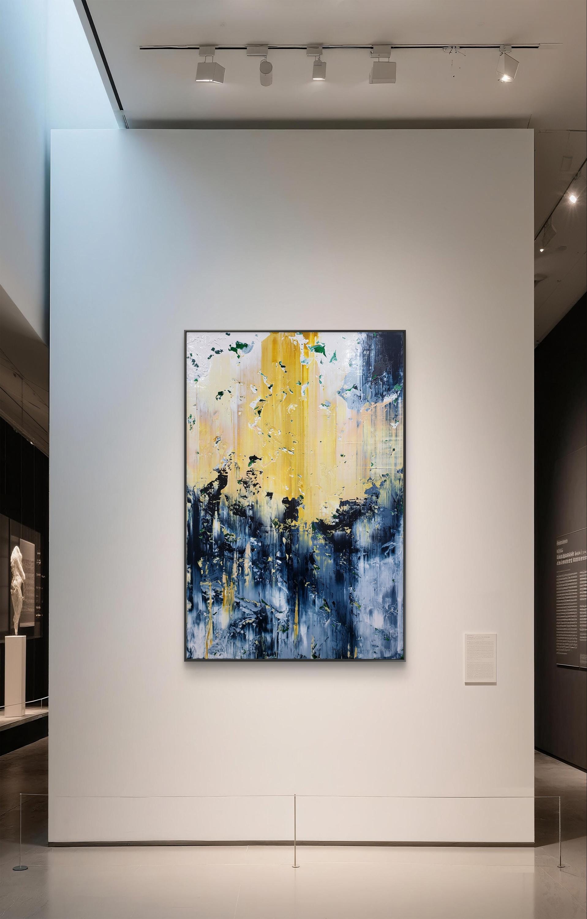 This striking abstract artwork presents a dynamic interplay of colors and textures. Dominated by vertical streaks of deep blue and vibrant yellow, the composition evokes a sense of movement and depth. The artist skillfully employs layering techniques, creating a textured surface with pops of white and hints of green. The upper part seems to cascade downward, suggesting fluidity and transformation. The juxtaposition of dark and light tones adds tension and contrast, capturing the viewer’s attention. Flecks of paint create a sense of spontaneity and energy, contributing to the overall chaotic yet harmonious feel. This piece’s bold use of color and texture invites interpretation, making it a captivating focal point in any space.