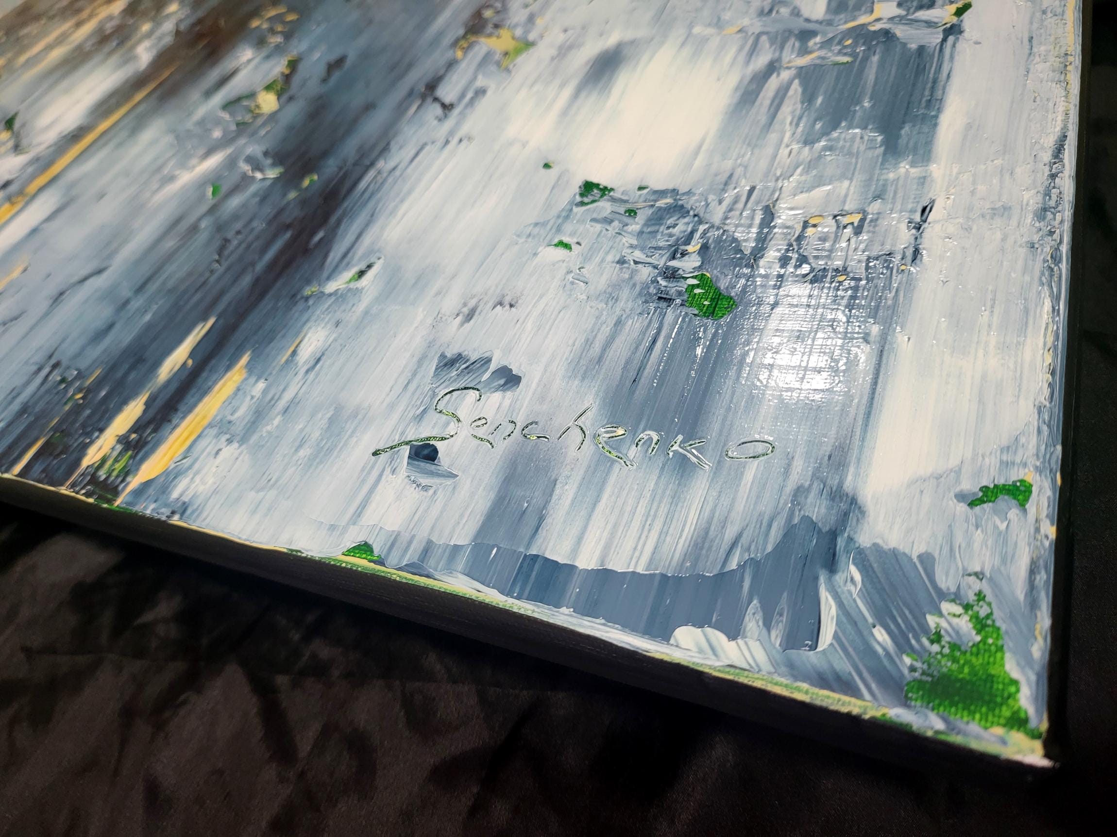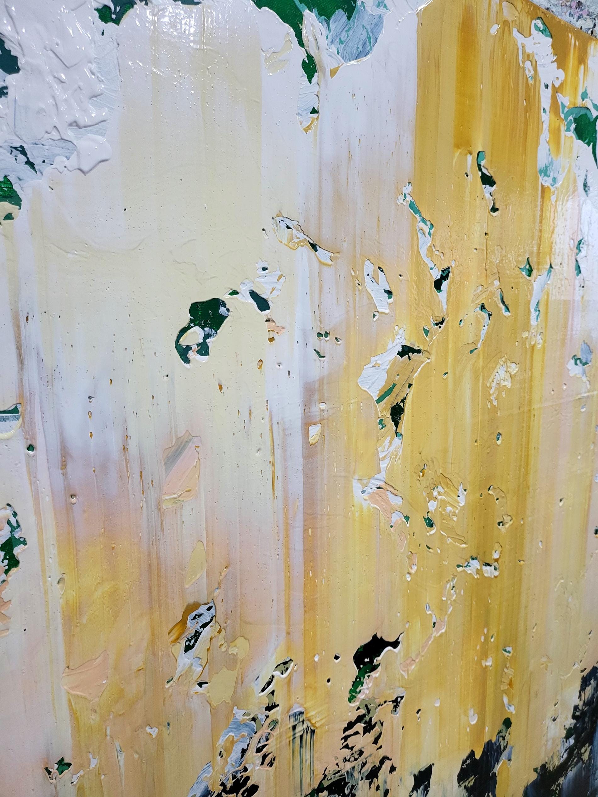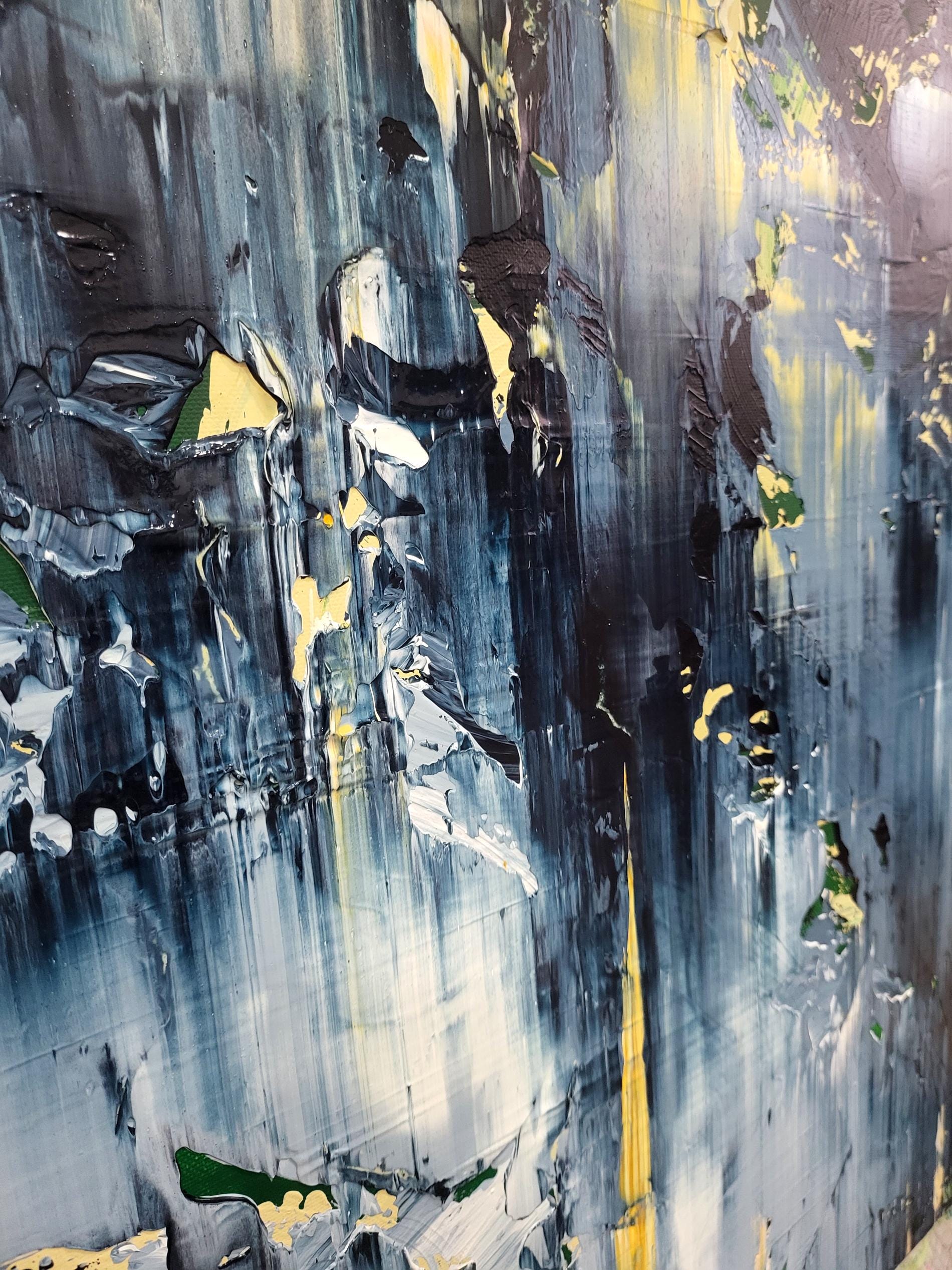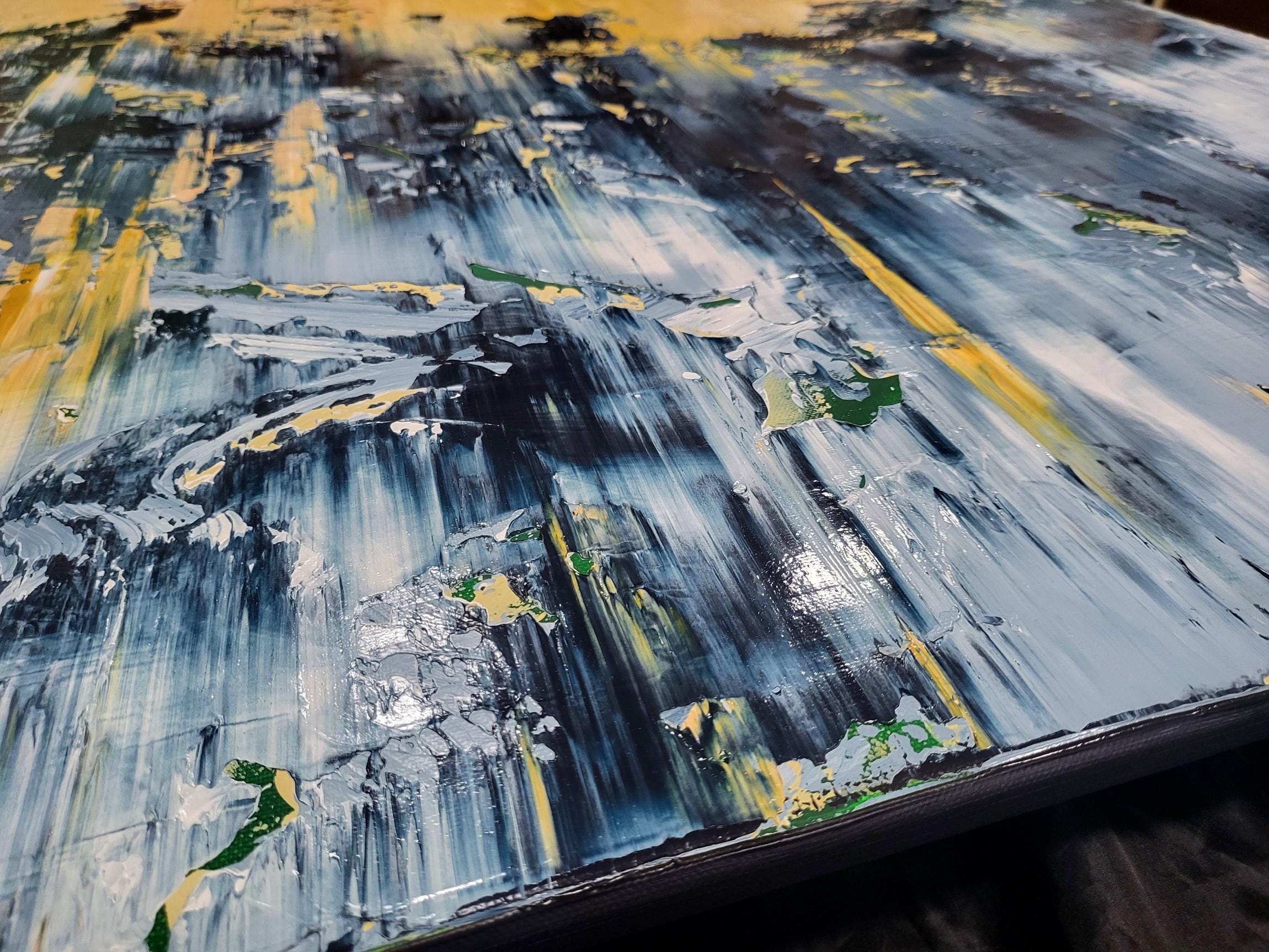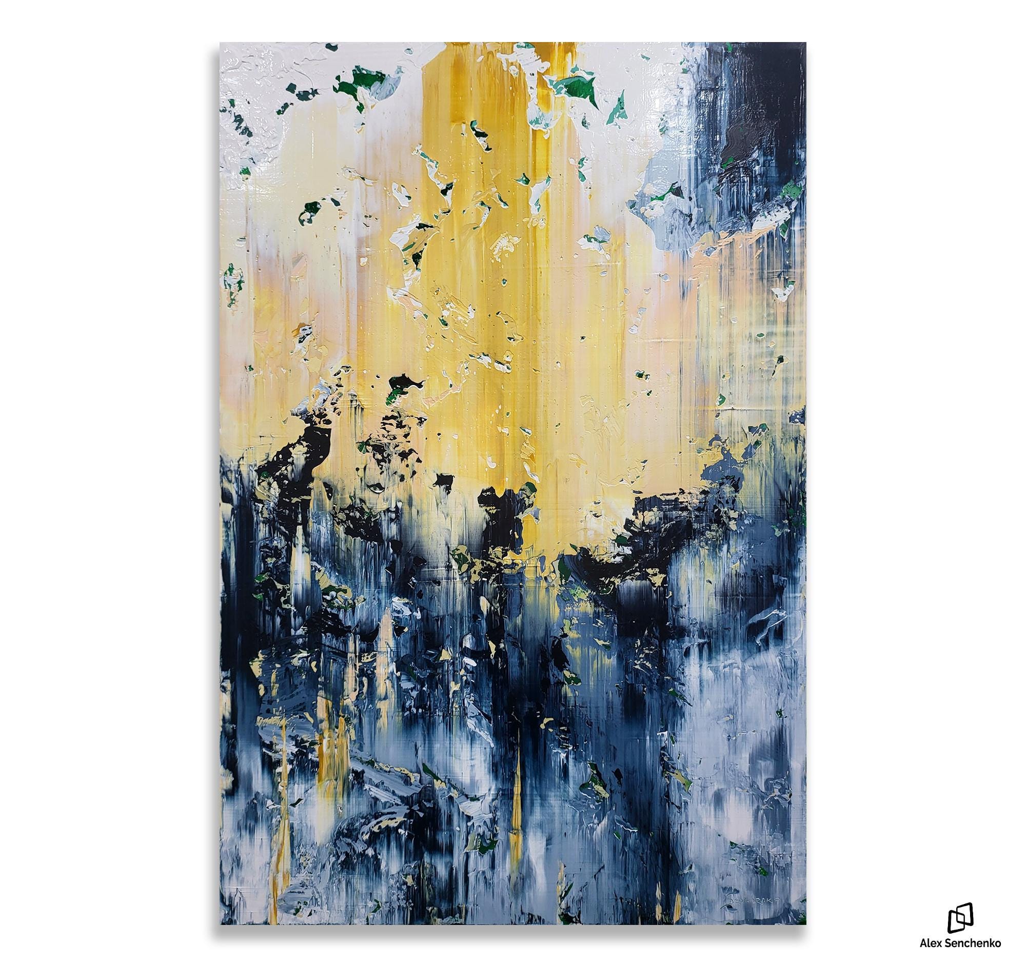 This striking abstract artwork presents a dynamic interplay of colors and textures. Dominated by vertical streaks of deep blue and vibrant yellow, the composition evokes a sense of movement and depth. The artist skillfully employs layering techniques, creating a textured surface with pops of white and hints of green. The upper part seems to cascade downward, suggesting fluidity and transformation. The juxtaposition of dark and light tones adds tension and contrast, capturing the viewer’s attention. Flecks of paint create a sense of spontaneity and energy, contributing to the overall chaotic yet harmonious feel. This piece’s bold use of color and texture invites interpretation, making it a captivating focal point in any space.
