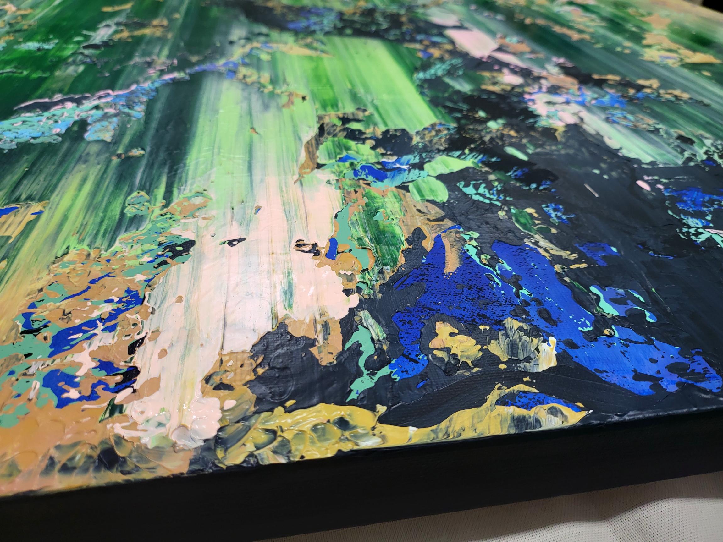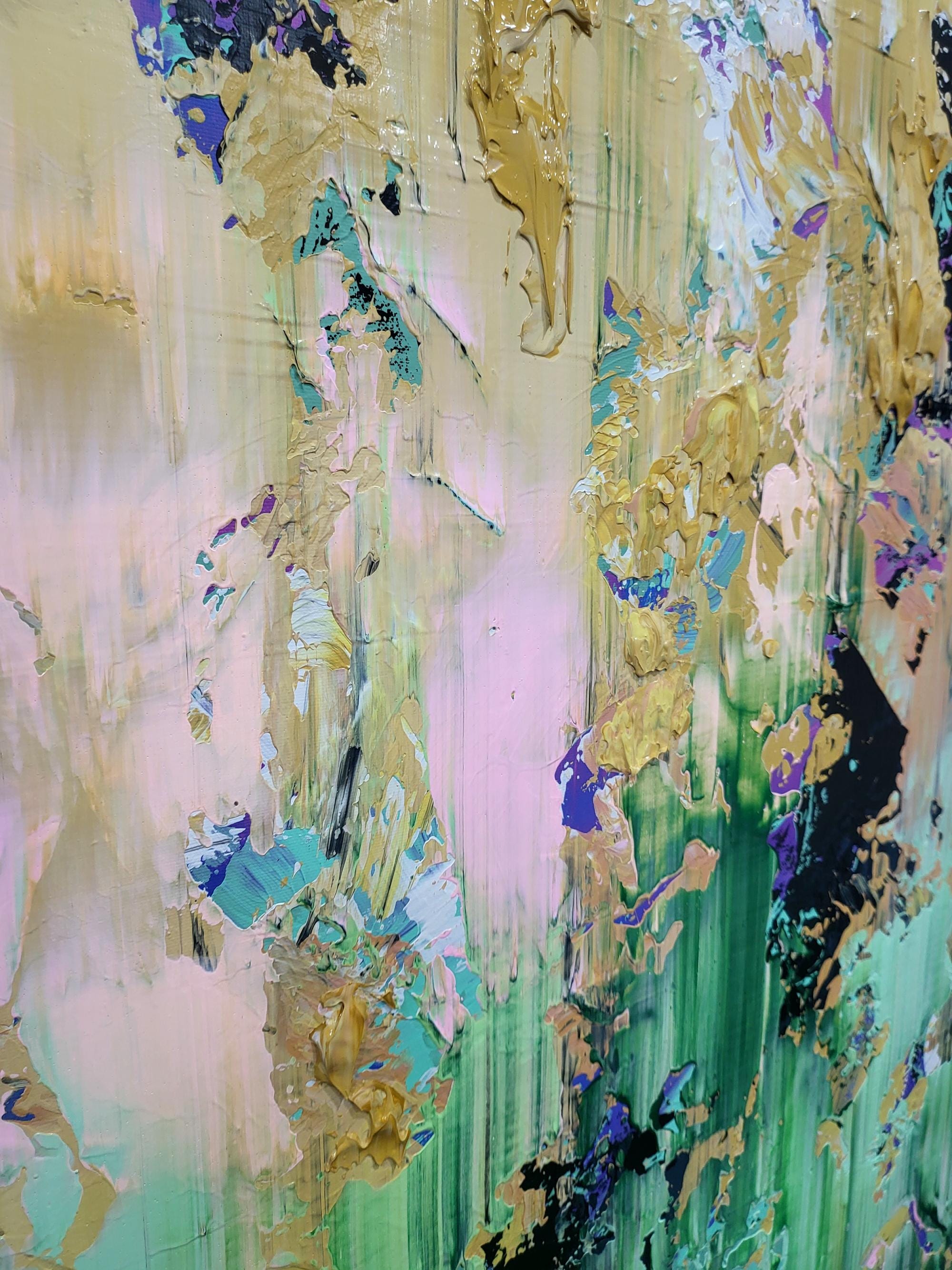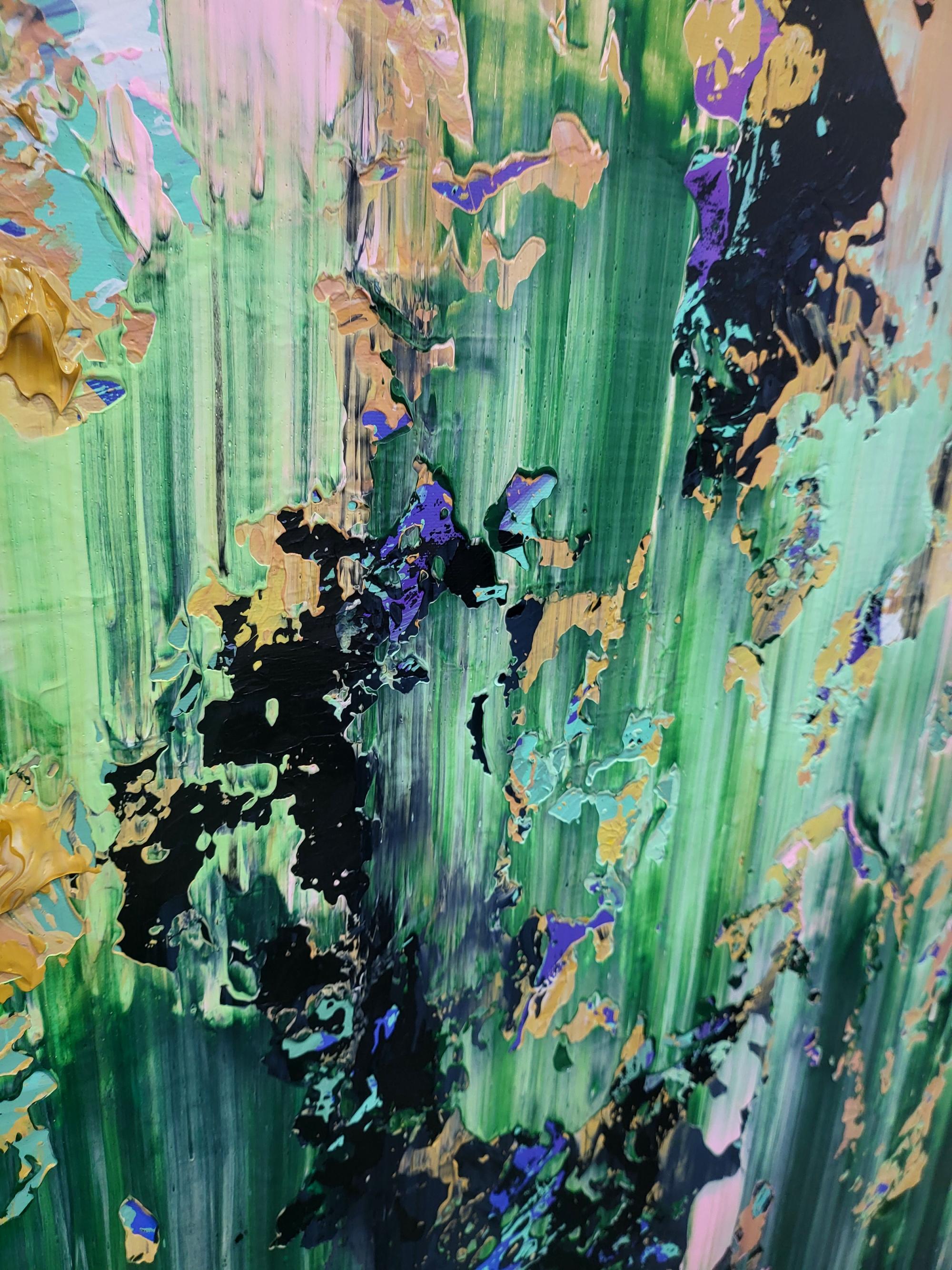 This artwork is a dynamic fusion of vibrant greens, soft pink accents, bold black contrasts, and shimmering details, creating a rich, textural landscape that captures the eye and light. Created using thick impasto techniques and expressive palette knife strokes, the painting conveys a sense of organic movement and modern vitality.