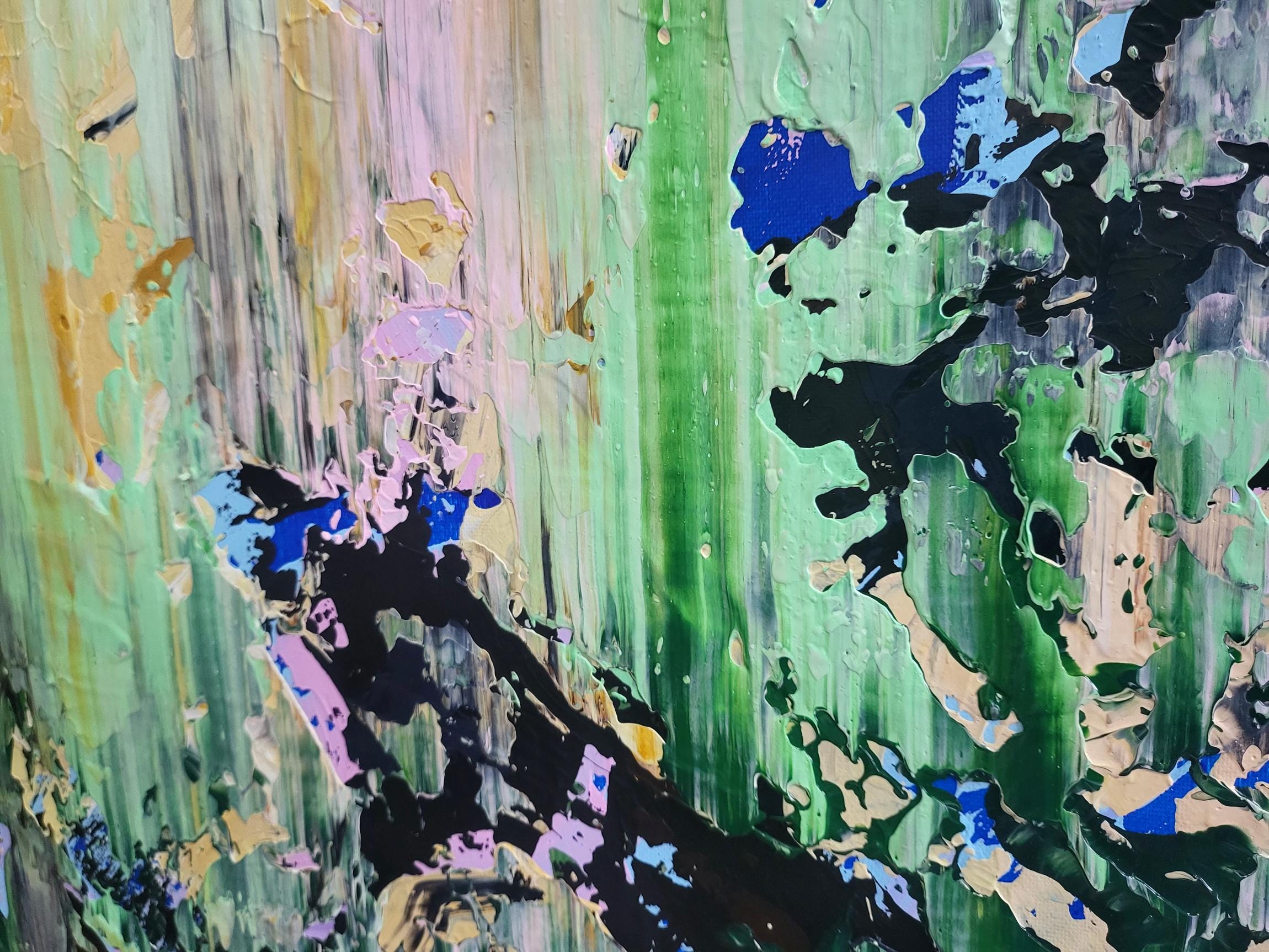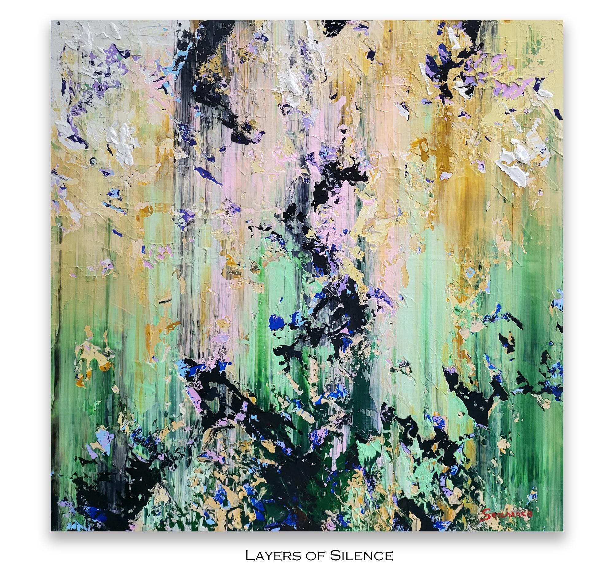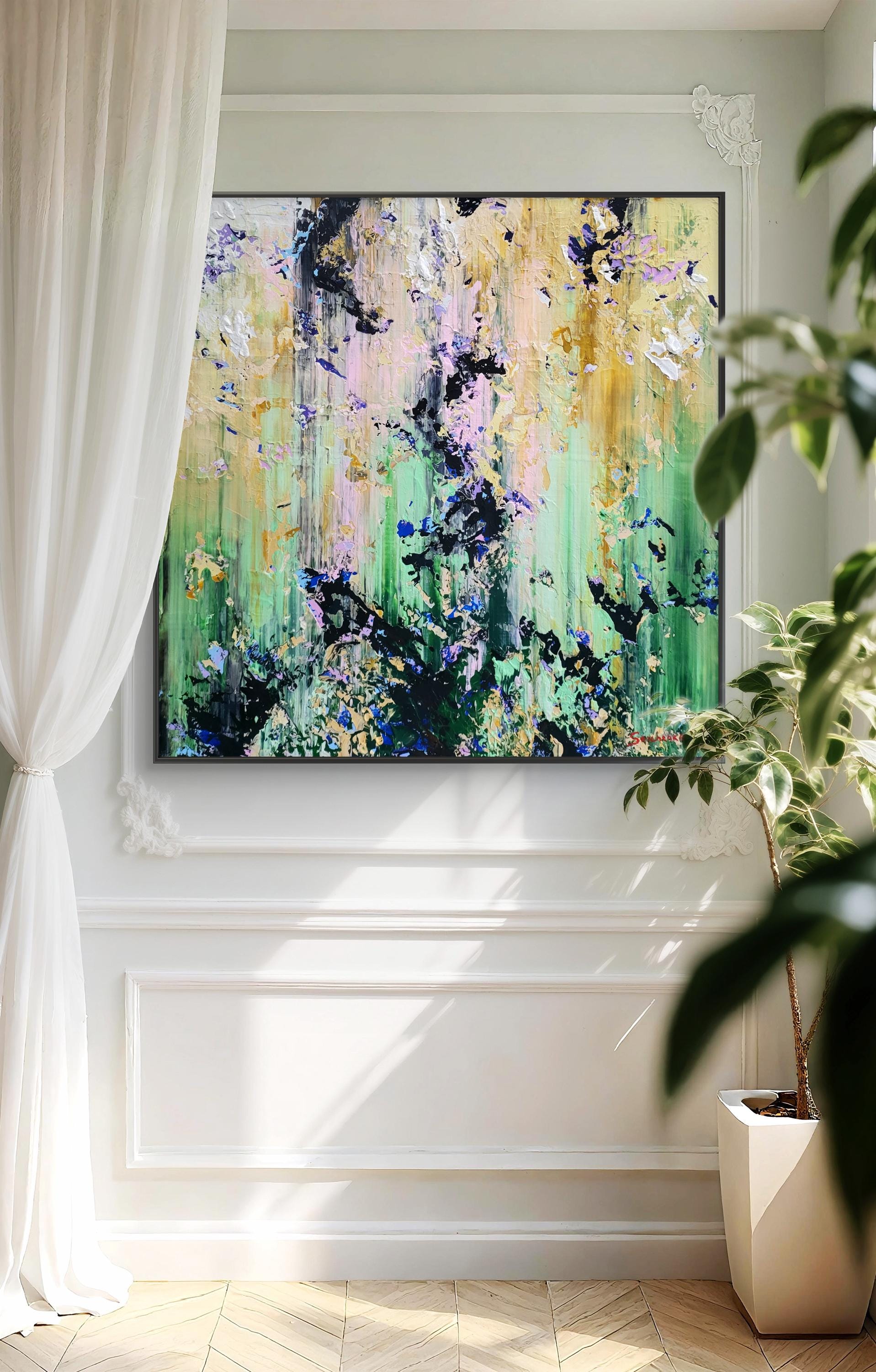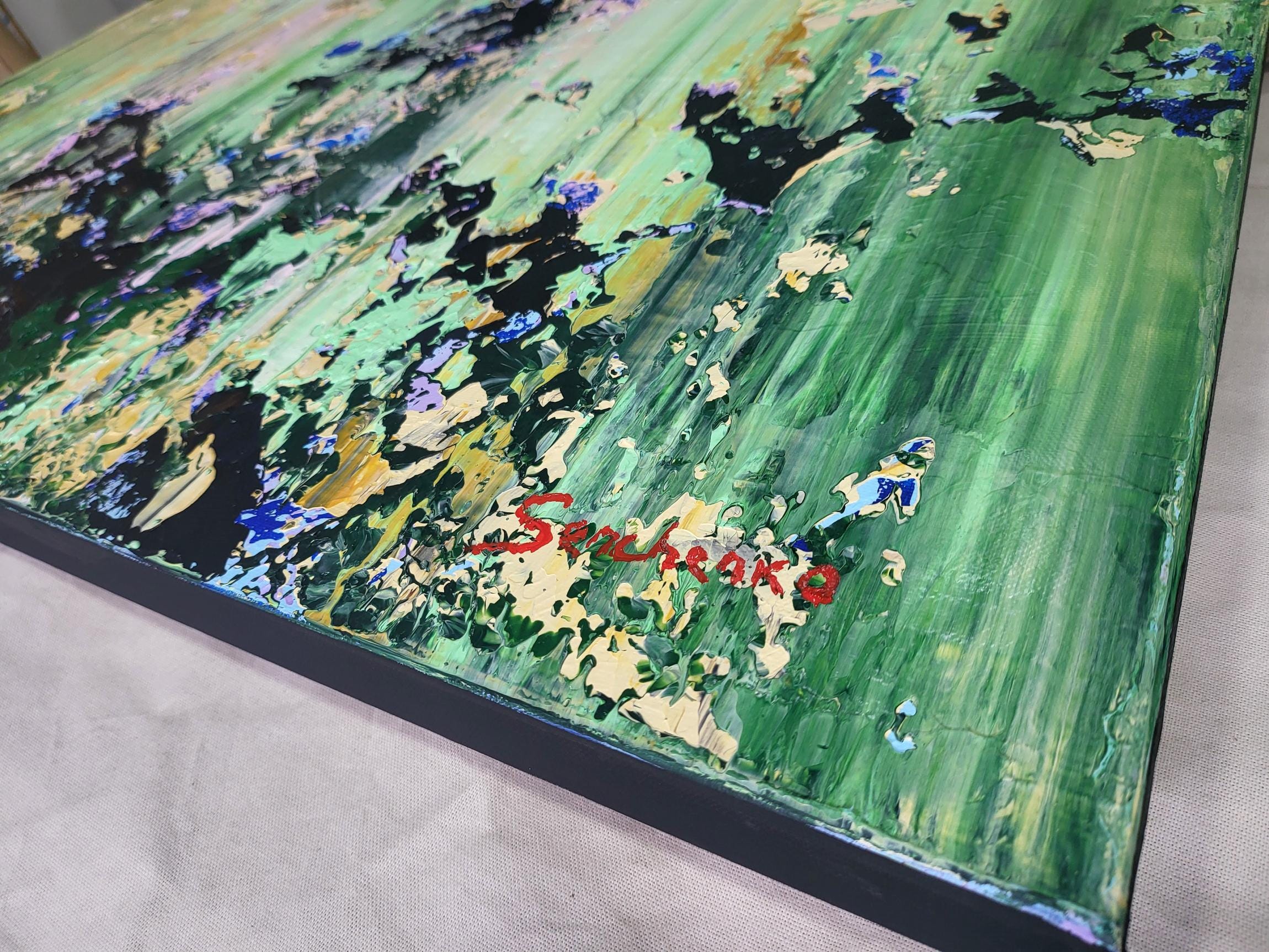 This piece is a masterclass in texture and depth. Using a sophisticated palette of emerald greens, soft pastels, and bold dark accents, Senchenko creates a visual symphony that speaks of tranquility and hidden strength. The vertical rhythm of the brushstrokes combined with tactile, palette-knife applications creates a "veil" effect, inviting the viewer to look beyond the surface and find their own quiet moment within the colors.