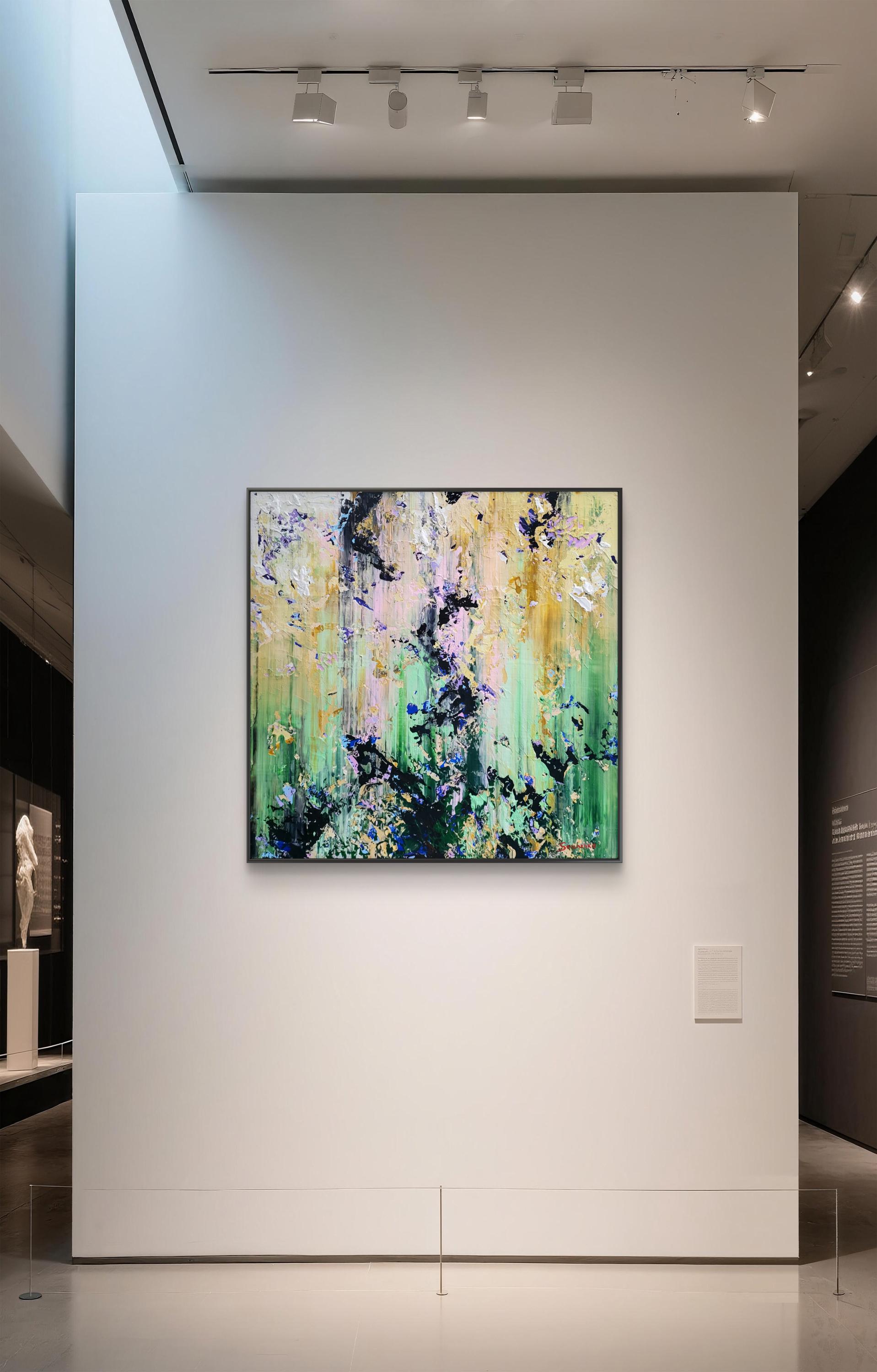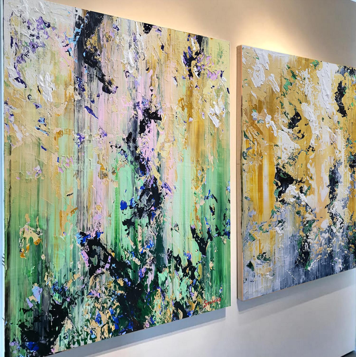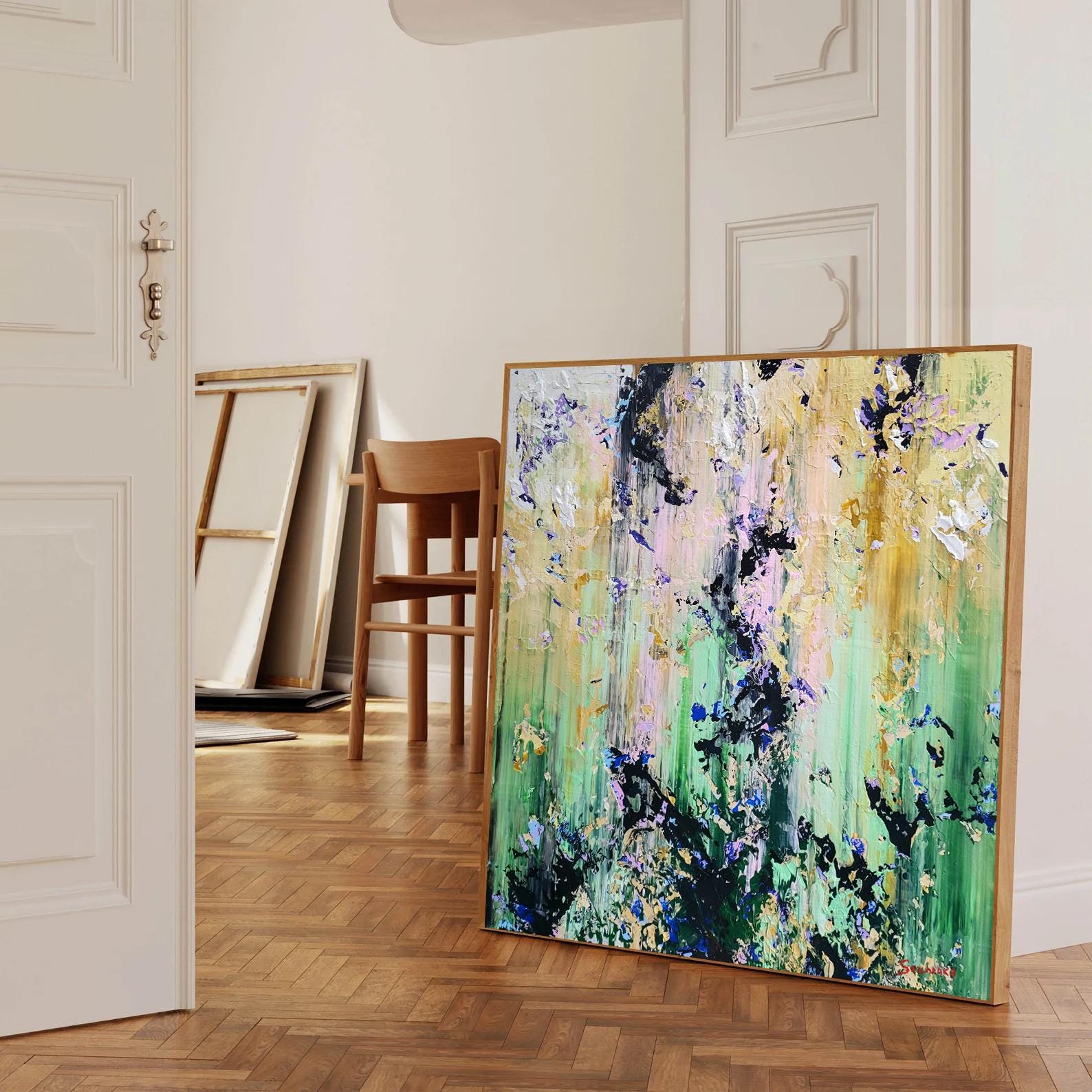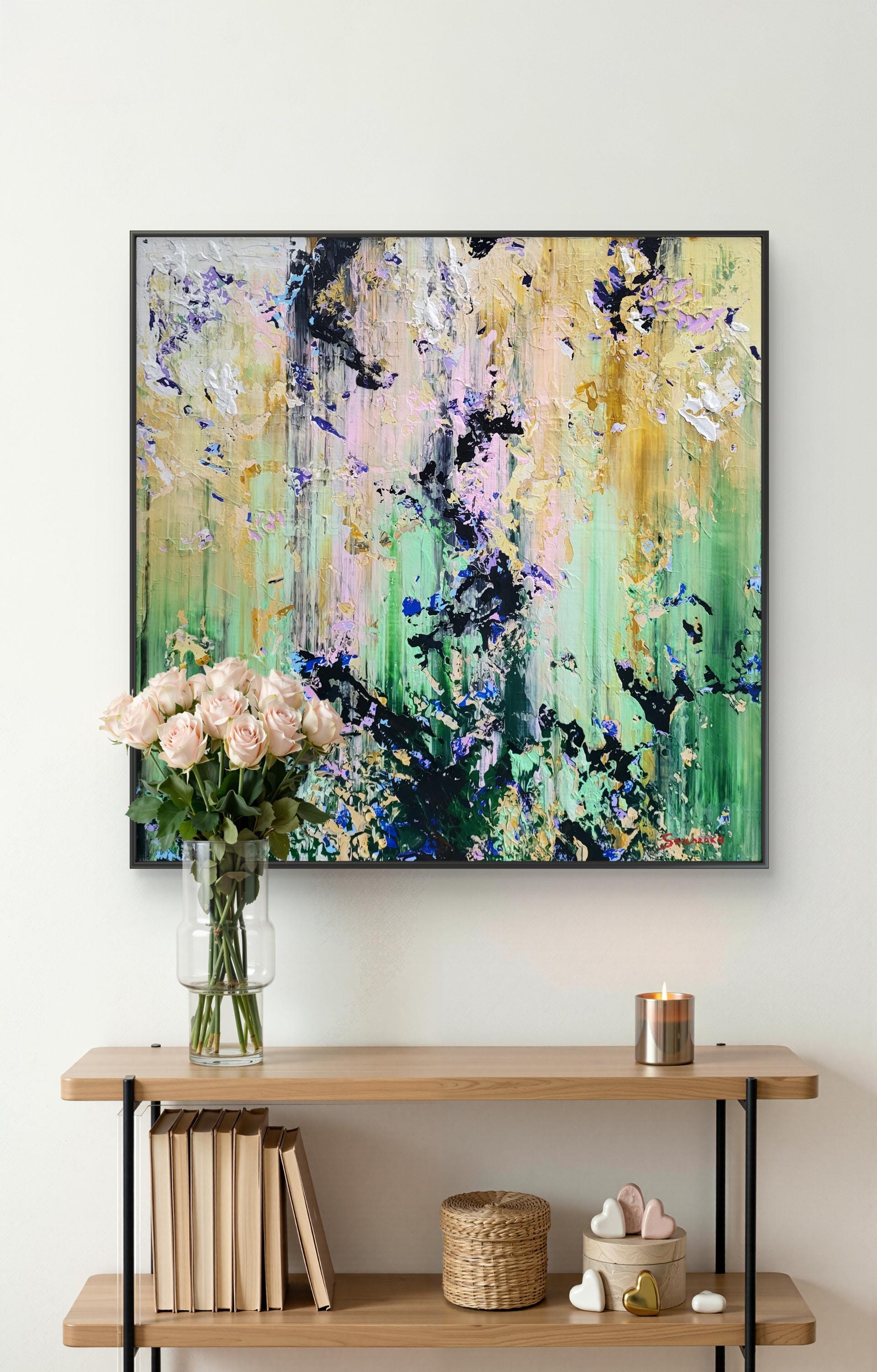 This piece is a masterclass in texture and depth. Using a sophisticated palette of emerald greens, soft pastels, and bold dark accents, Senchenko creates a visual symphony that speaks of tranquility and hidden strength. The vertical rhythm of the brushstrokes combined with tactile, palette-knife applications creates a "veil" effect, inviting the viewer to look beyond the surface and find their own quiet moment within the colors.