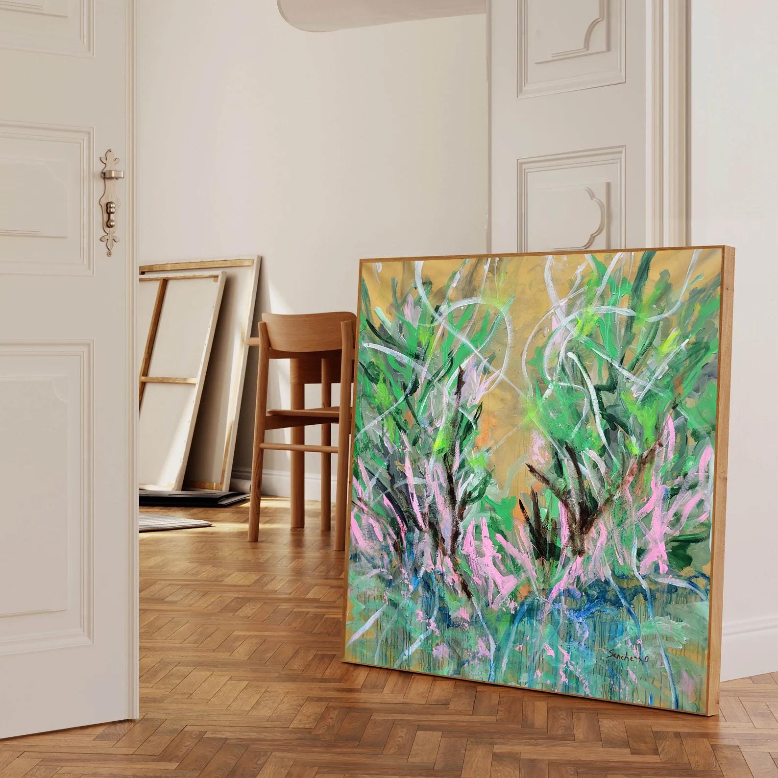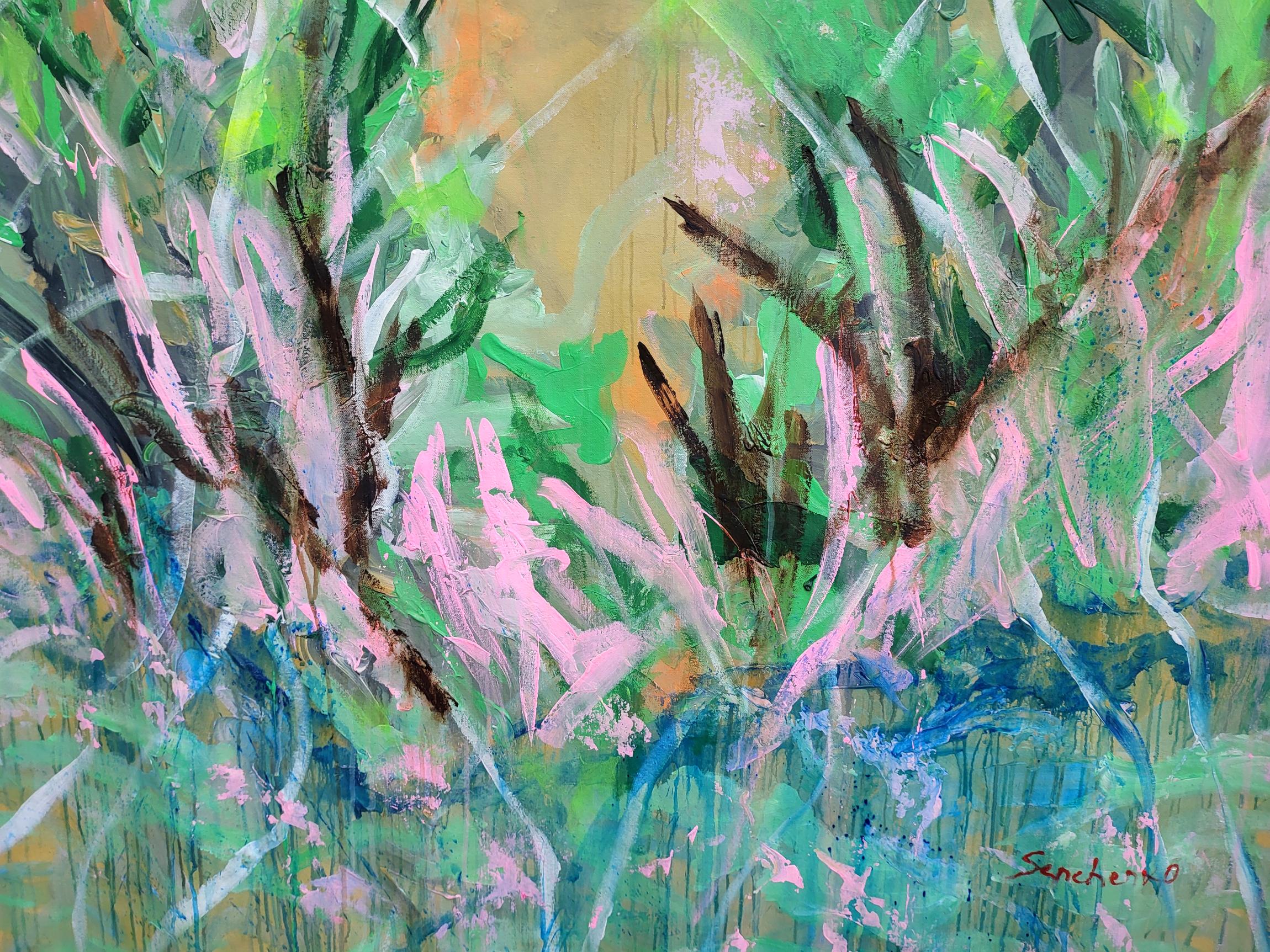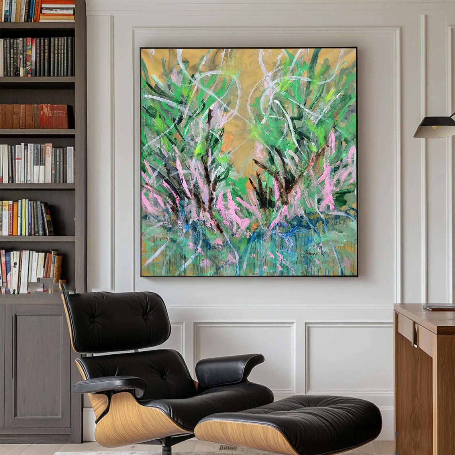 A vibrant and textured original abstract painting by the contemporary artist Alex Senchenko. This unique piece captures the dynamic energy of a wild garden, using a rich palette of greens, pinks, and blues with expressive brushstrokes and a palette knife technique that adds significant depth and texture. The composition focuses on organic, flowing lines that evoke a sense of natural movement and quiet strength, making it a perfect statement piece for any modern interior.