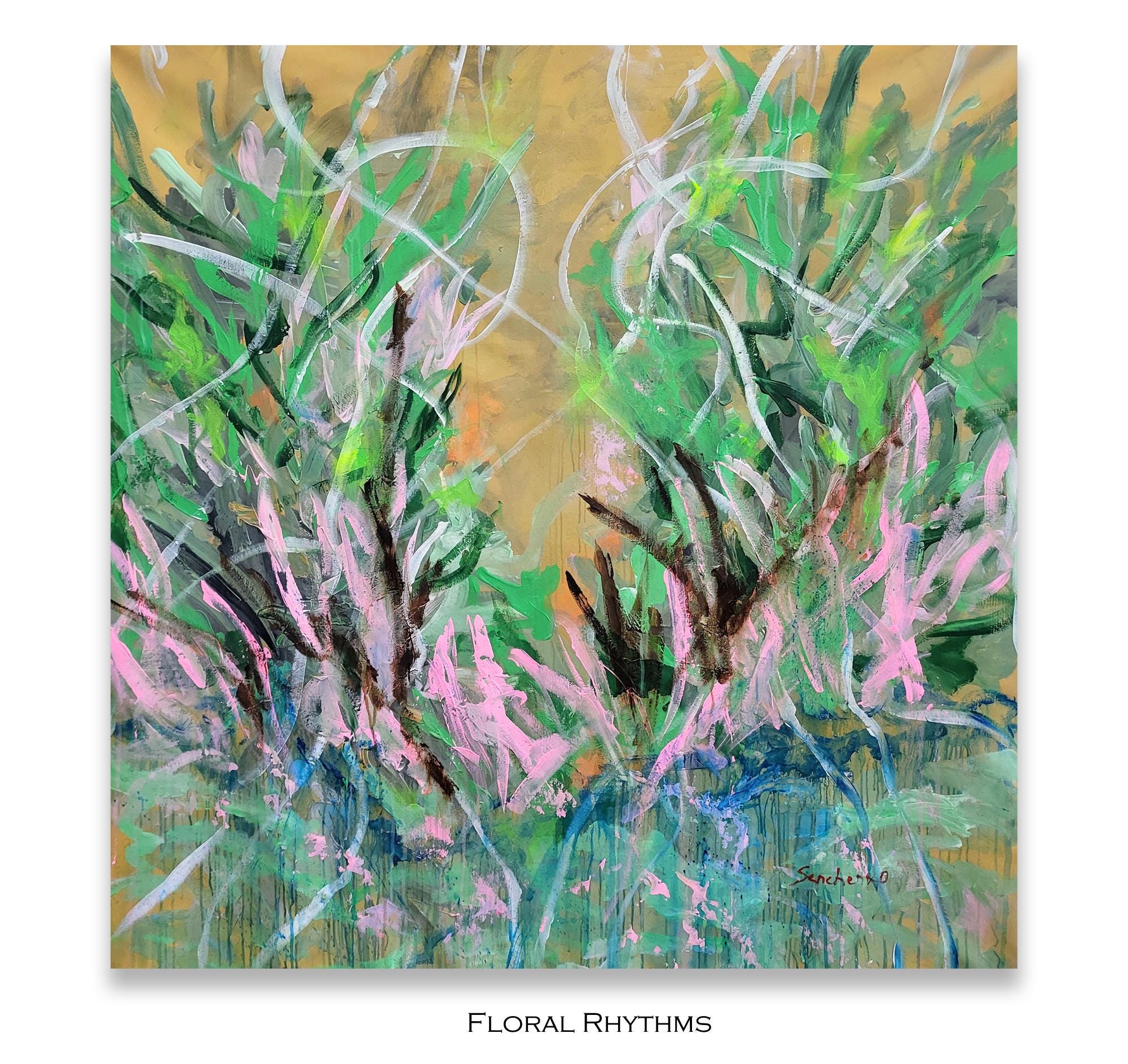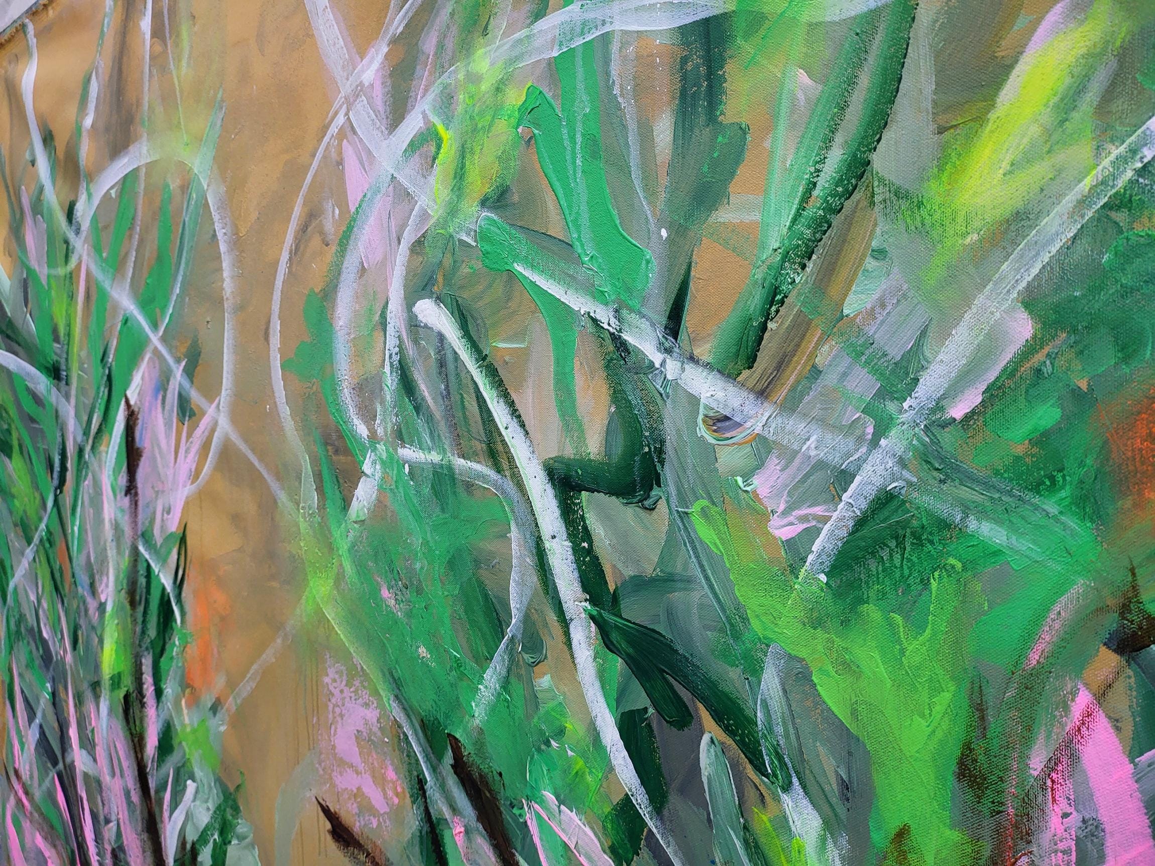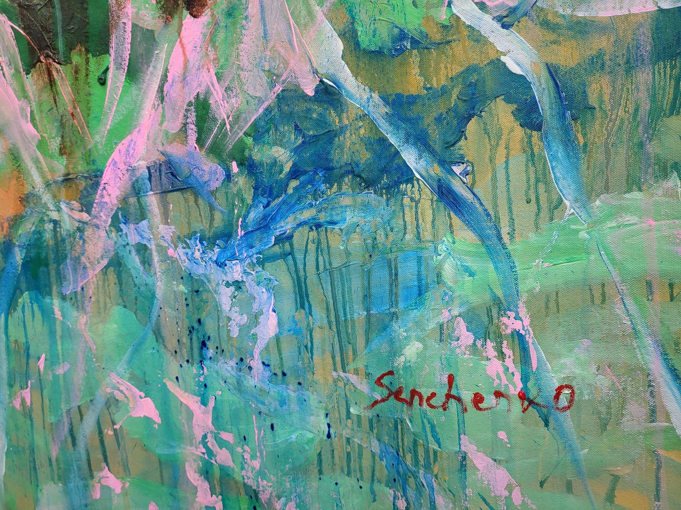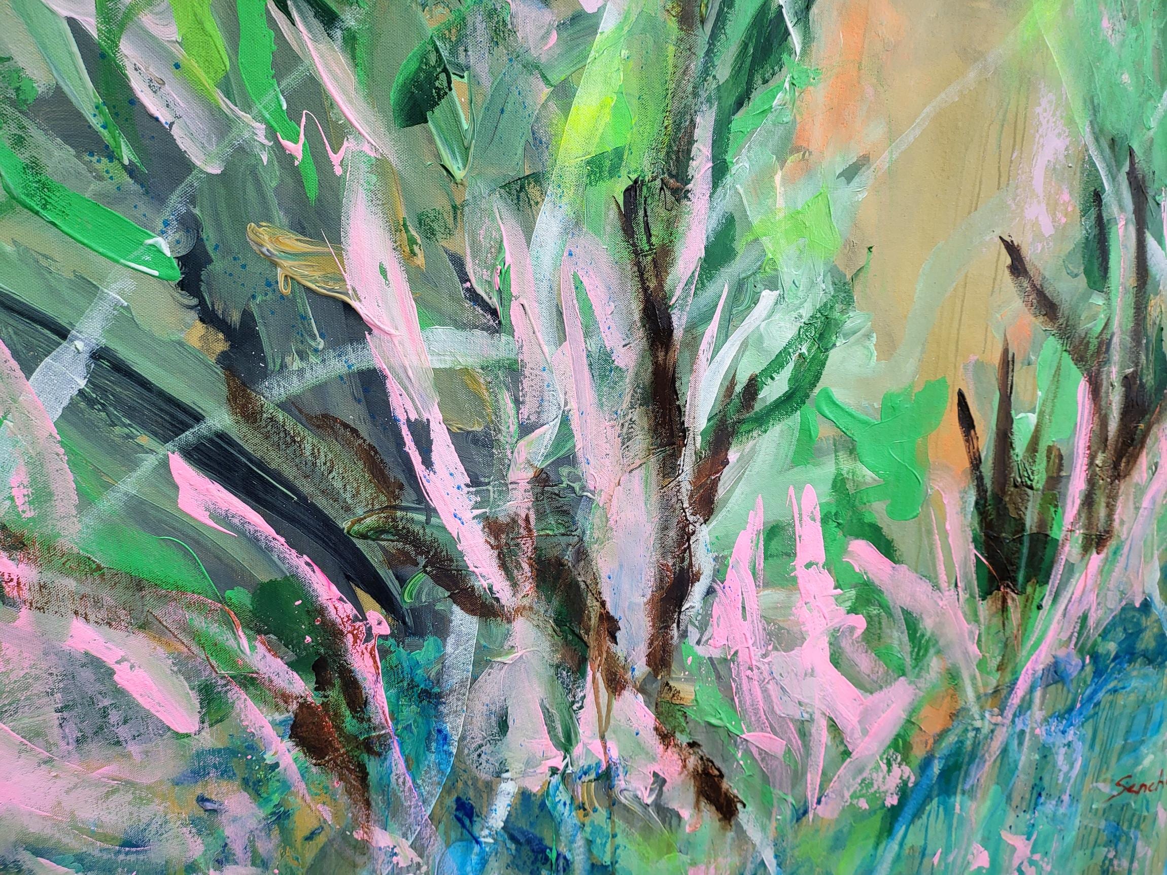 A vibrant and textured original abstract painting by the contemporary artist Alex Senchenko. This unique piece captures the dynamic energy of a wild garden, using a rich palette of greens, pinks, and blues with expressive brushstrokes and a palette knife technique that adds significant depth and texture. The composition focuses on organic, flowing lines that evoke a sense of natural movement and quiet strength, making it a perfect statement piece for any modern interior.