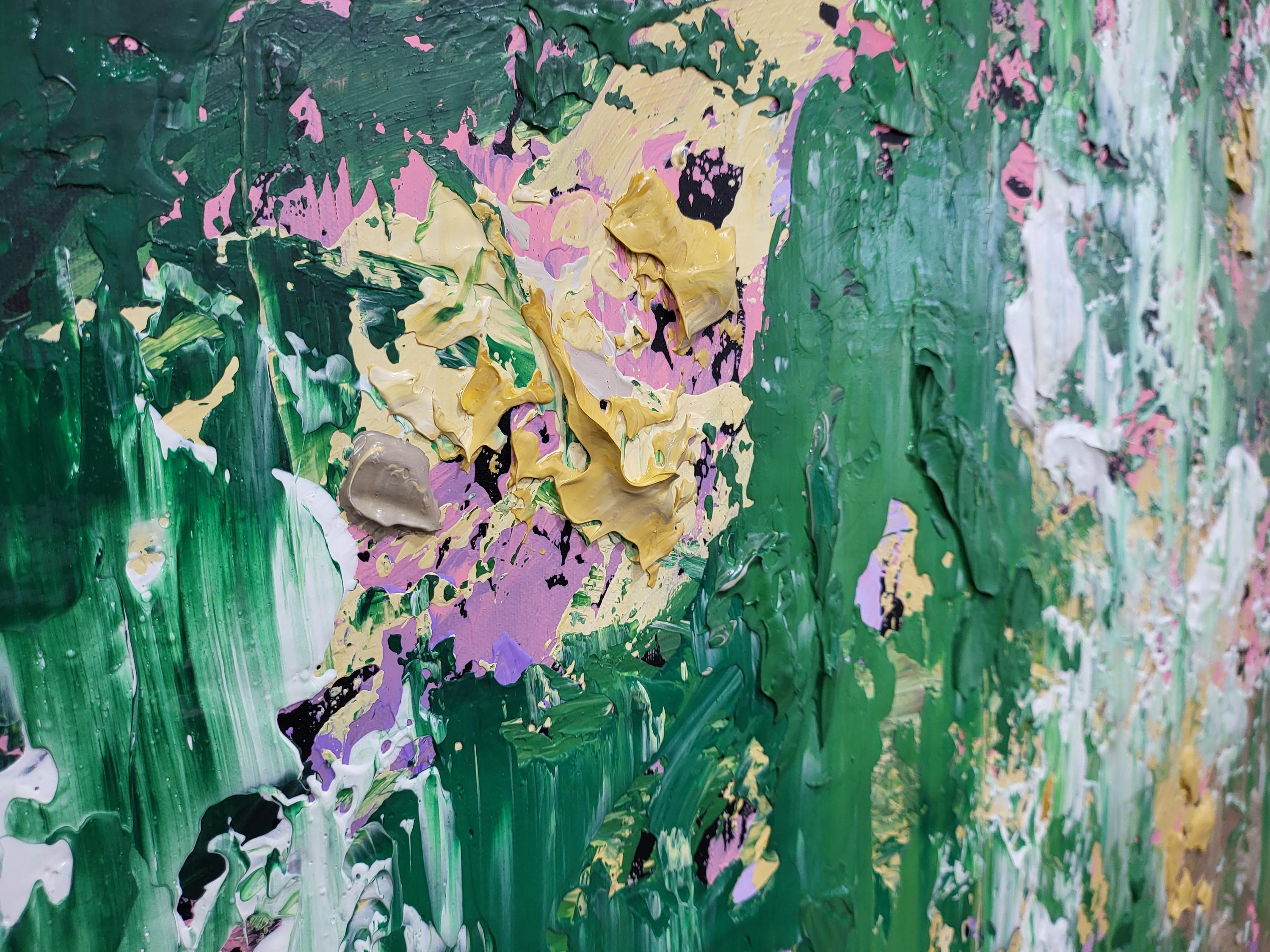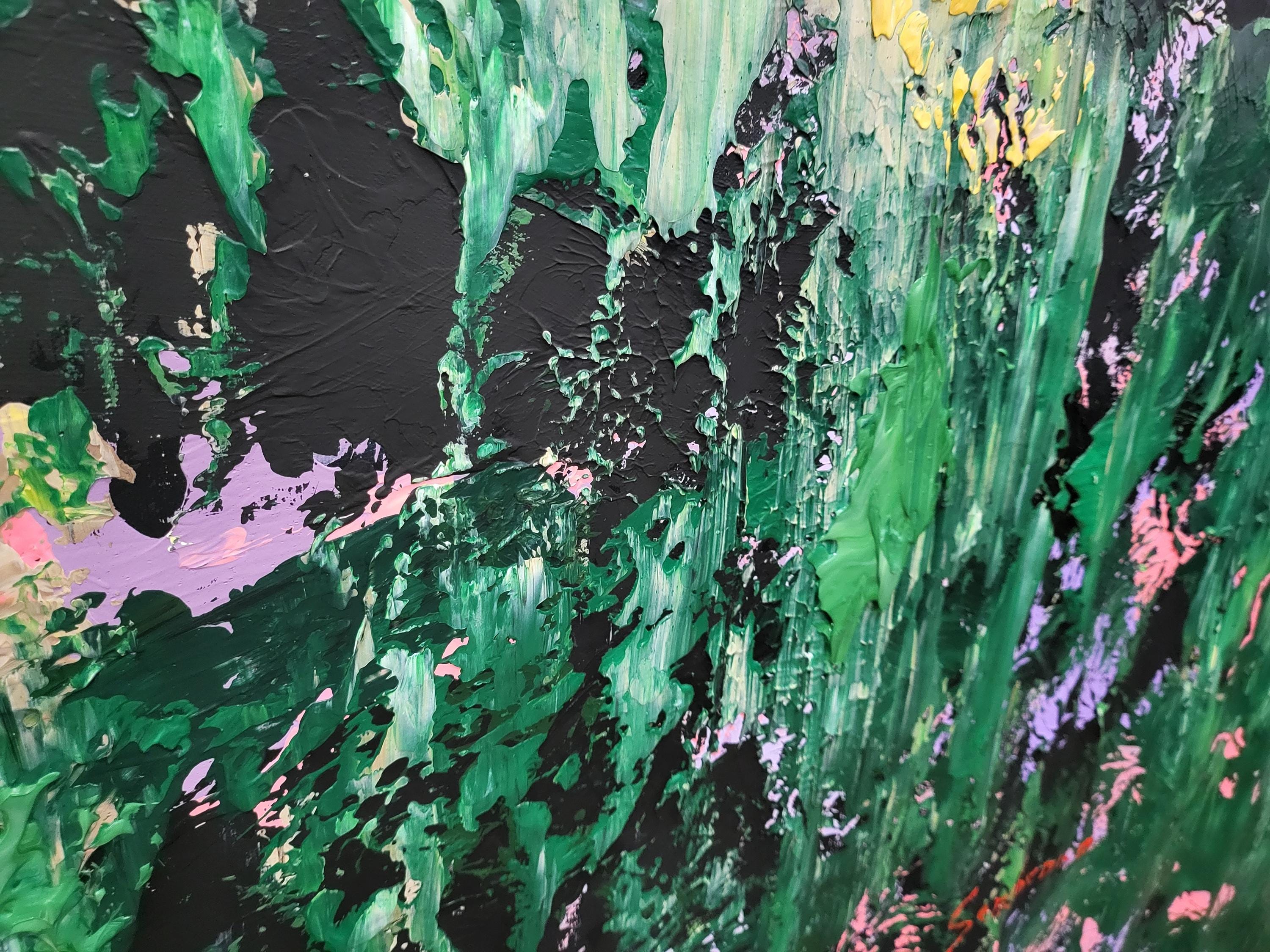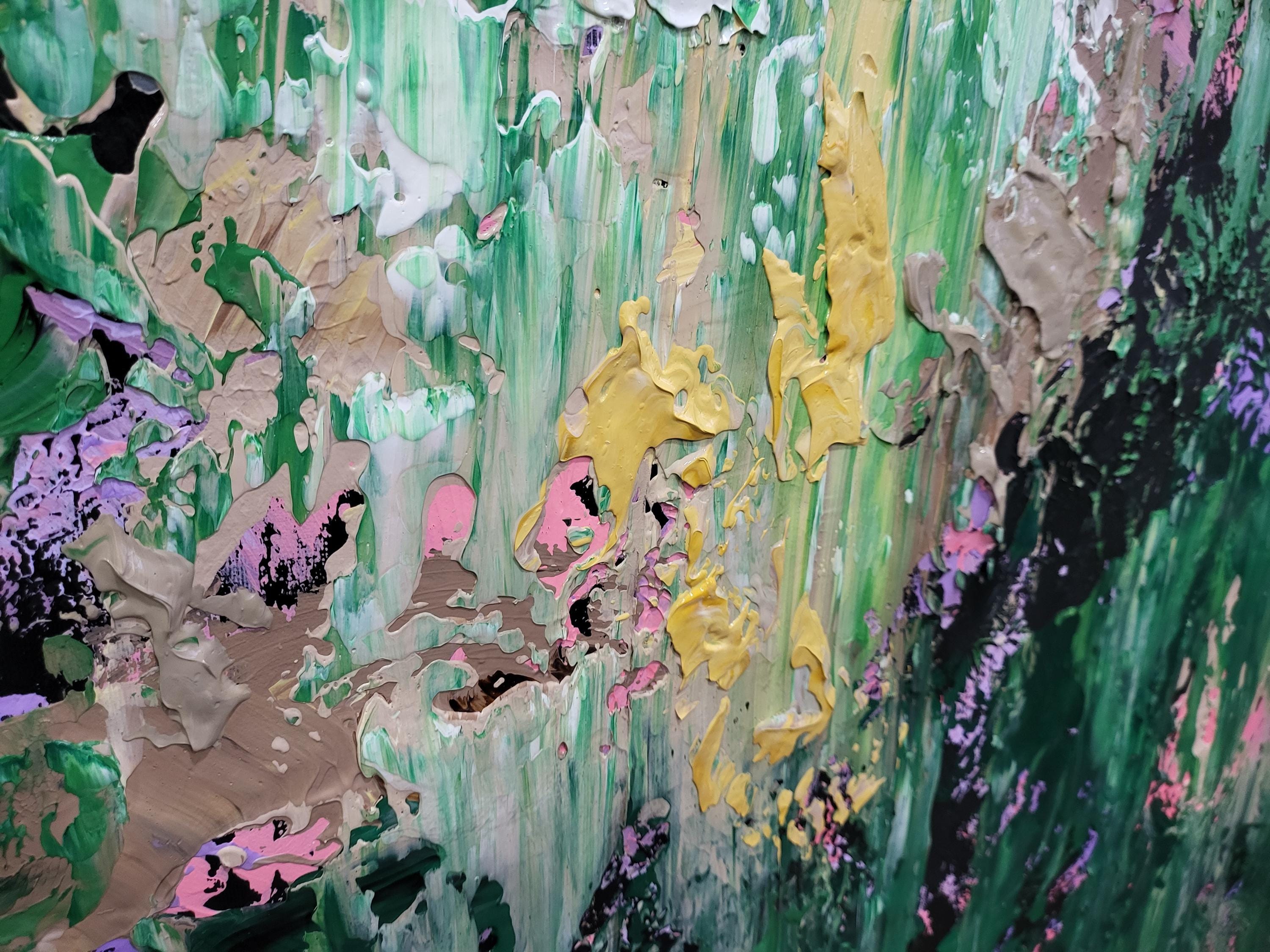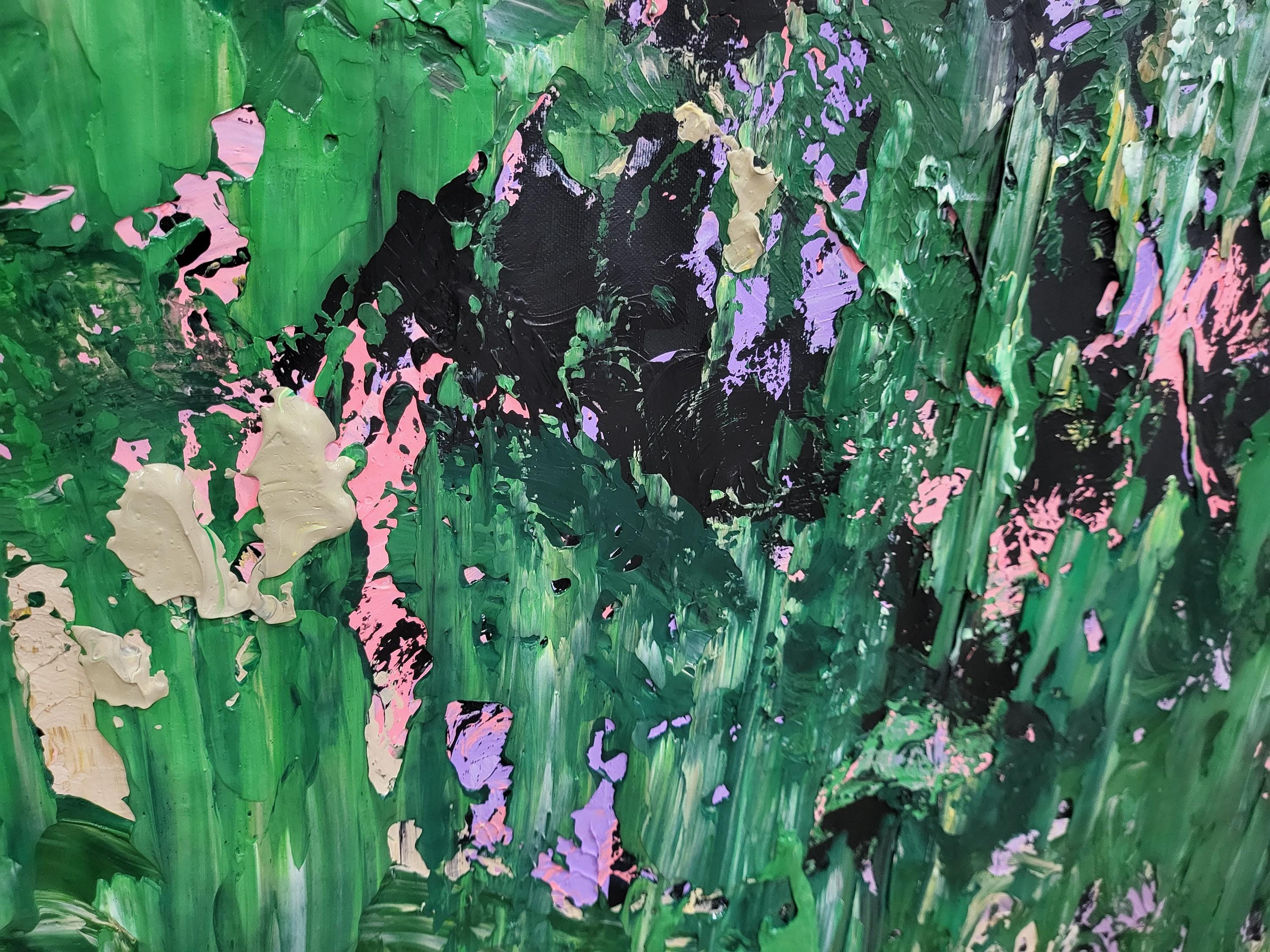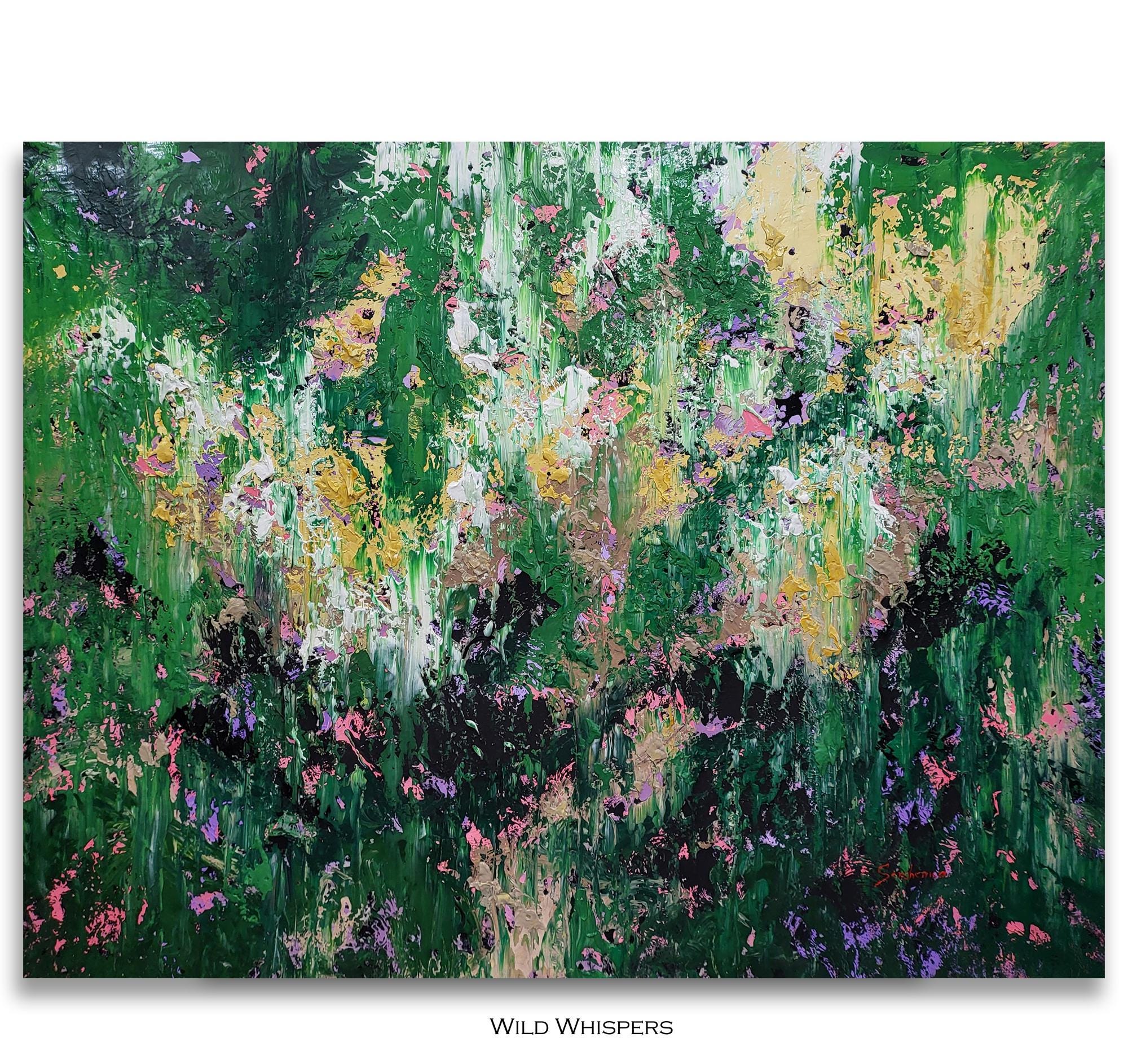 "Wild Whispers" is a vibrant abstract composition that serves as a tribute to the untamed beauty and vital energy of nature . Deep forest greens and lush emerald tones create a rich foundation, through which delicate accents of soft pink, lavender, and shimmering gold emerge like wildflowers in a sun-drenched meadow .