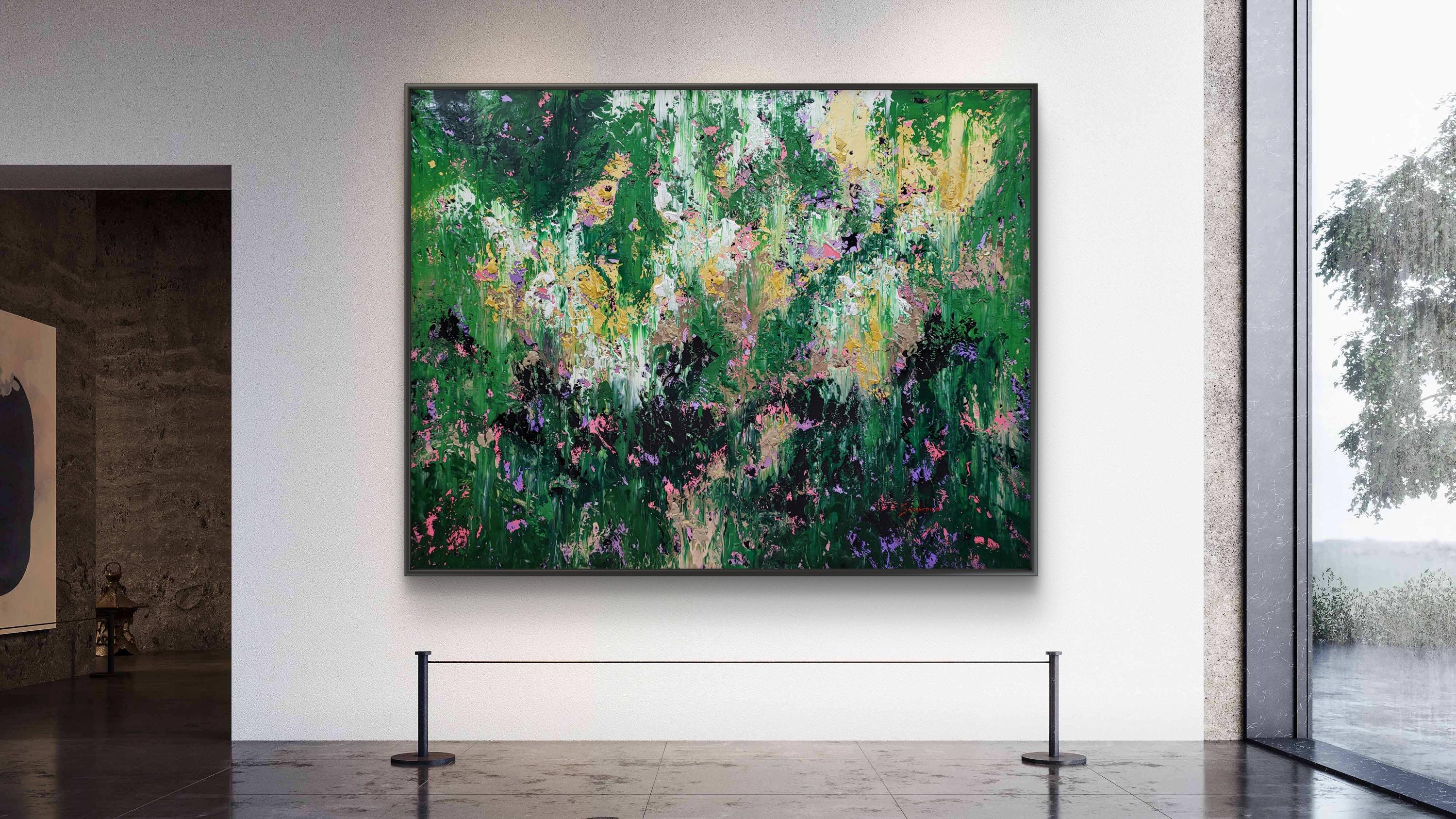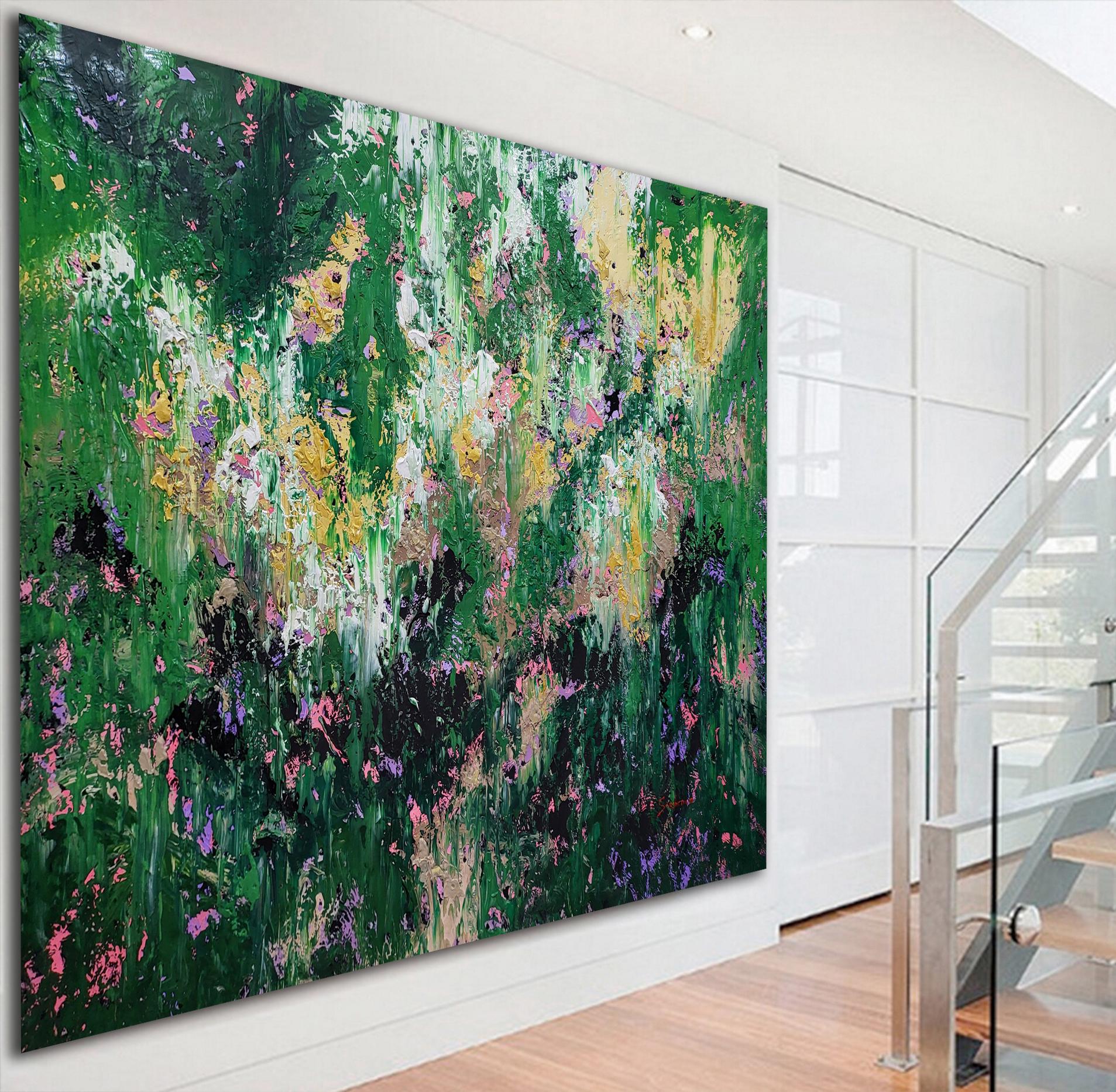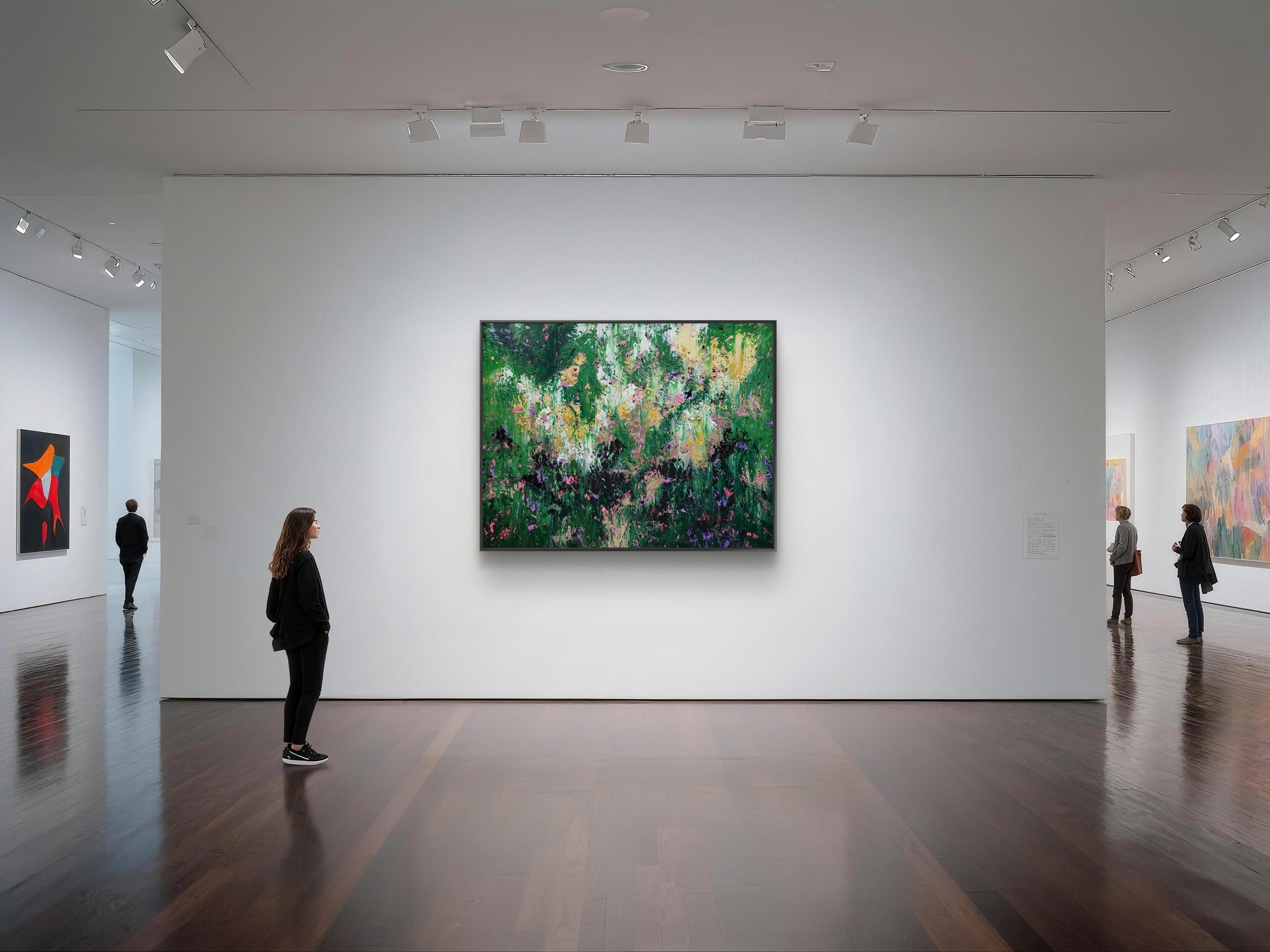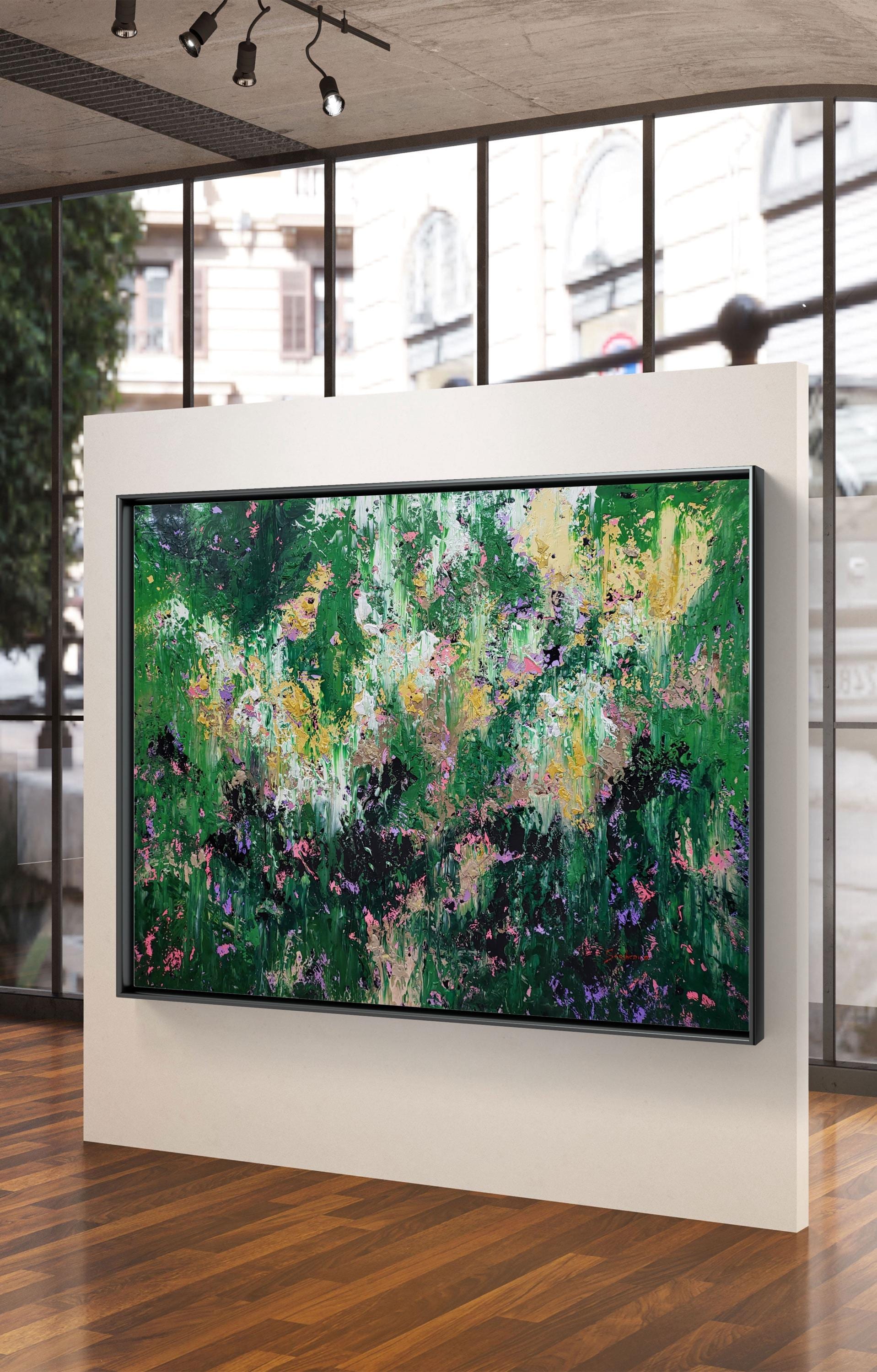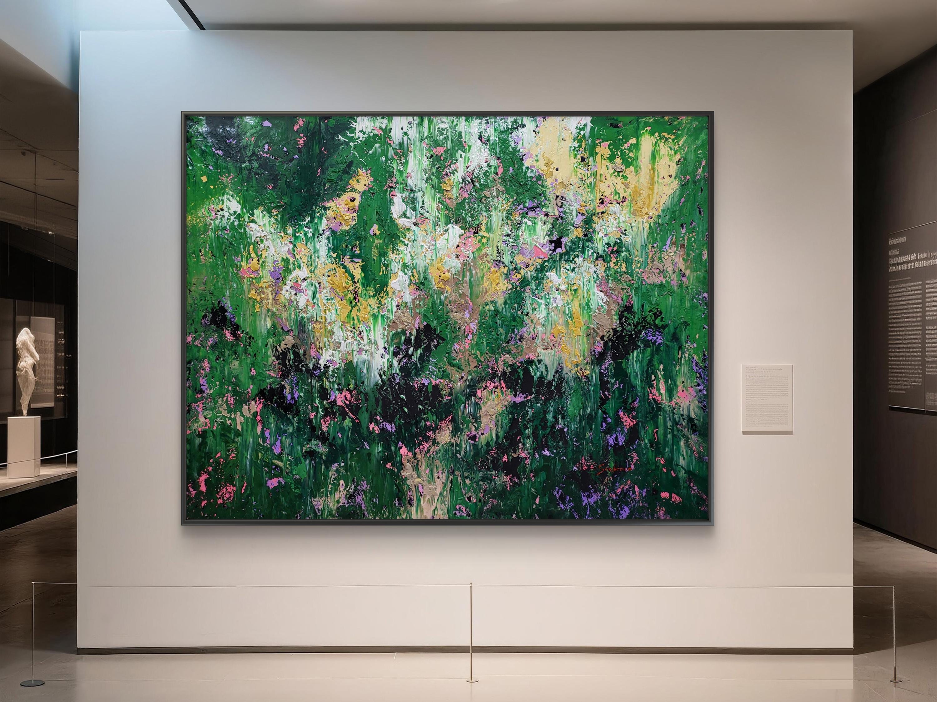 "Wild Whispers" is a vibrant abstract composition that serves as a tribute to the untamed beauty and vital energy of nature . Deep forest greens and lush emerald tones create a rich foundation, through which delicate accents of soft pink, lavender, and shimmering gold emerge like wildflowers in a sun-drenched meadow .