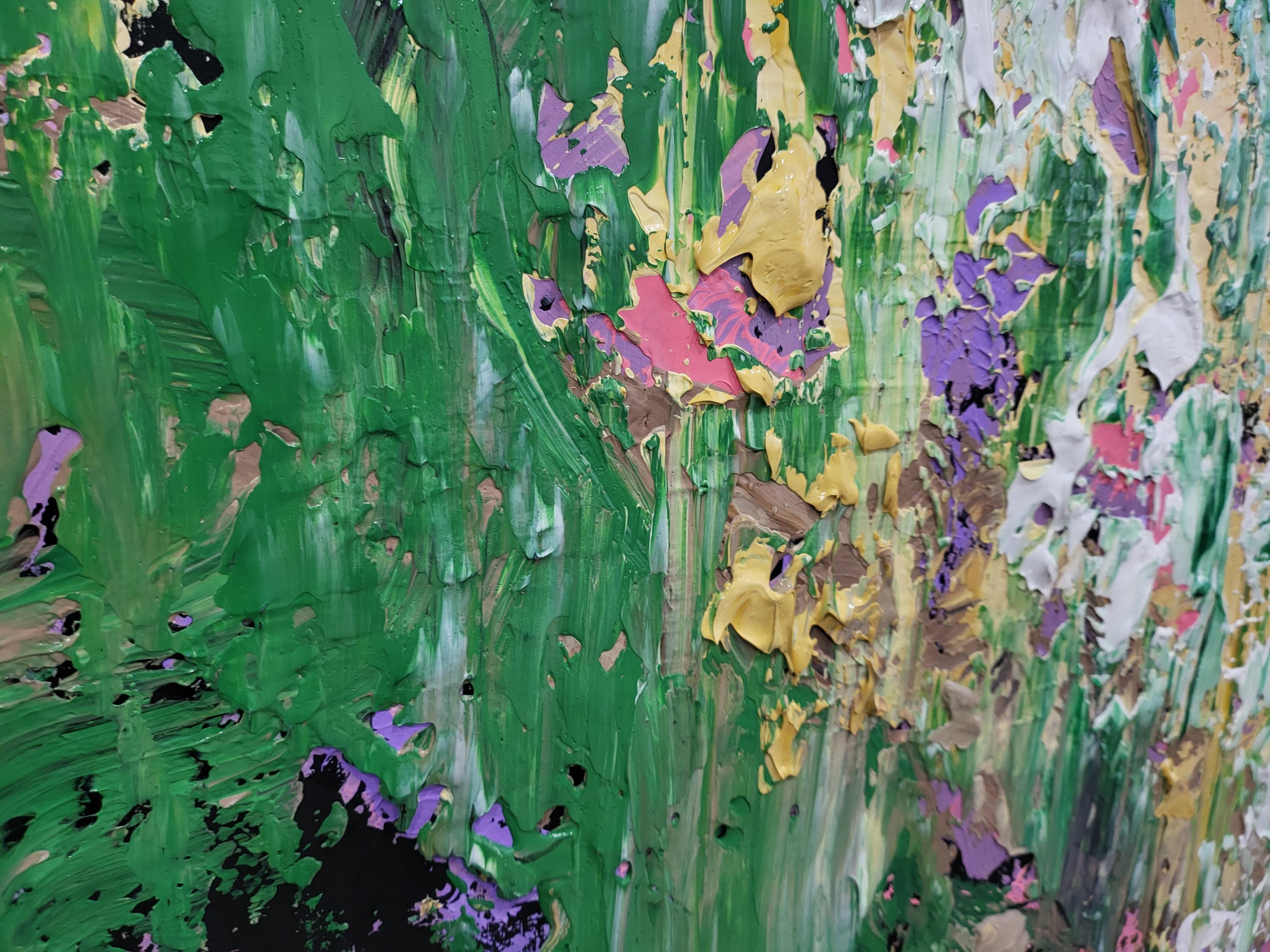 I uses an expressive impasto technique, applying thick layers of acrylic paint with a palette knife to create a highly textured, three-dimensional surface. This approach gives the painting a sense of movement and "dance," capturing a fleeting moment filled with the sounds of rustling grass and the scent of wild blooms.