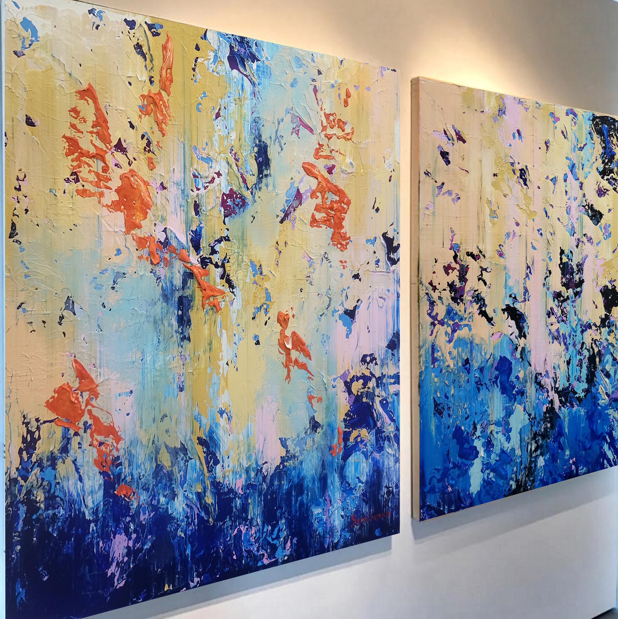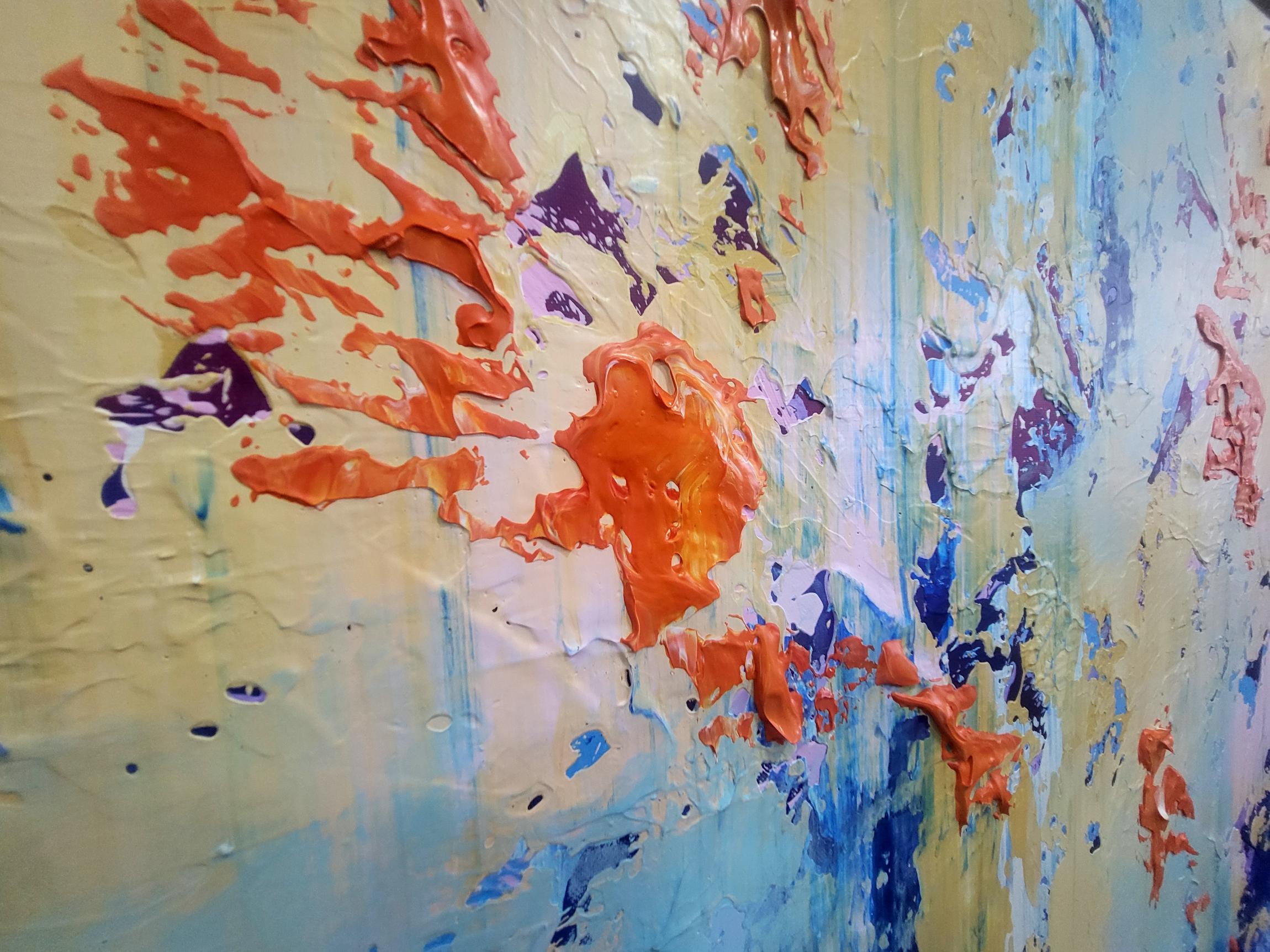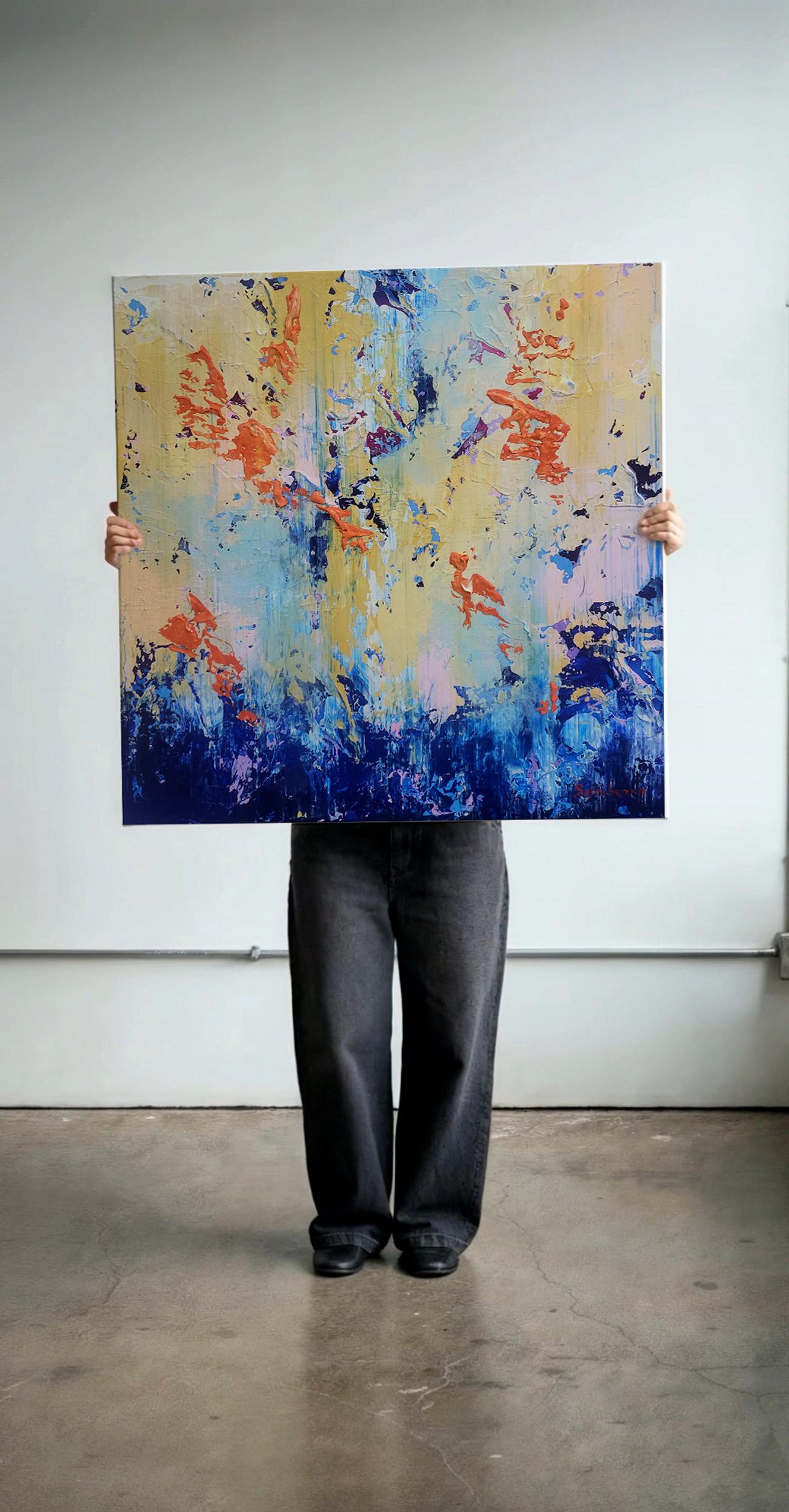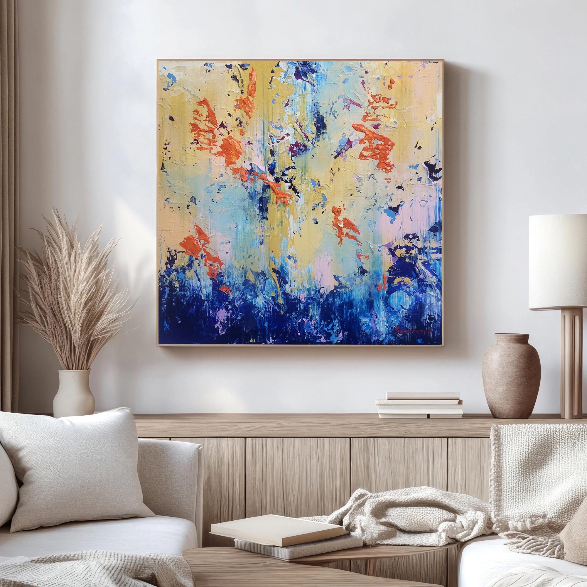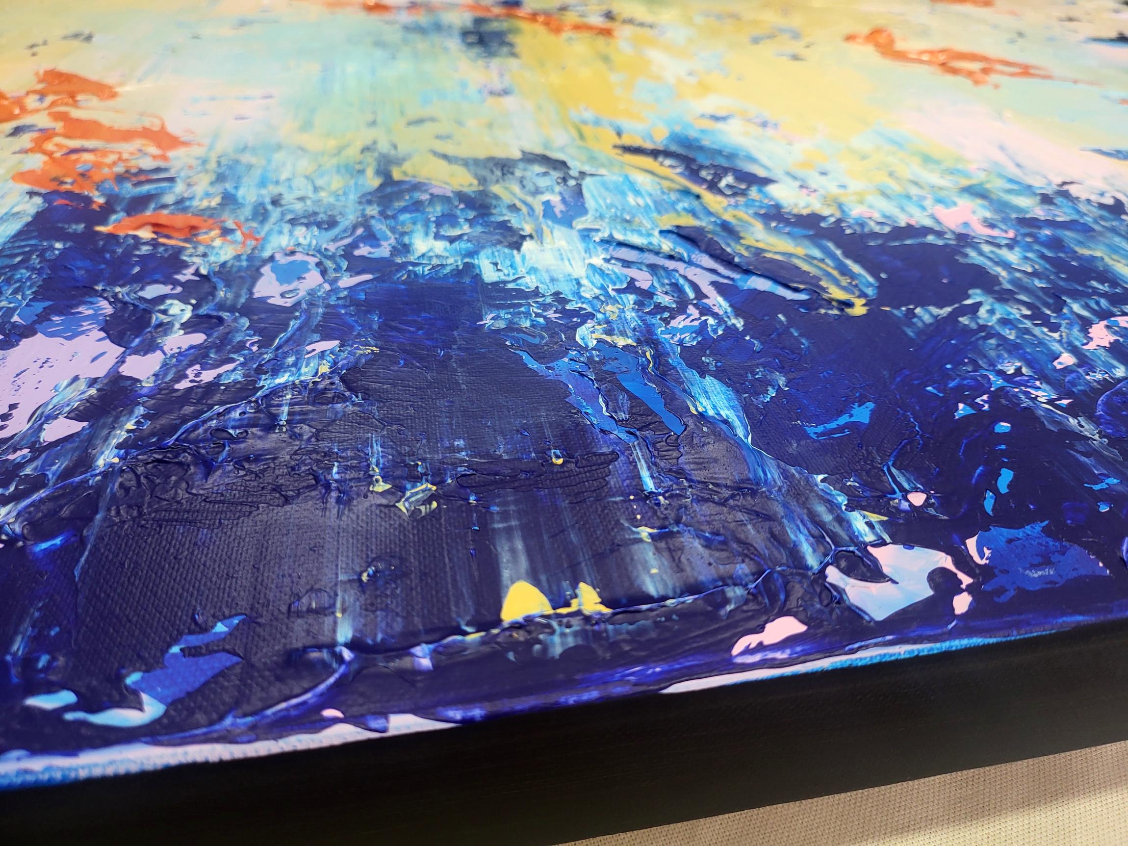 This original abstract acrylic painting is a bold exploration of texture and contrast. Titled "Golden Chaos," it captures a vibrant dance between calm and intensity. The bottom of the piece is anchored by deep, textured navy and cerulean blues, which rise like a tide to meet an ethereal, golden-yellow sky punctuated by energetic bursts of fiery orange and soft lavender.