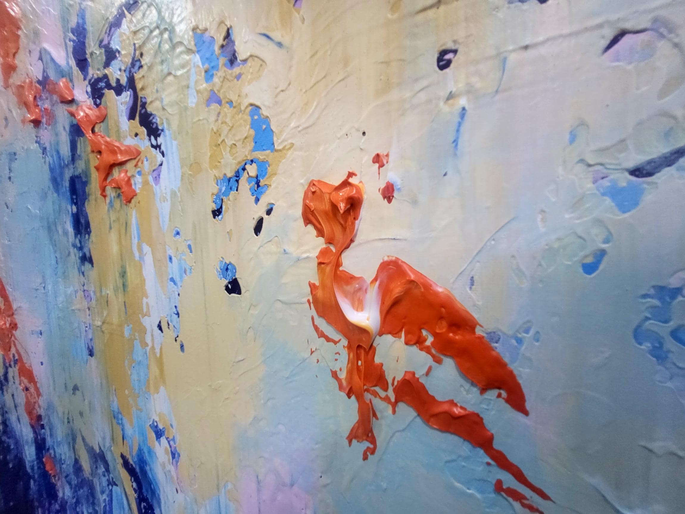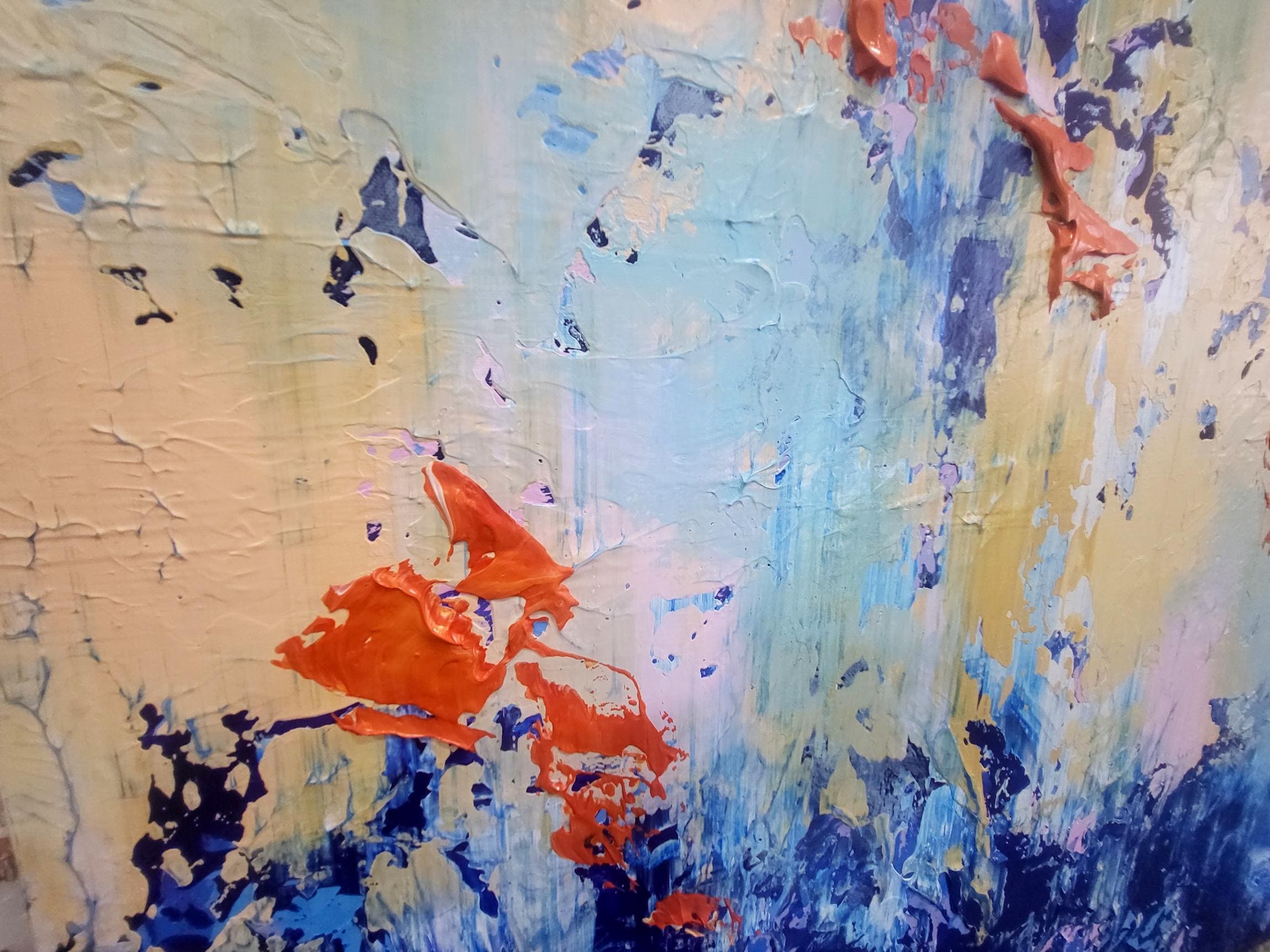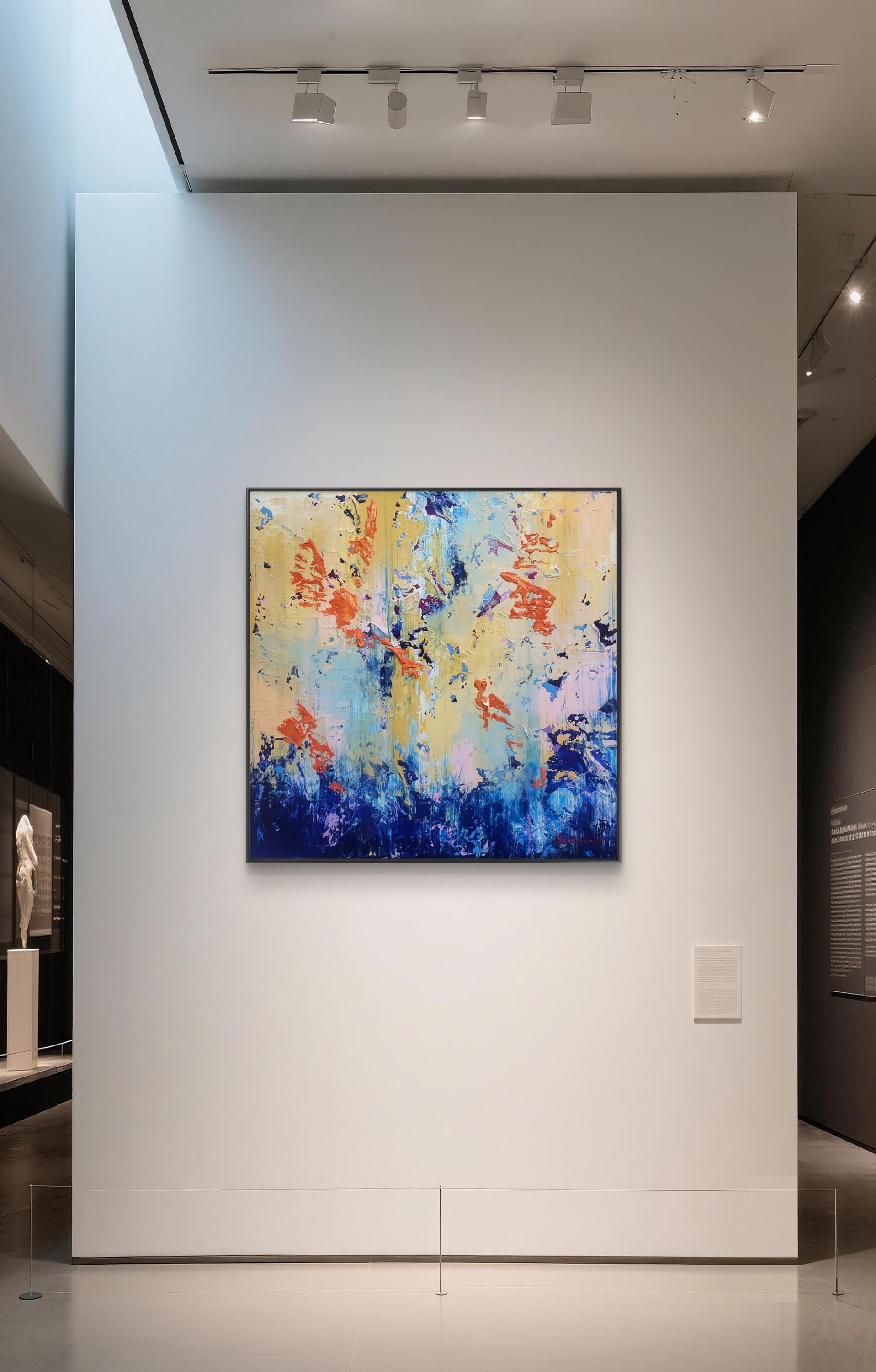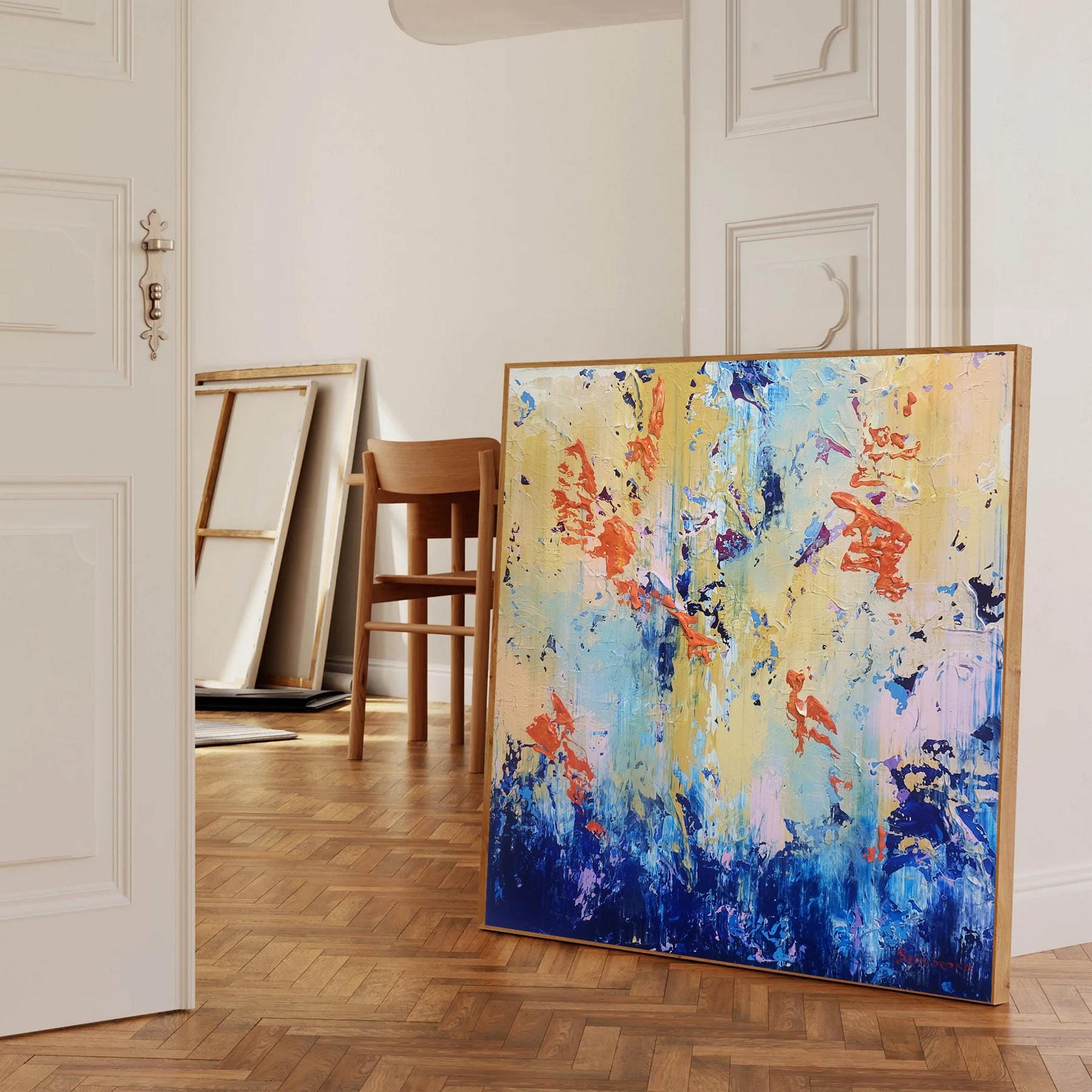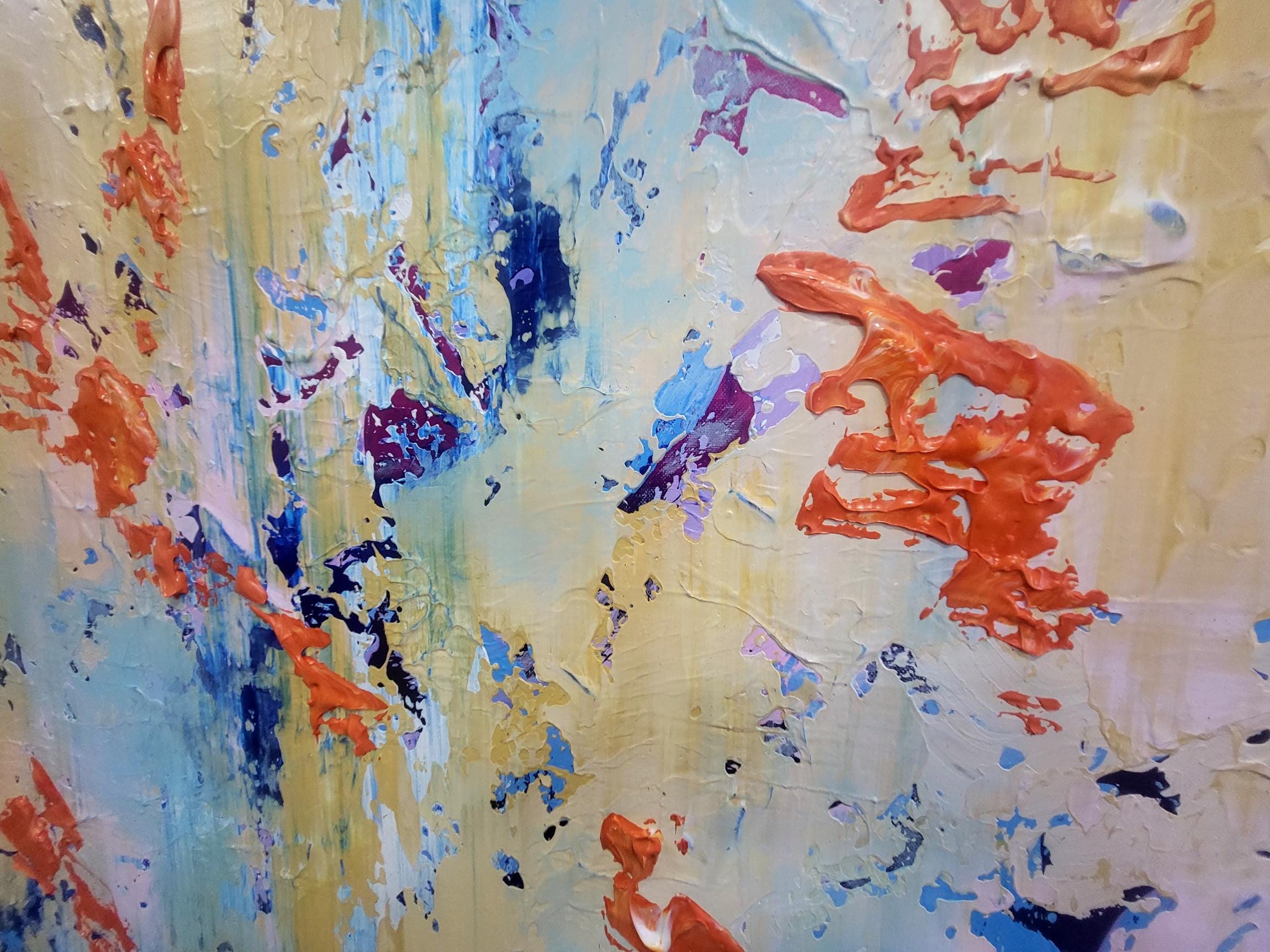 This original abstract acrylic painting is a bold exploration of texture and contrast. Titled "Golden Chaos," it captures a vibrant dance between calm and intensity. The bottom of the piece is anchored by deep, textured navy and cerulean blues, which rise like a tide to meet an ethereal, golden-yellow sky punctuated by energetic bursts of fiery orange and soft lavender.