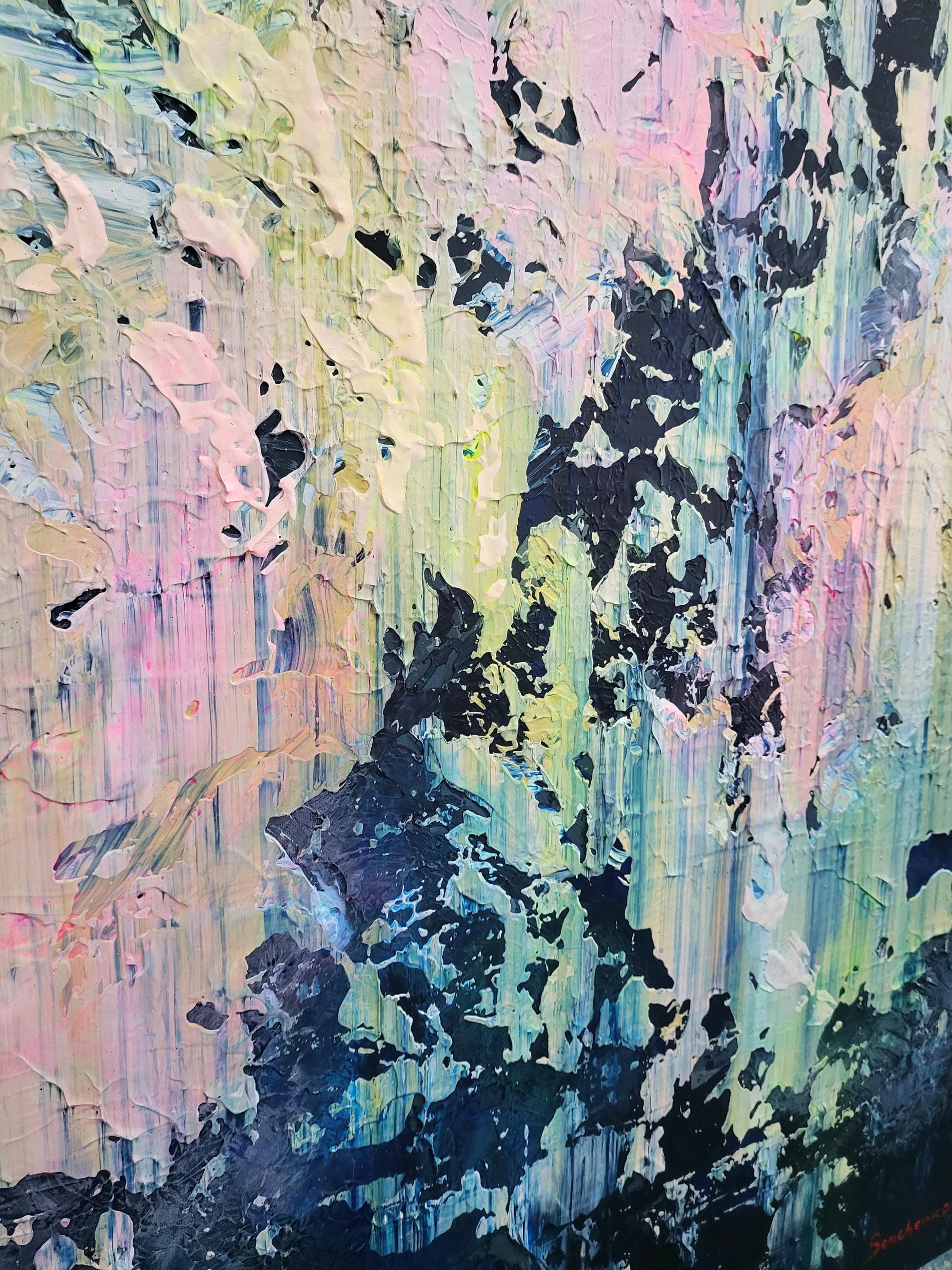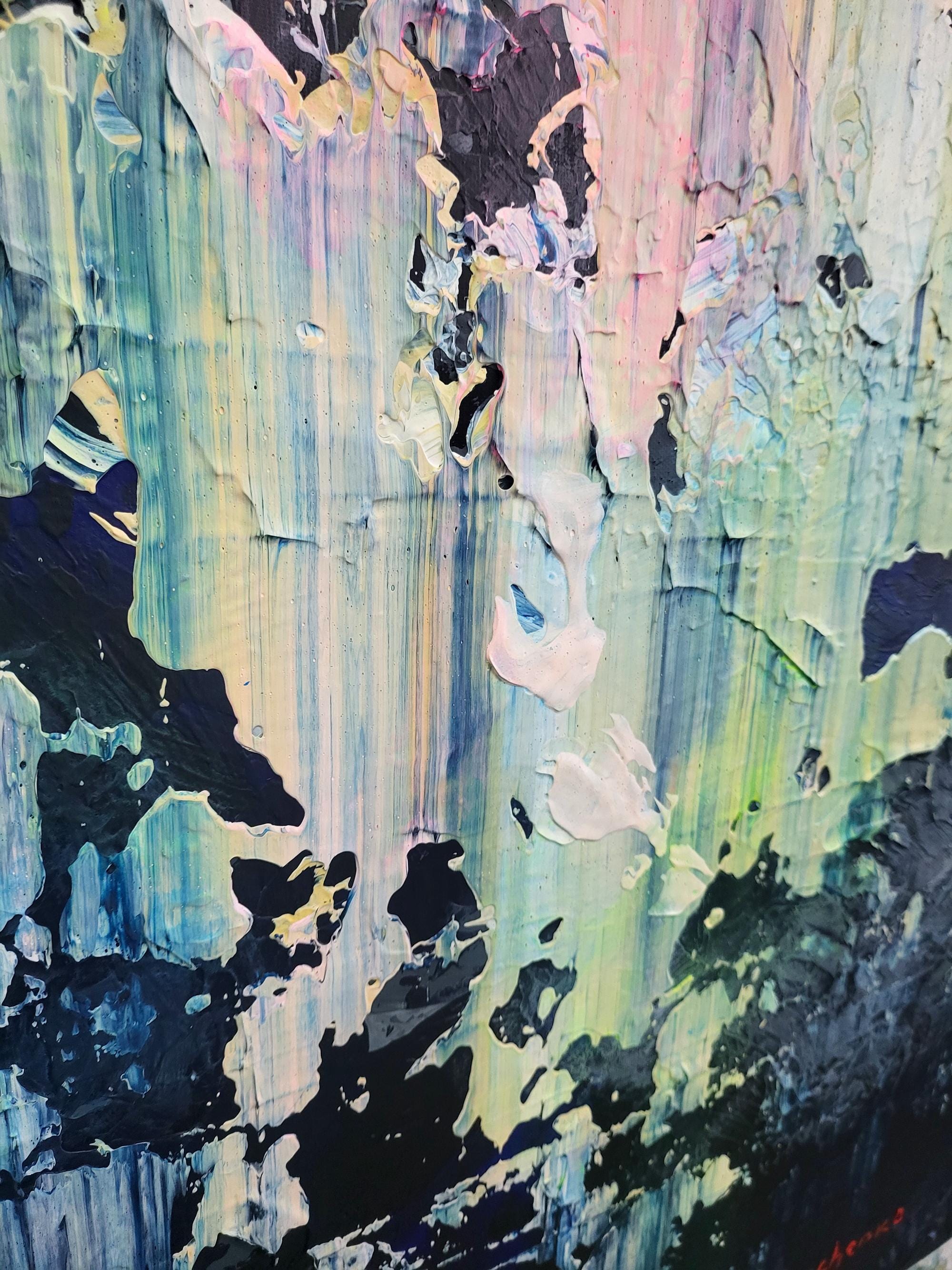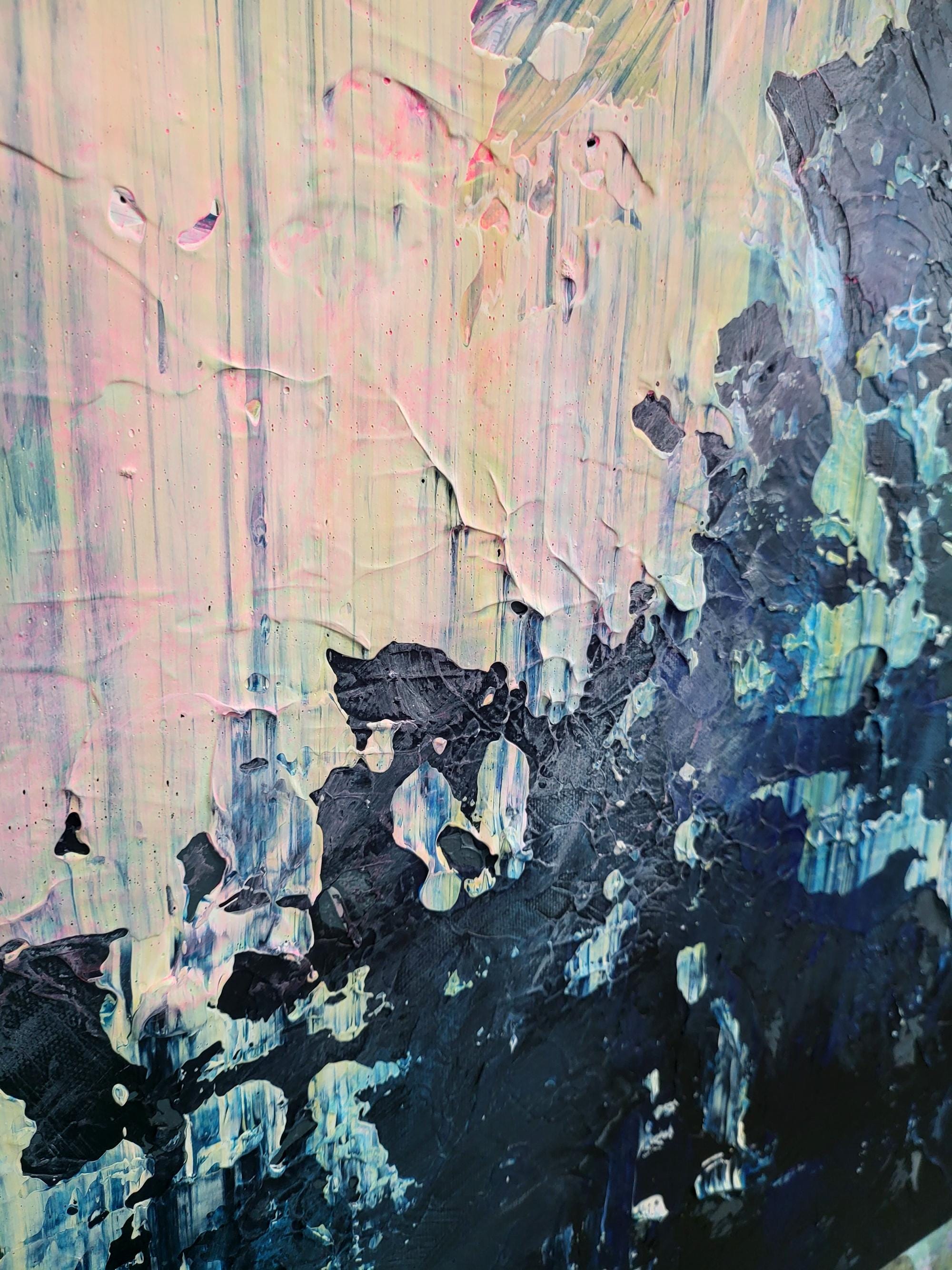 The artwork features a sophisticated palette where deep, moody blues and charcoals meet delicate pastel pinks and radiant yellow undertones. Using a signature palette knife technique, I creates a rich, heavy impasto texture that gives the piece a unique tactile quality and a striking 3D effect. The vertical movement of the strokes evokes a sense of falling light or a reflection on water, blending architectural precision with gestural abstraction.
