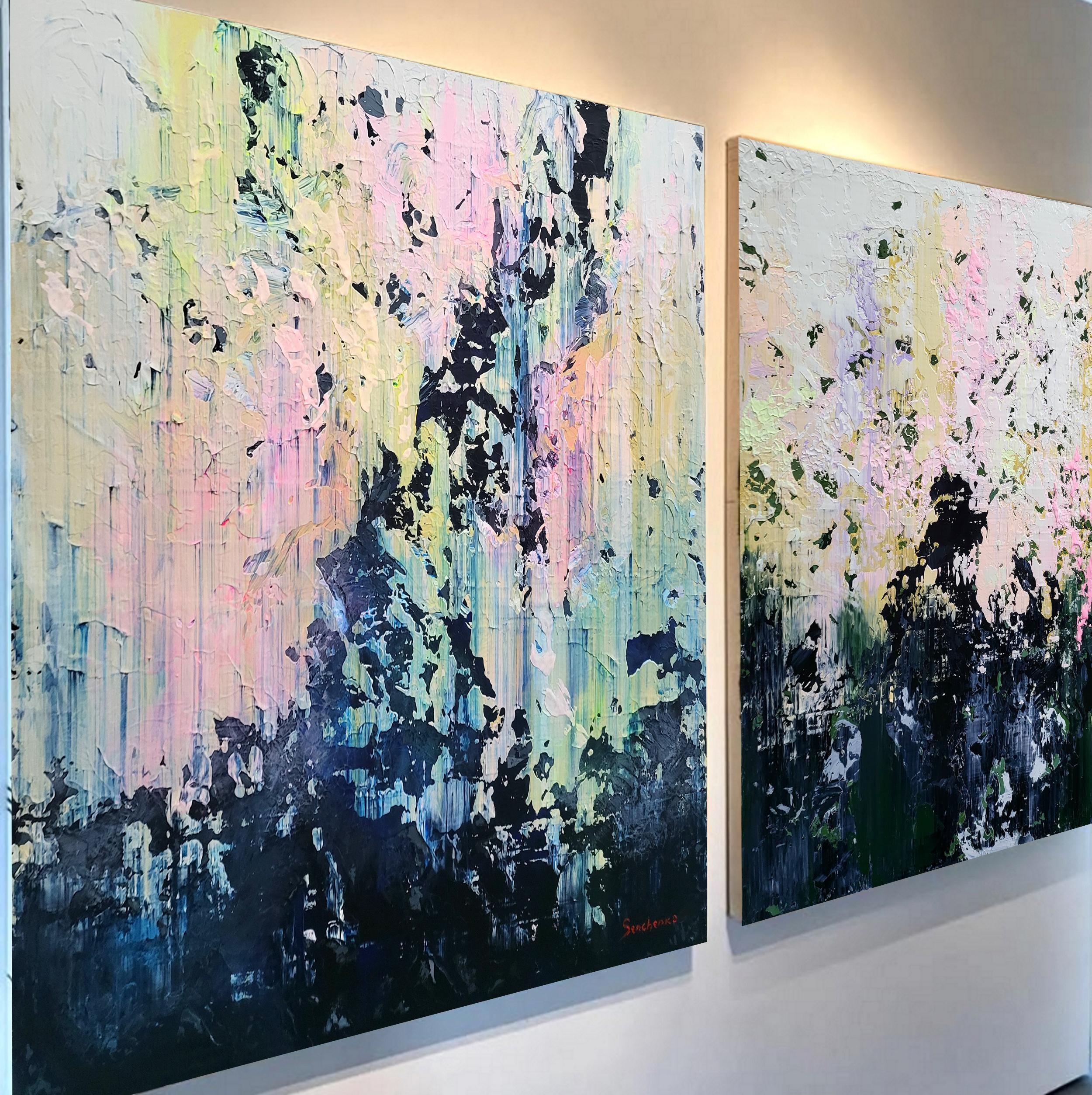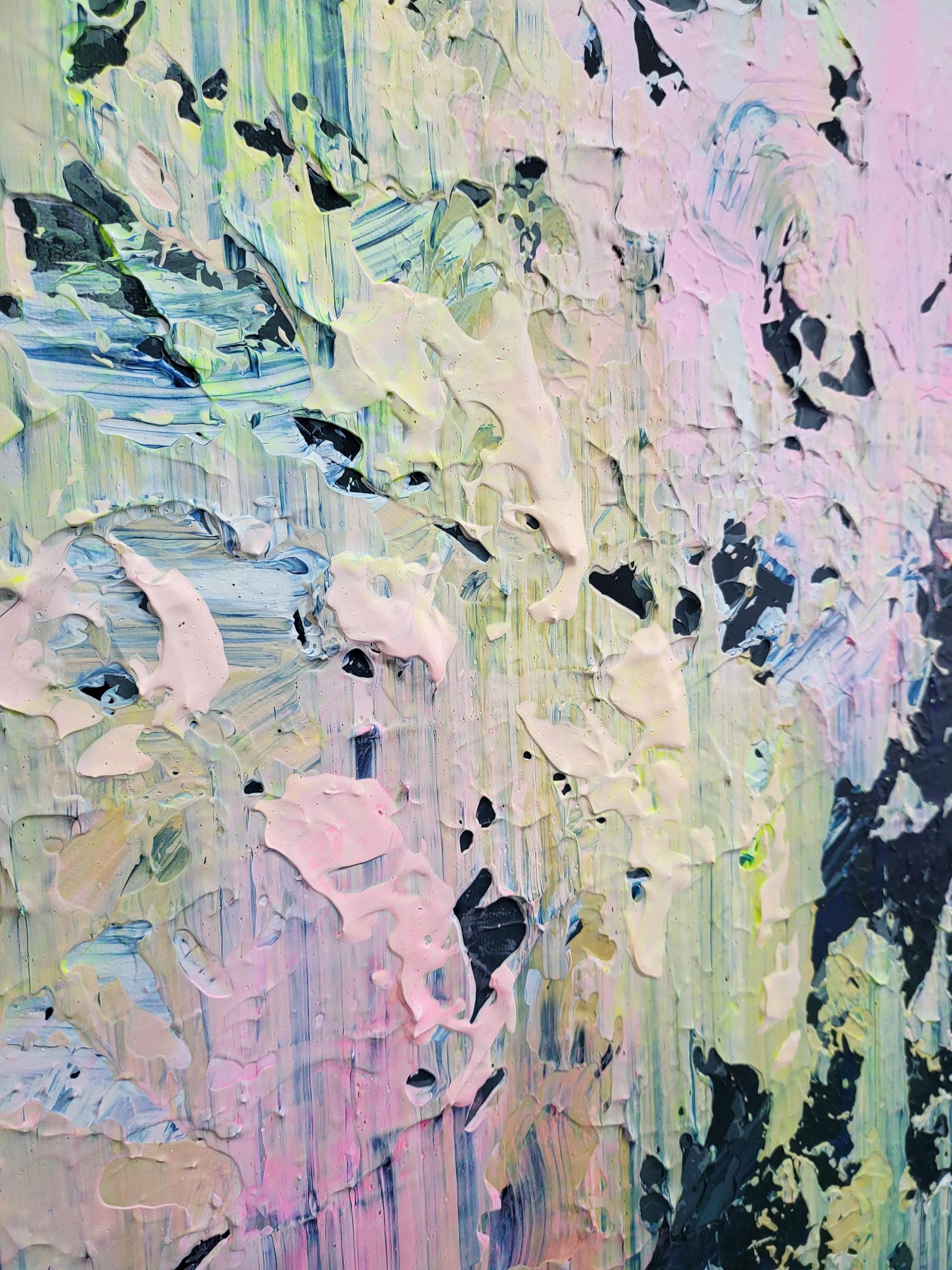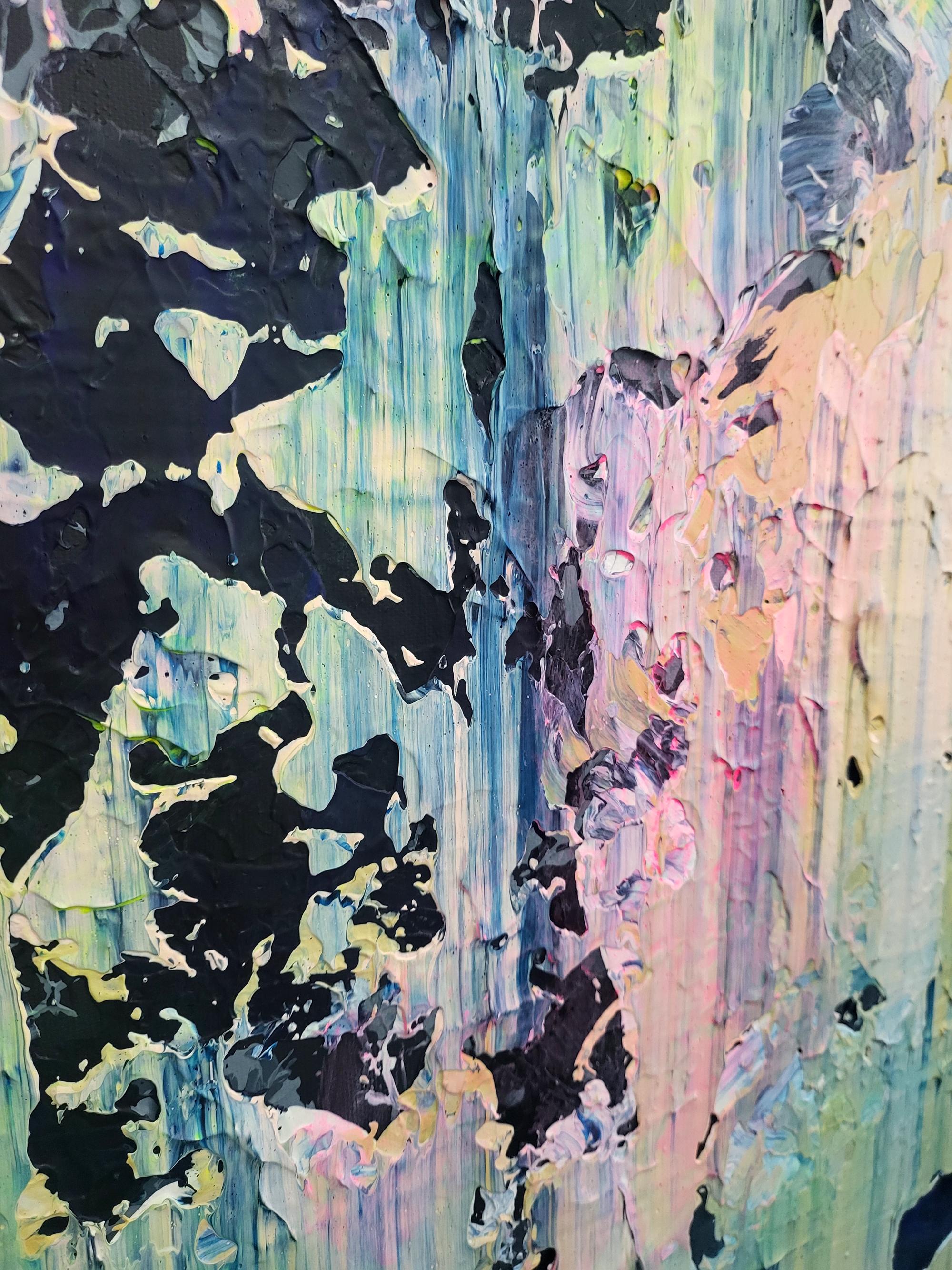 The artwork features a sophisticated palette where deep, moody blues and charcoals meet delicate pastel pinks and radiant yellow undertones. Using a signature palette knife technique, I creates a rich, heavy impasto texture that gives the piece a unique tactile quality and a striking 3D effect. The vertical movement of the strokes evokes a sense of falling light or a reflection on water, blending architectural precision with gestural abstraction.