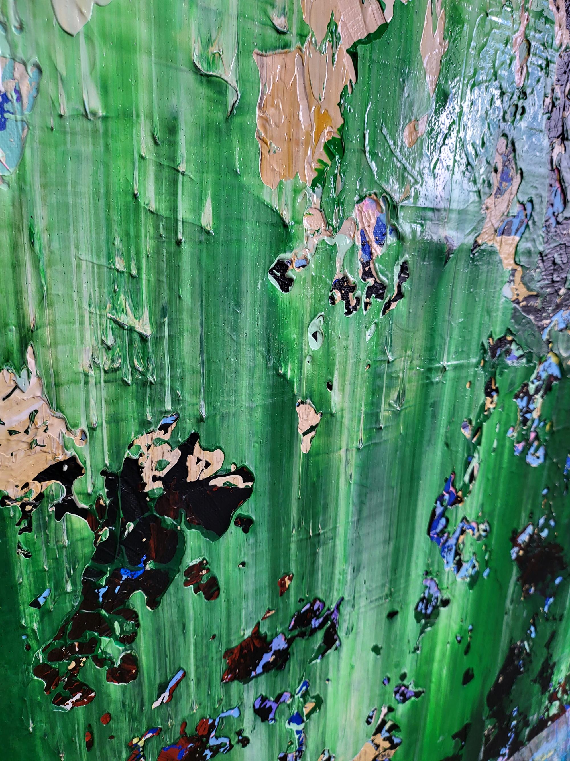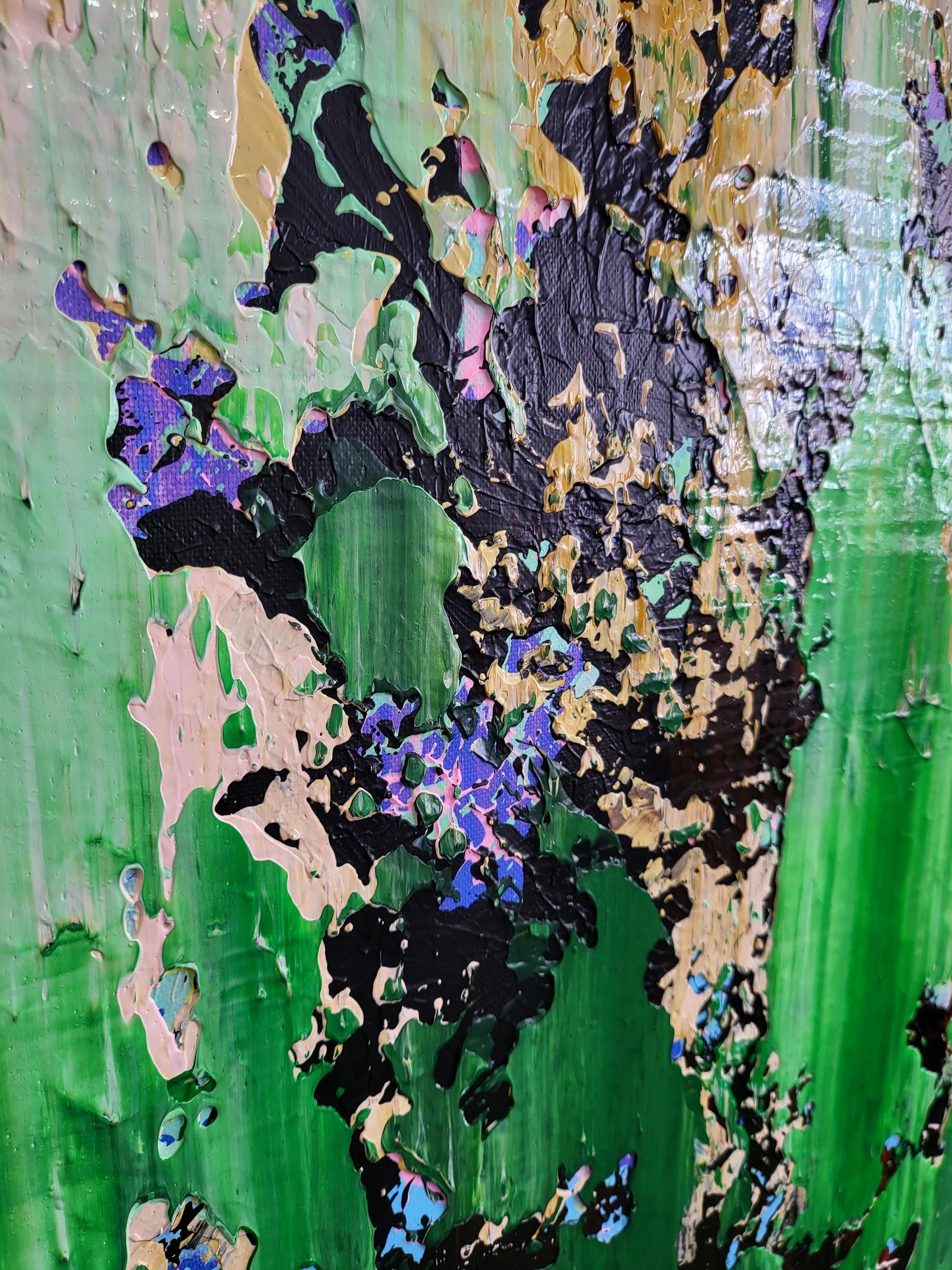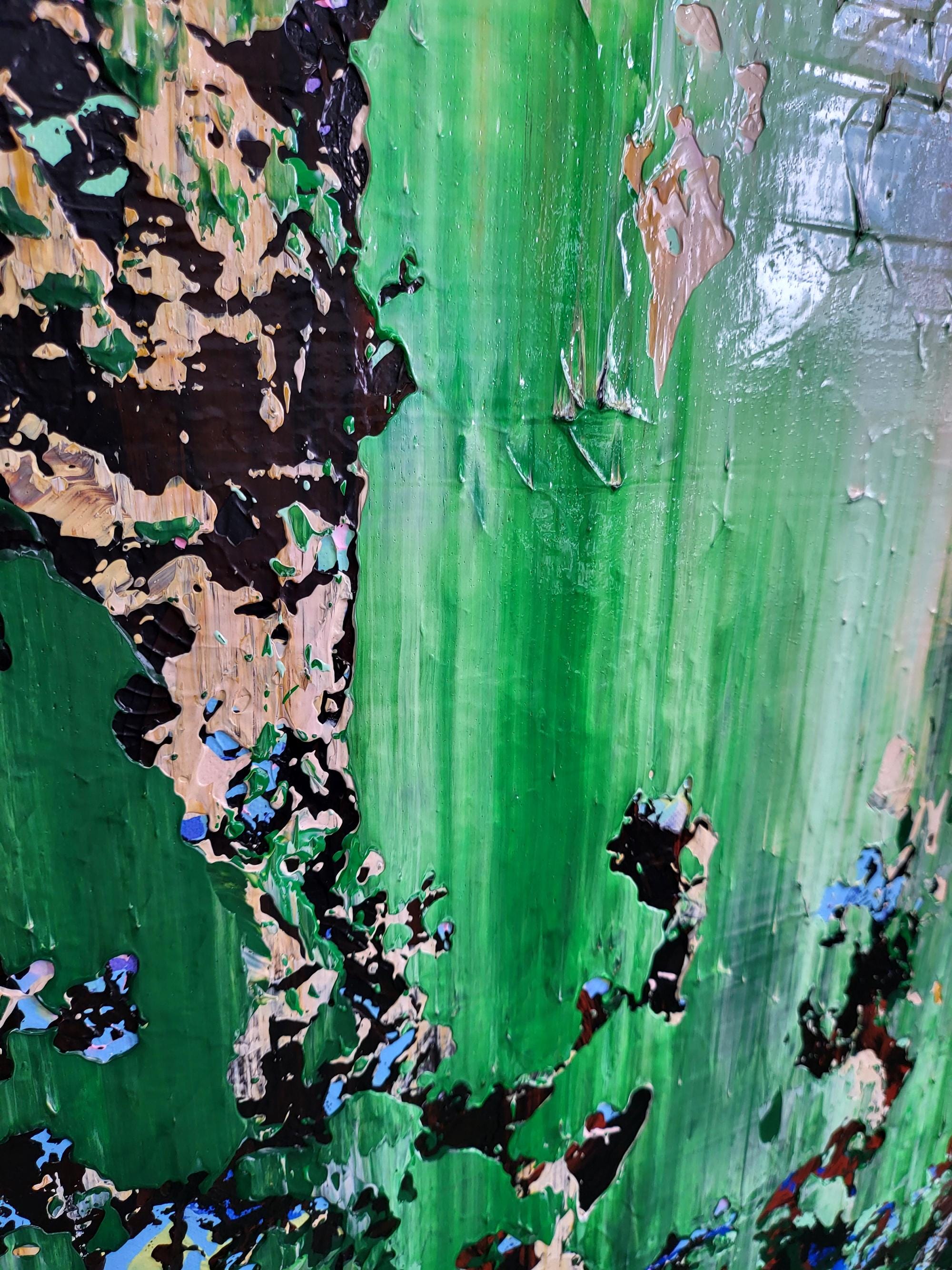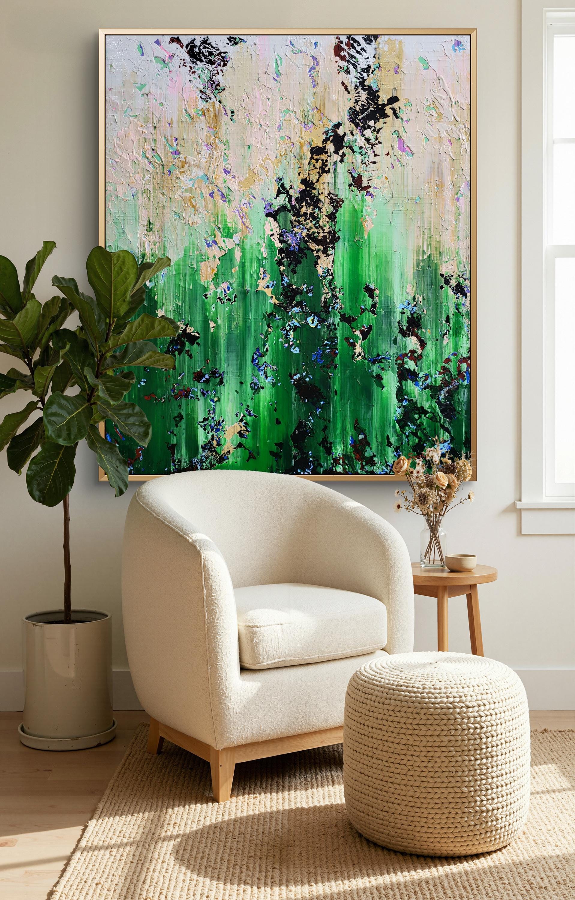 Experience the raw energy of nature’s transition with "The Thaw," a vibrant abstract piece that captures the exact moment winter’s grip begins to loosen. This painting is a rhythmic explosion of textures, where deep mossy greens and earthy tones collide with delicate hints of violet and crystalline white.