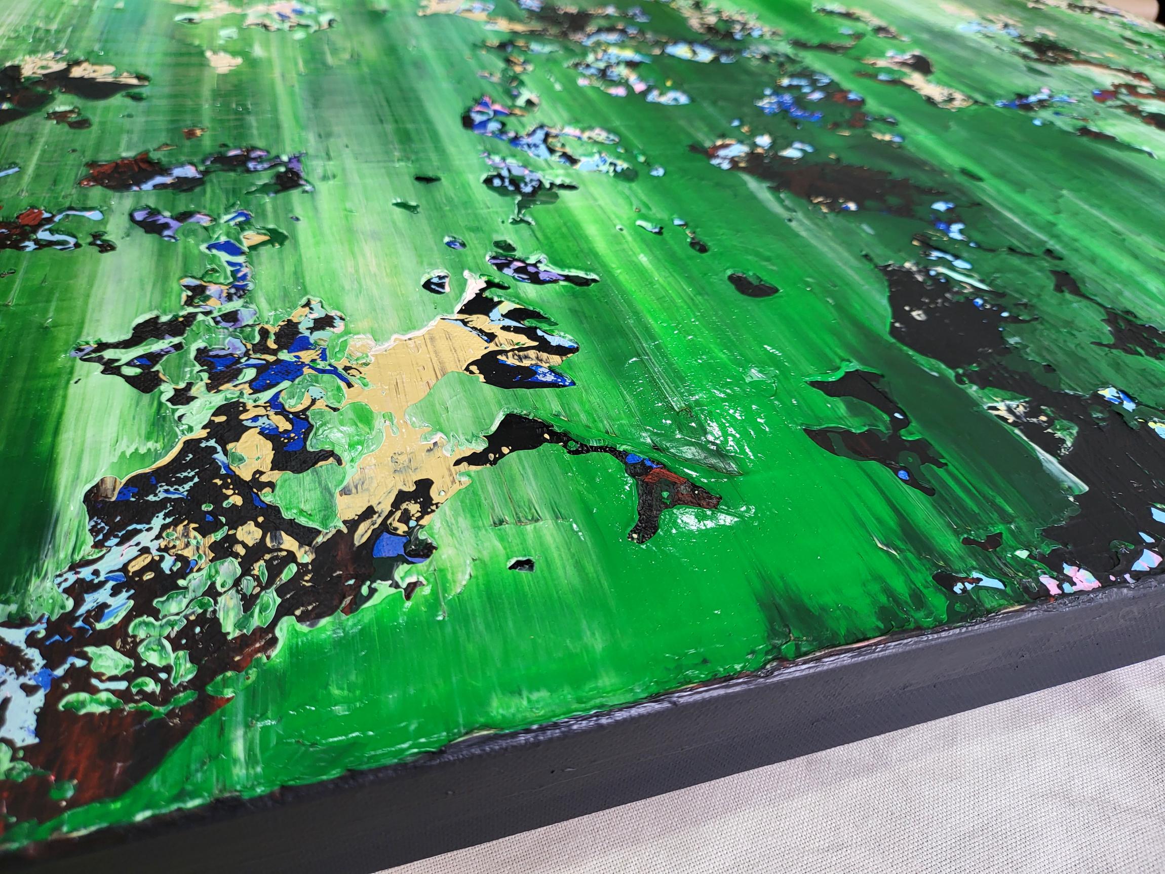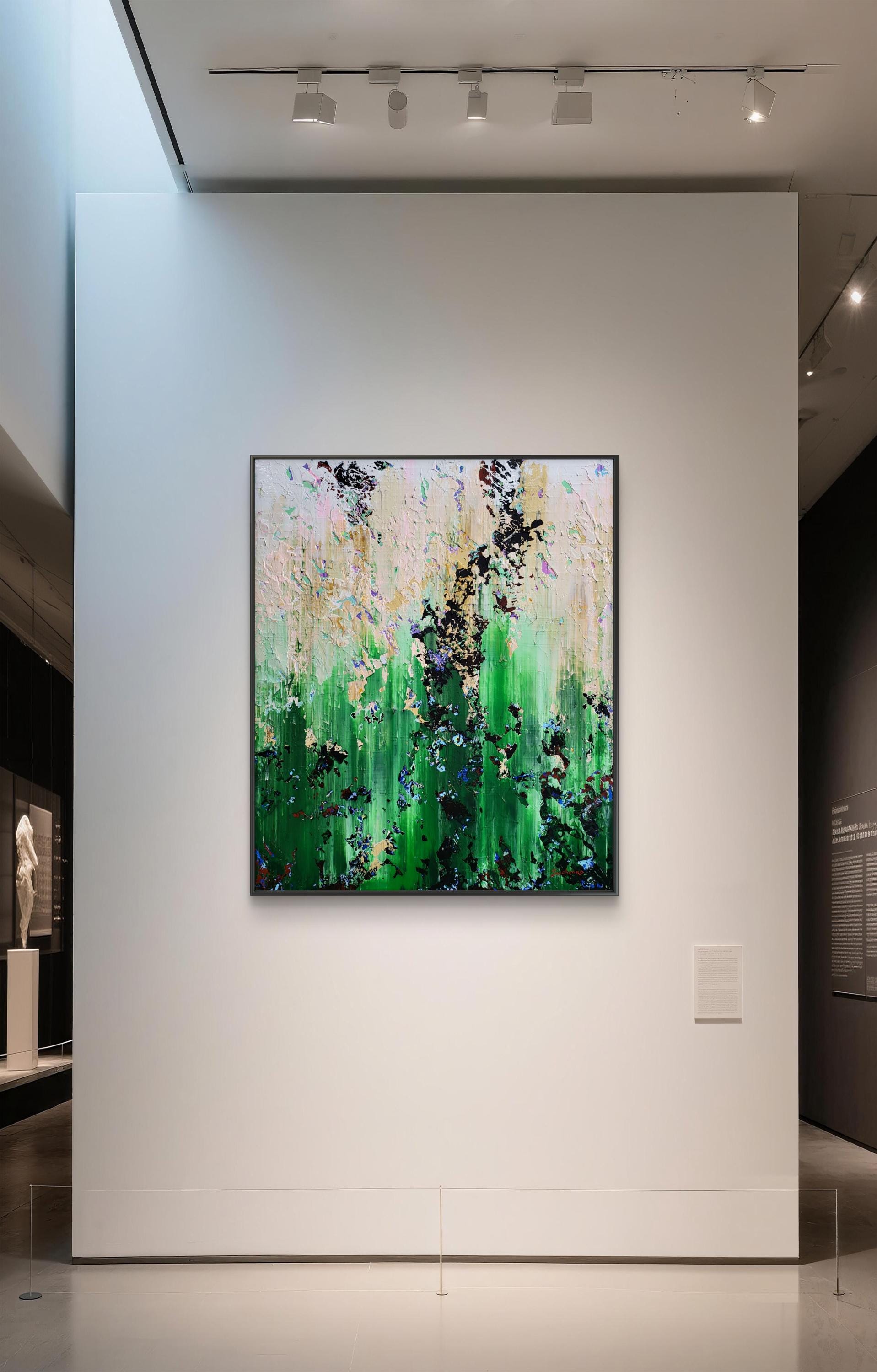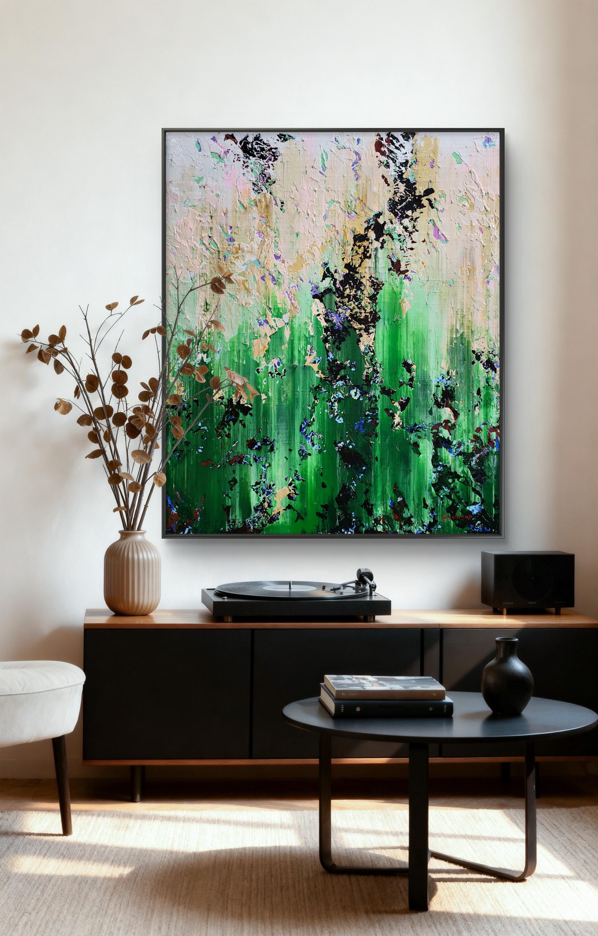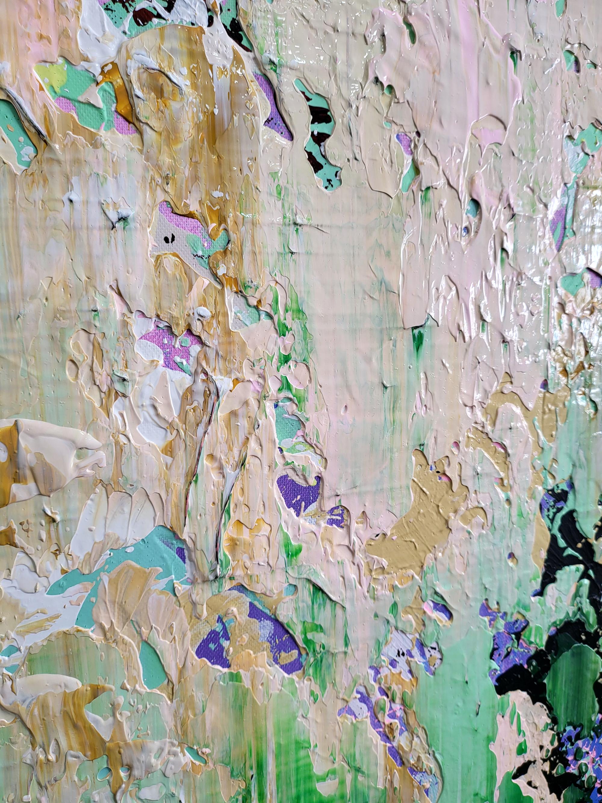 Experience the raw energy of nature’s transition with "The Thaw," a vibrant abstract piece that captures the exact moment winter’s grip begins to loosen. This painting is a rhythmic explosion of textures, where deep mossy greens and earthy tones collide with delicate hints of violet and crystalline white.