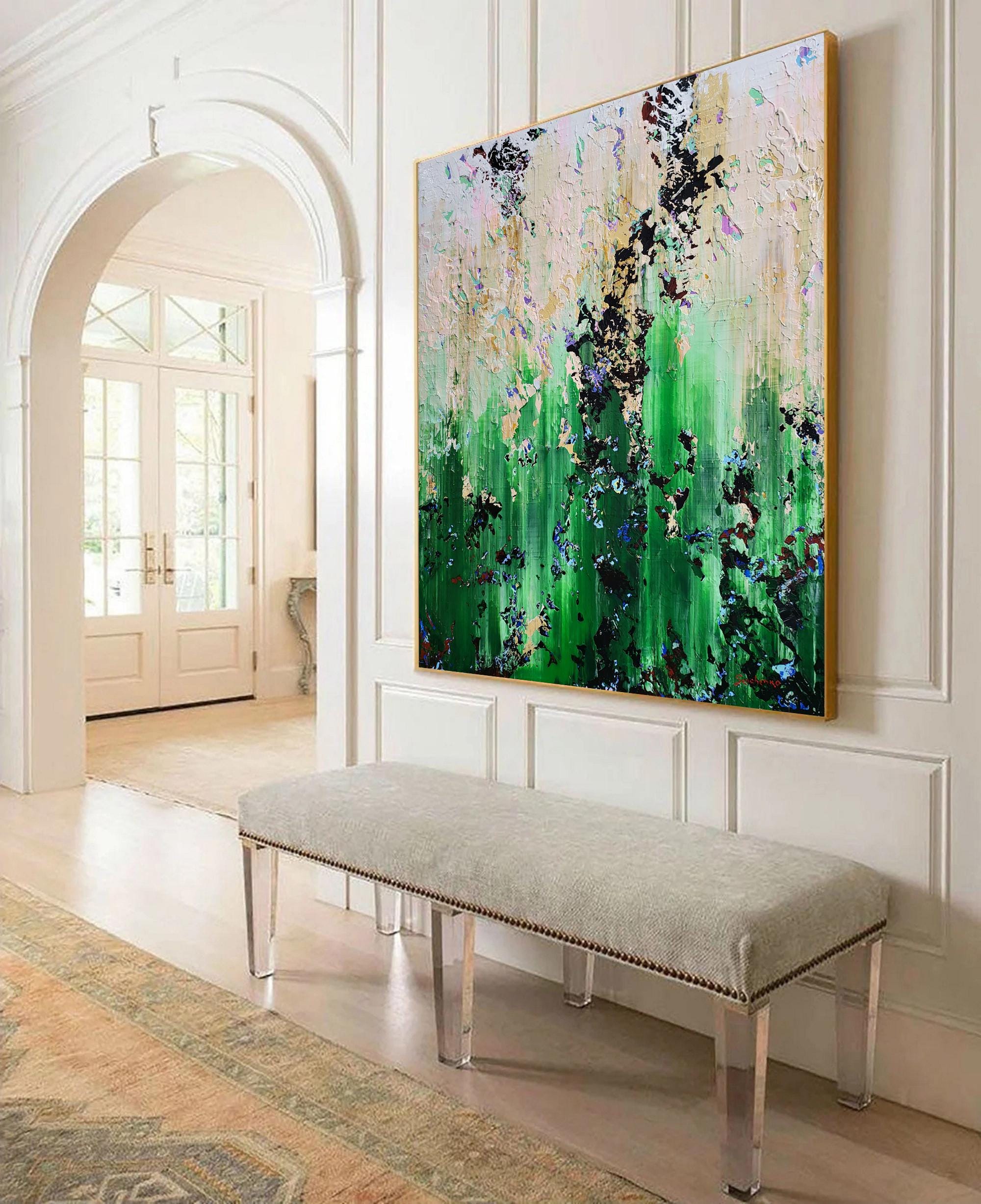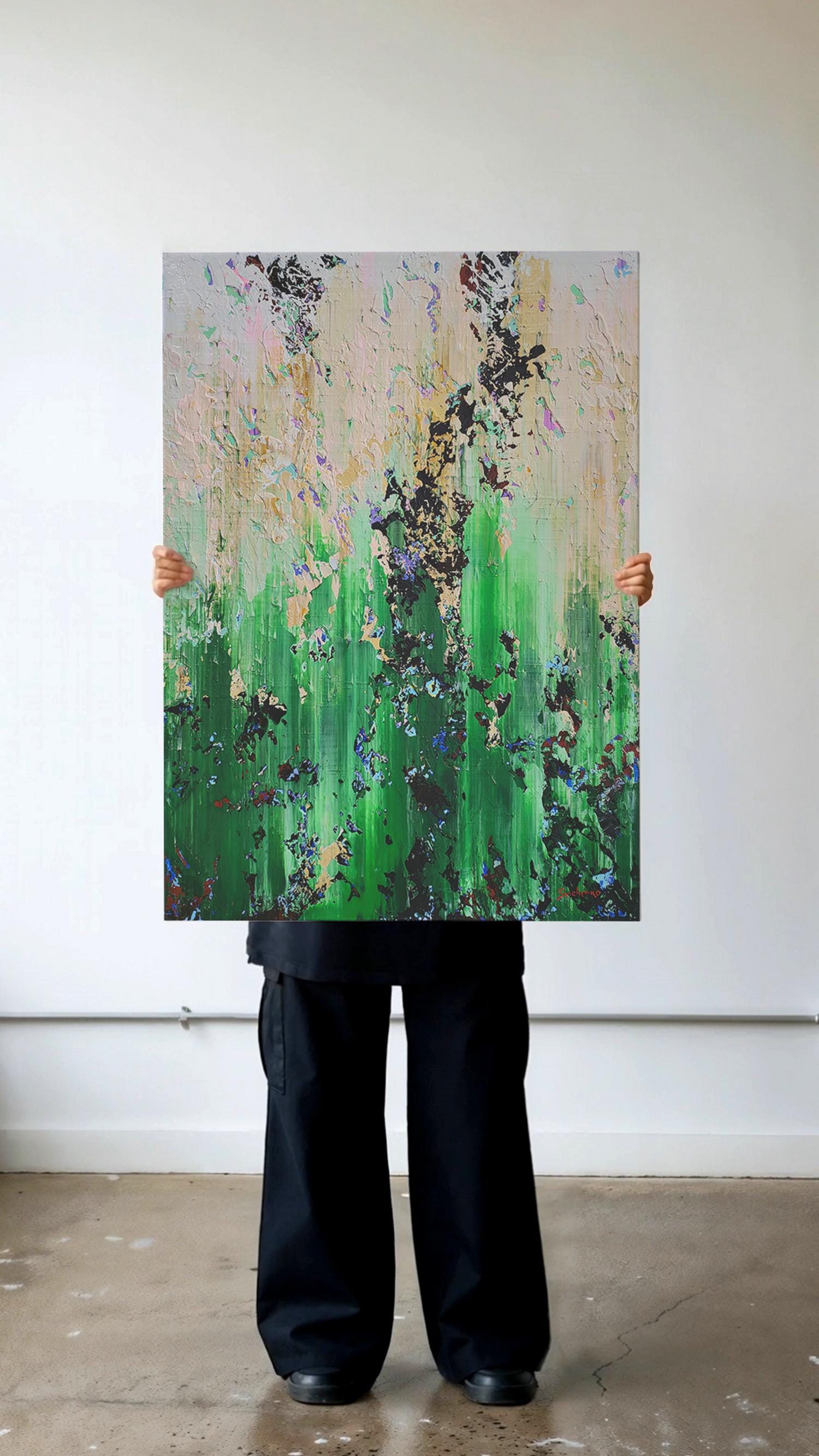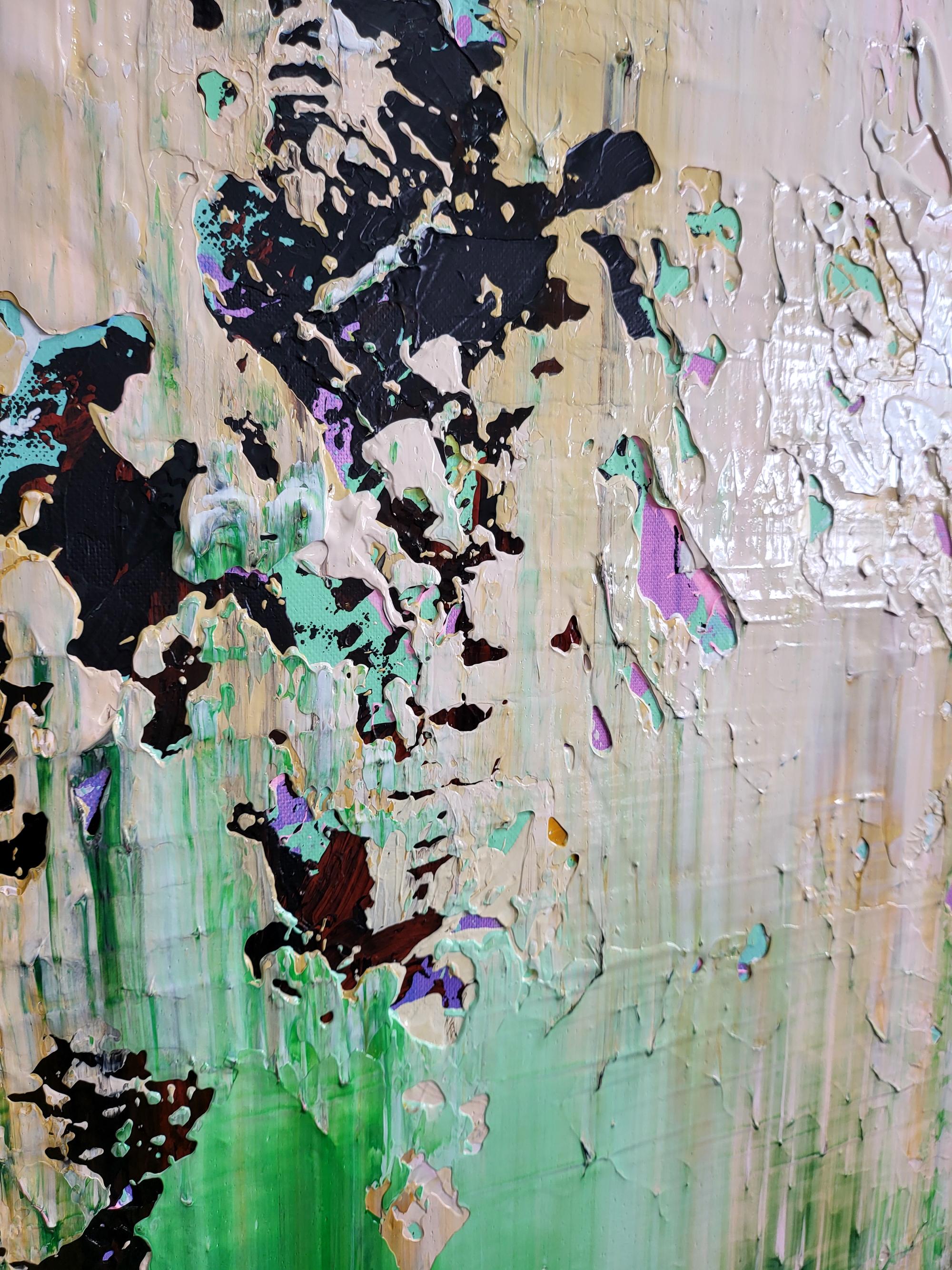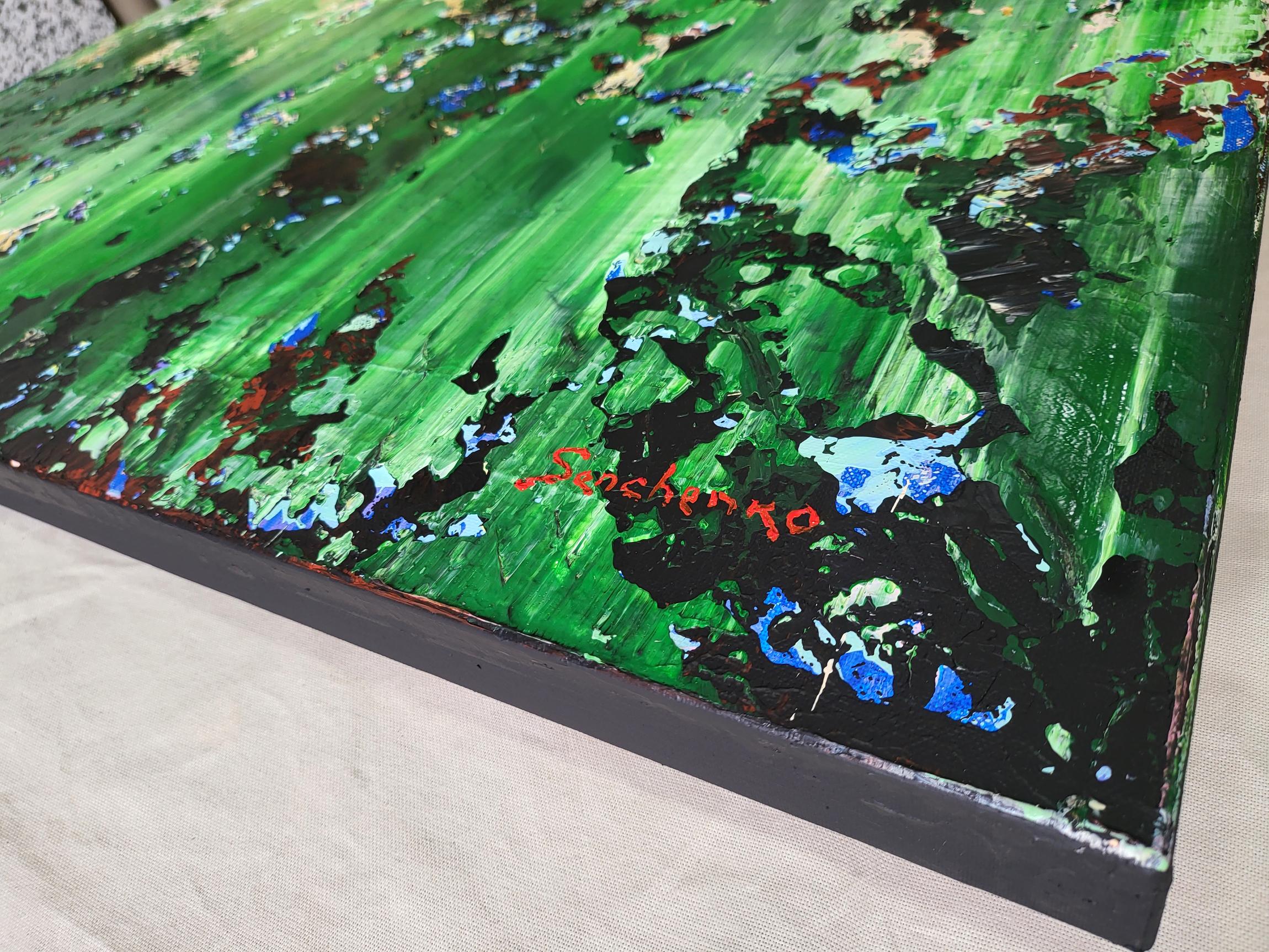 Experience the raw energy of nature’s transition with "The Thaw," a vibrant abstract piece that captures the exact moment winter’s grip begins to loosen. This painting is a rhythmic explosion of textures, where deep mossy greens and earthy tones collide with delicate hints of violet and crystalline white.