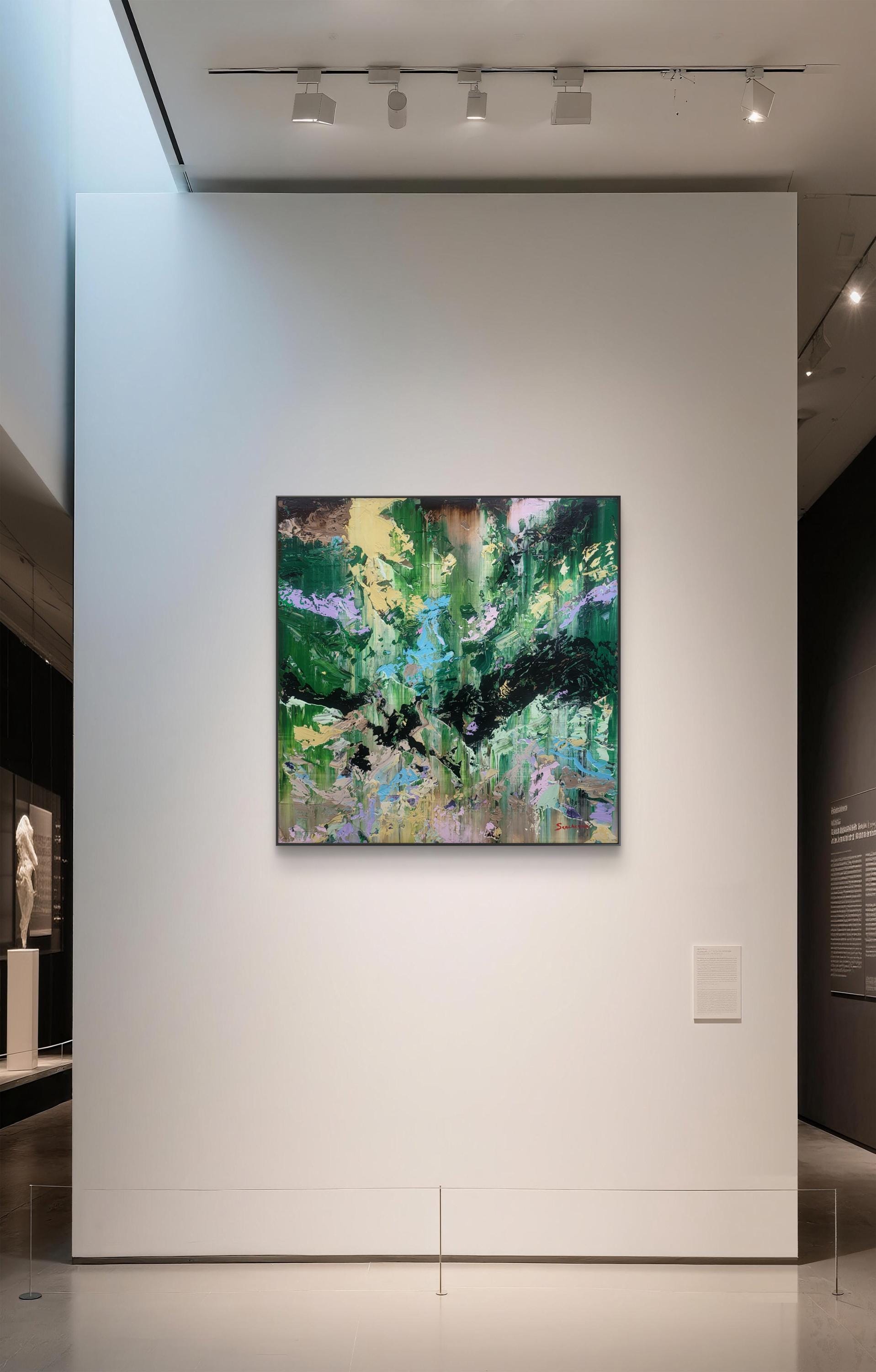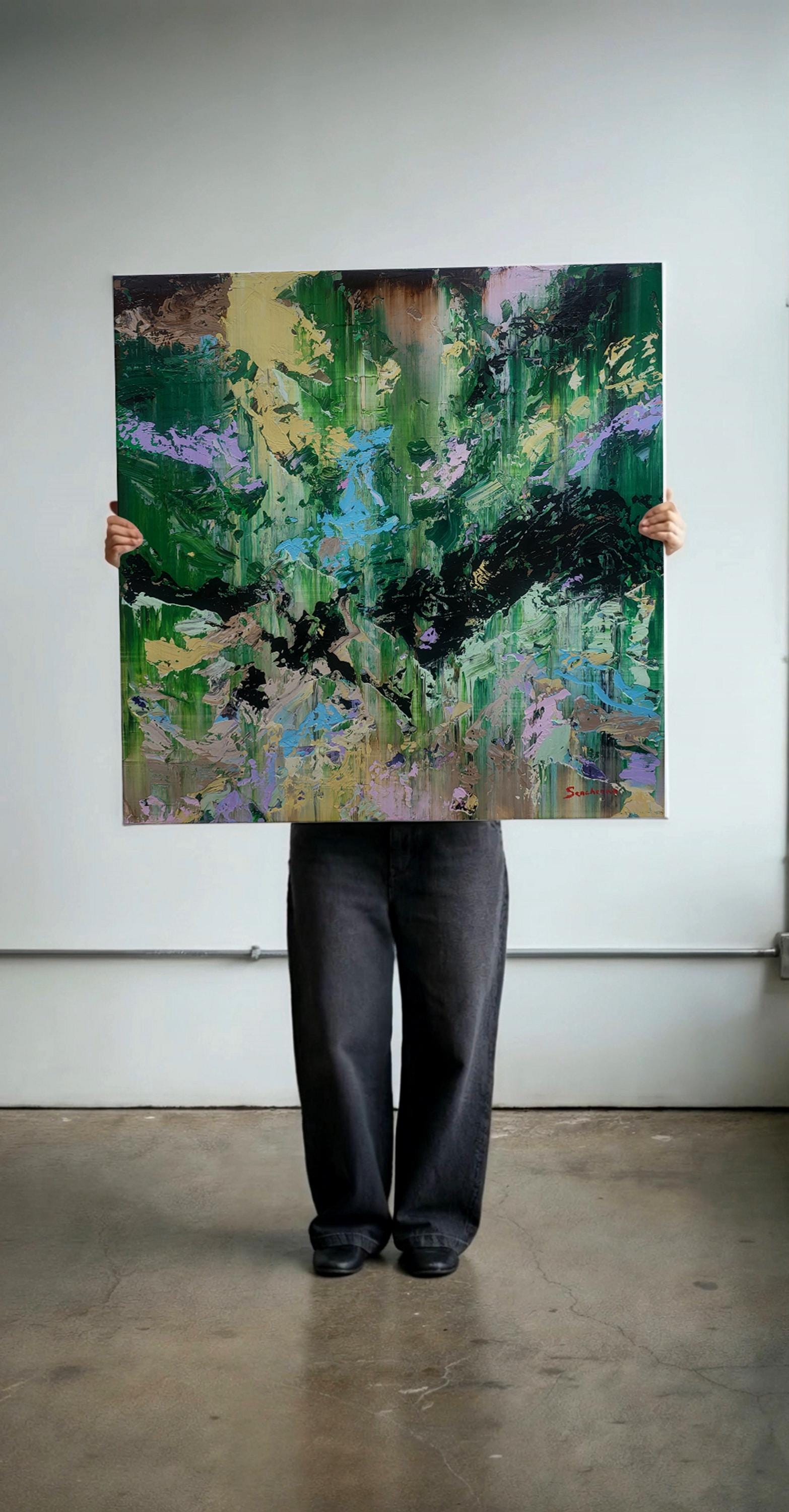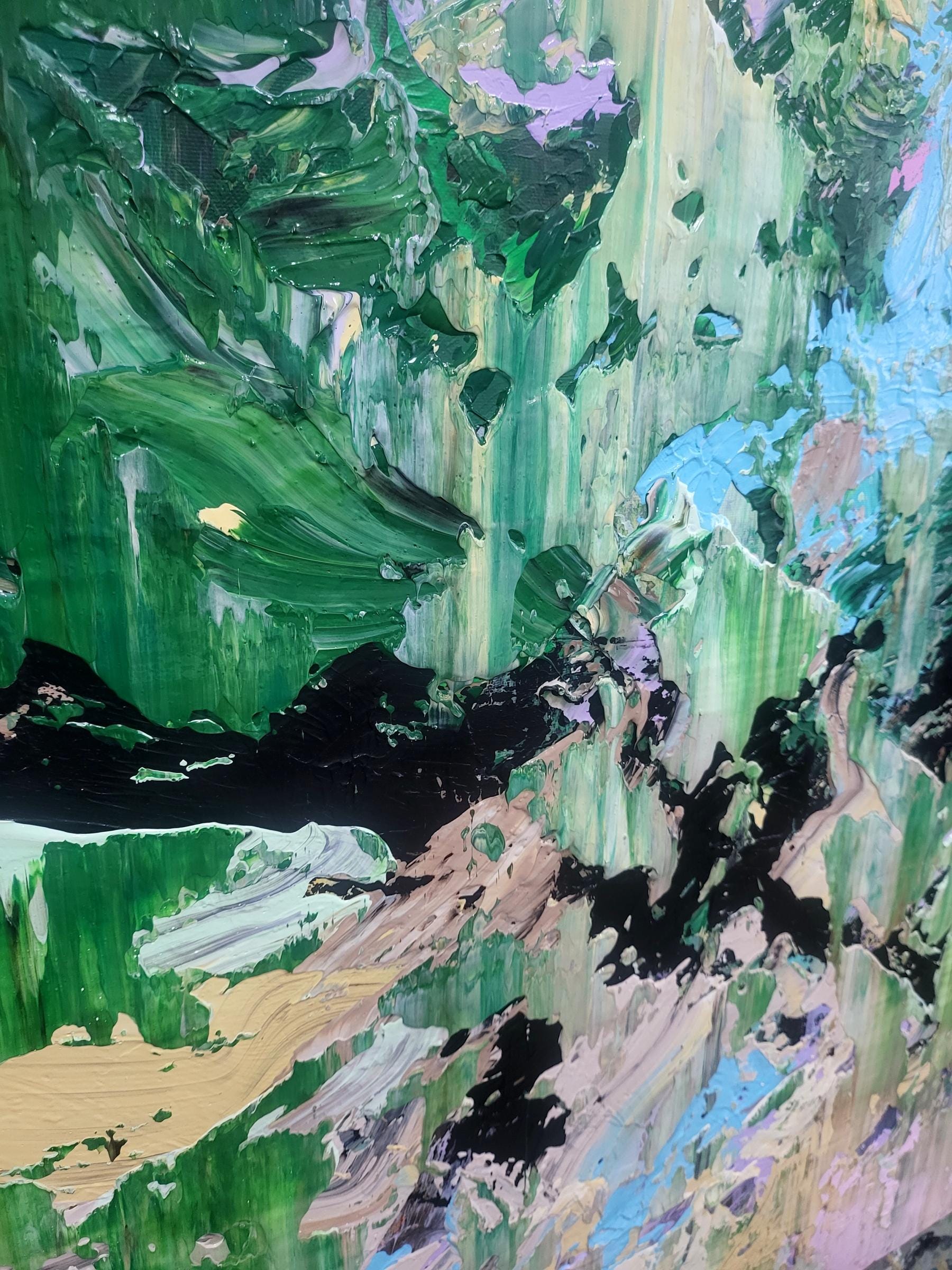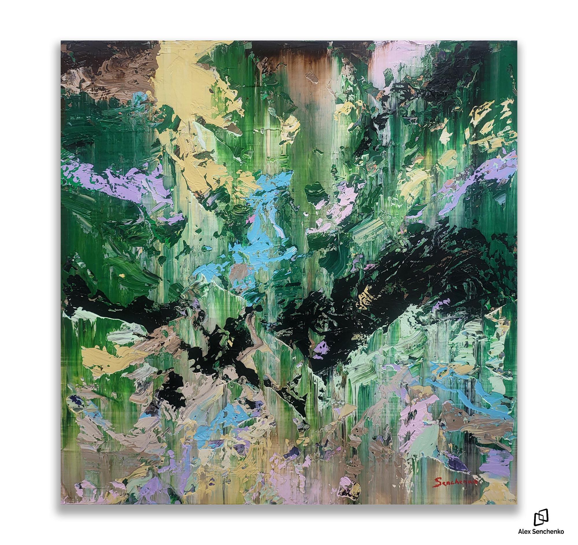 This dynamic artwork displays a mesmerizing interplay of vivid colors and abstract forms. Dominated by lush greens, the painting evokes a sense of nature's untamed energy, reminiscent of a dense, vibrant forest. Bold strokes of black meander through the canvas, adding depth and contrast, while splashes of pale yellow, lavender, and aqua contribute a refreshing balance. The texture is palpable, with layers of paint creating a rich, tactile surface. The artist's technique of sweeping, layered brushwork generates a sense of movement and vitality, immersing the viewer in a captivating visual journey. This piece stands out for its ability to elicit emotions of wonder and serenity, offering a powerful exploration of the natural world's chaos and beauty.
