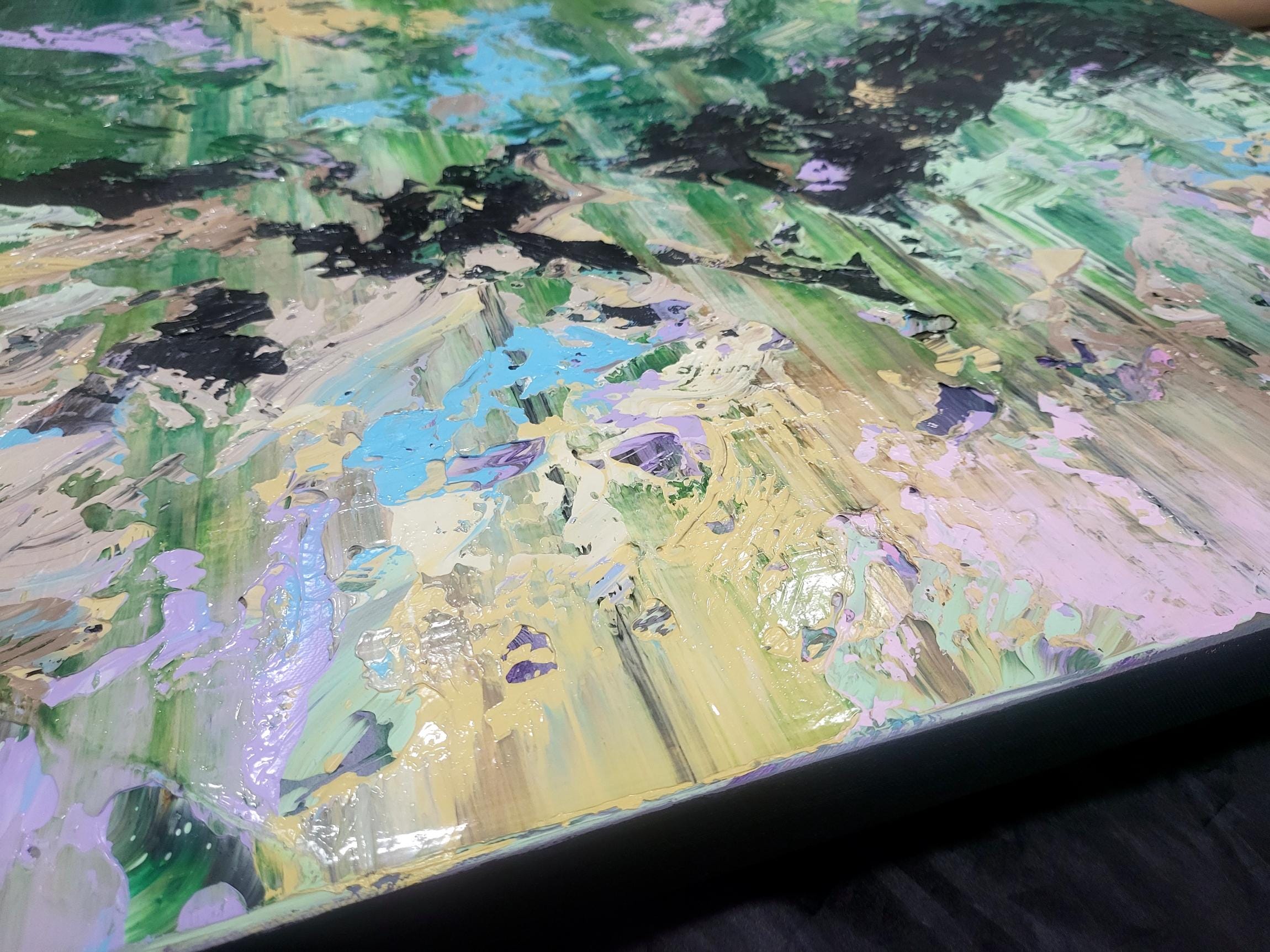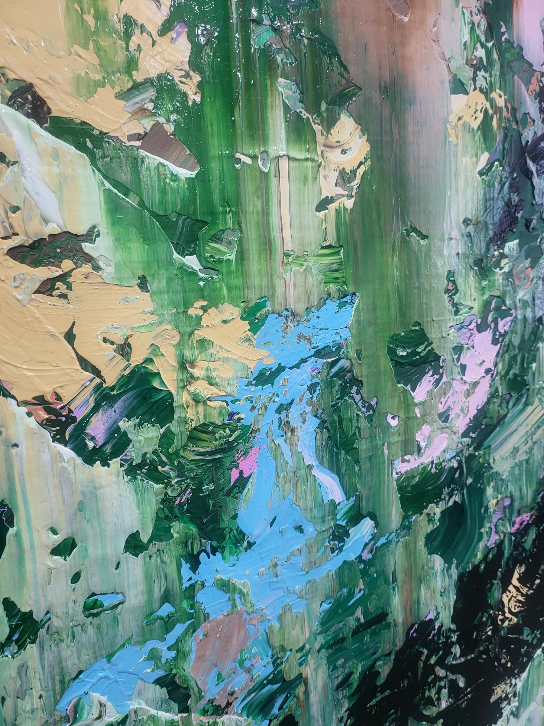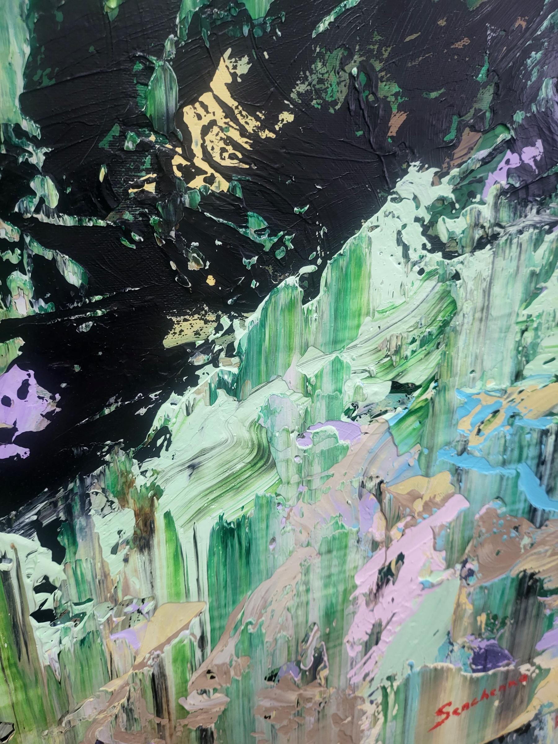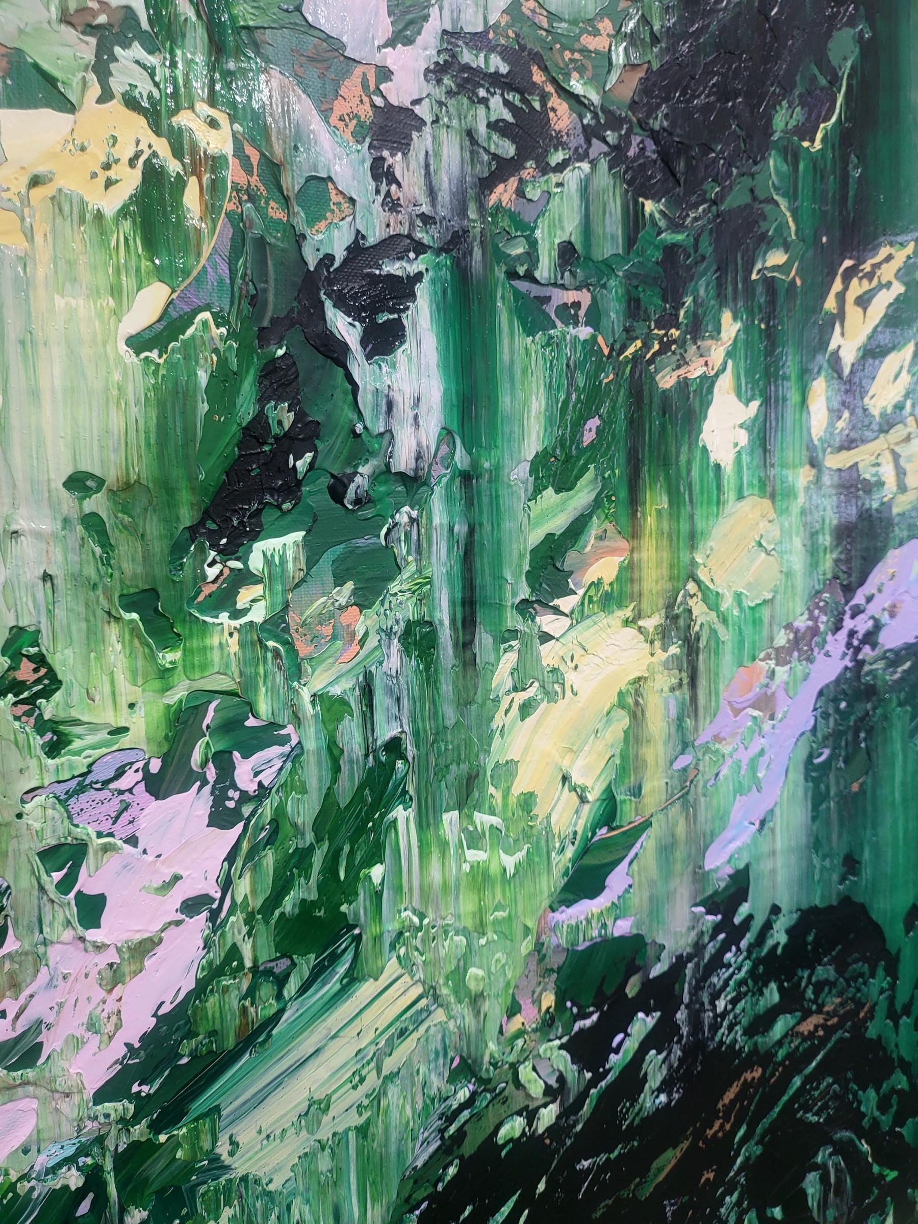 This dynamic artwork displays a mesmerizing interplay of vivid colors and abstract forms. Dominated by lush greens, the painting evokes a sense of nature's untamed energy, reminiscent of a dense, vibrant forest. Bold strokes of black meander through the canvas, adding depth and contrast, while splashes of pale yellow, lavender, and aqua contribute a refreshing balance. The texture is palpable, with layers of paint creating a rich, tactile surface. The artist's technique of sweeping, layered brushwork generates a sense of movement and vitality, immersing the viewer in a captivating visual journey. This piece stands out for its ability to elicit emotions of wonder and serenity, offering a powerful exploration of the natural world's chaos and beauty.