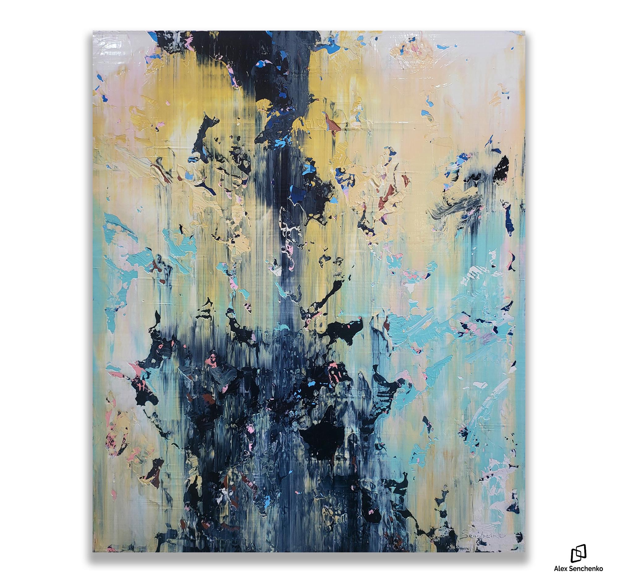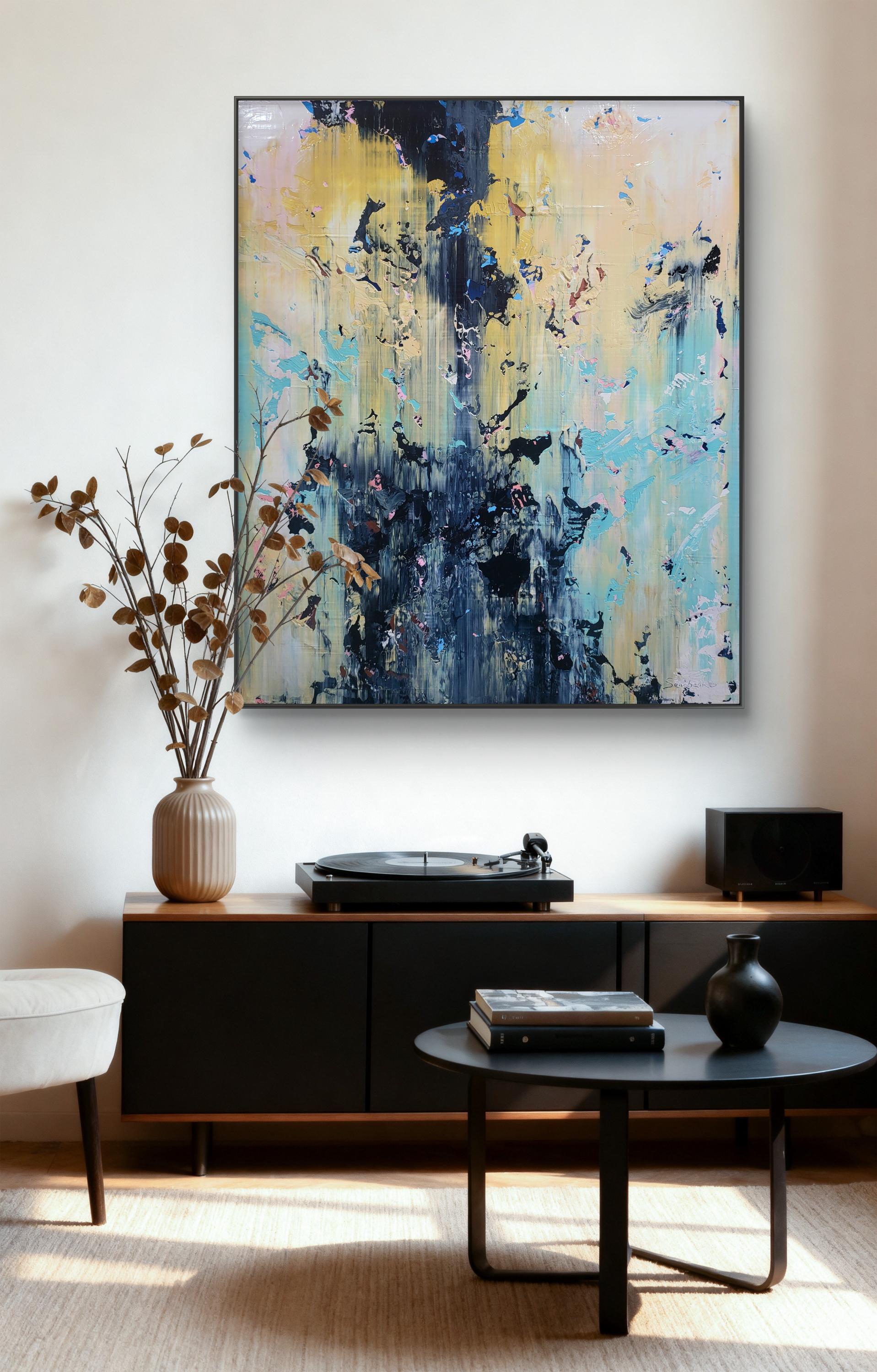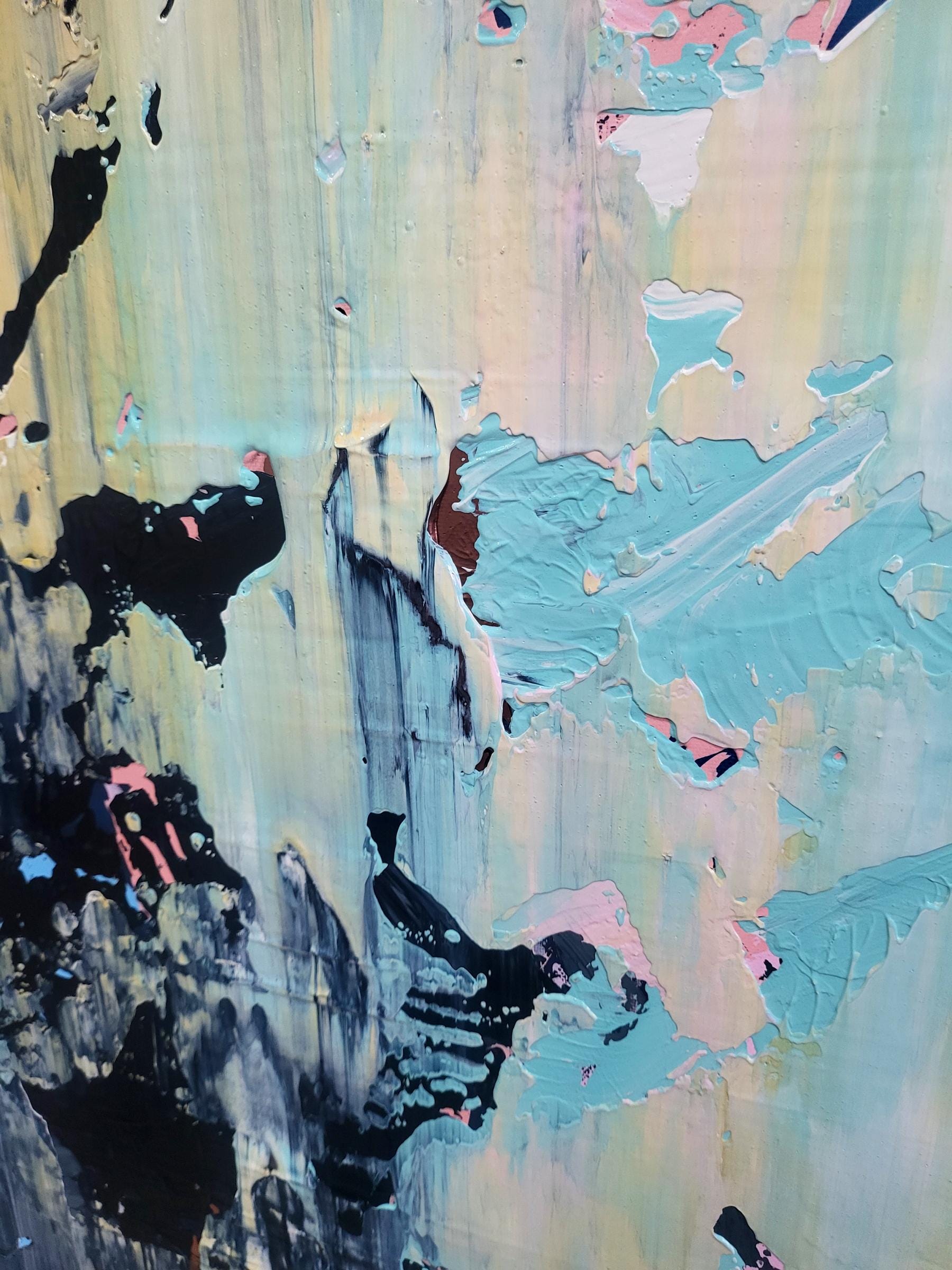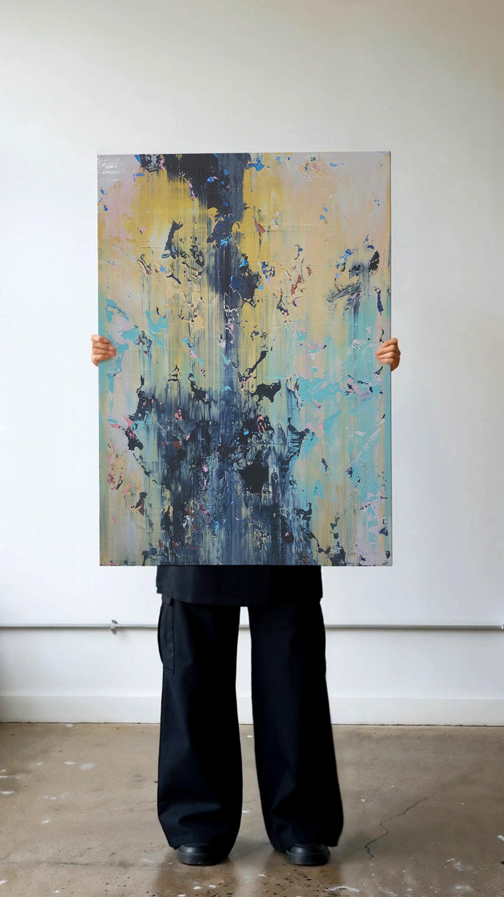 This striking abstract painting features a dynamic interplay of colors and textures, commanding attention with its vertical orientation. Bold streaks of black cascade down the center, contrasted by vibrant splashes of turquoise, pale pink, and yellow, creating a sense of movement and fluidity. The deliberate drips and splatters suggest spontaneity while maintaining thoughtful composition. Subtle highlights of white intermingle, lending depth and dimension to the work. The background, a soft blend of pastel hues, provides a serene contrast to the tumultuous foreground, evoking both chaos and calm. The artwork's abstract nature invites personal interpretation, encouraging viewers to immerse themselves in its complexity. This piece exemplifies the power of abstract art to convey emotion and intrigue through color and form.