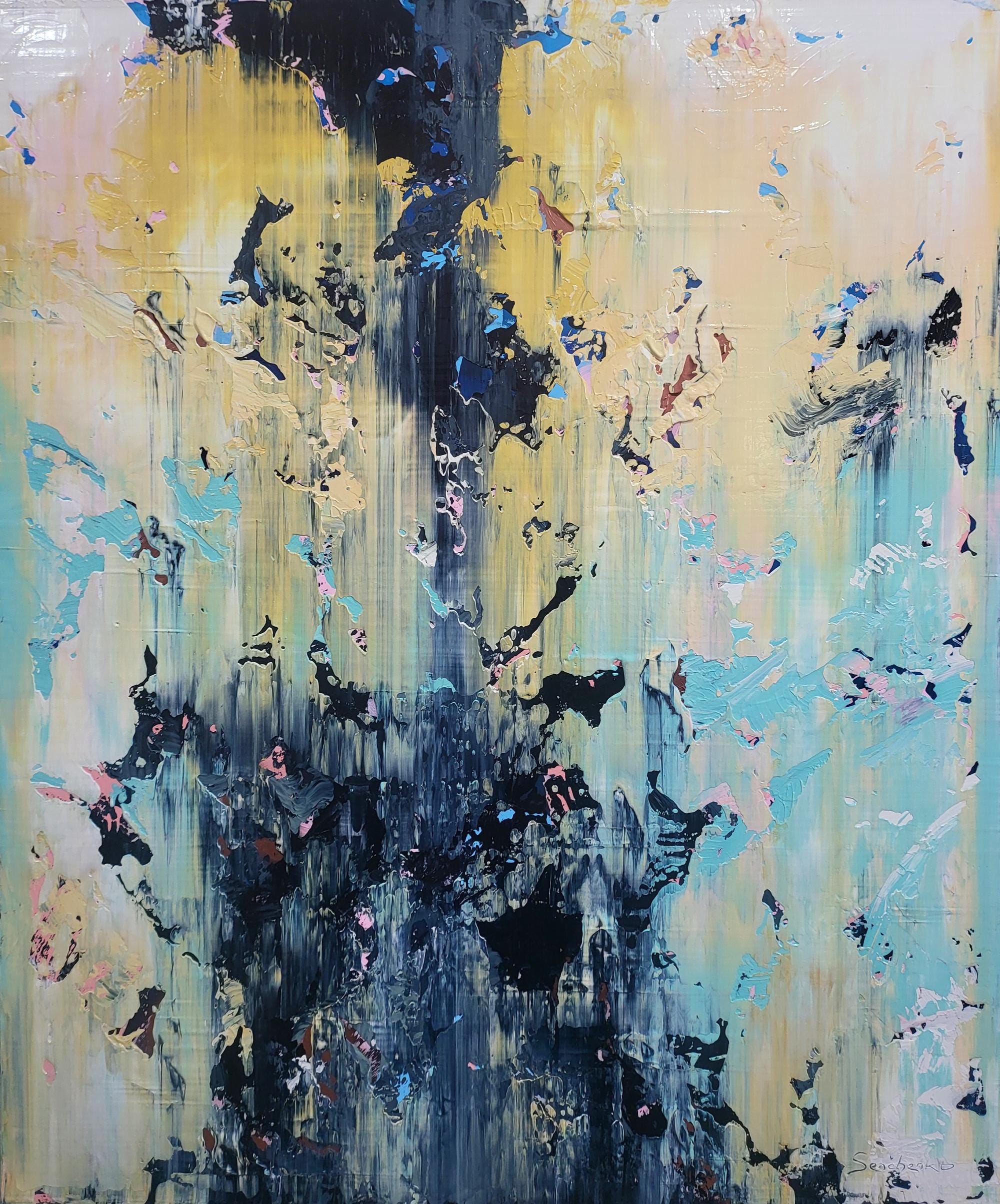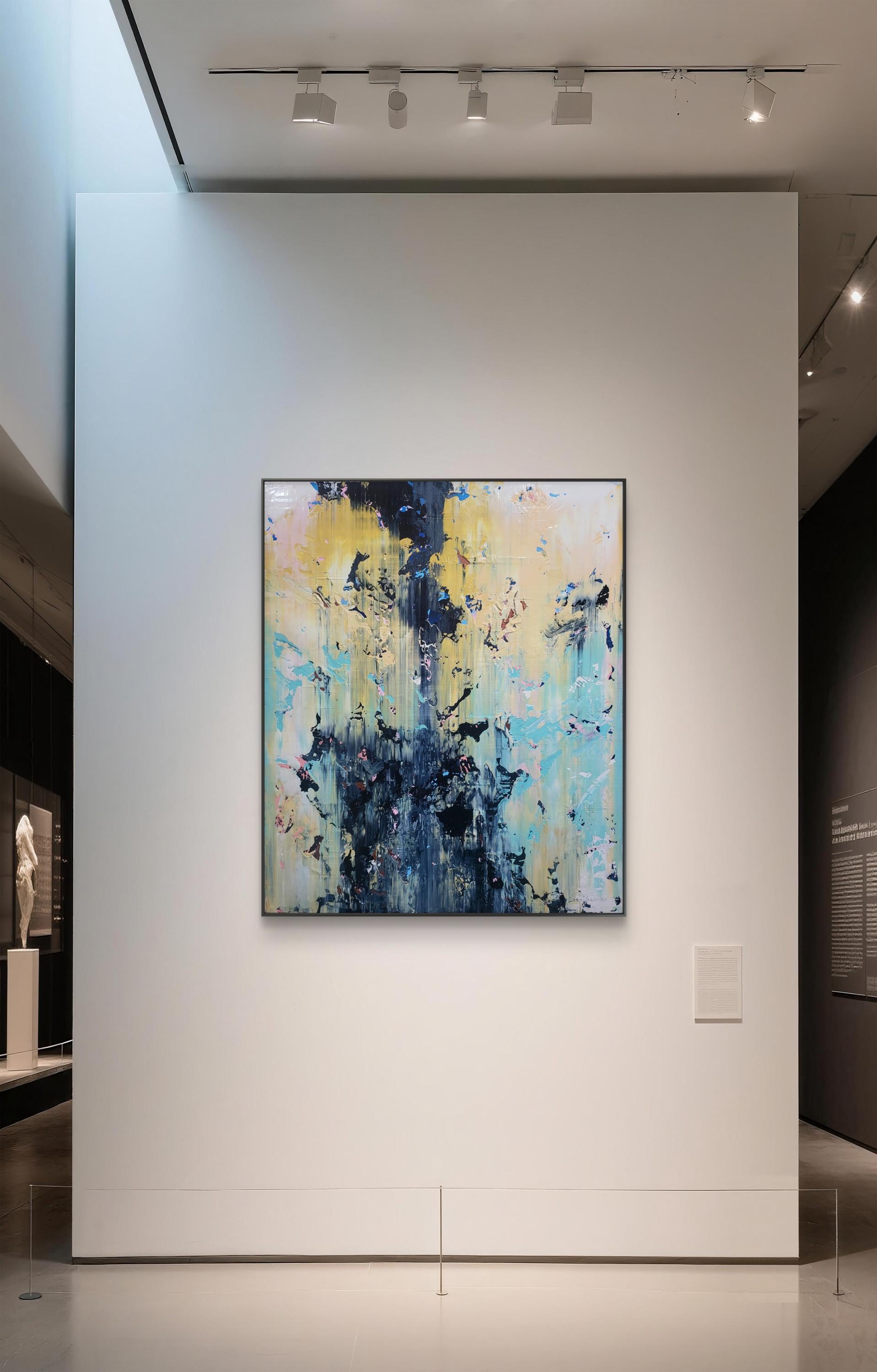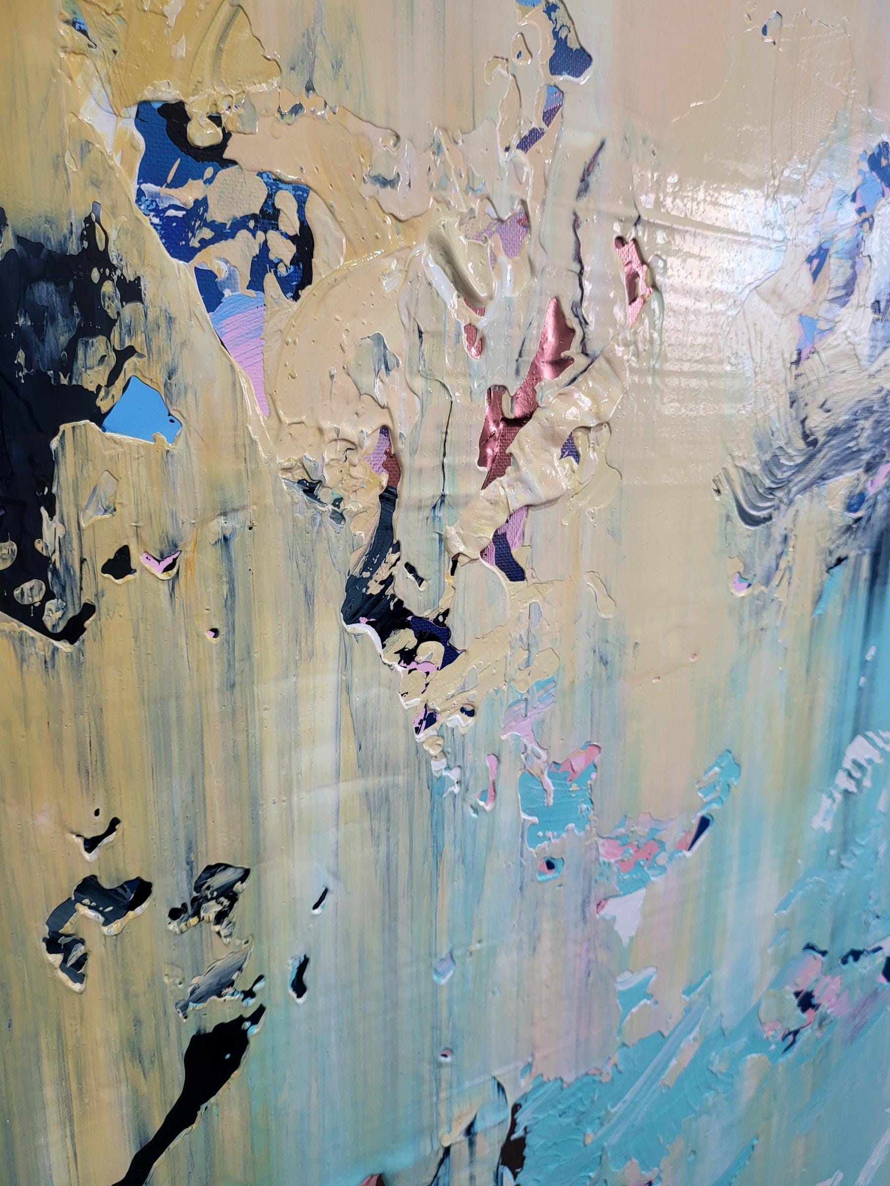 This striking abstract painting features a dynamic interplay of colors and textures, commanding attention with its vertical orientation. Bold streaks of black cascade down the center, contrasted by vibrant splashes of turquoise, pale pink, and yellow, creating a sense of movement and fluidity. The deliberate drips and splatters suggest spontaneity while maintaining thoughtful composition. Subtle highlights of white intermingle, lending depth and dimension to the work. The background, a soft blend of pastel hues, provides a serene contrast to the tumultuous foreground, evoking both chaos and calm. The artwork's abstract nature invites personal interpretation, encouraging viewers to immerse themselves in its complexity. This piece exemplifies the power of abstract art to convey emotion and intrigue through color and form.