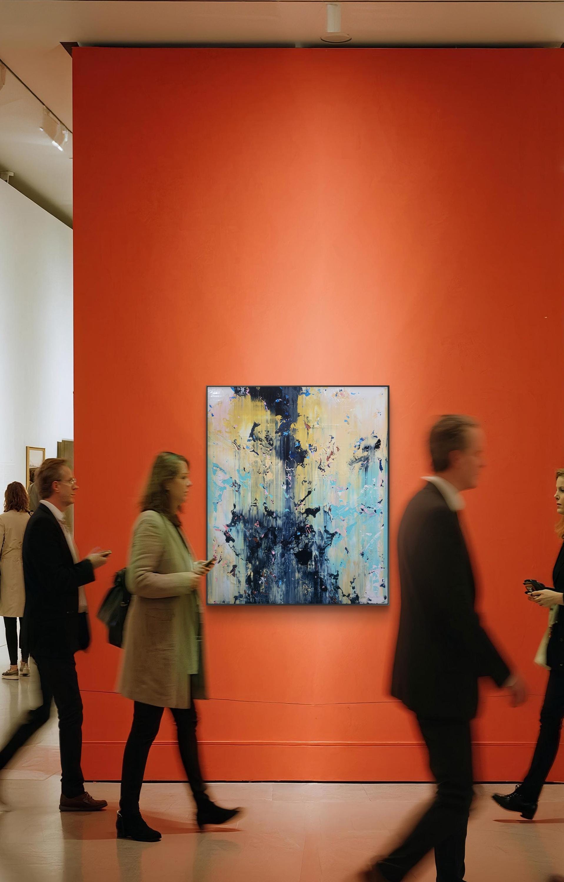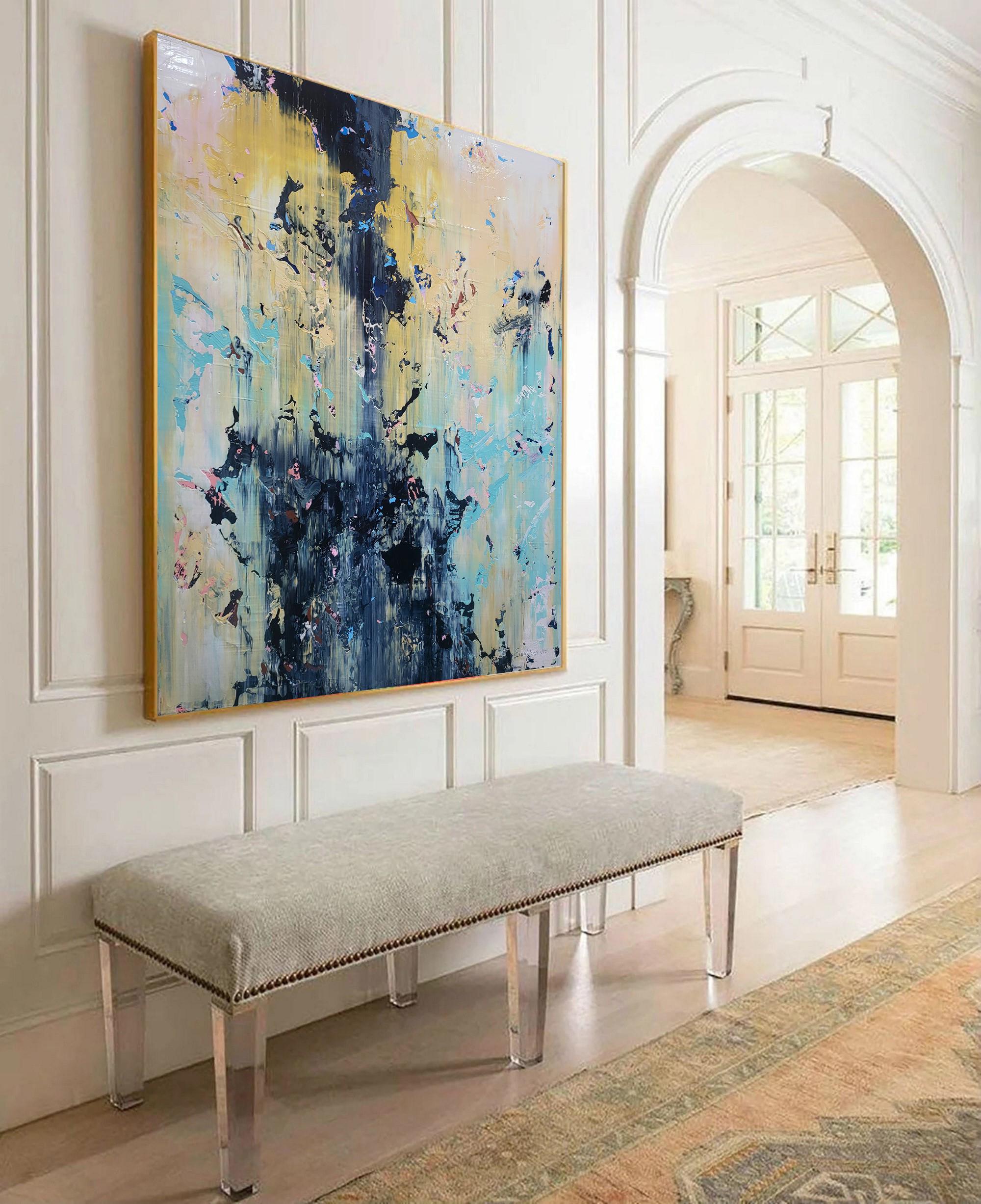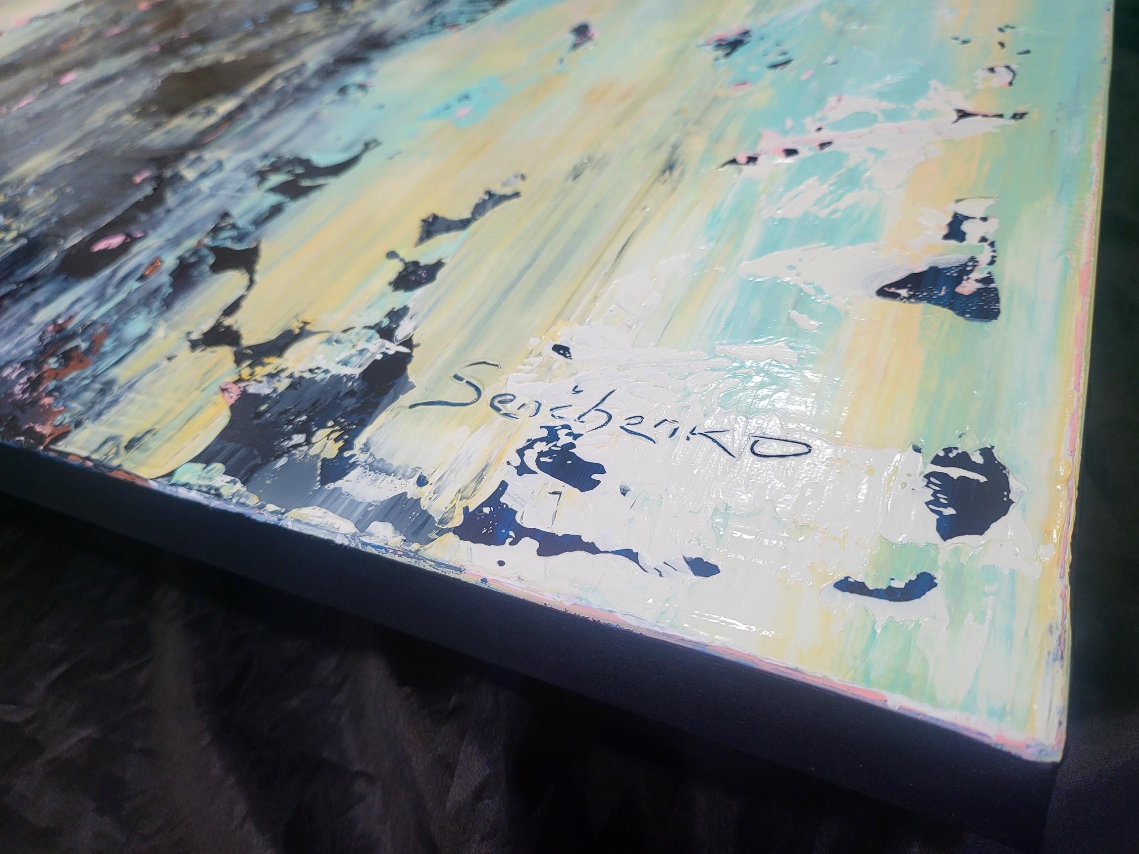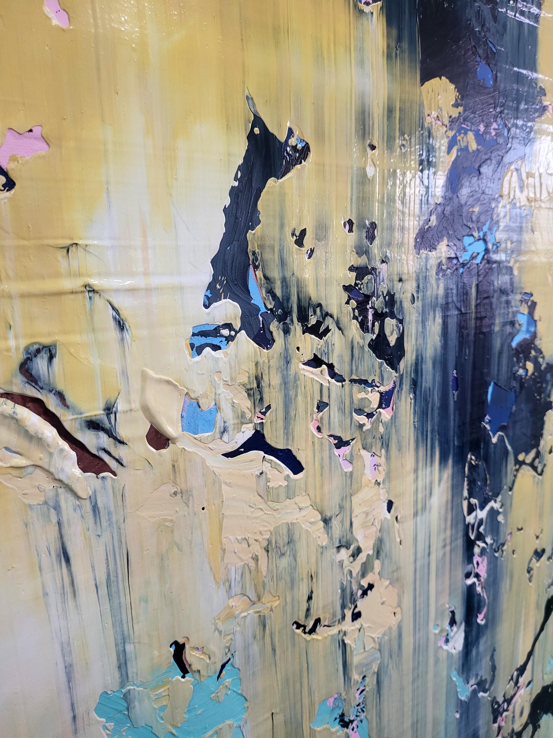This striking abstract painting features a dynamic interplay of colors and textures, commanding attention with its vertical orientation. Bold streaks of black cascade down the center, contrasted by vibrant splashes of turquoise, pale pink, and yellow, creating a sense of movement and fluidity. The deliberate drips and splatters suggest spontaneity while maintaining thoughtful composition. Subtle highlights of white intermingle, lending depth and dimension to the work. The background, a soft blend of pastel hues, provides a serene contrast to the tumultuous foreground, evoking both chaos and calm. The artwork's abstract nature invites personal interpretation, encouraging viewers to immerse themselves in its complexity. This piece exemplifies the power of abstract art to convey emotion and intrigue through color and form.