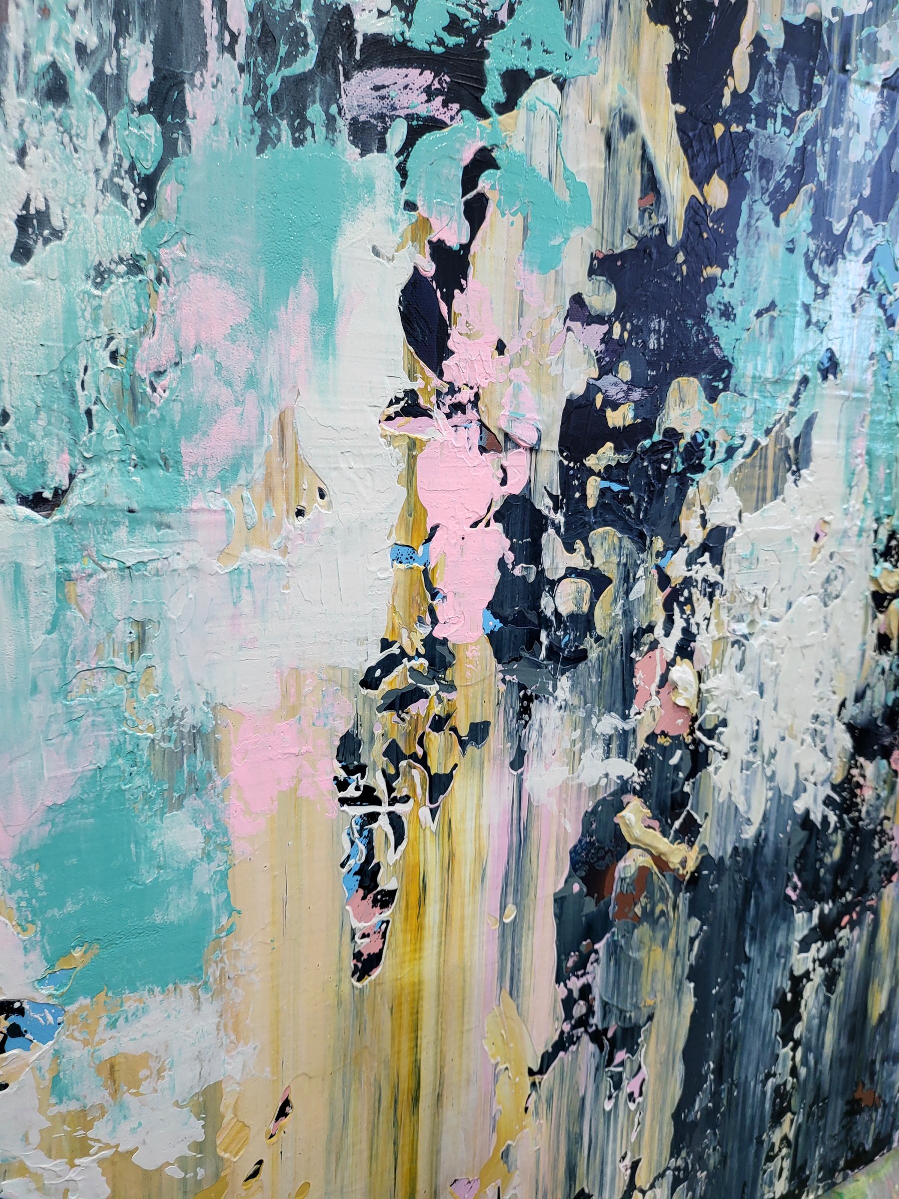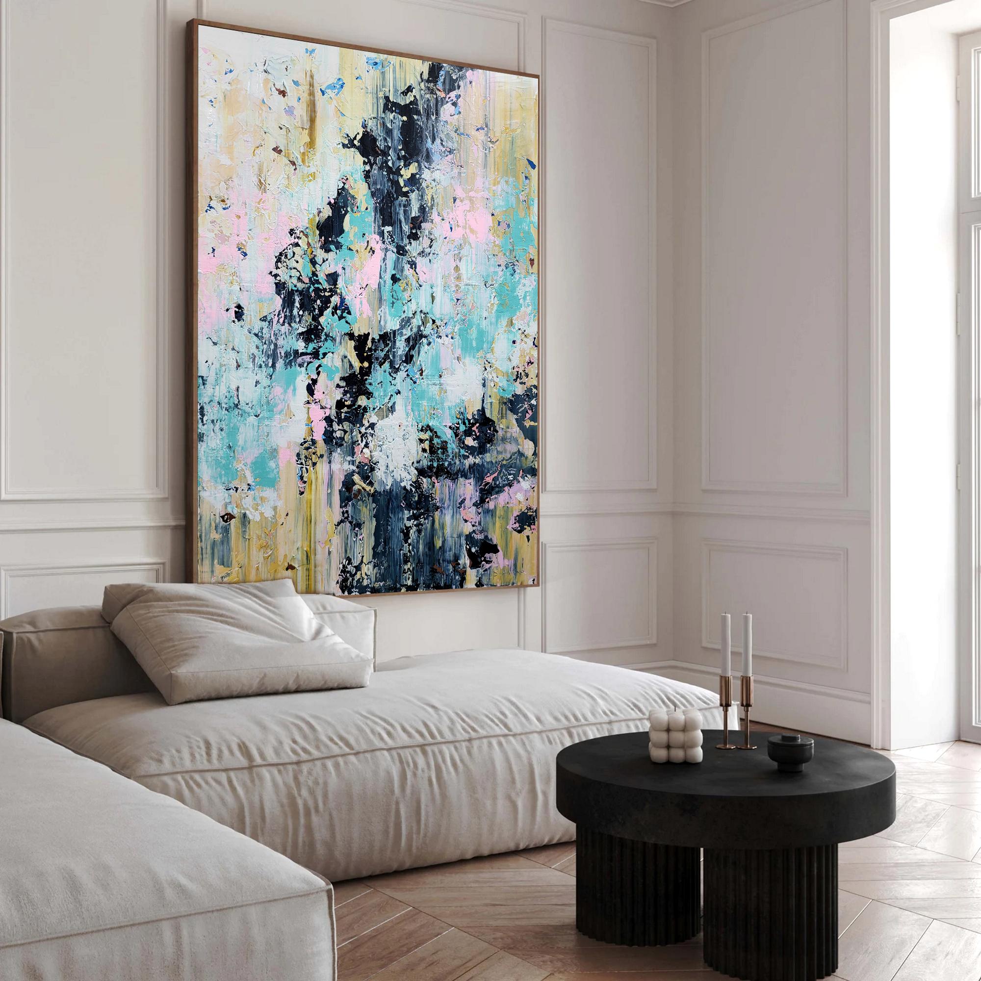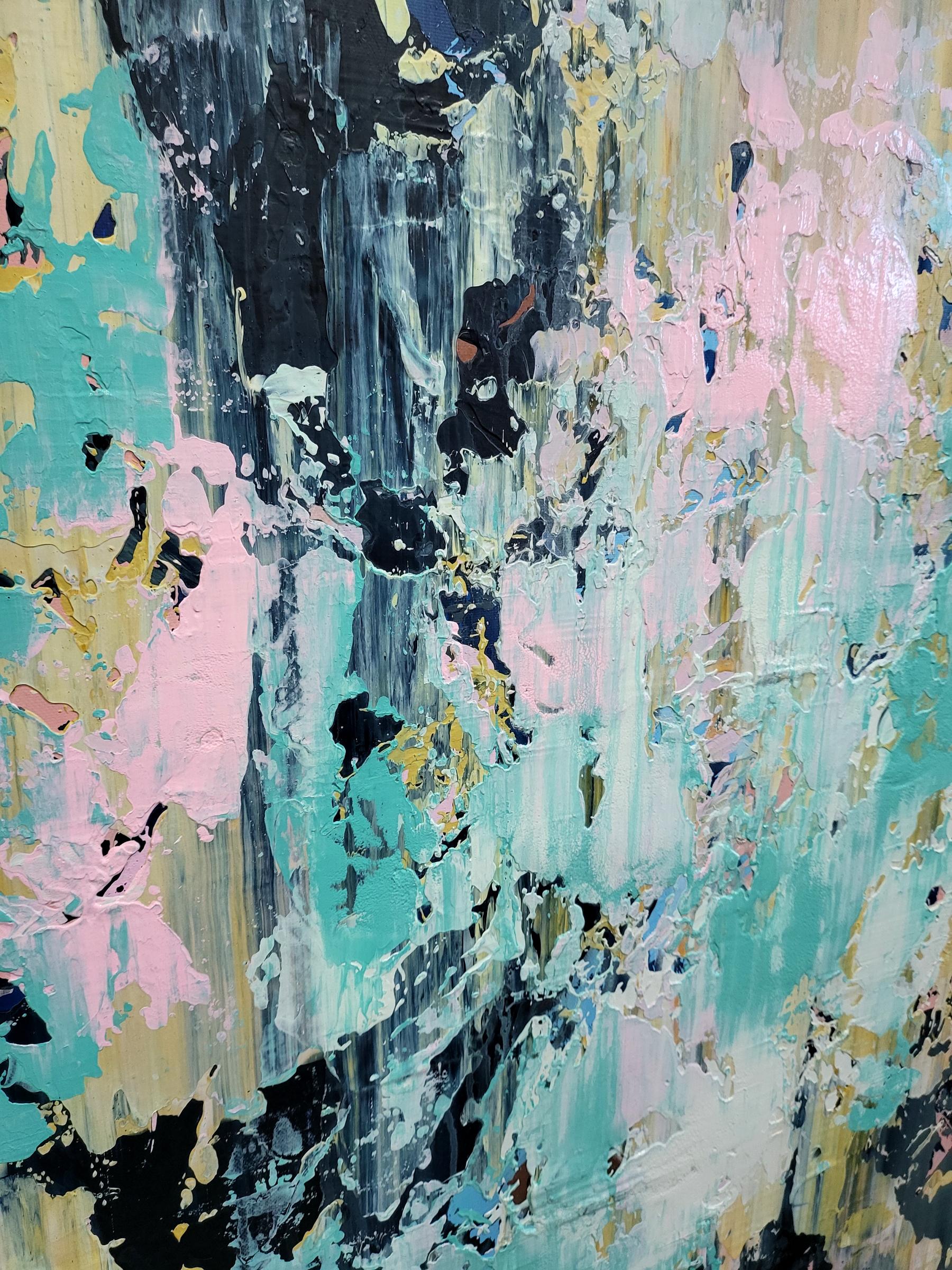 This abstract artwork is a symphony of color and texture, with a dynamic interplay between soft pastels and bold, dark strokes. The canvas is alive with light blues, pinks, and yellows, juxtaposed against deep blacks and grays, creating a striking contrast. The textured layers give the piece depth, inviting the viewer to explore its intricate details. Streaks and splatters create a sense of movement and spontaneity, evoking emotions of chaos and harmony. The vertical alignment of colors suggests upward motion, adding to its dynamic energy. This piece challenges traditional art forms with its fluidity and complexity, making it a captivating focal point in any collection. The abstract nature invites personal interpretation, ensuring a unique viewing experience each time.