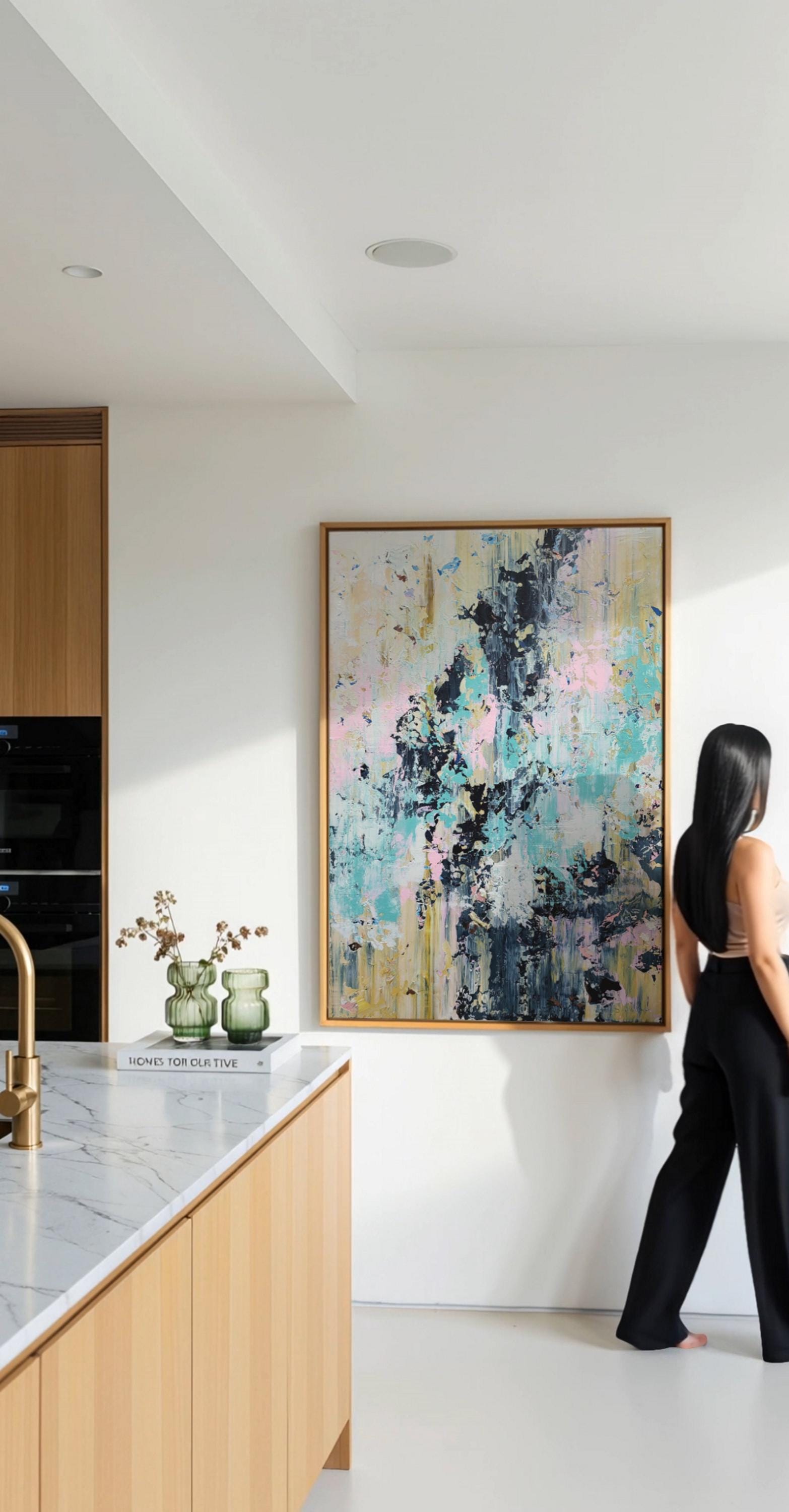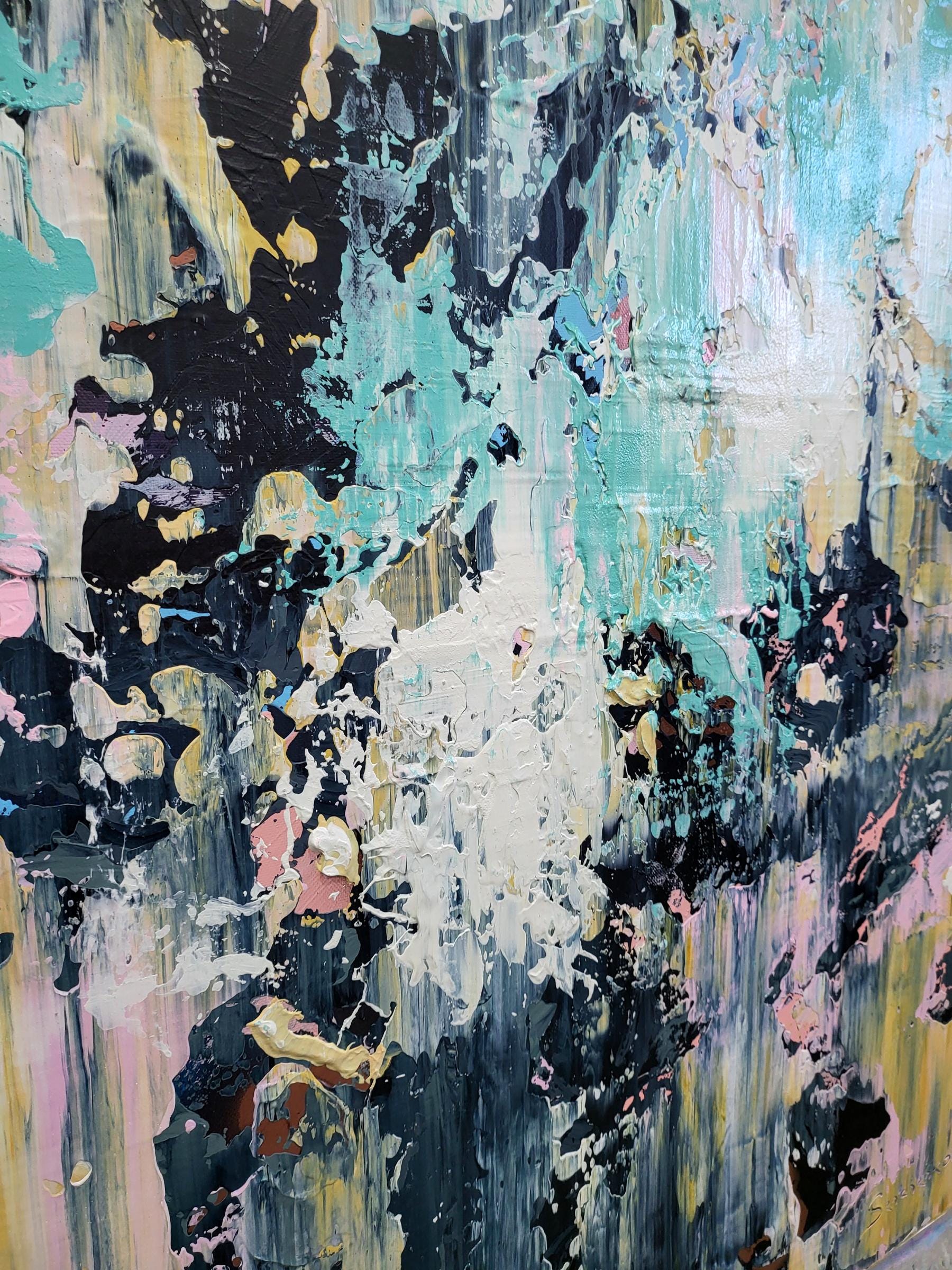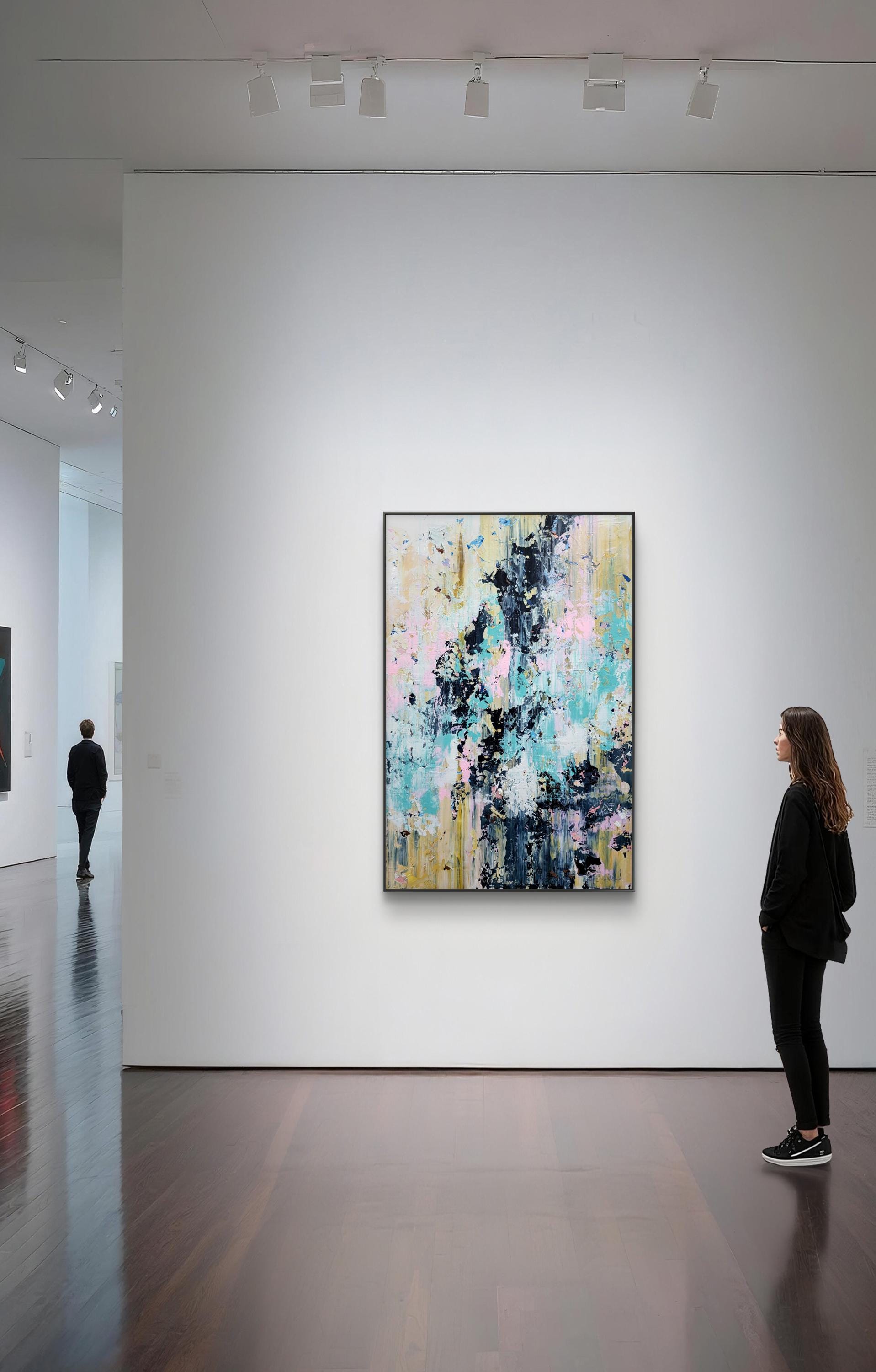 This abstract artwork is a symphony of color and texture, with a dynamic interplay between soft pastels and bold, dark strokes. The canvas is alive with light blues, pinks, and yellows, juxtaposed against deep blacks and grays, creating a striking contrast. The textured layers give the piece depth, inviting the viewer to explore its intricate details. Streaks and splatters create a sense of movement and spontaneity, evoking emotions of chaos and harmony. The vertical alignment of colors suggests upward motion, adding to its dynamic energy. This piece challenges traditional art forms with its fluidity and complexity, making it a captivating focal point in any collection. The abstract nature invites personal interpretation, ensuring a unique viewing experience each time.